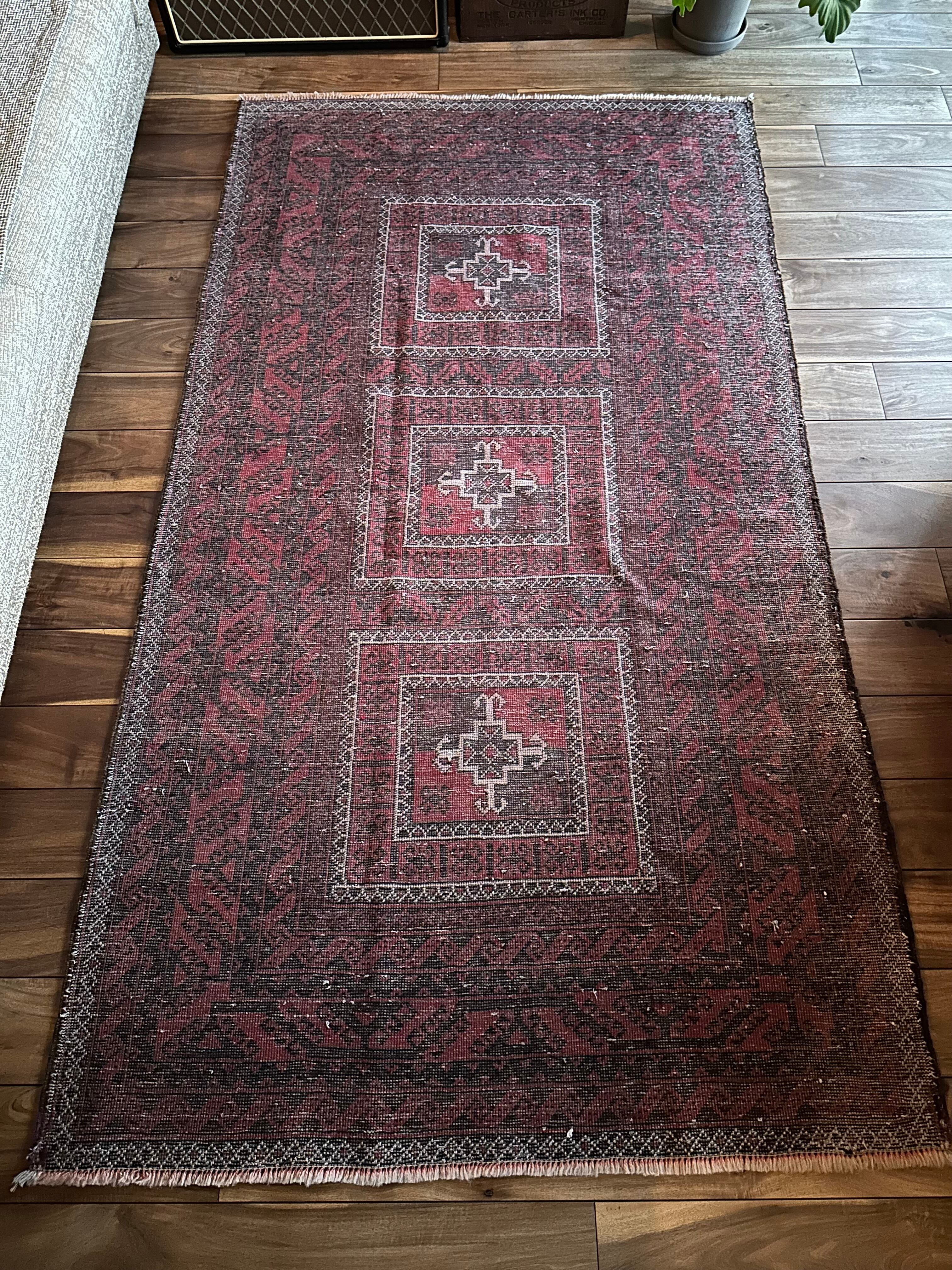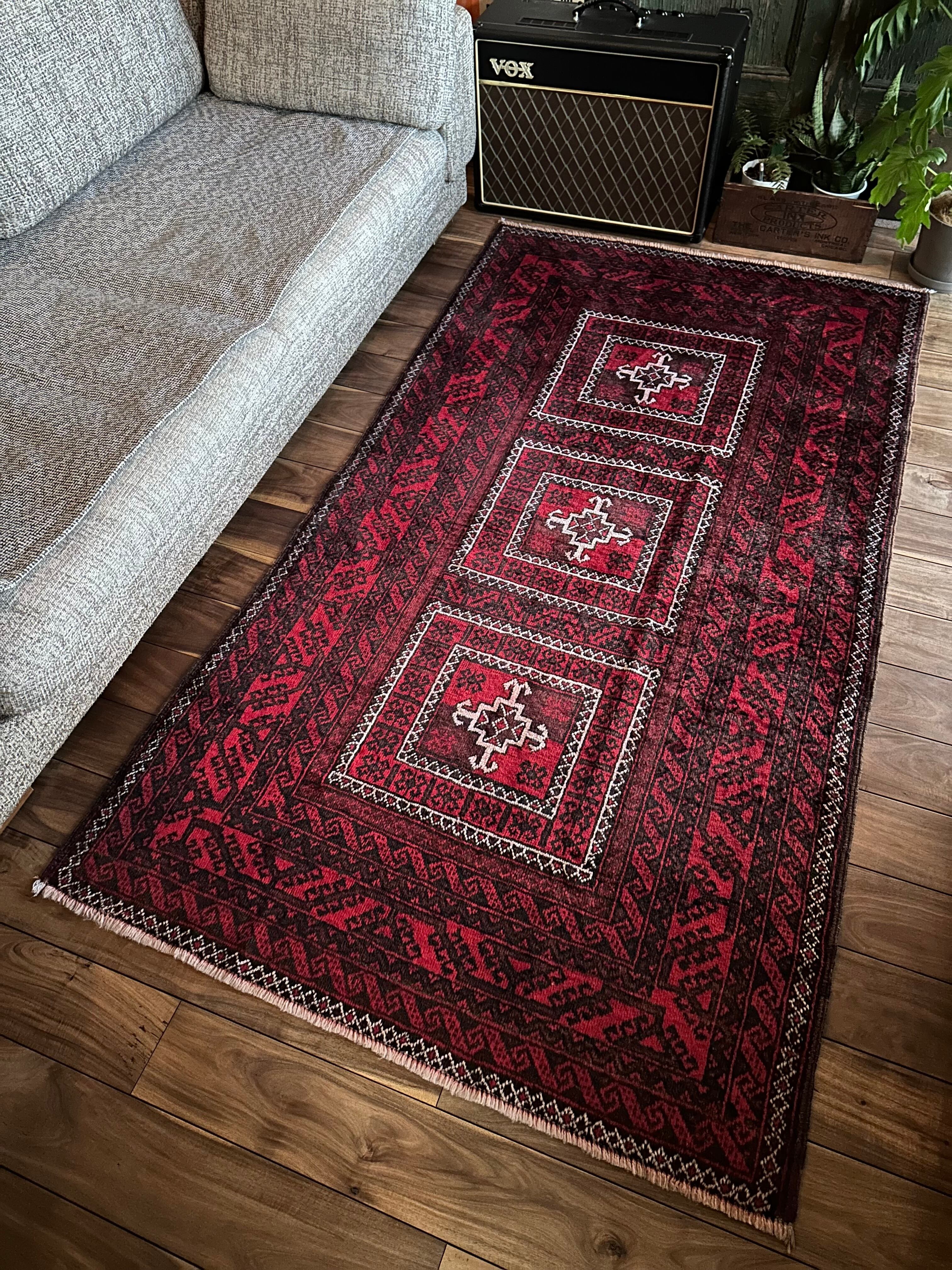 三連のメダリオンが目を惹く部族絨毯らしい1枚で、ボーダーをぐるりと取り囲んだチェーンの連続紋様がバルーチの力強さを感じさせてくれます。