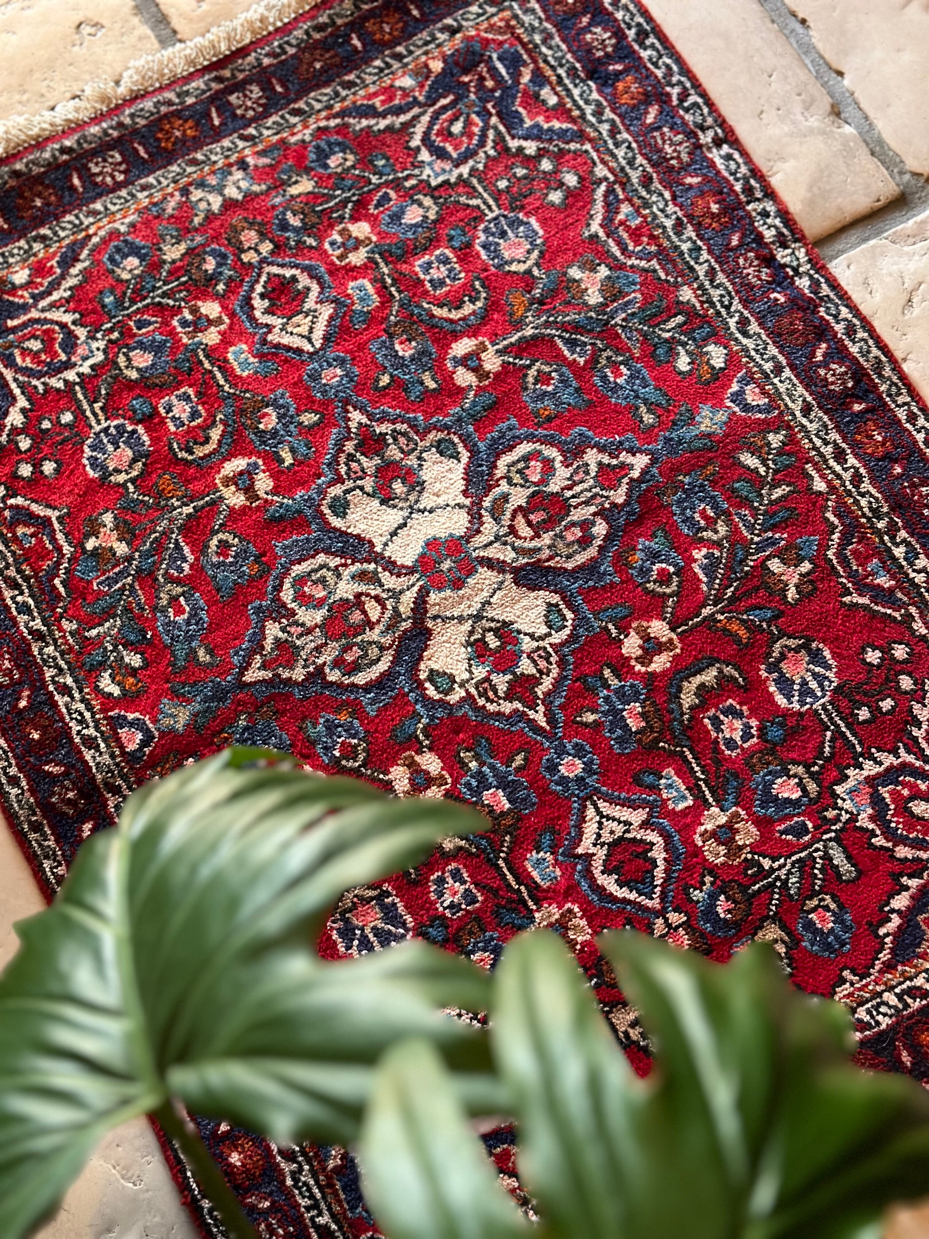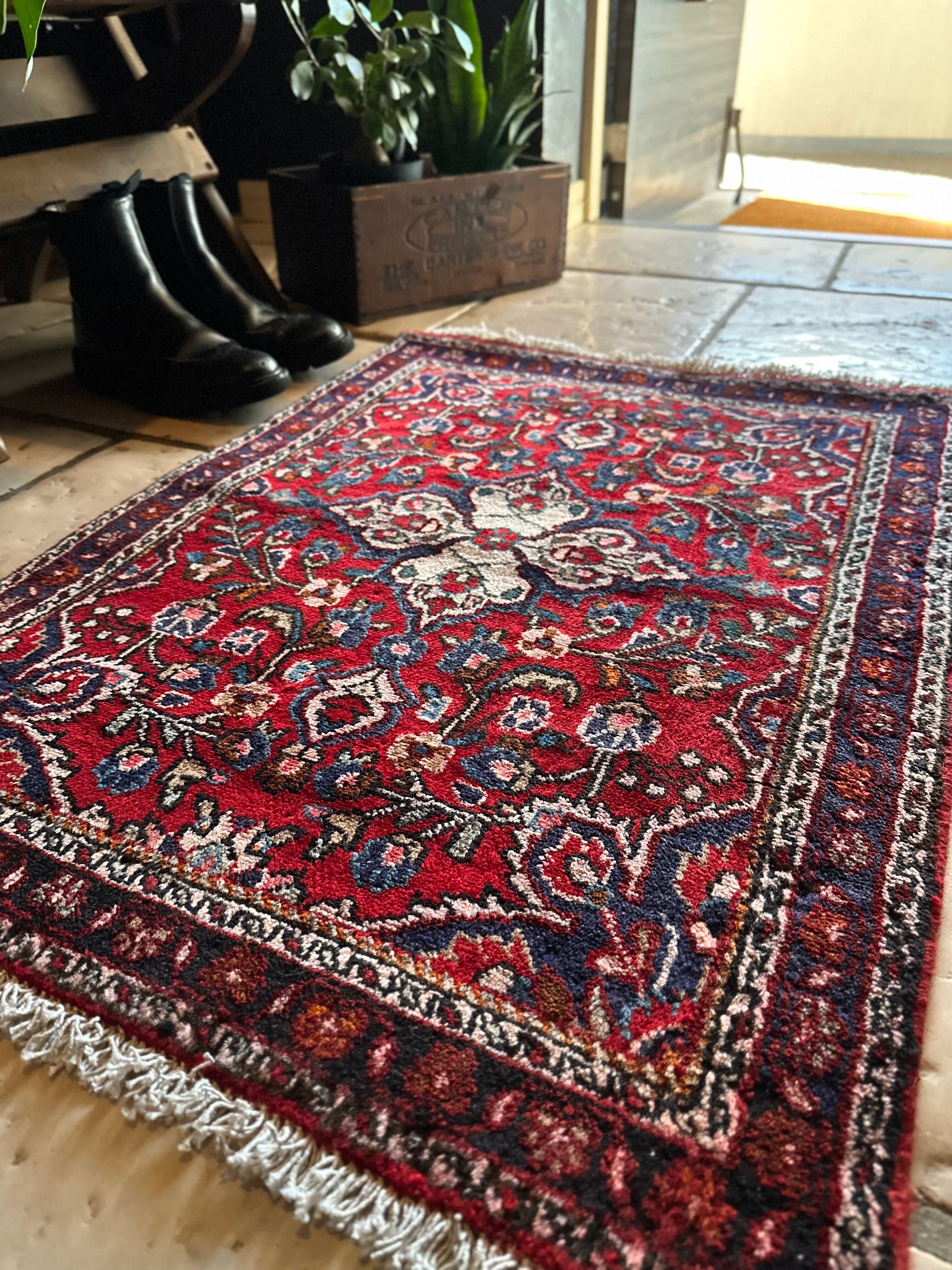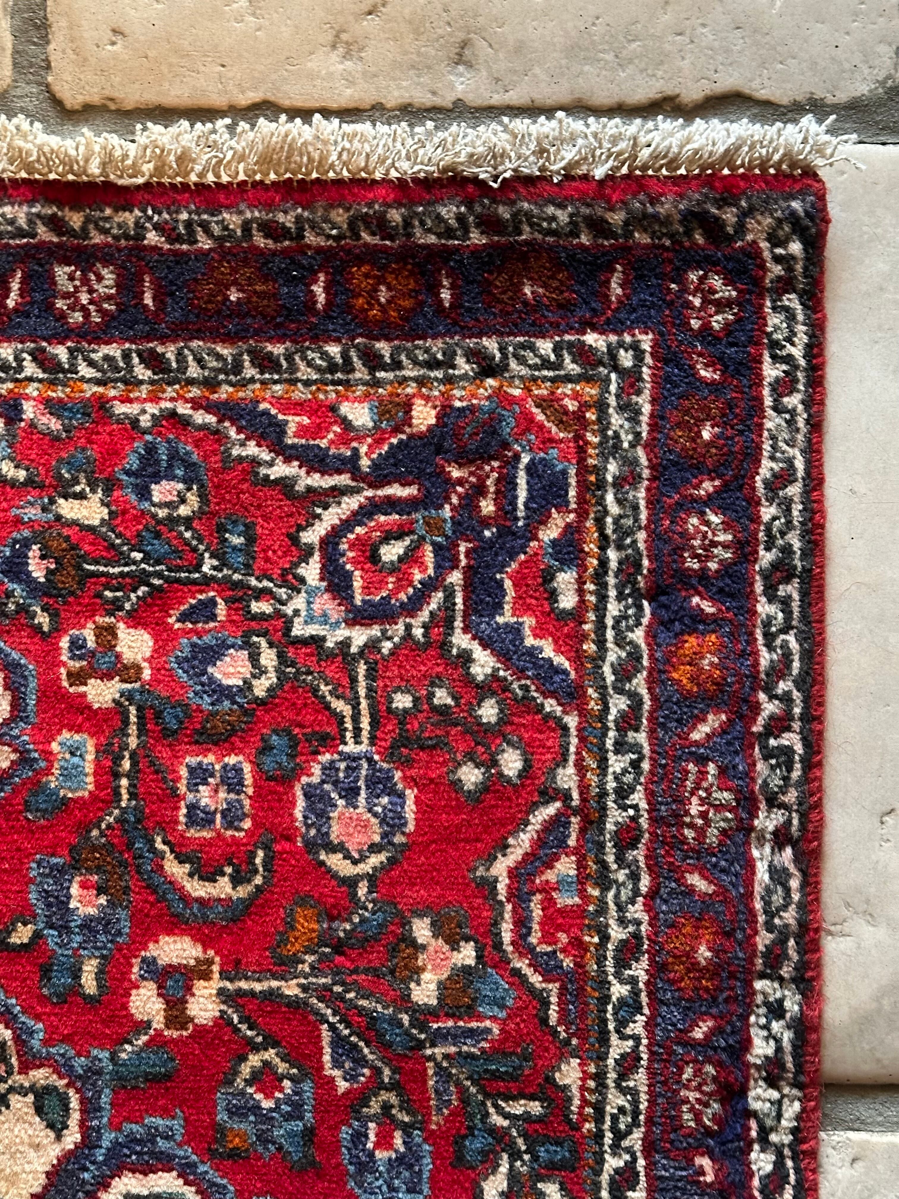 美しく輝く赤をベースに白い花を彩ったパルメット紋様が映えるハマダン近郊で織られたヴィレッジラグになります。