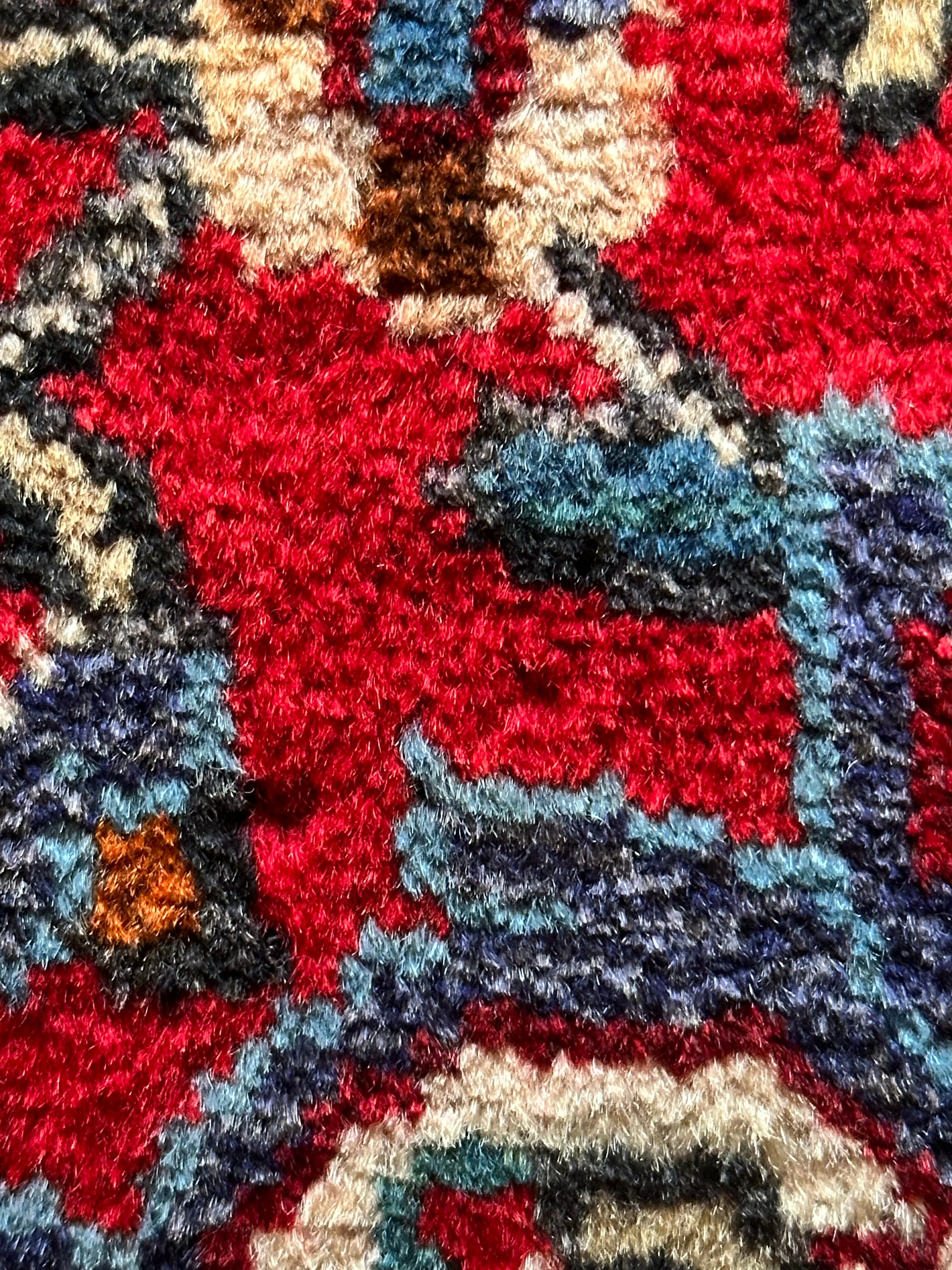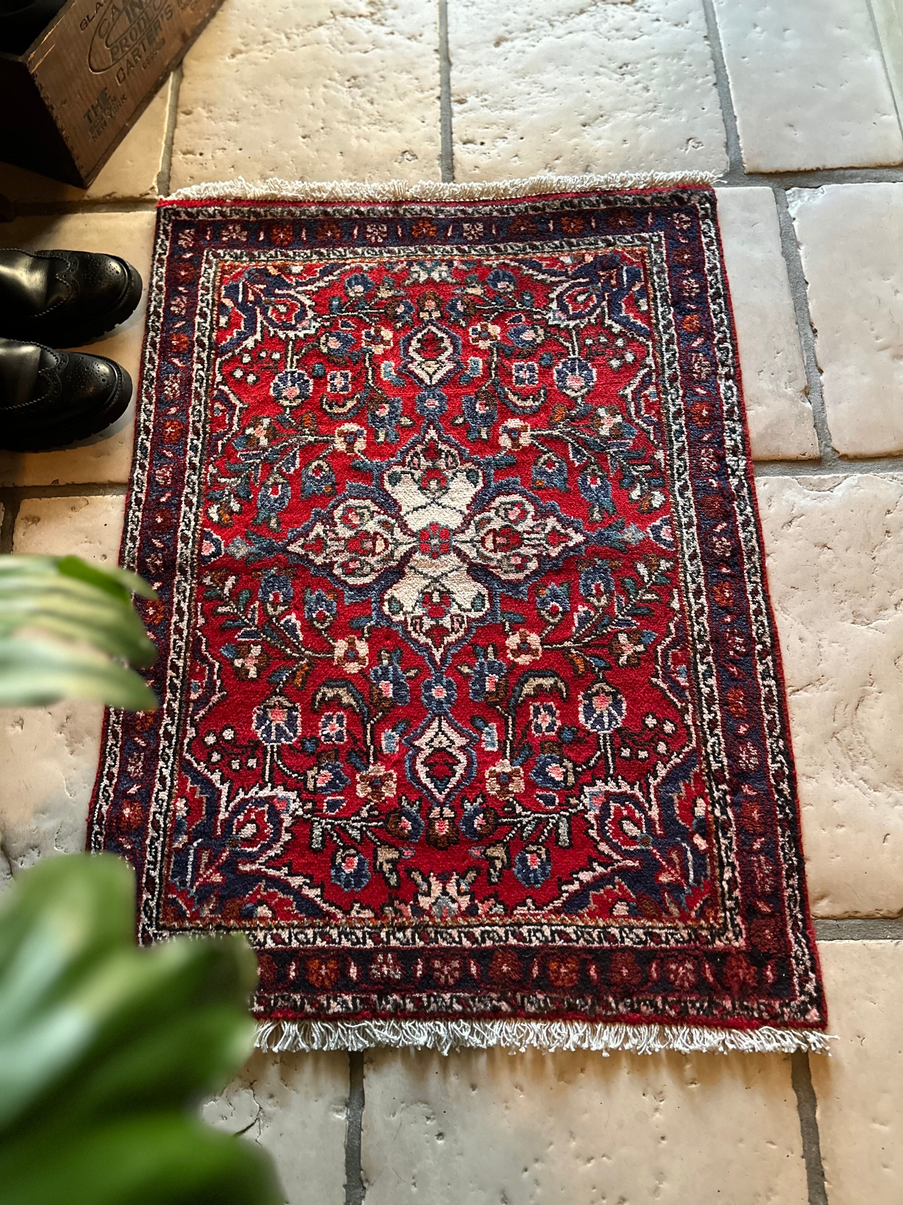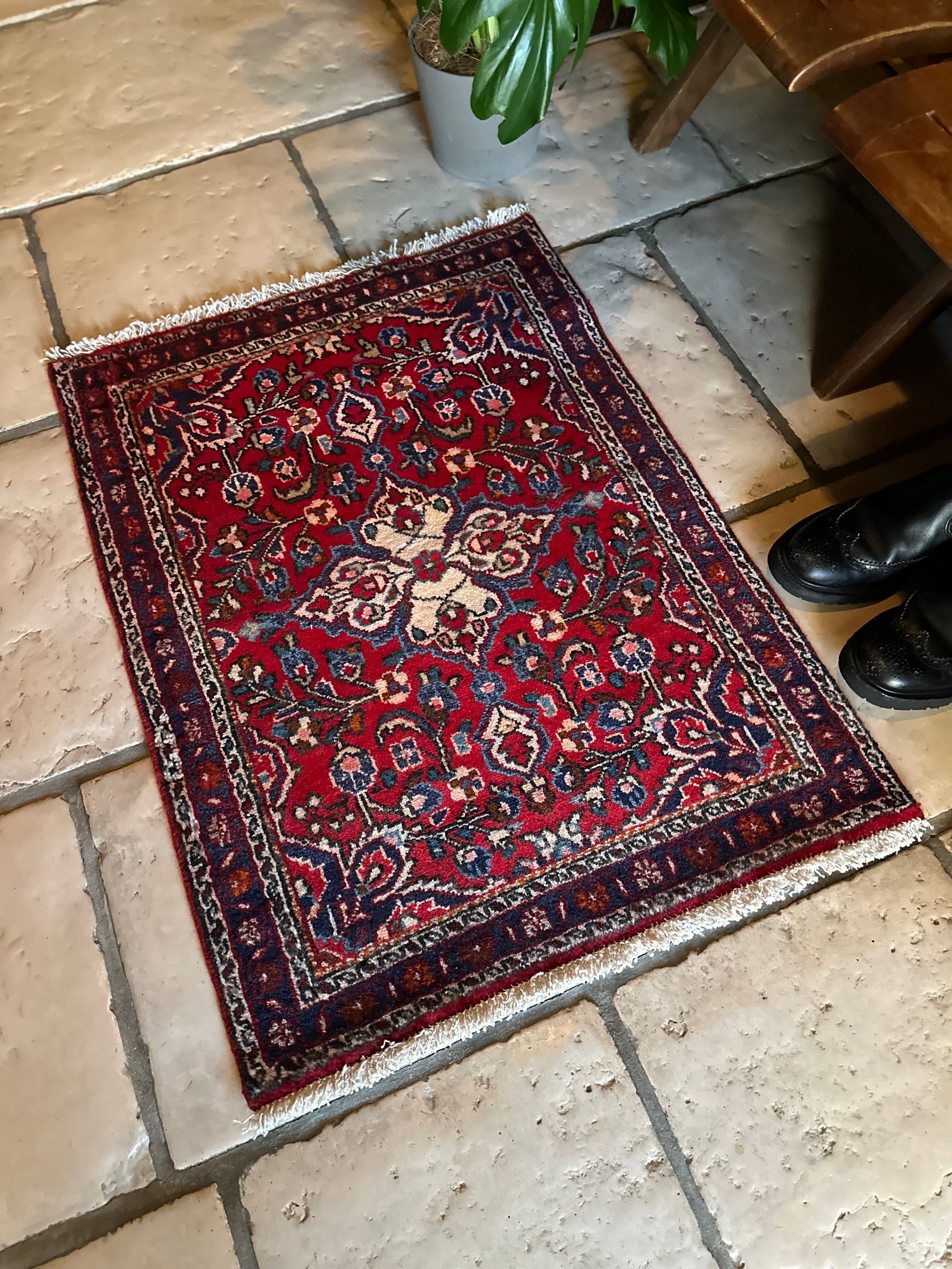 美しく輝く赤をベースに白い花を彩ったパルメット紋様が映えるハマダン近郊で織られたヴィレッジラグになります。