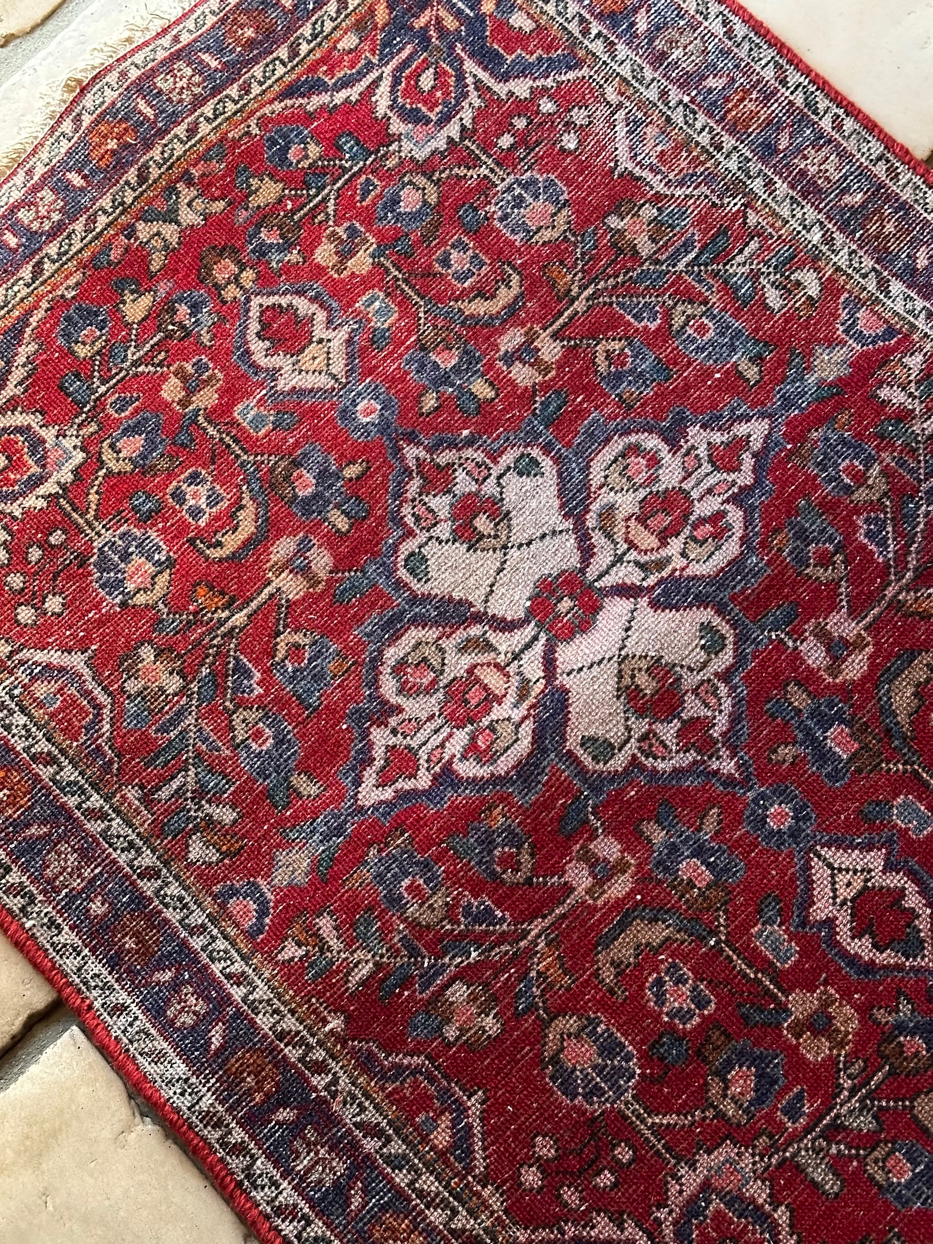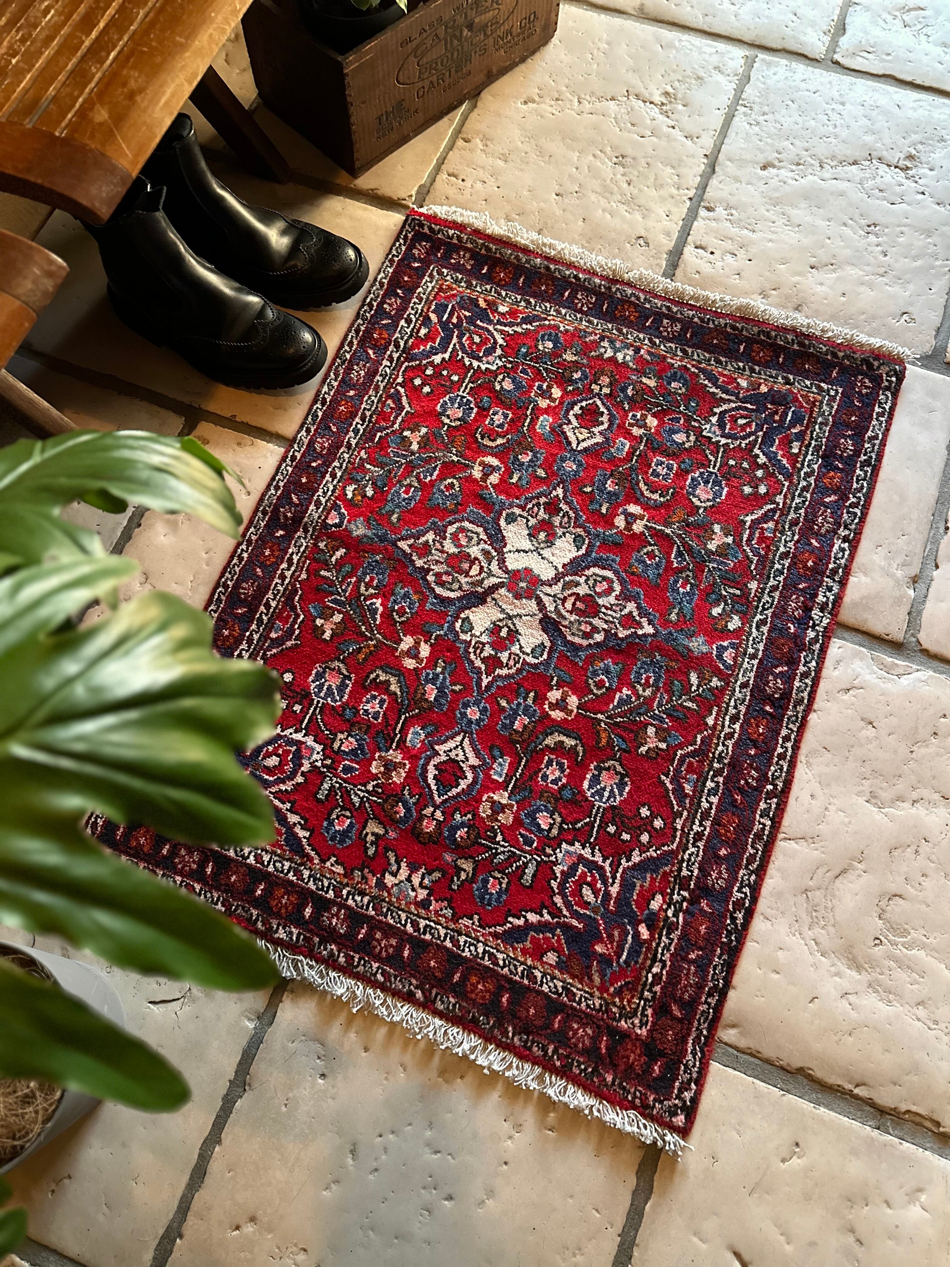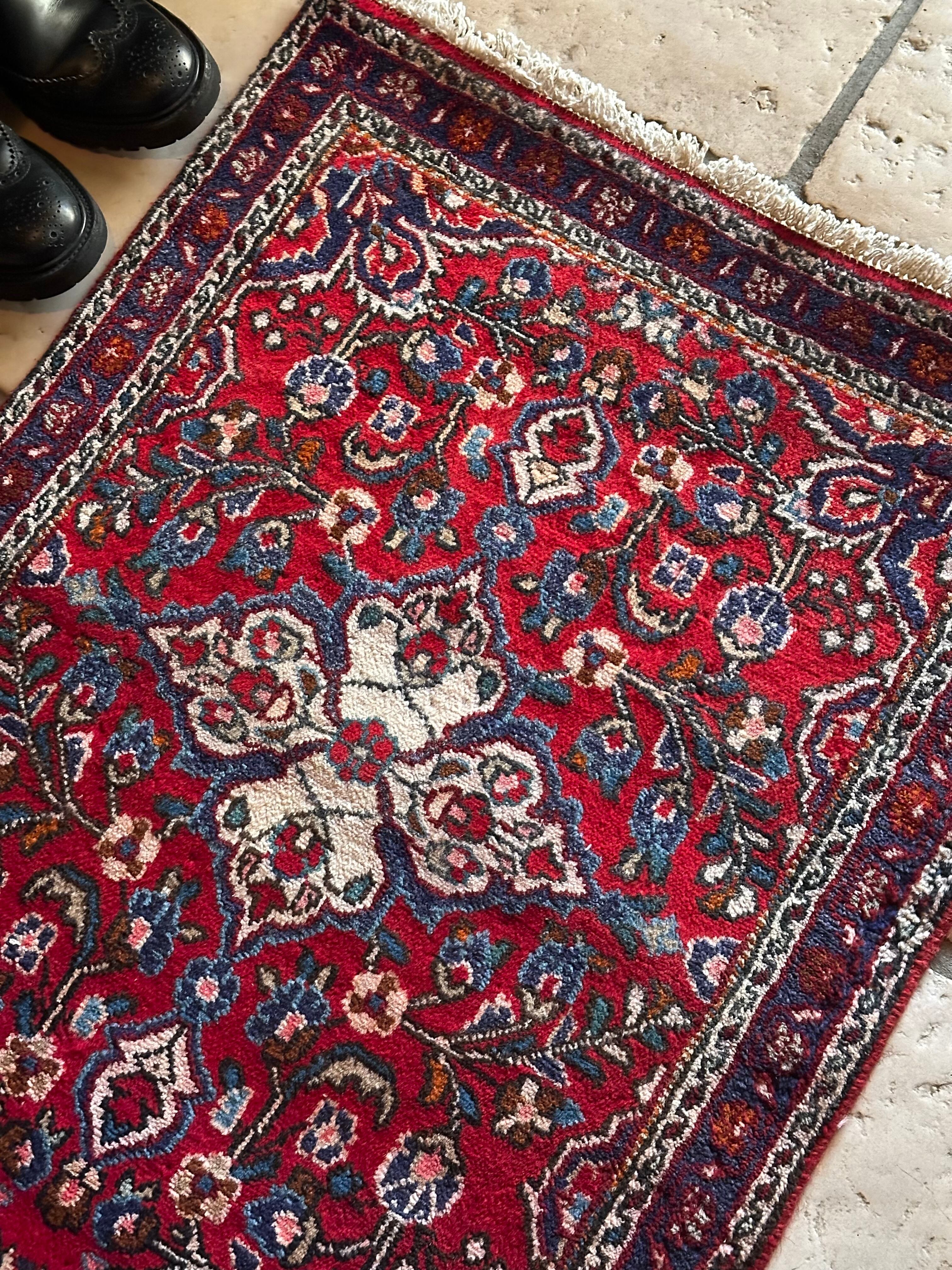 とりわけボタニカルなイメージが多いハマダン産ラグですが、こちらはターコイズにネイビーといった差し色がこれまた美しく、小さなサイズながらも見惚れてしまうペルシャ絨毯らしい1枚と言えるでしょうか。