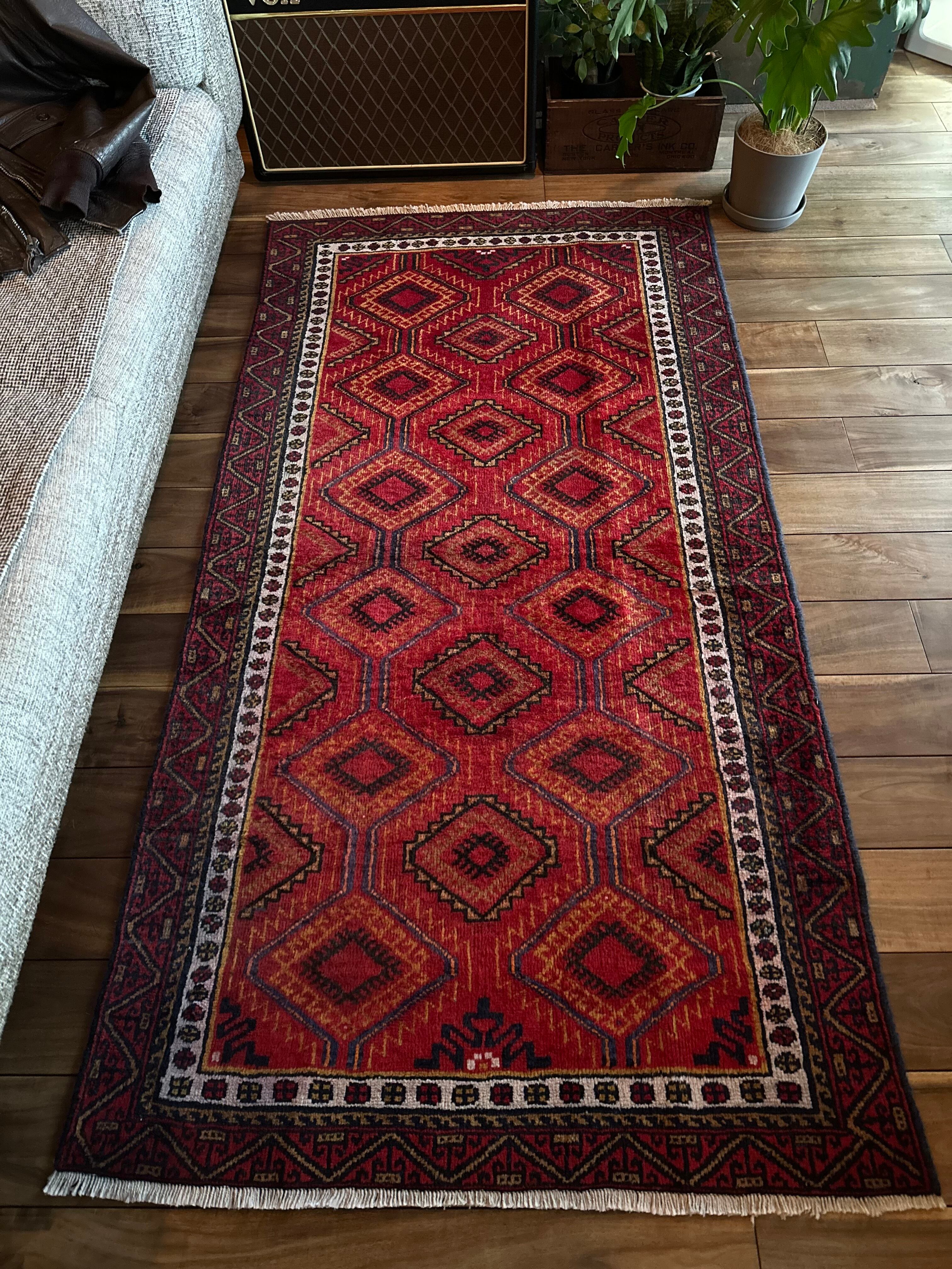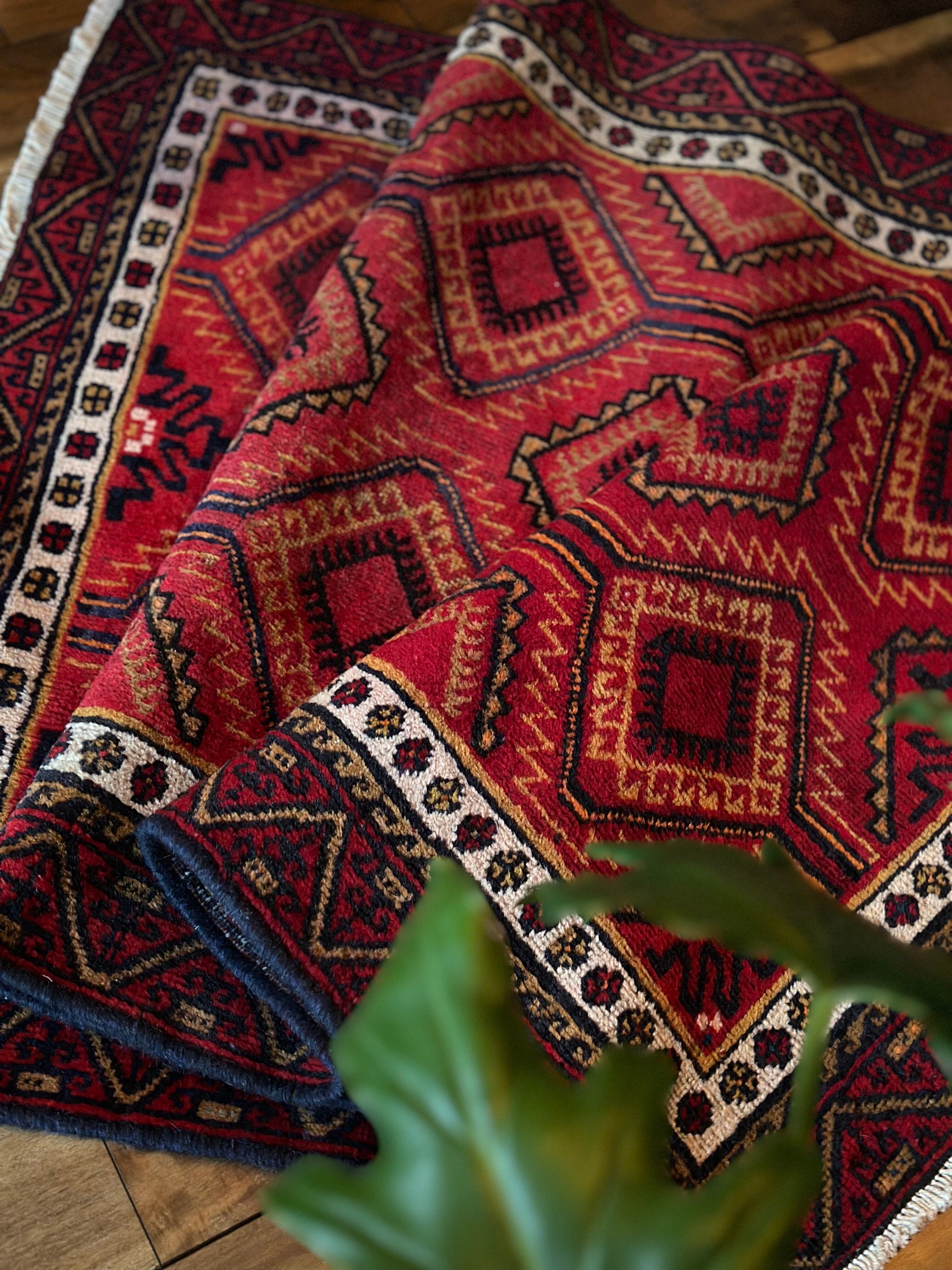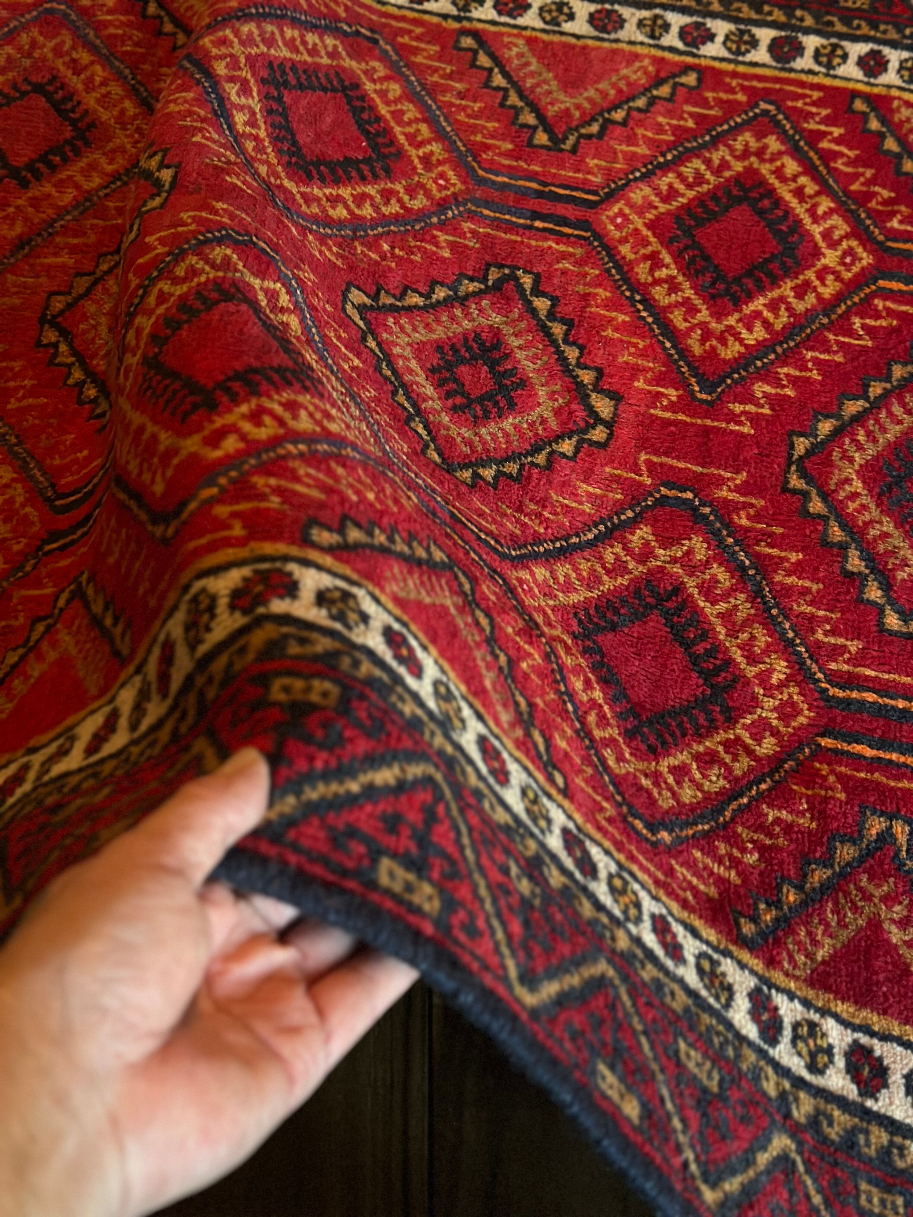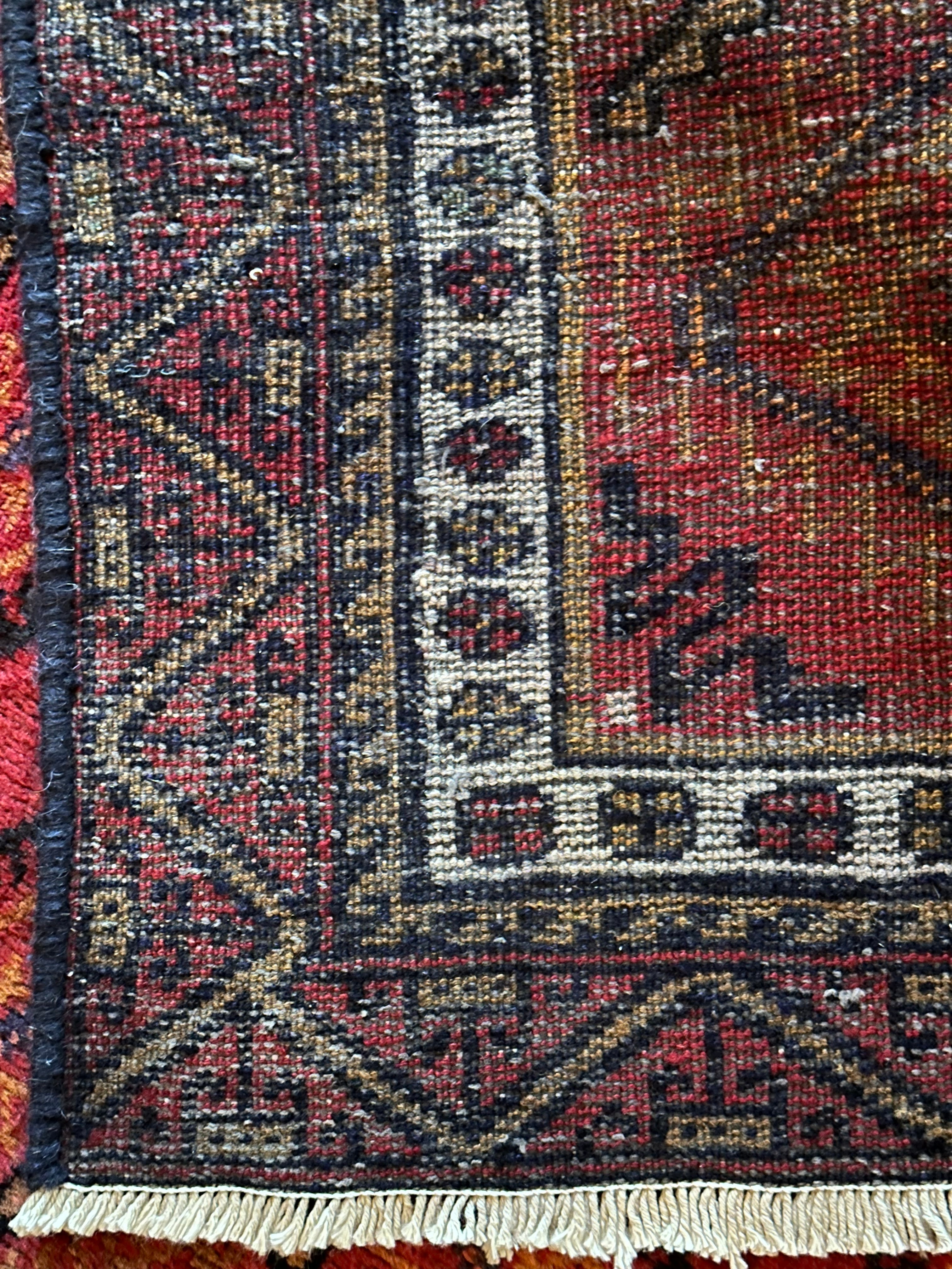 見た目にも鮮やかなオレンジが奇抜でありながらも、シンプルなフックドメダリオで部族らしさを醸し出したバルーチ族のトライバルラグになります。