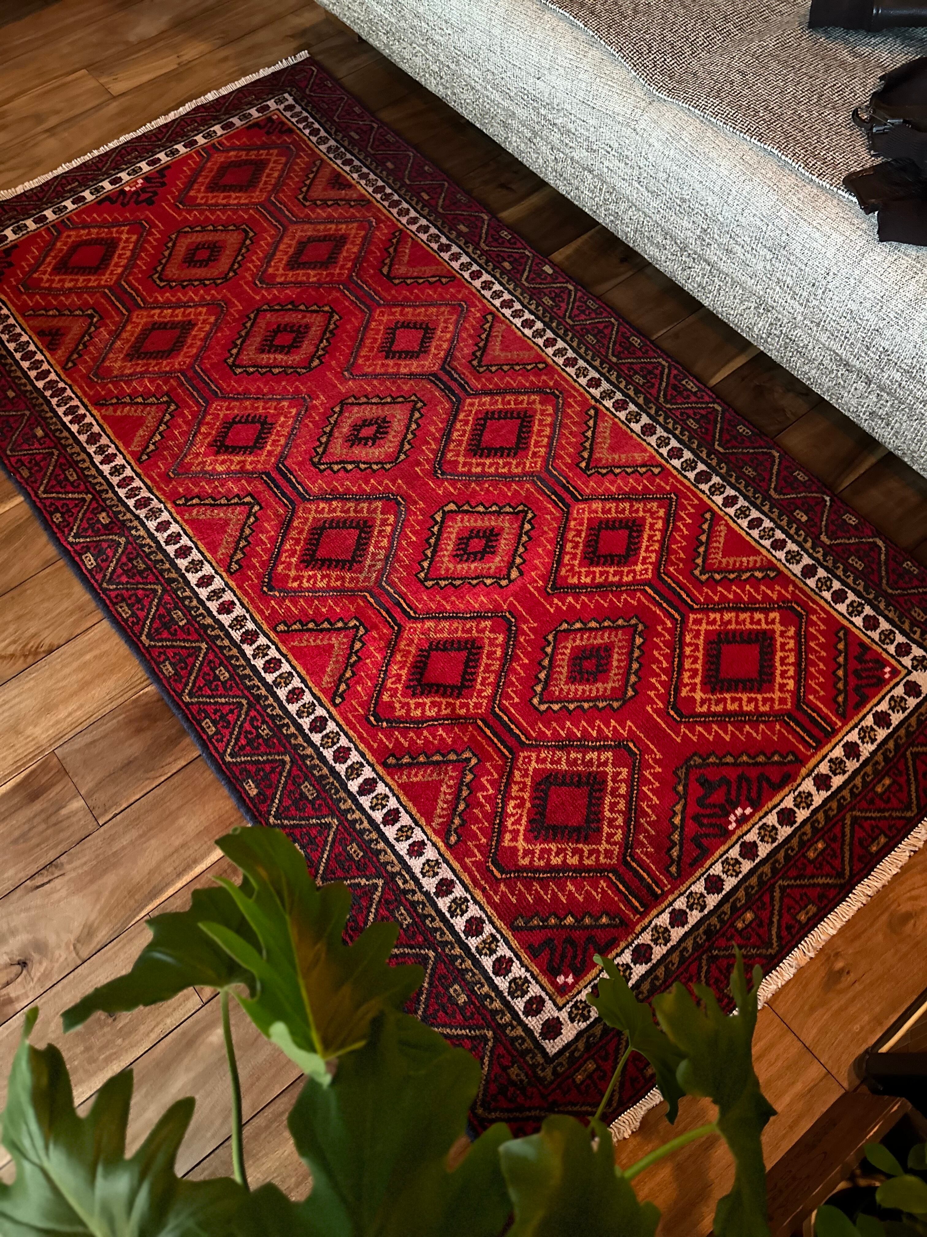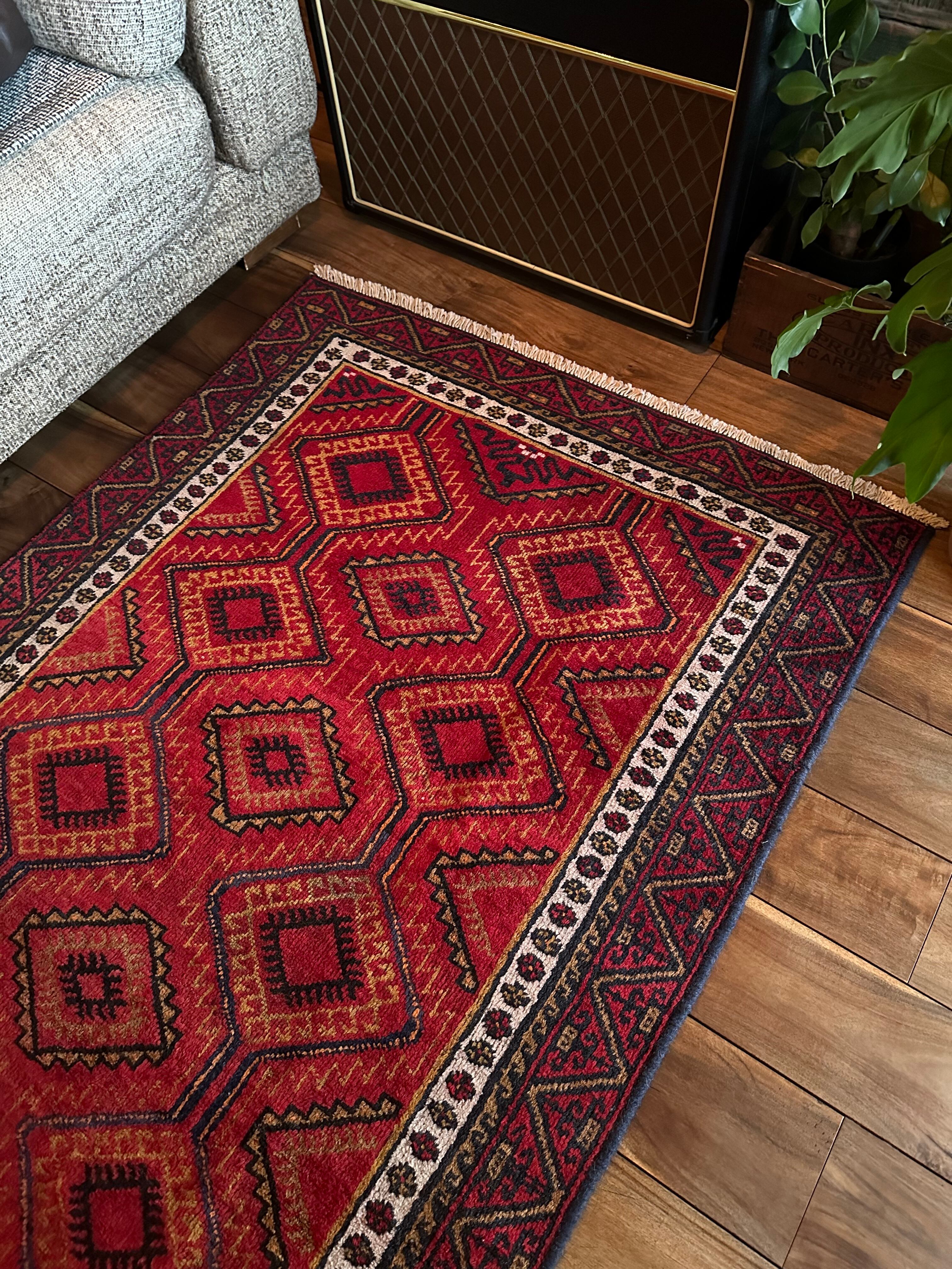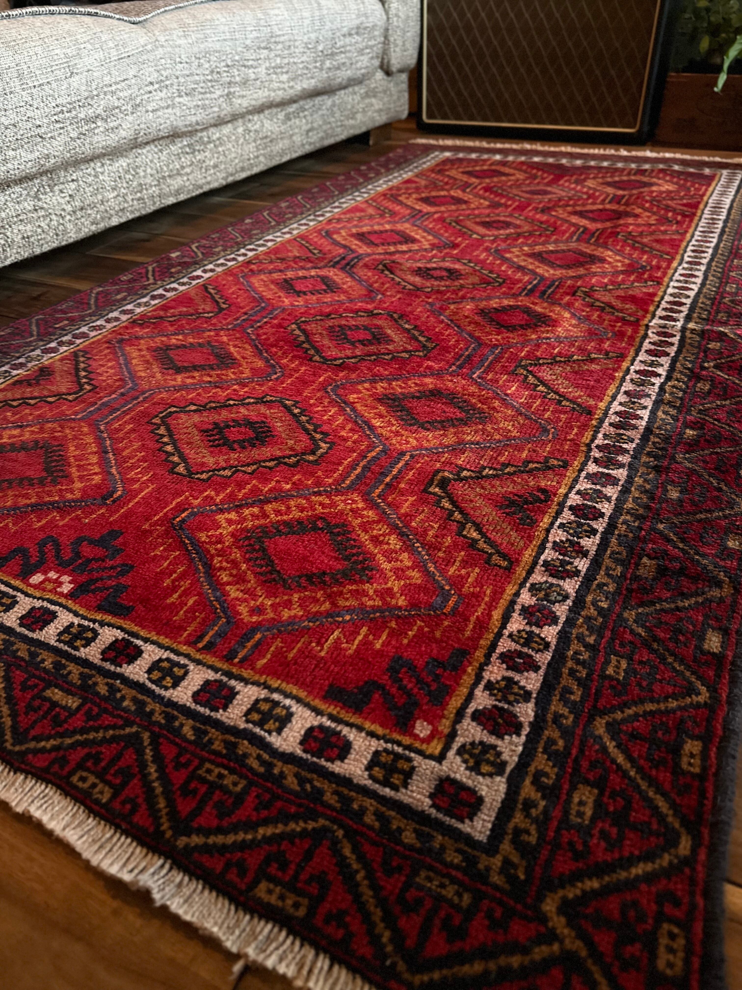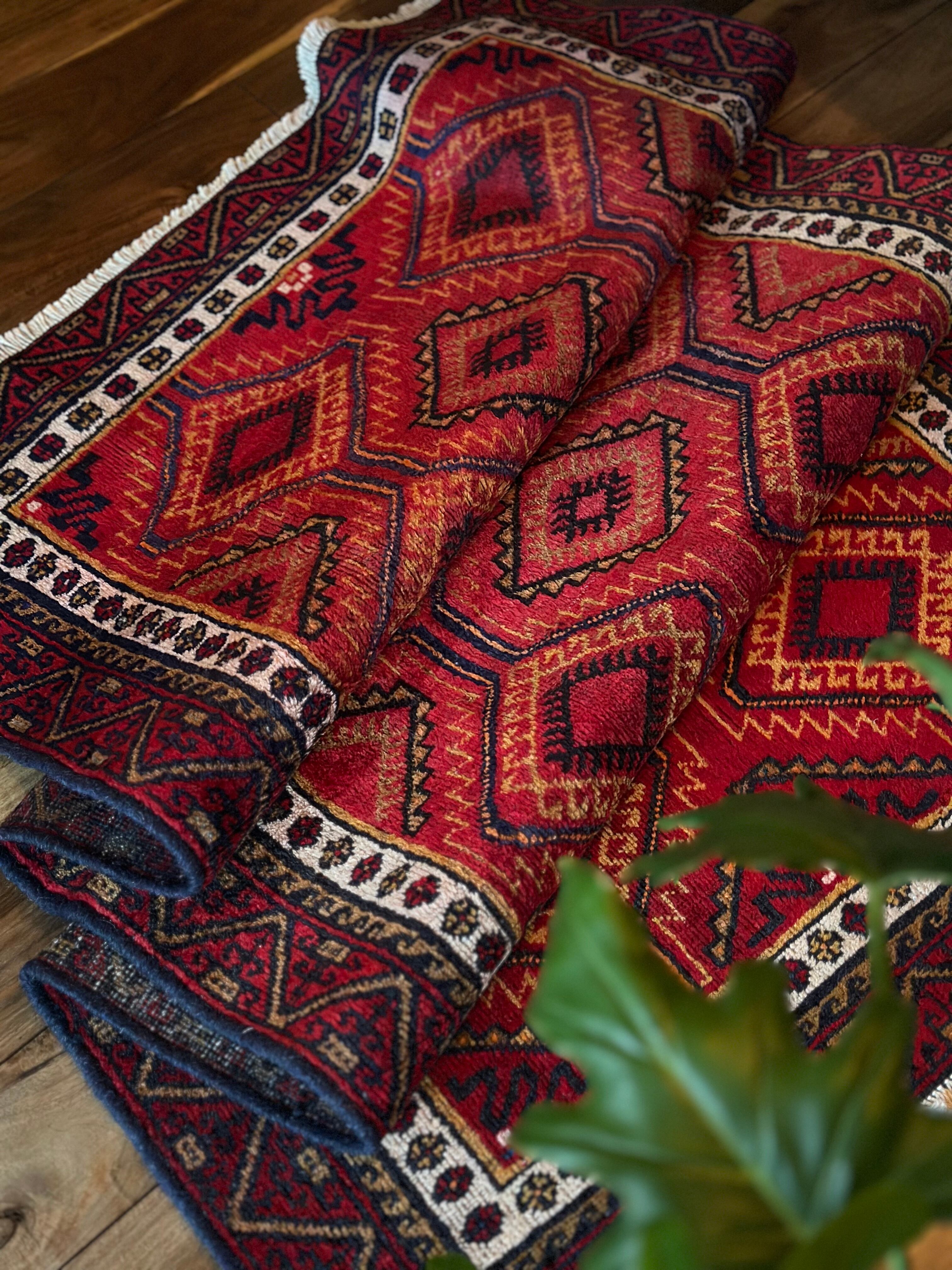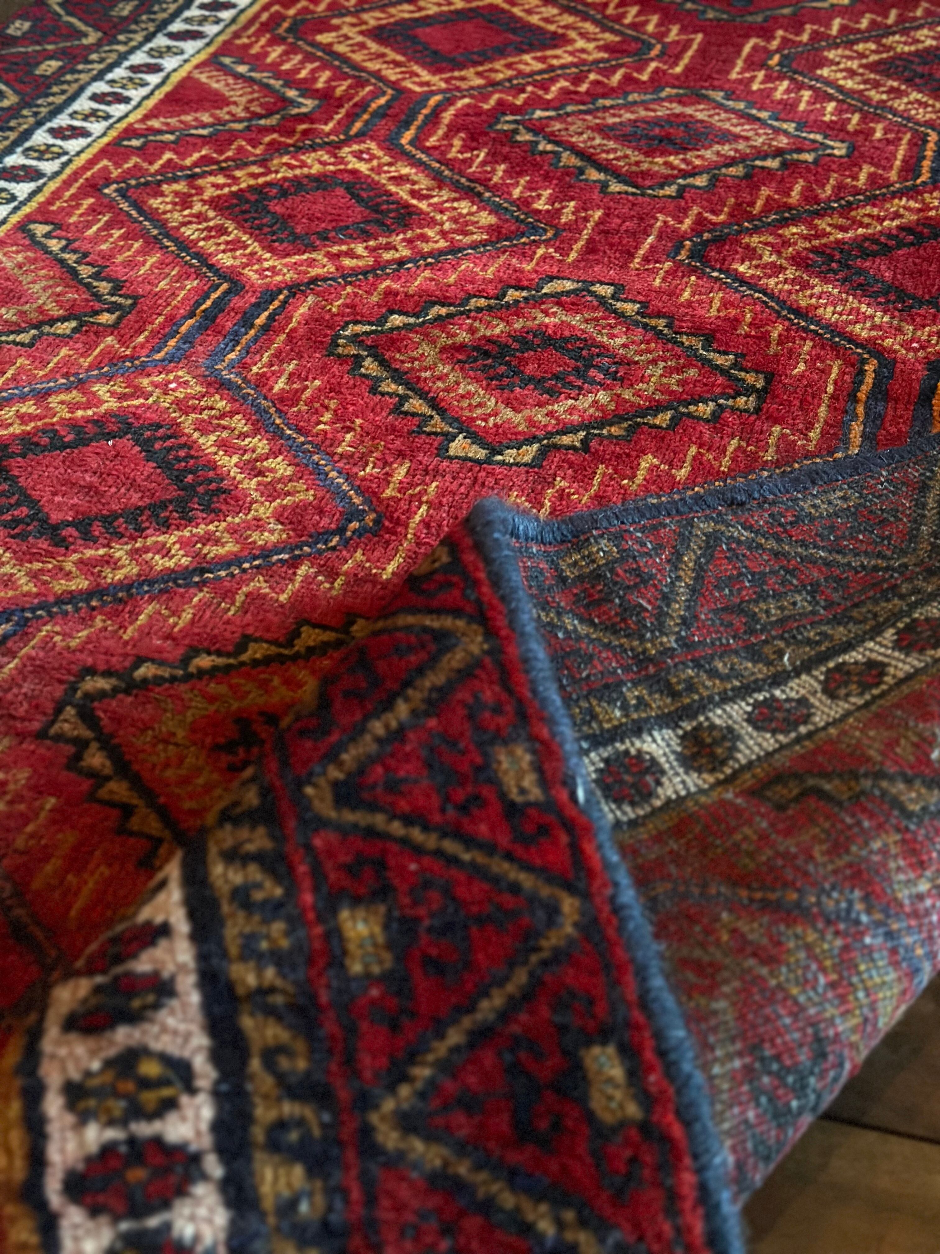 見た目にも鮮やかなオレンジが奇抜でありながらも、シンプルなフックドメダリオで部族らしさを醸し出したバルーチ族のトライバルラグになります。