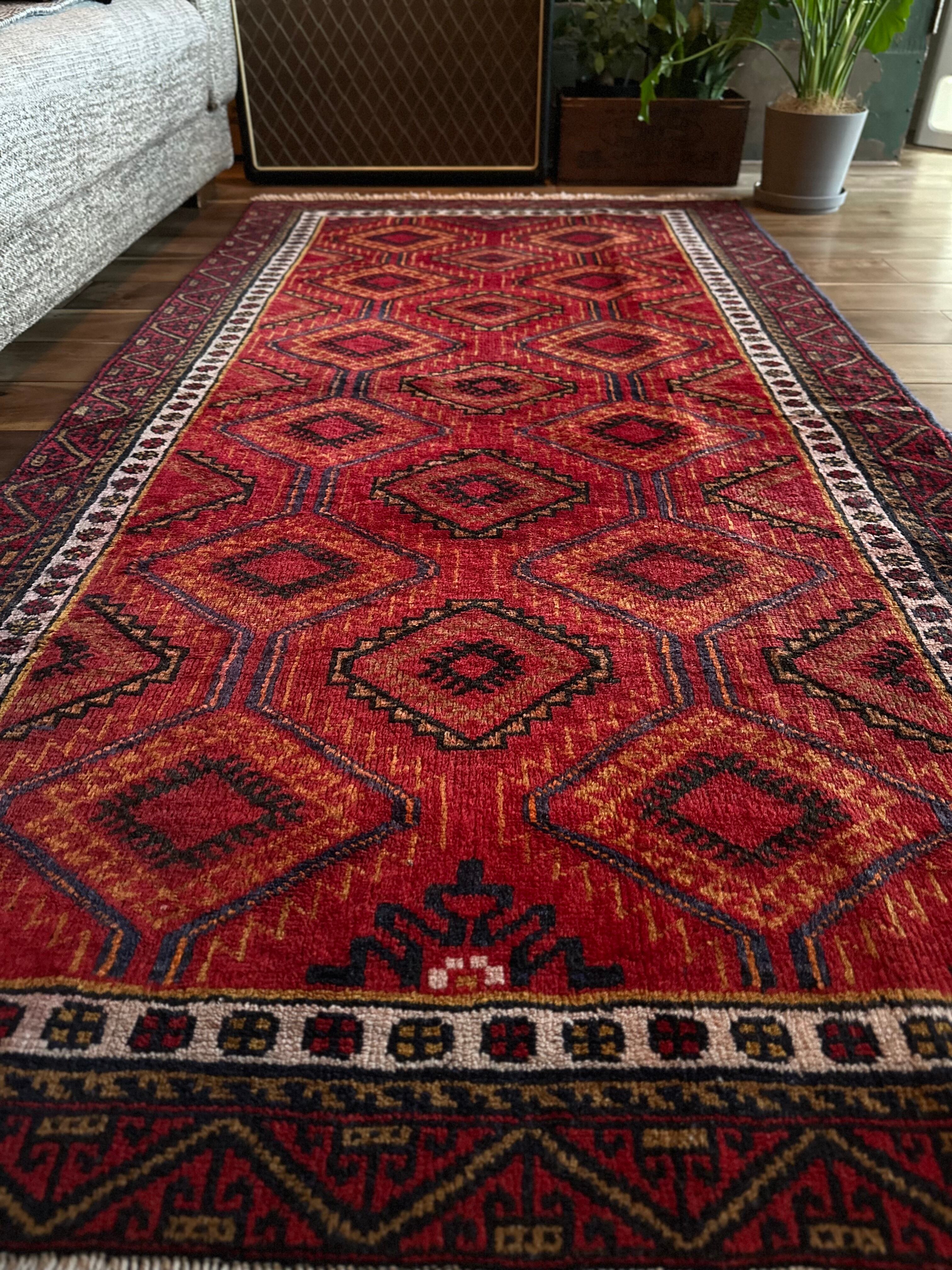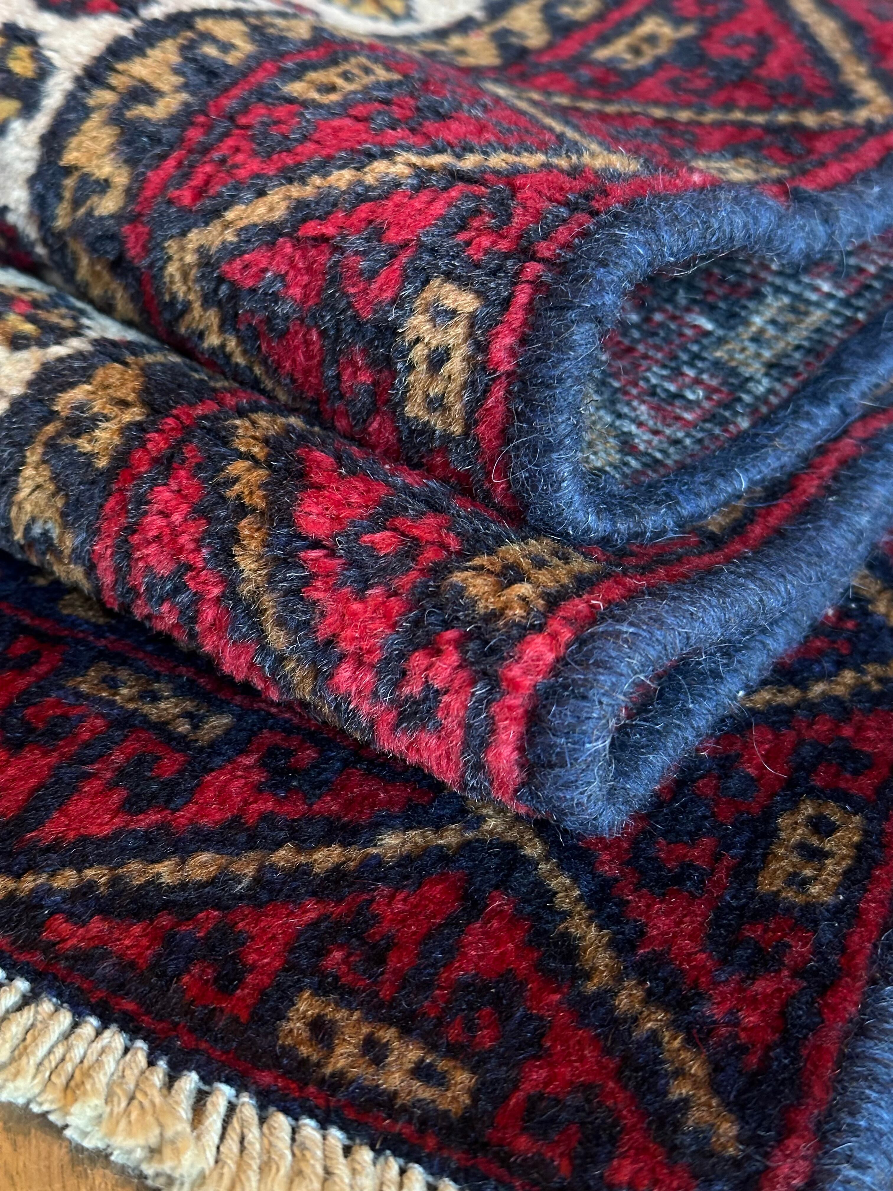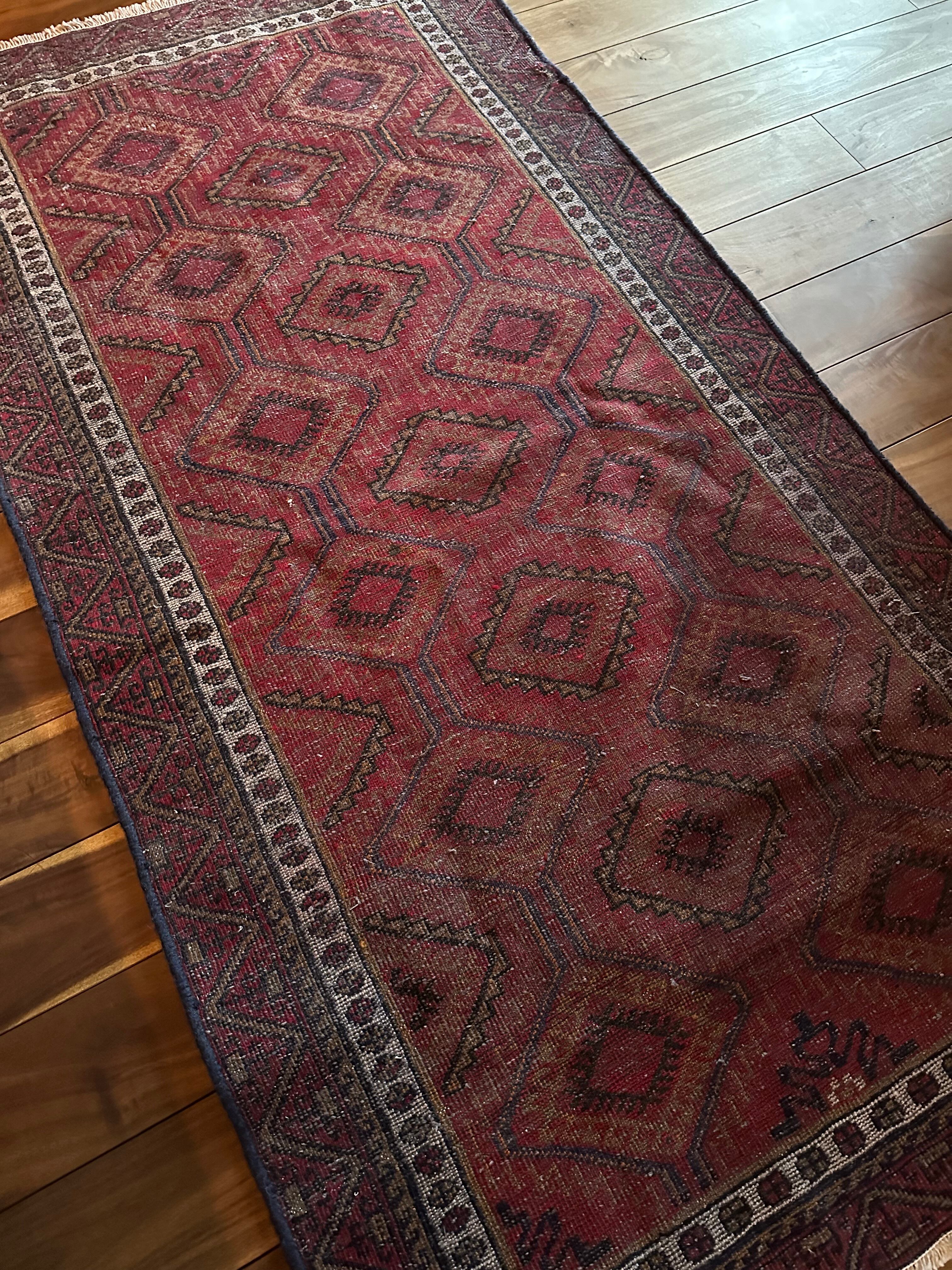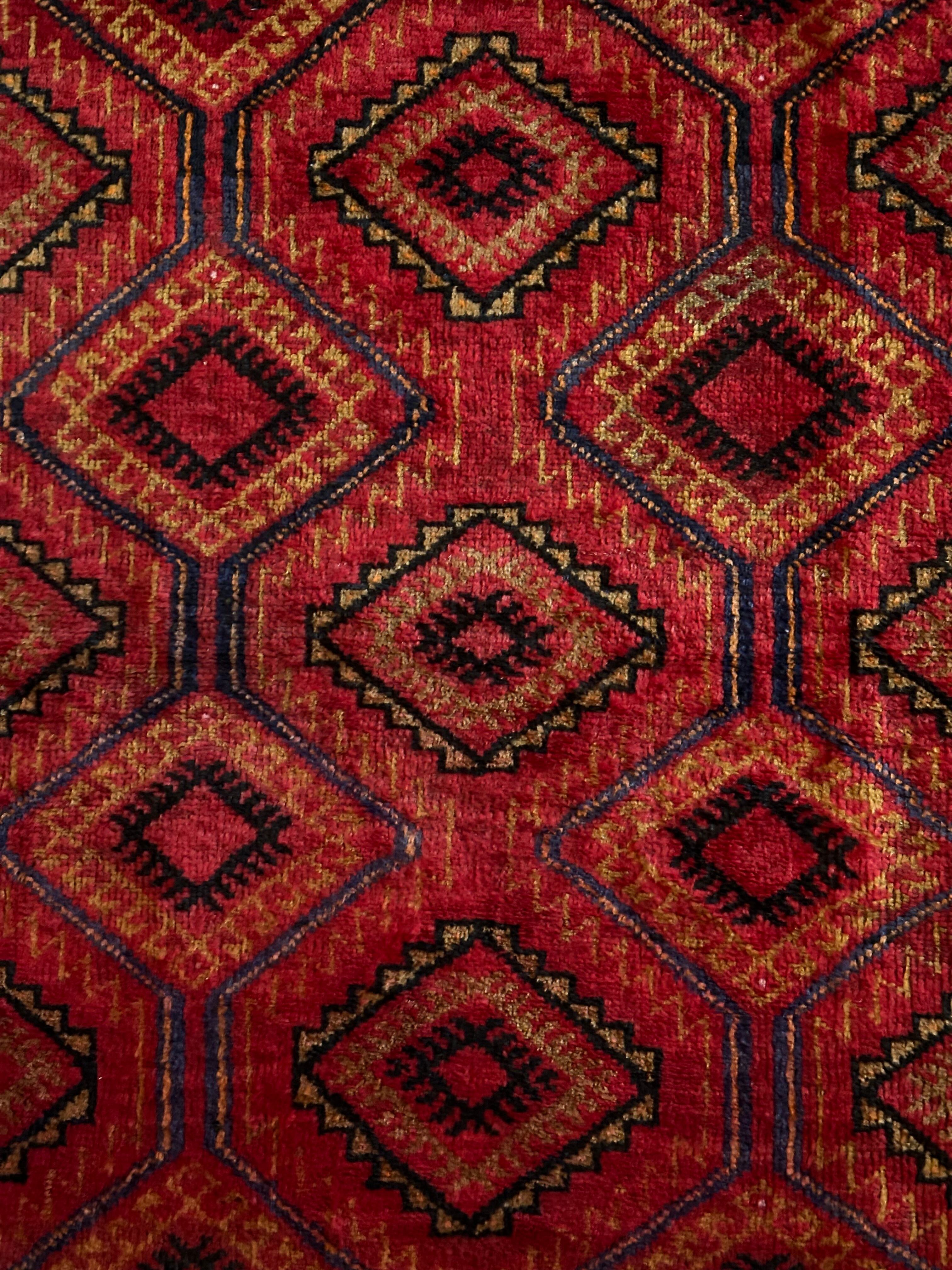 見た目にも鮮やかなオレンジが奇抜でありながらも、シンプルなフックドメダリオで部族らしさを醸し出したバルーチ族のトライバルラグになります。
