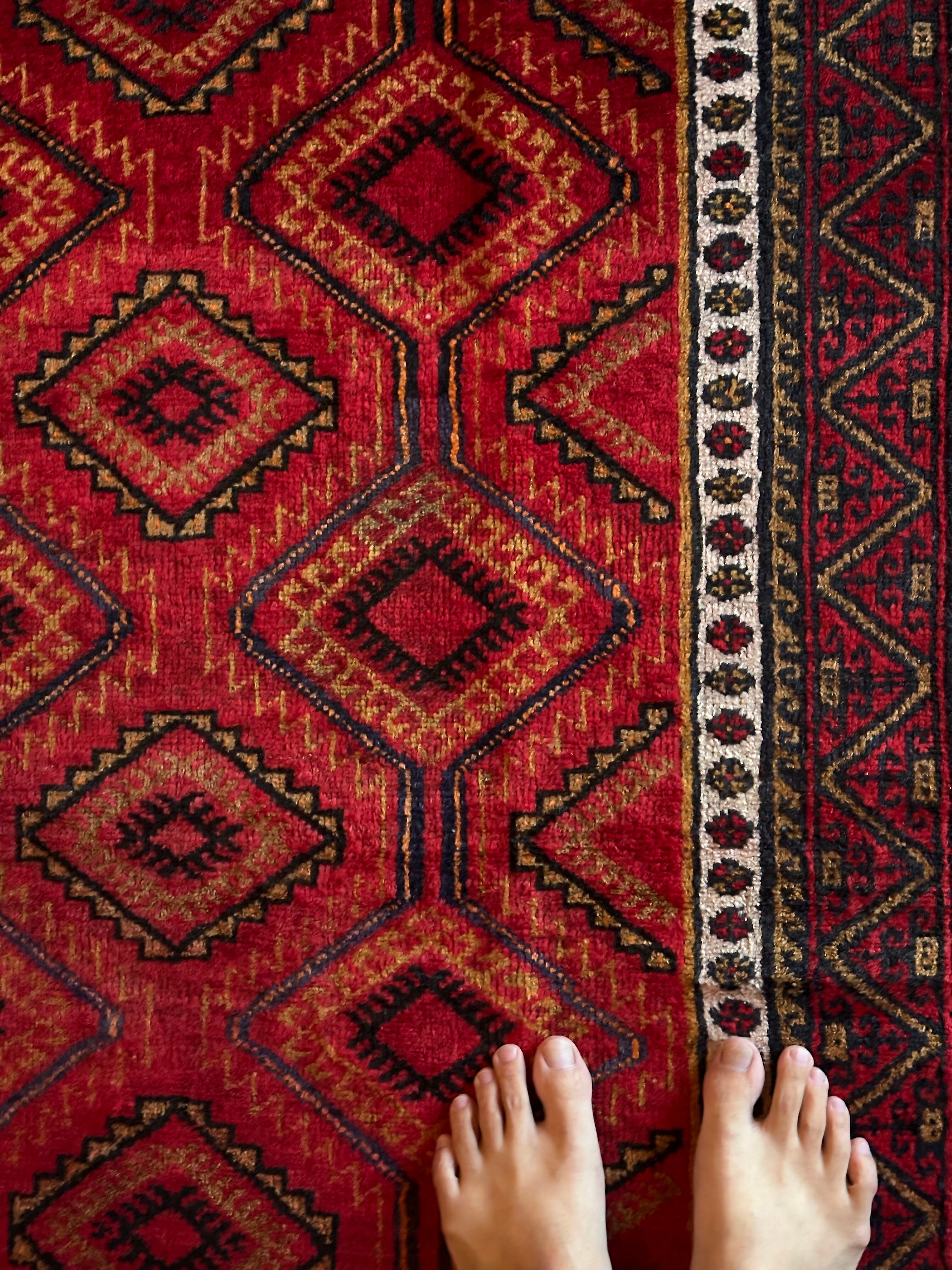またラグそのものに関しては羊毛特有の匂いがあり、手織りならではの歪みに水洗いクリーニングによる縮み、また草木染めによる経年劣化の色ムラなどがありますが、それもまたヴィンテージラグの魅力かとご理解ください。