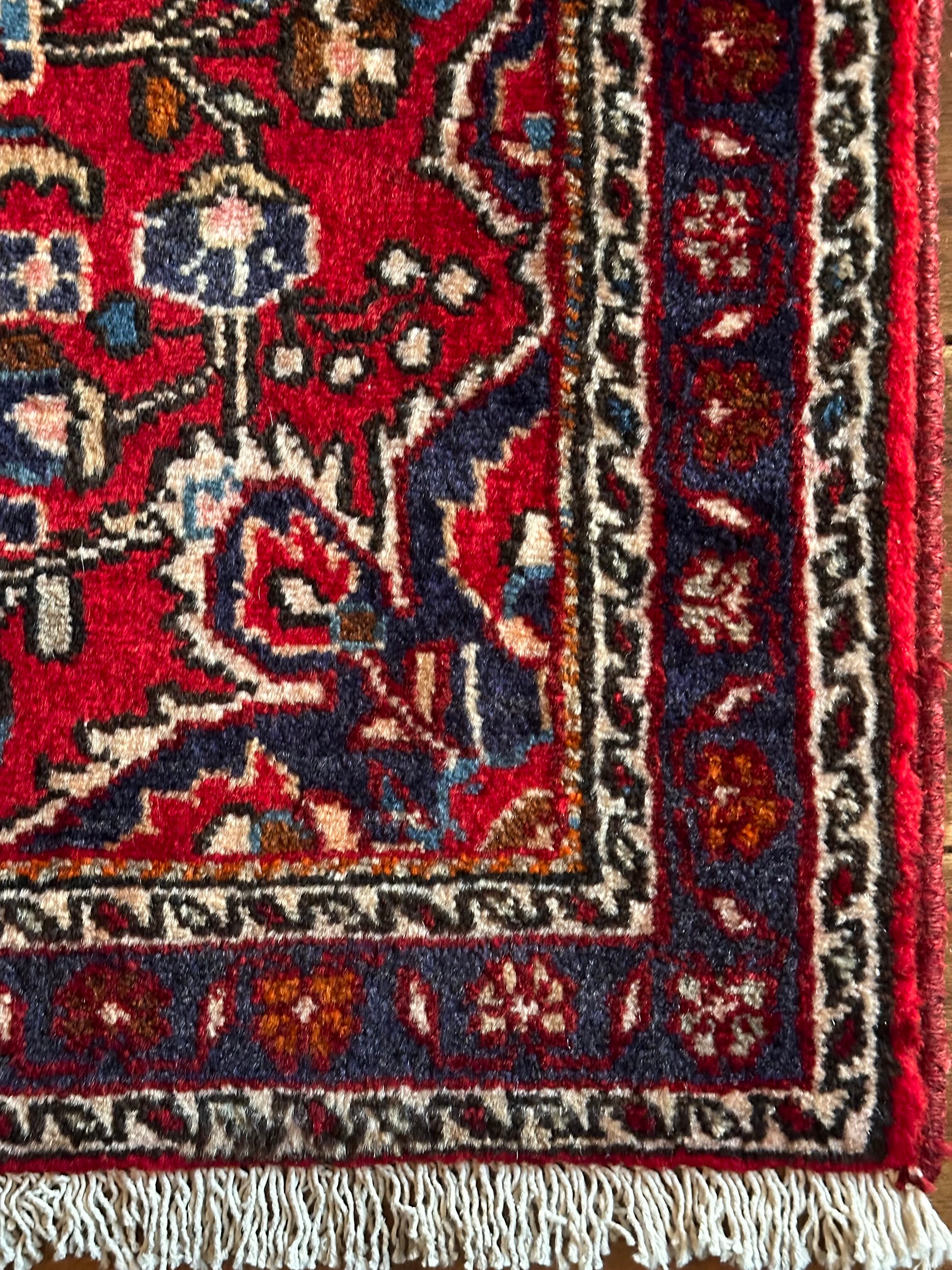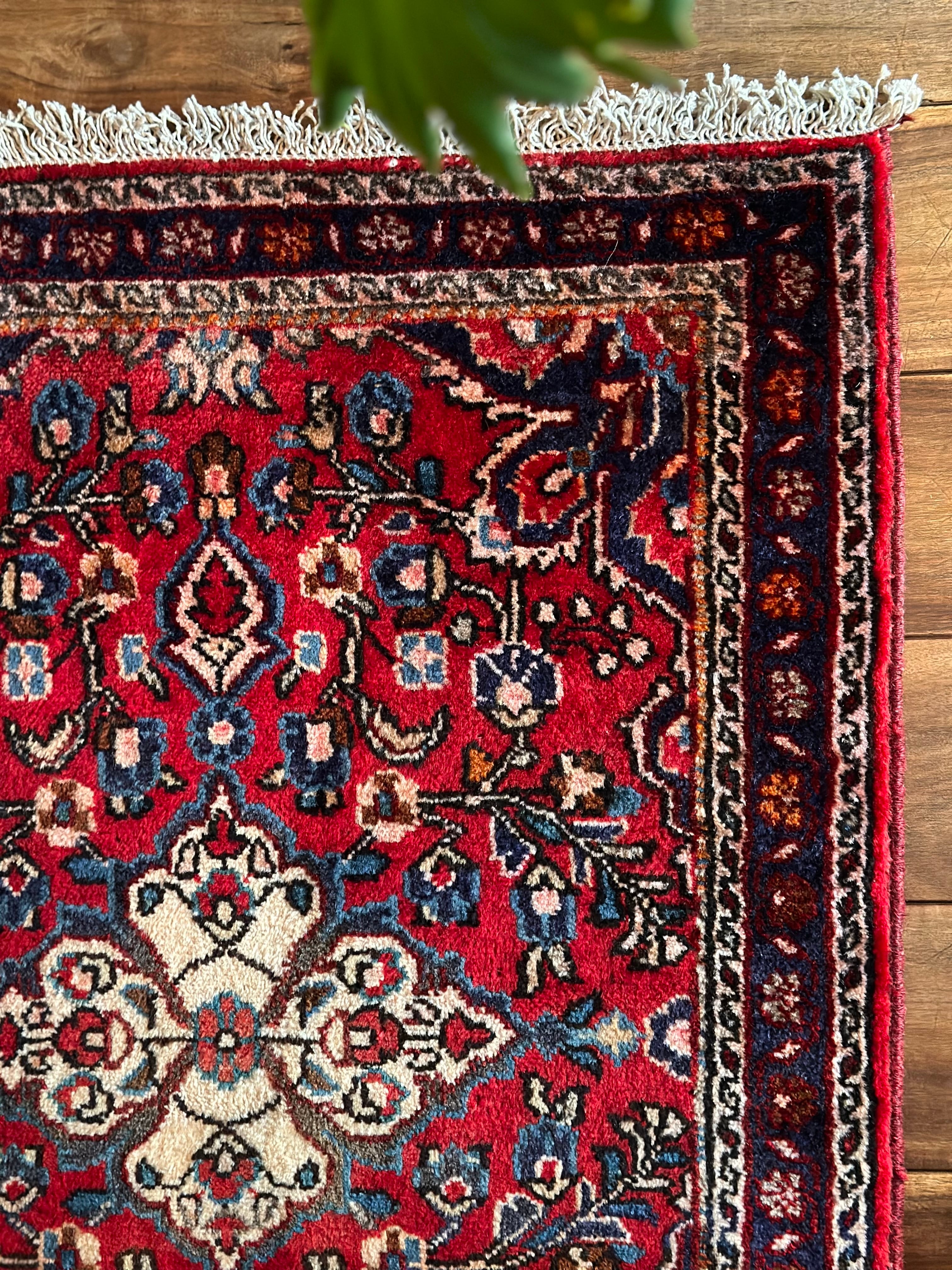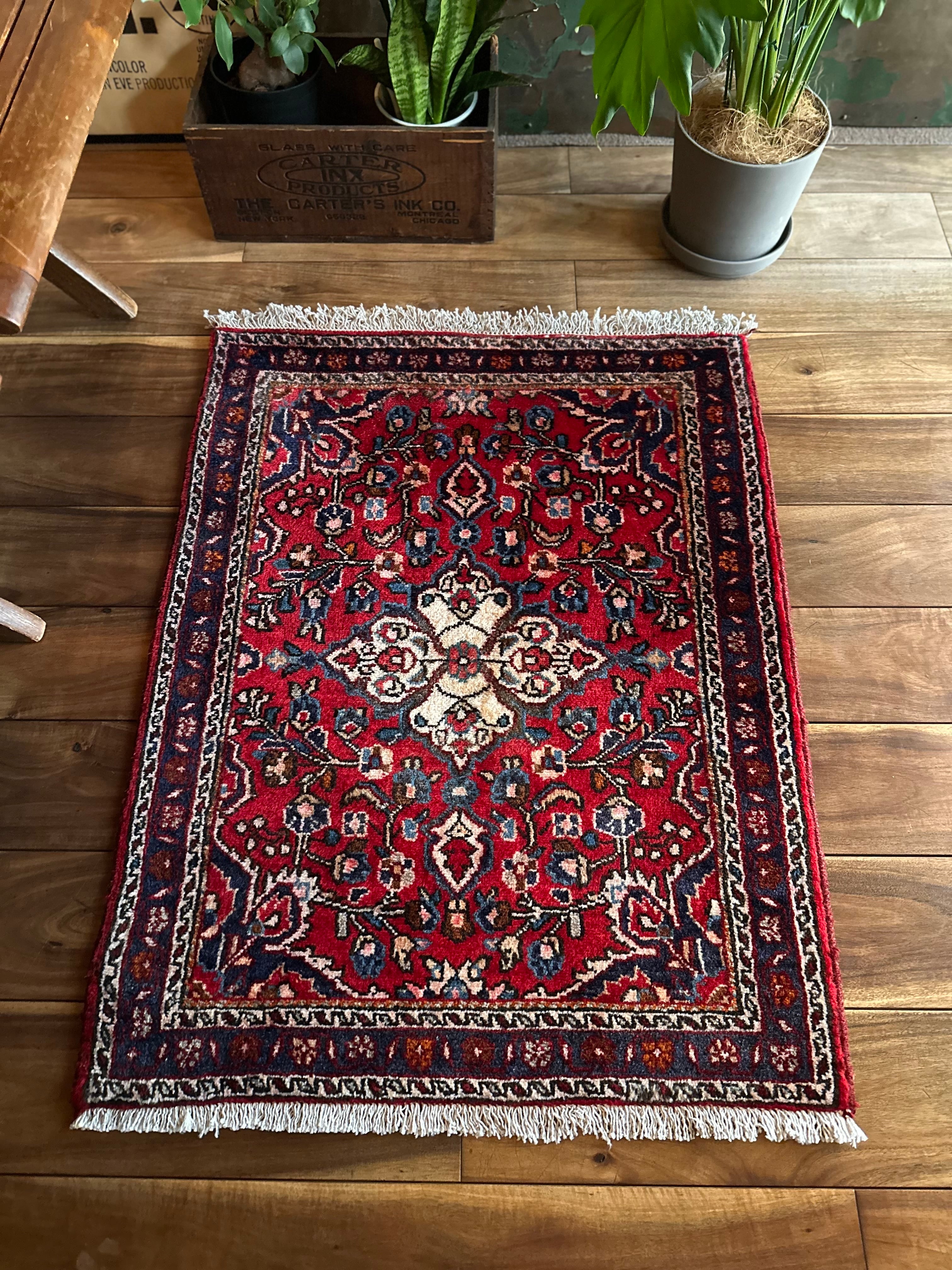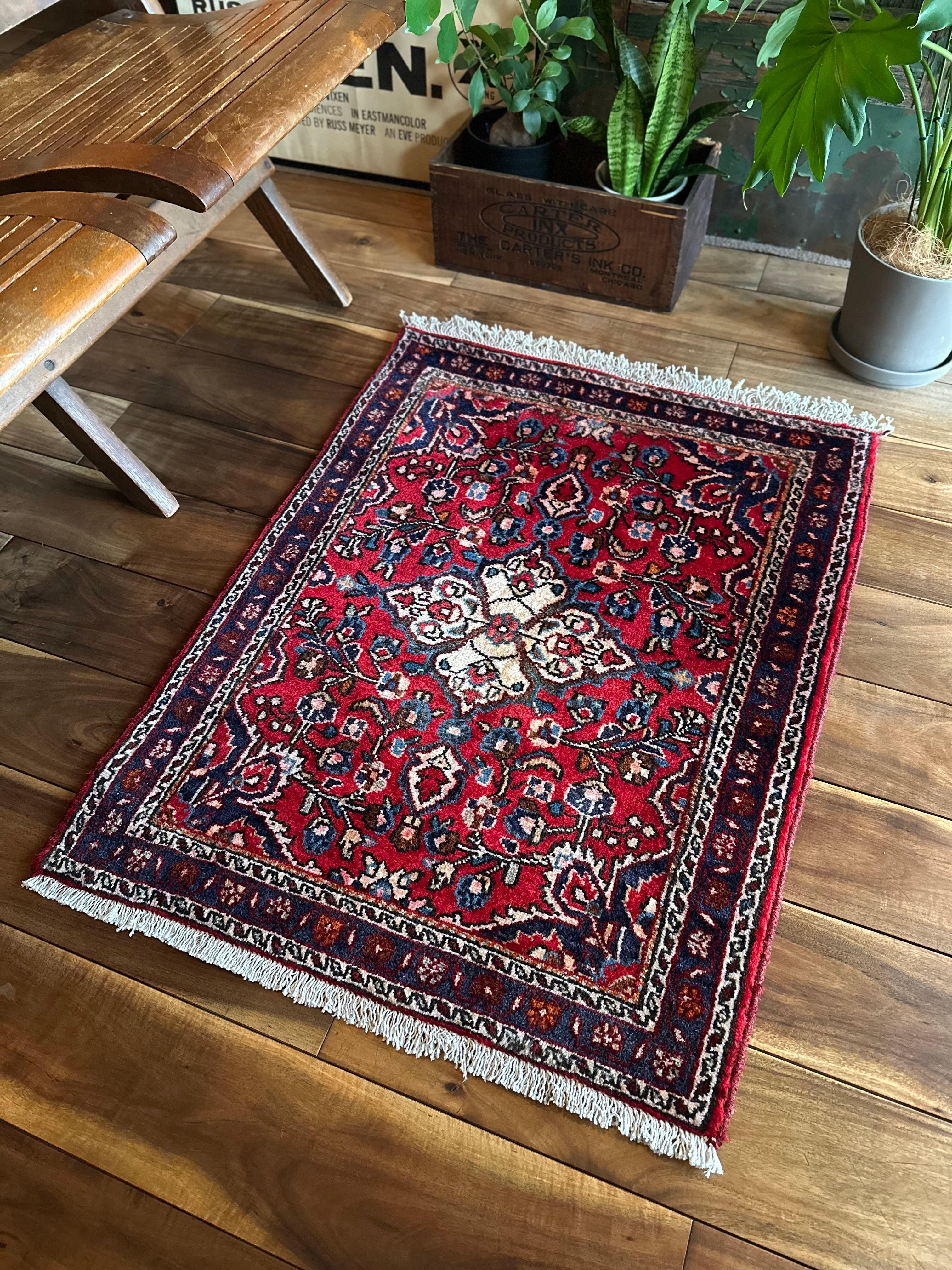 とりわけボタニカルなイメージが多いハマダン産ラグですが、こちらはターコイズにネイビーといった差し色がこれまた美しく、小さなサイズながらも見惚れてしまうペルシャ絨毯らしい1枚と言えるでしょうか。