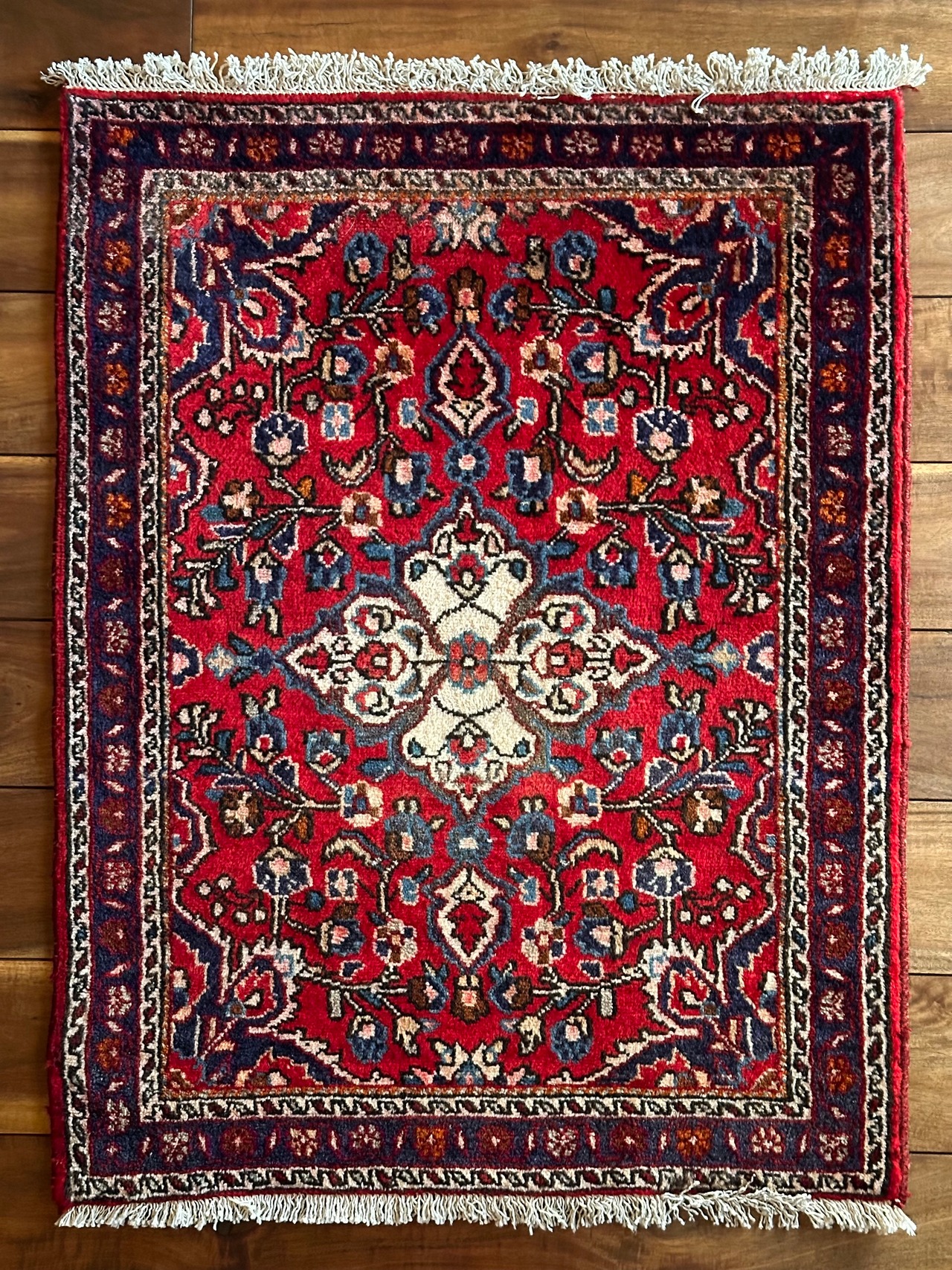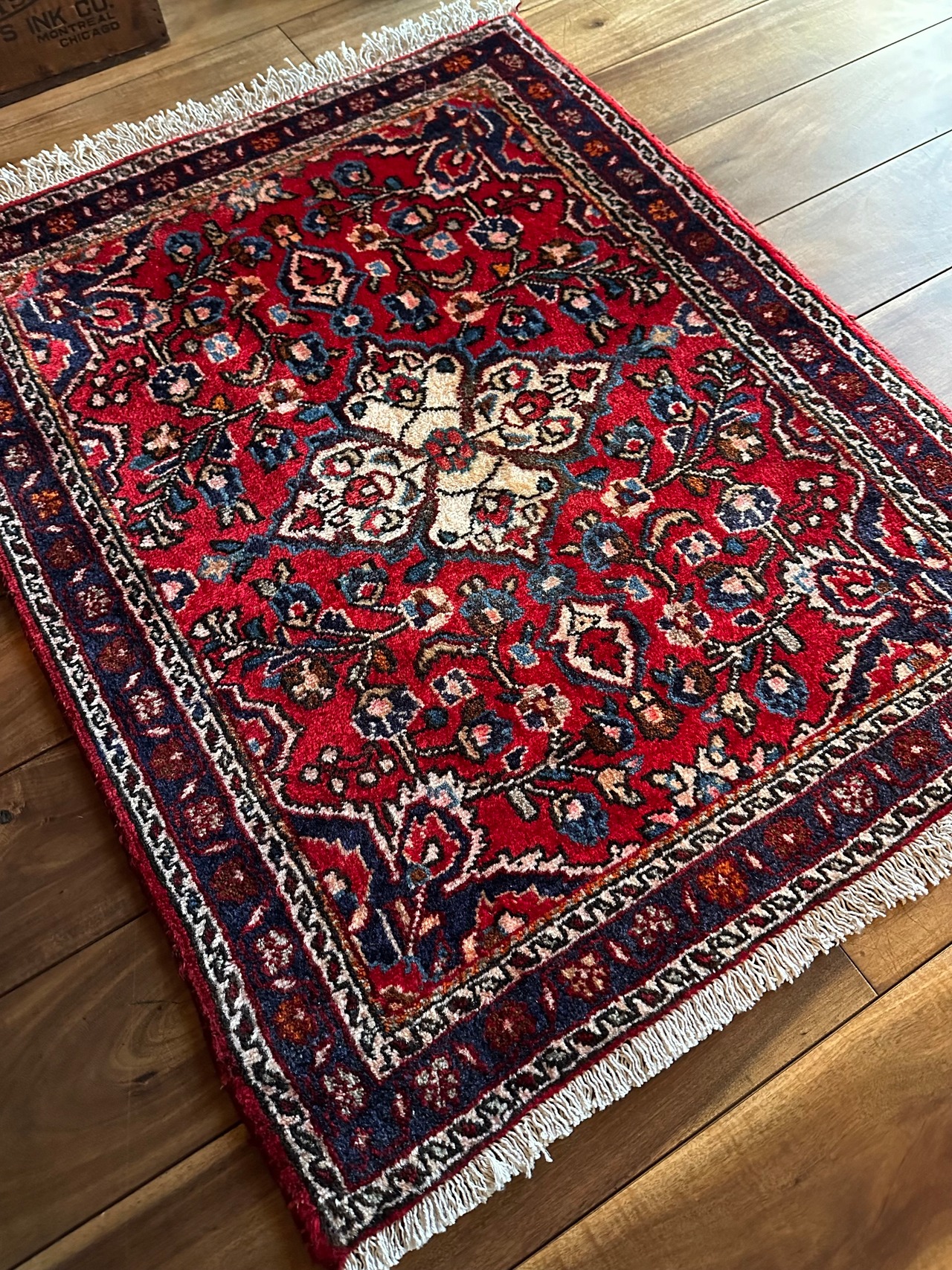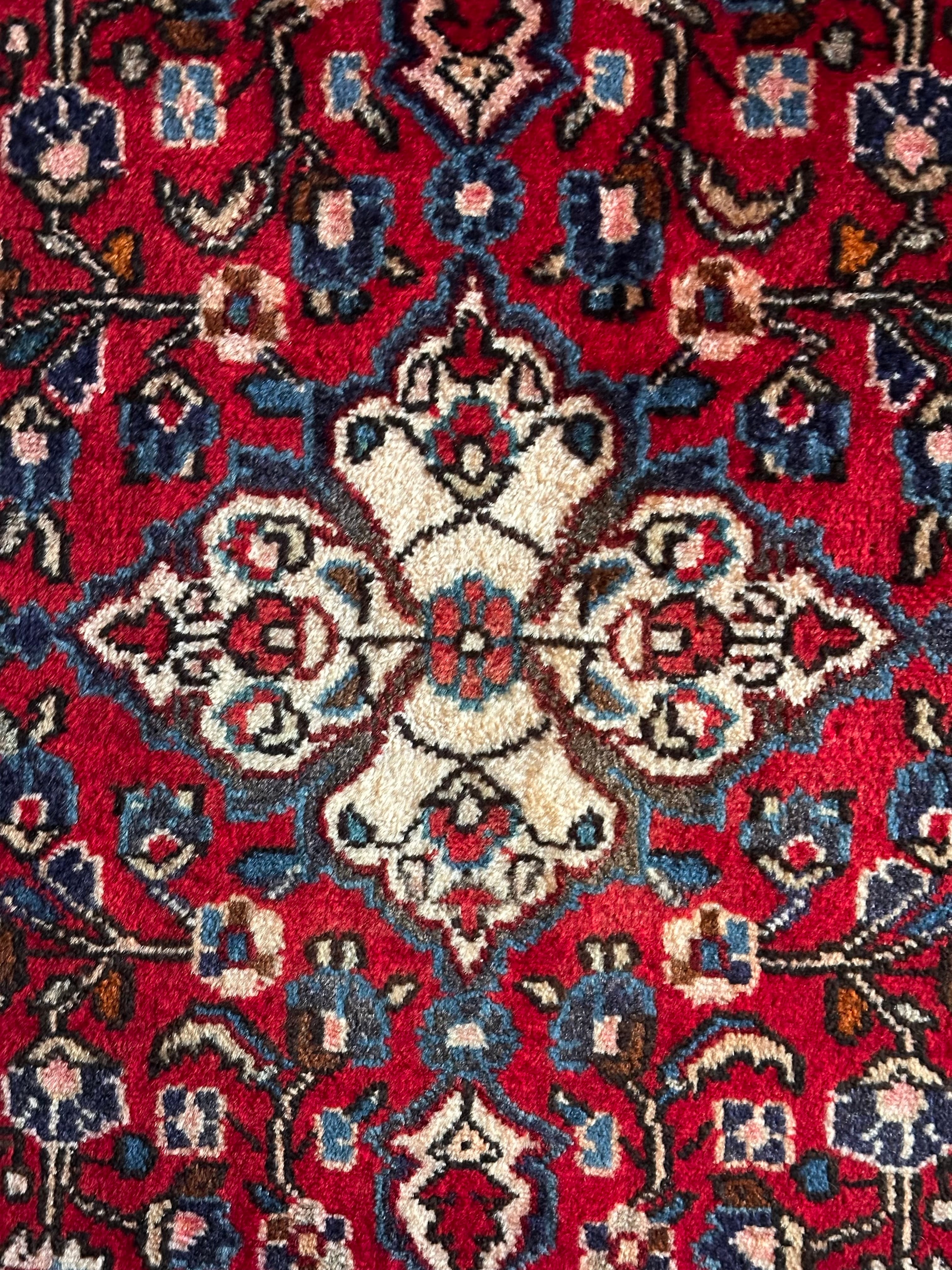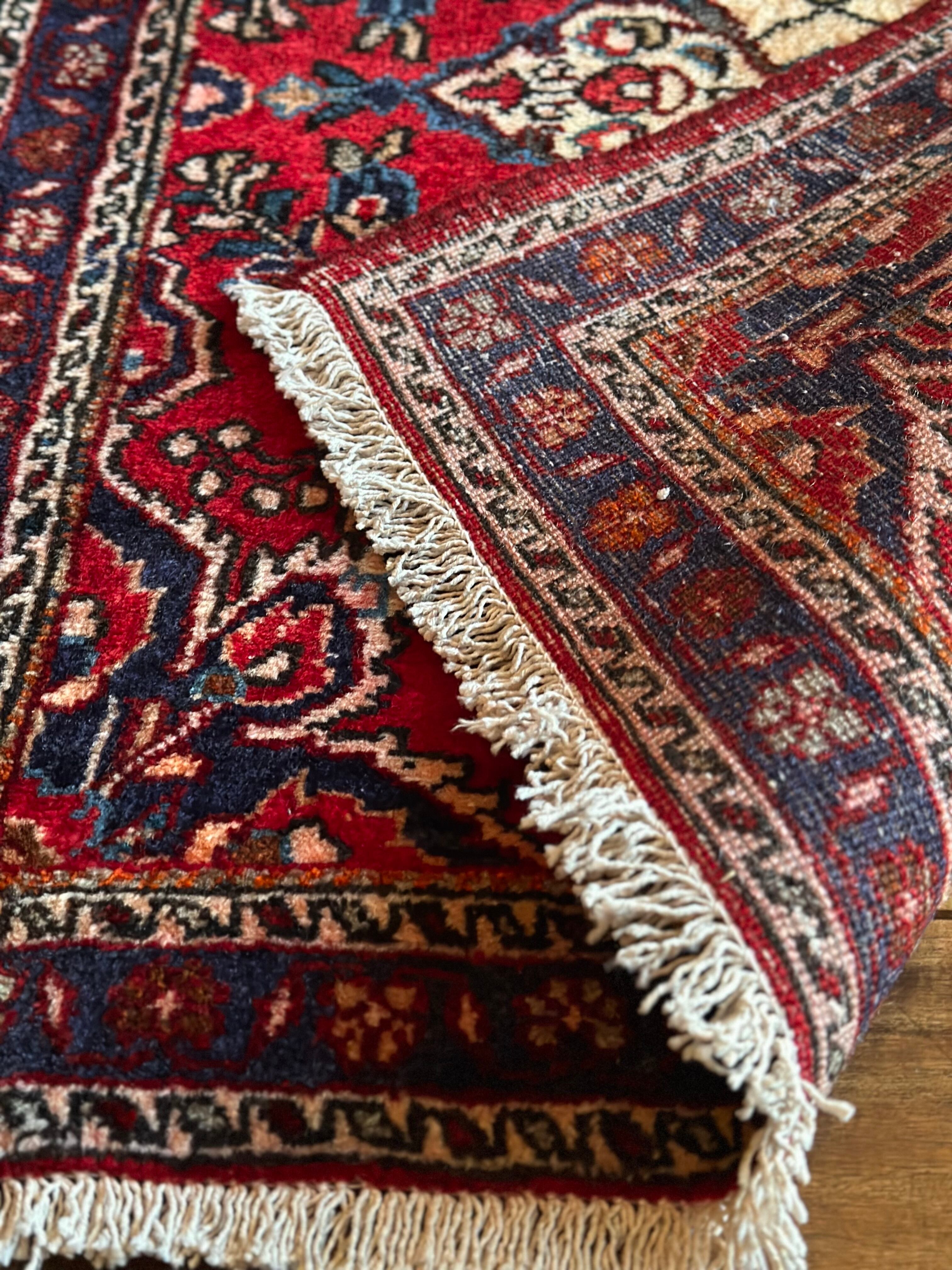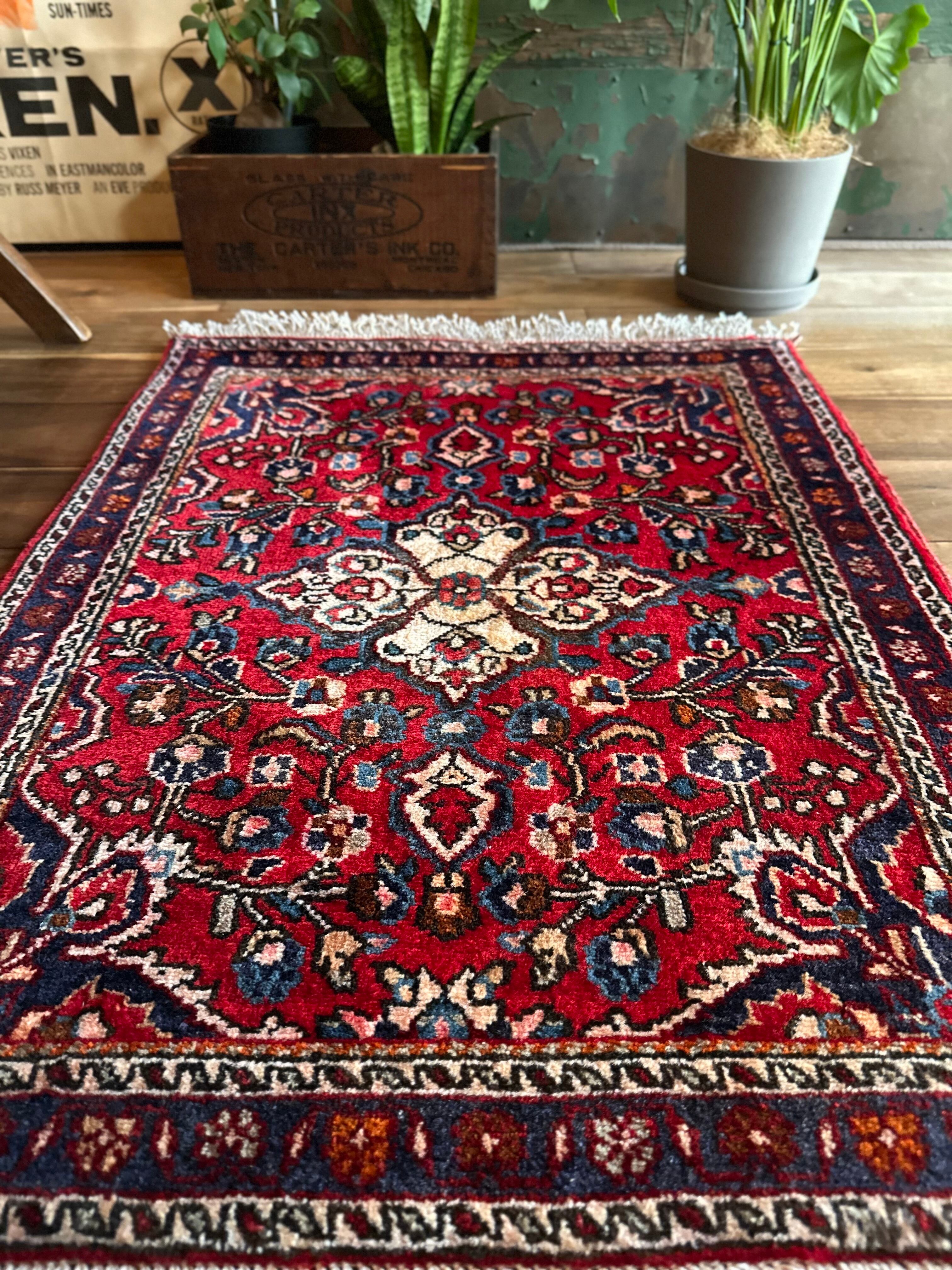 美しく輝く赤をベースに白い花を彩ったパルメット紋様が映えるハマダン近郊で織られたヴィレッジラグになります。
