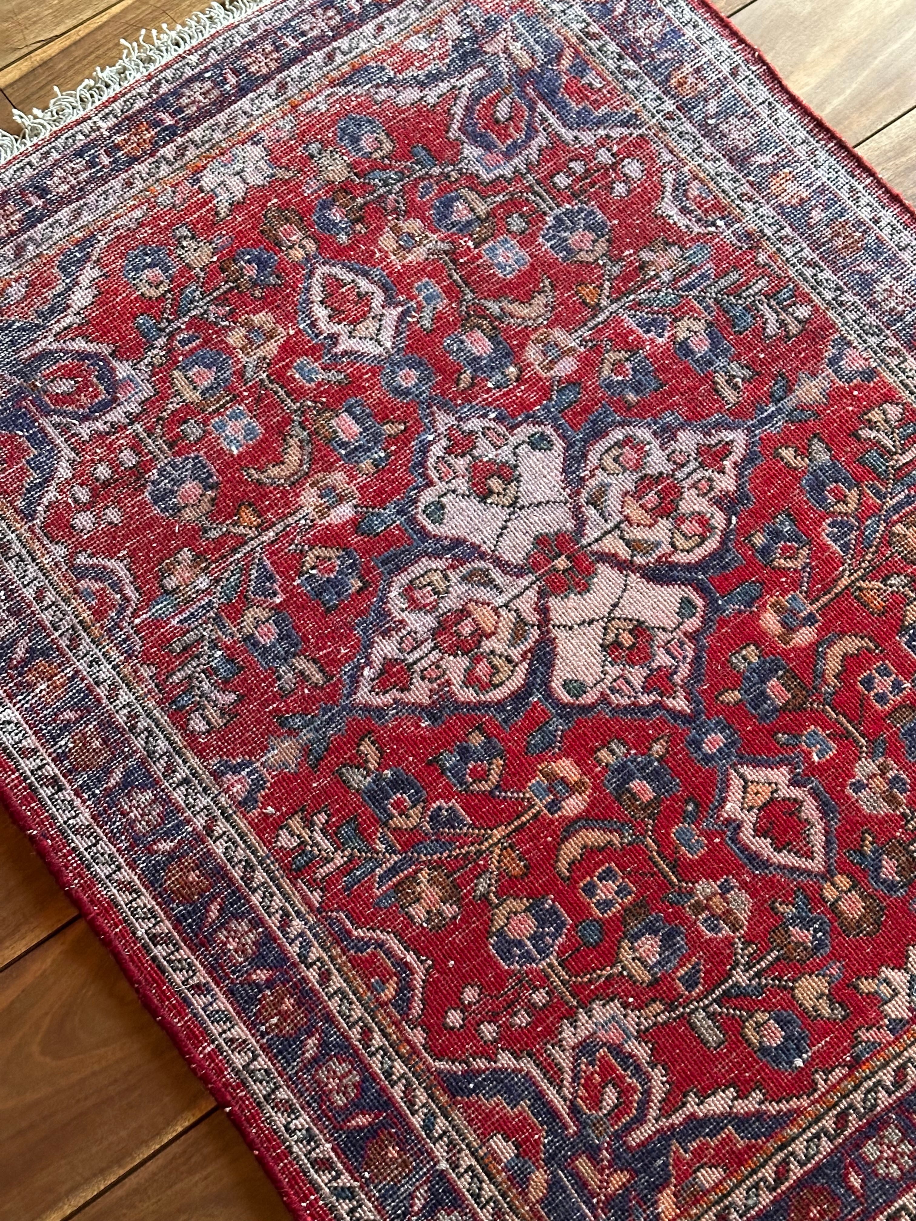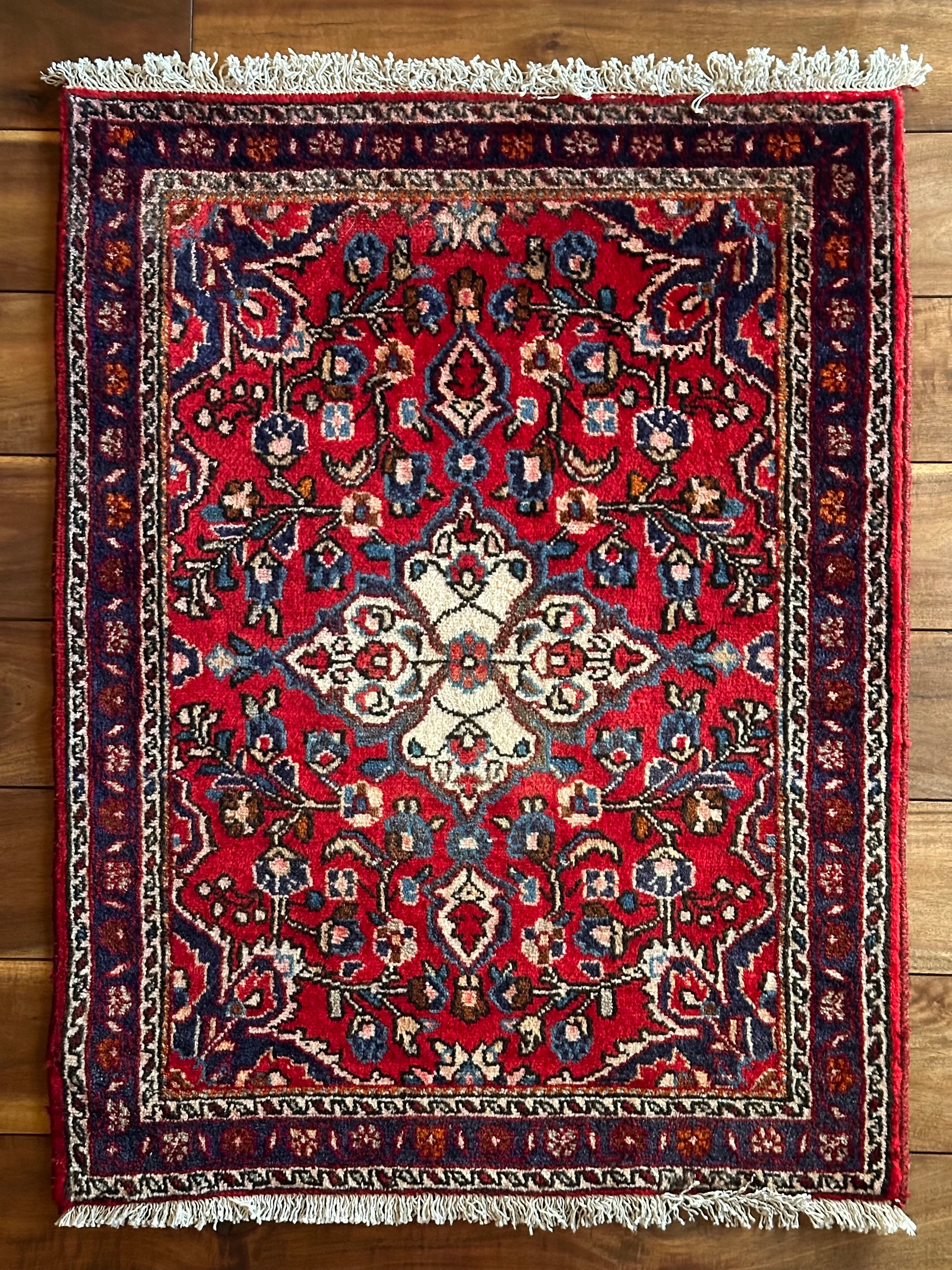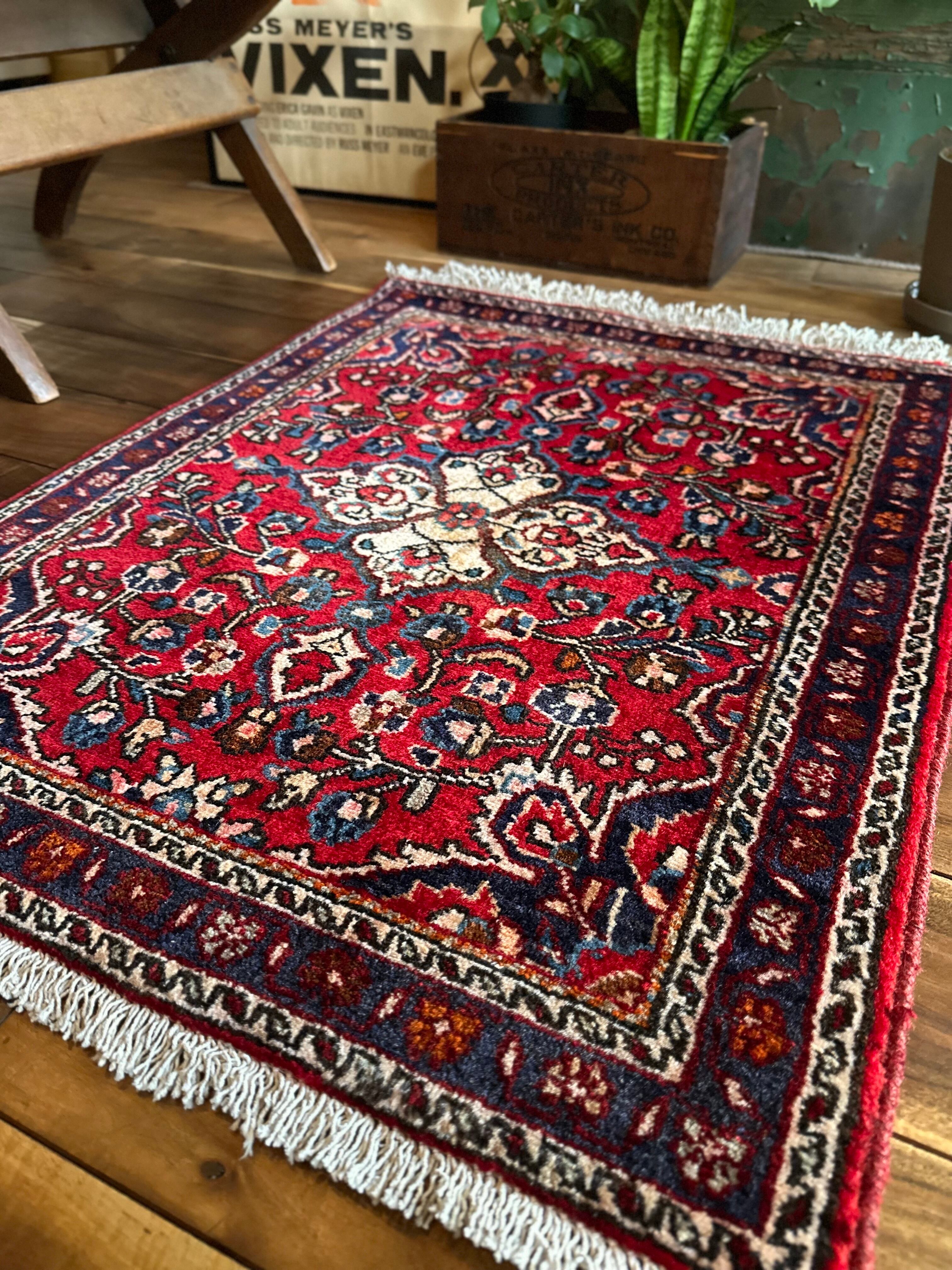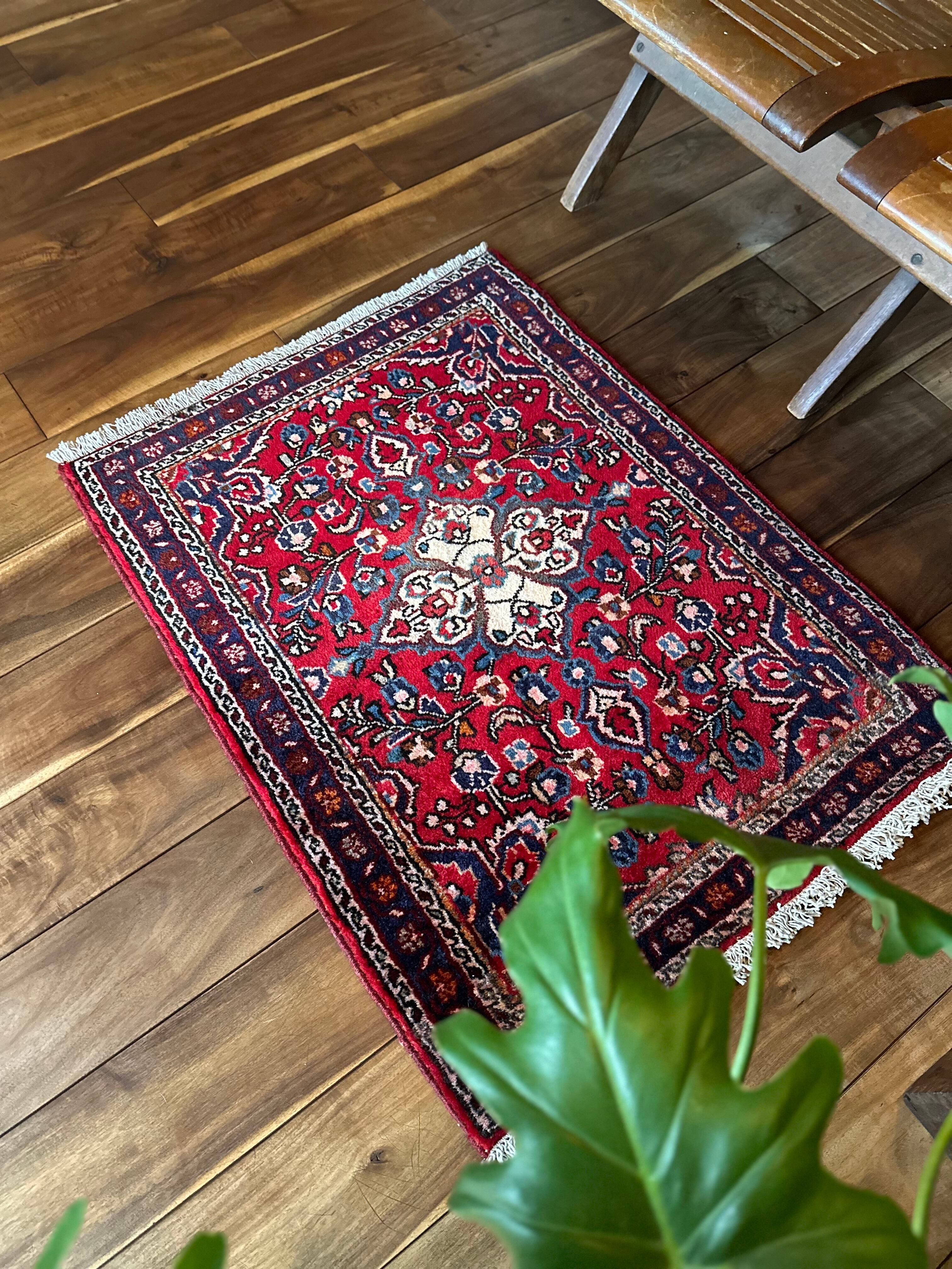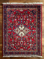 美しく輝く赤をベースに白い花を彩ったパルメット紋様が映えるハマダン近郊で織られたヴィレッジラグになります。