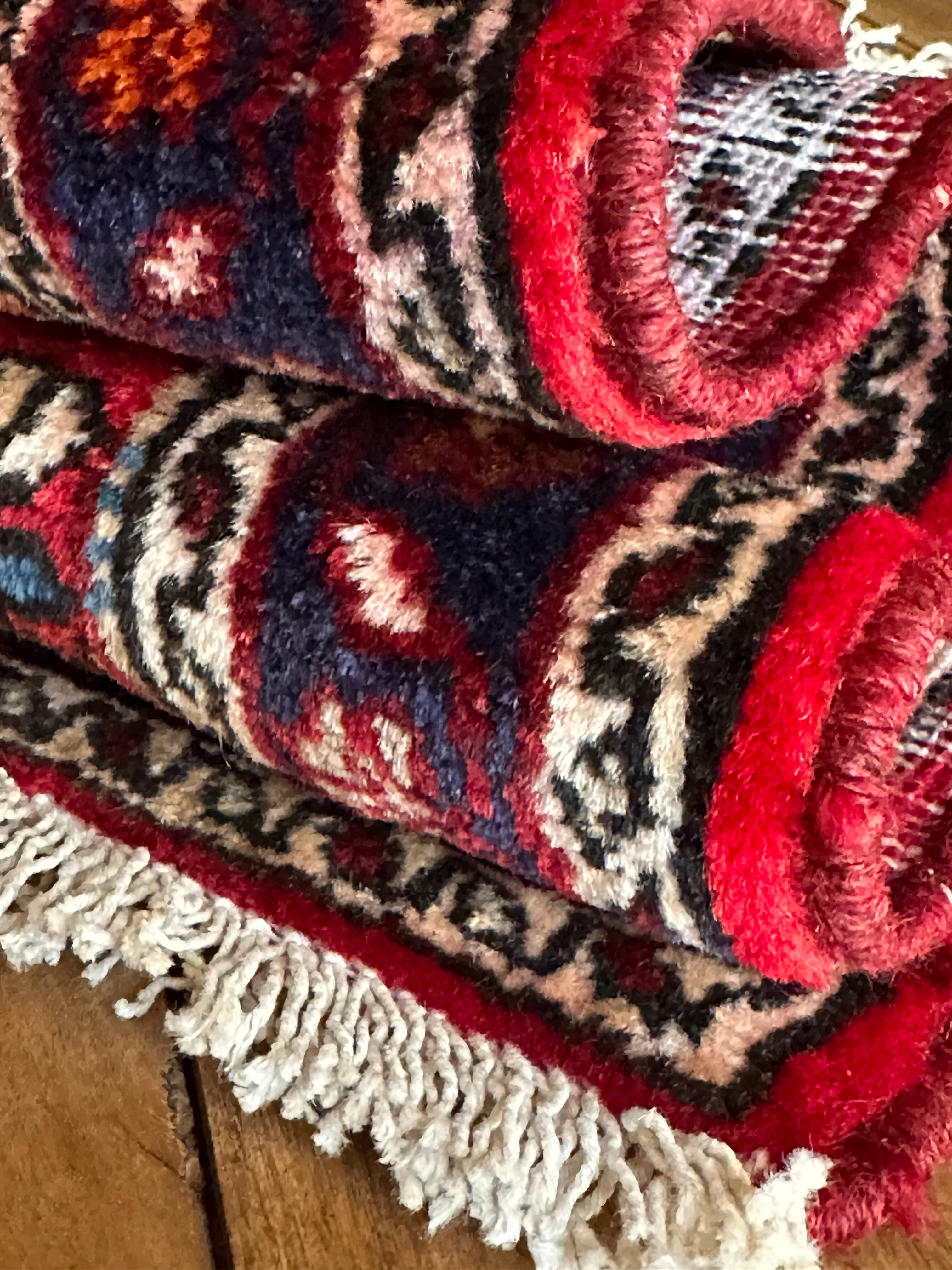 またラグそのものに関しては羊毛特有の匂いがあり、手織りならではの歪みに水洗いクリーニングによる縮み、また草木染めによる経年劣化の色ムラなどがありますが、それもまたヴィンテージラグの魅力かとご理解ください。