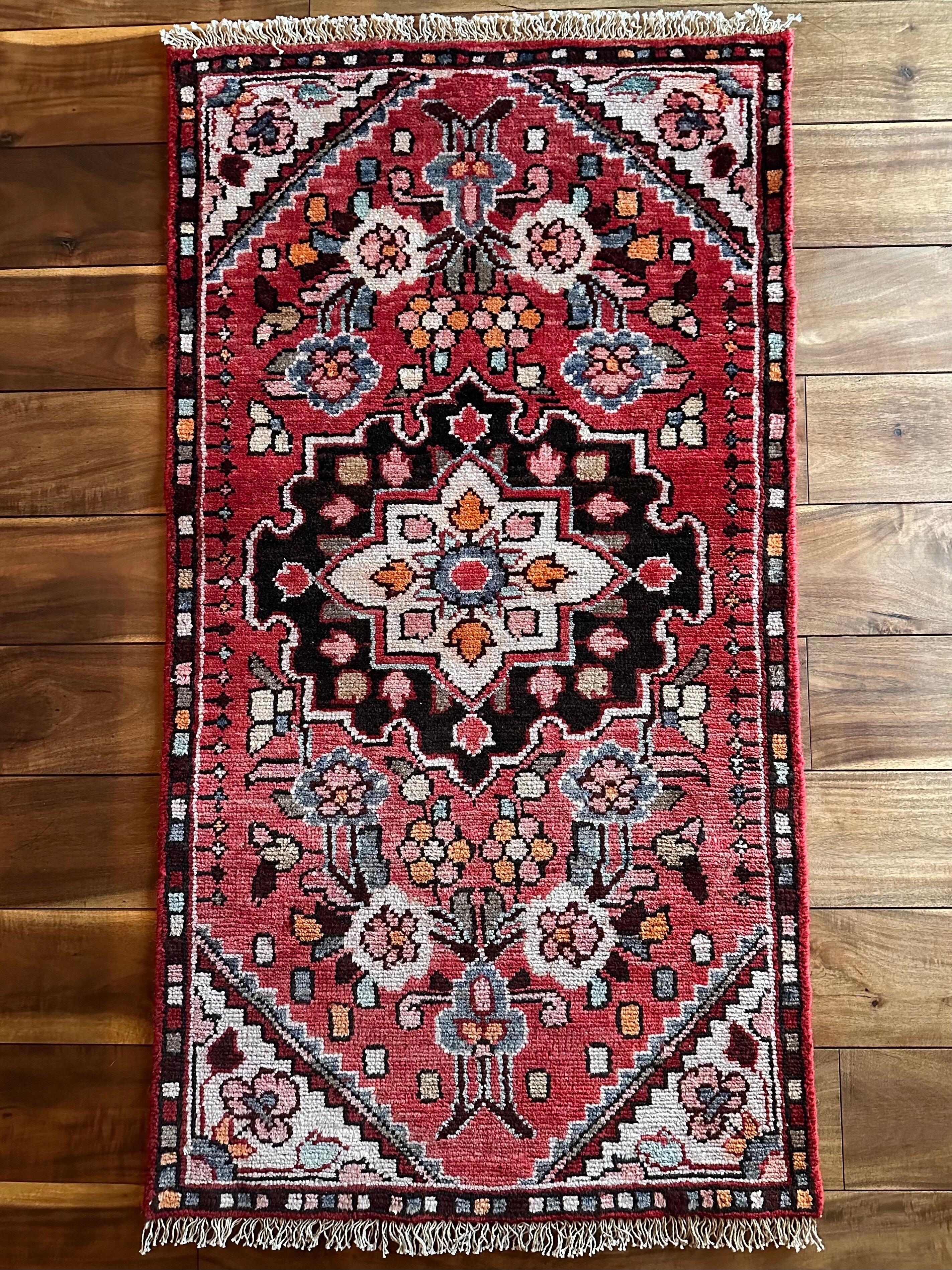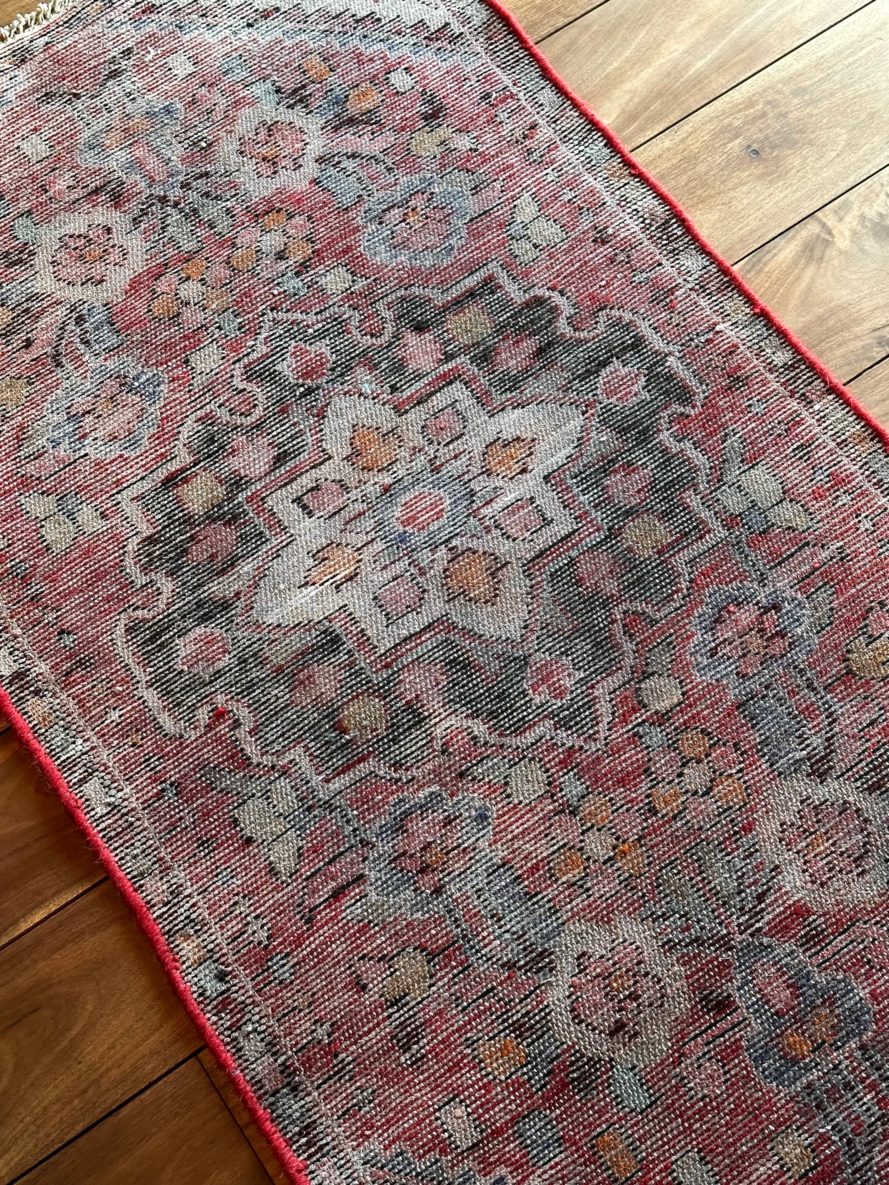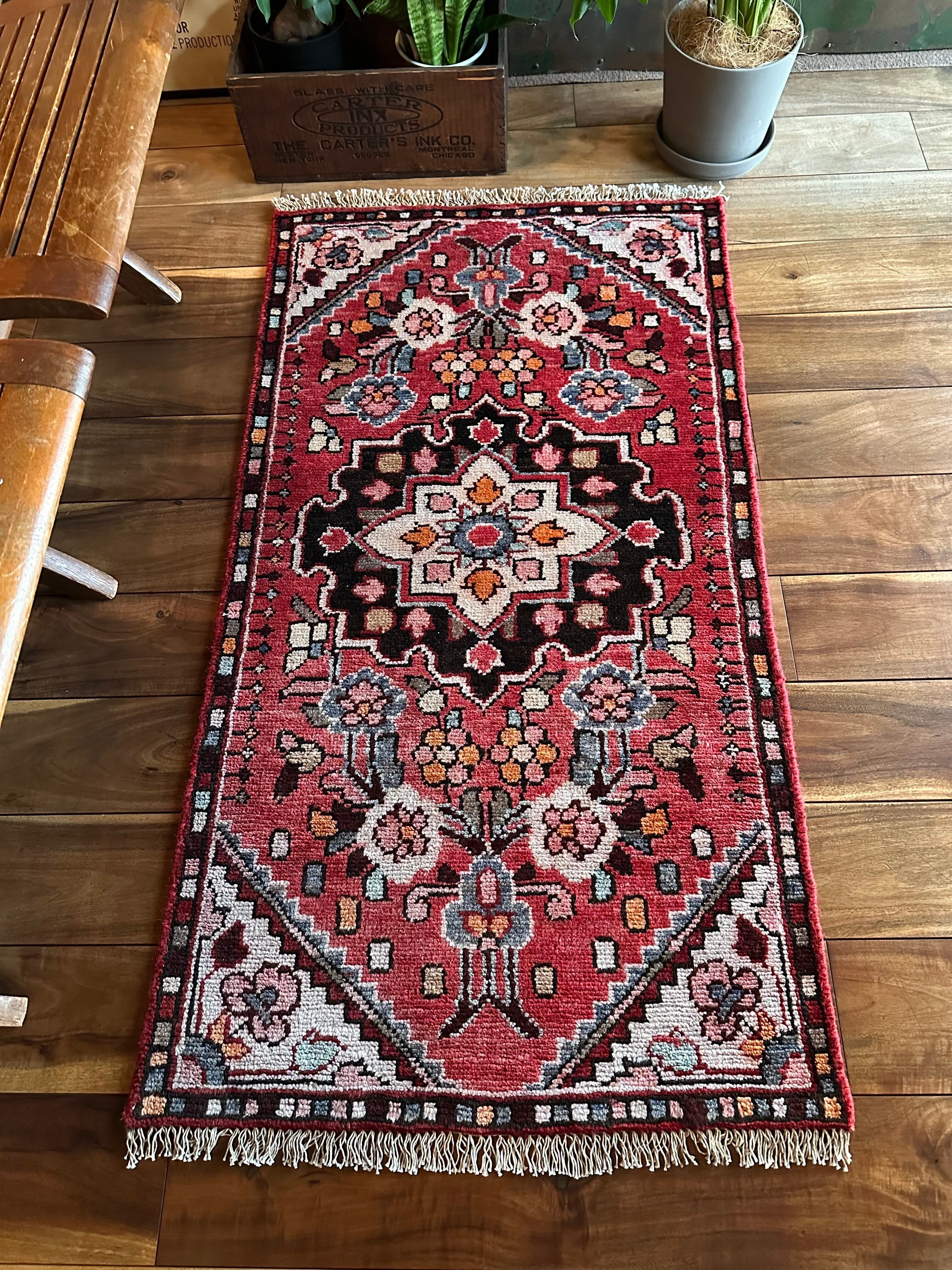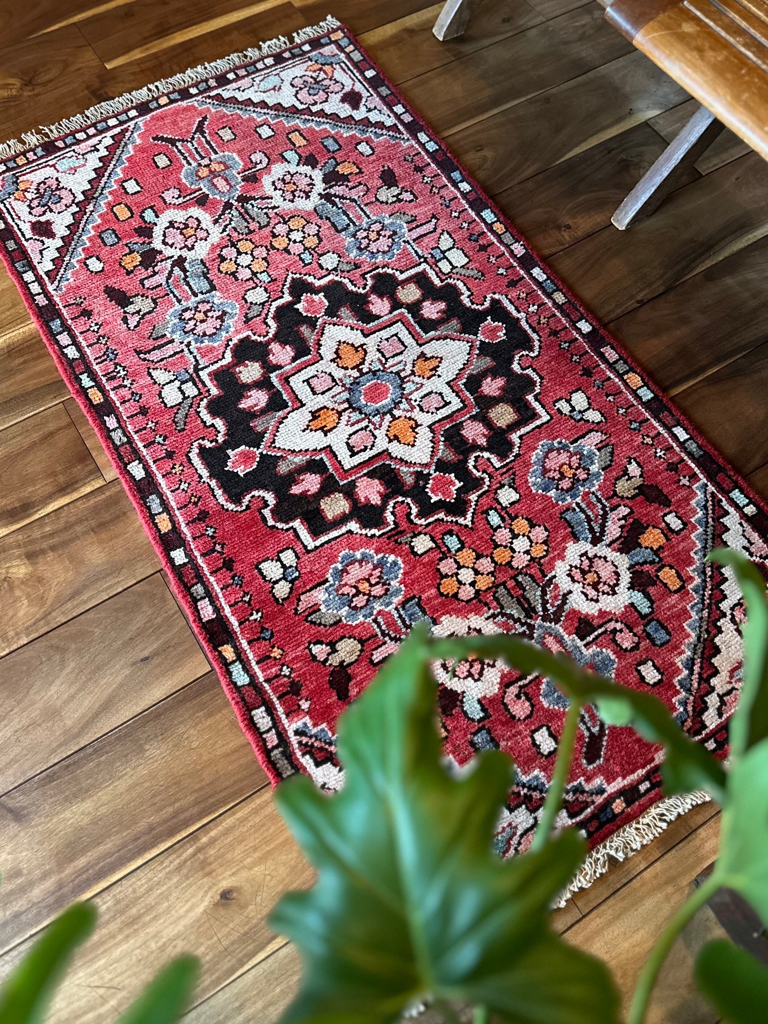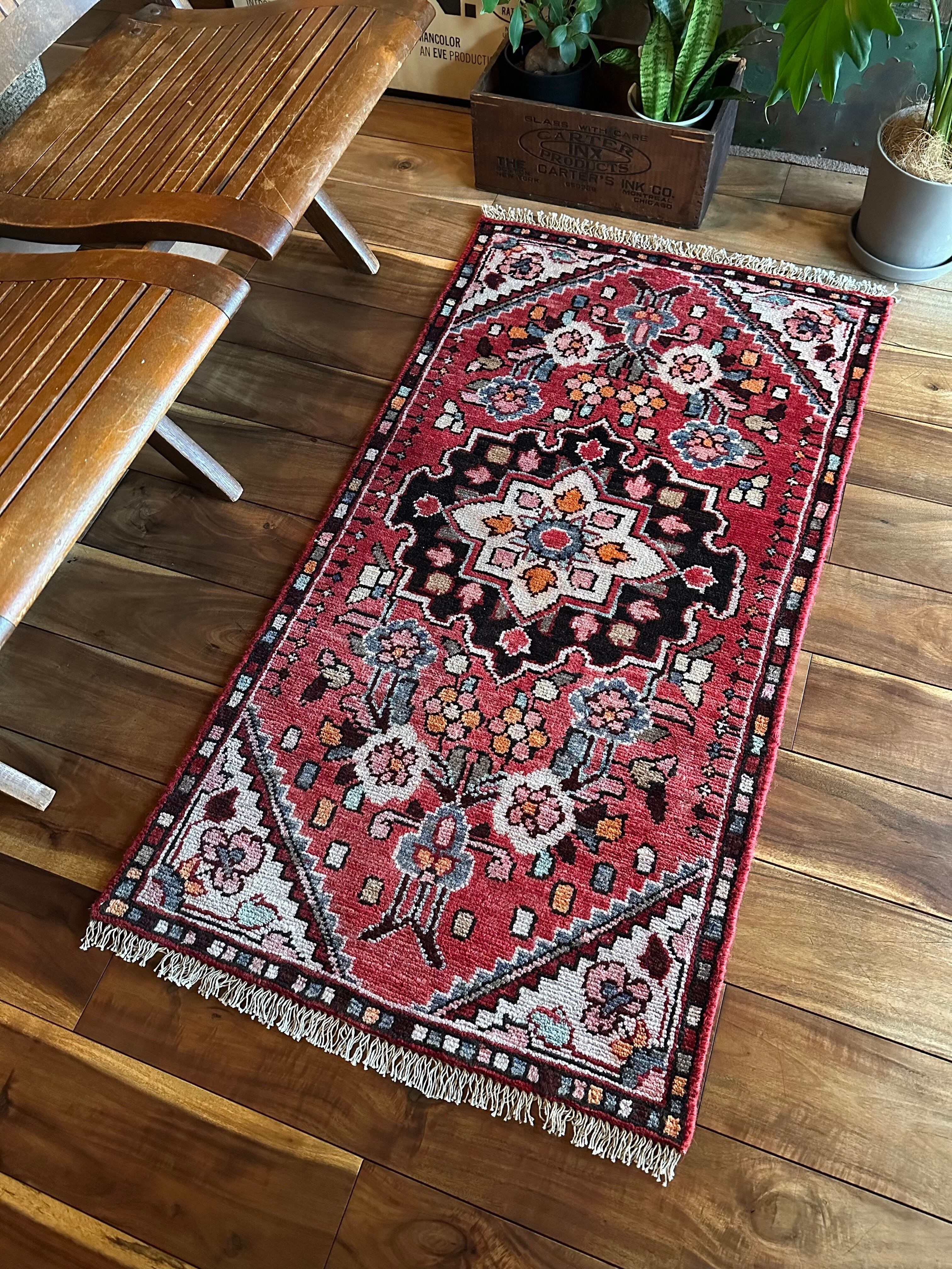 経年変化によるグラデーションの効いたコーラルピンクの色合いが優しさを表現している、ハマダン近郊にて手織りされたヴィレッジラグになります。