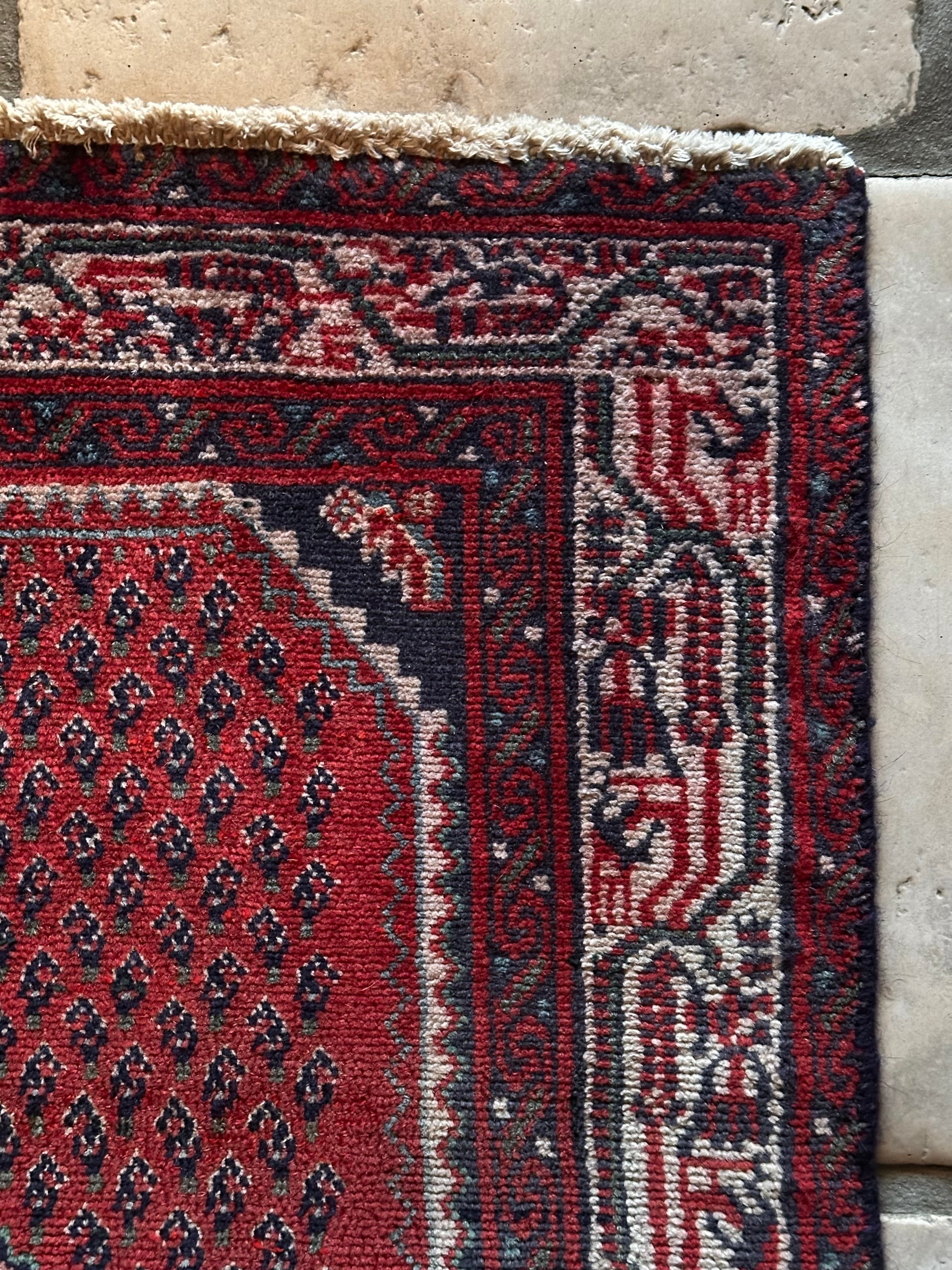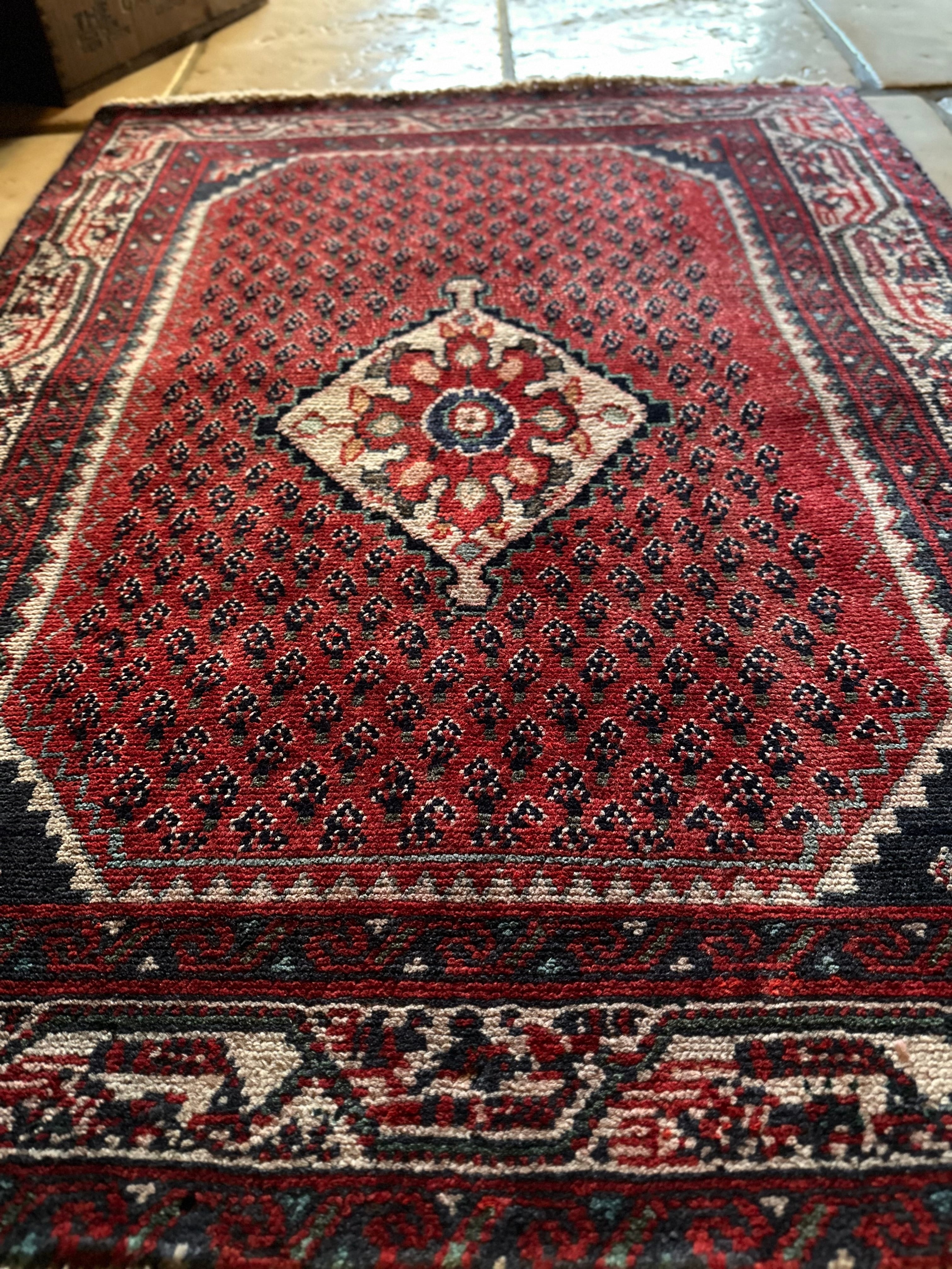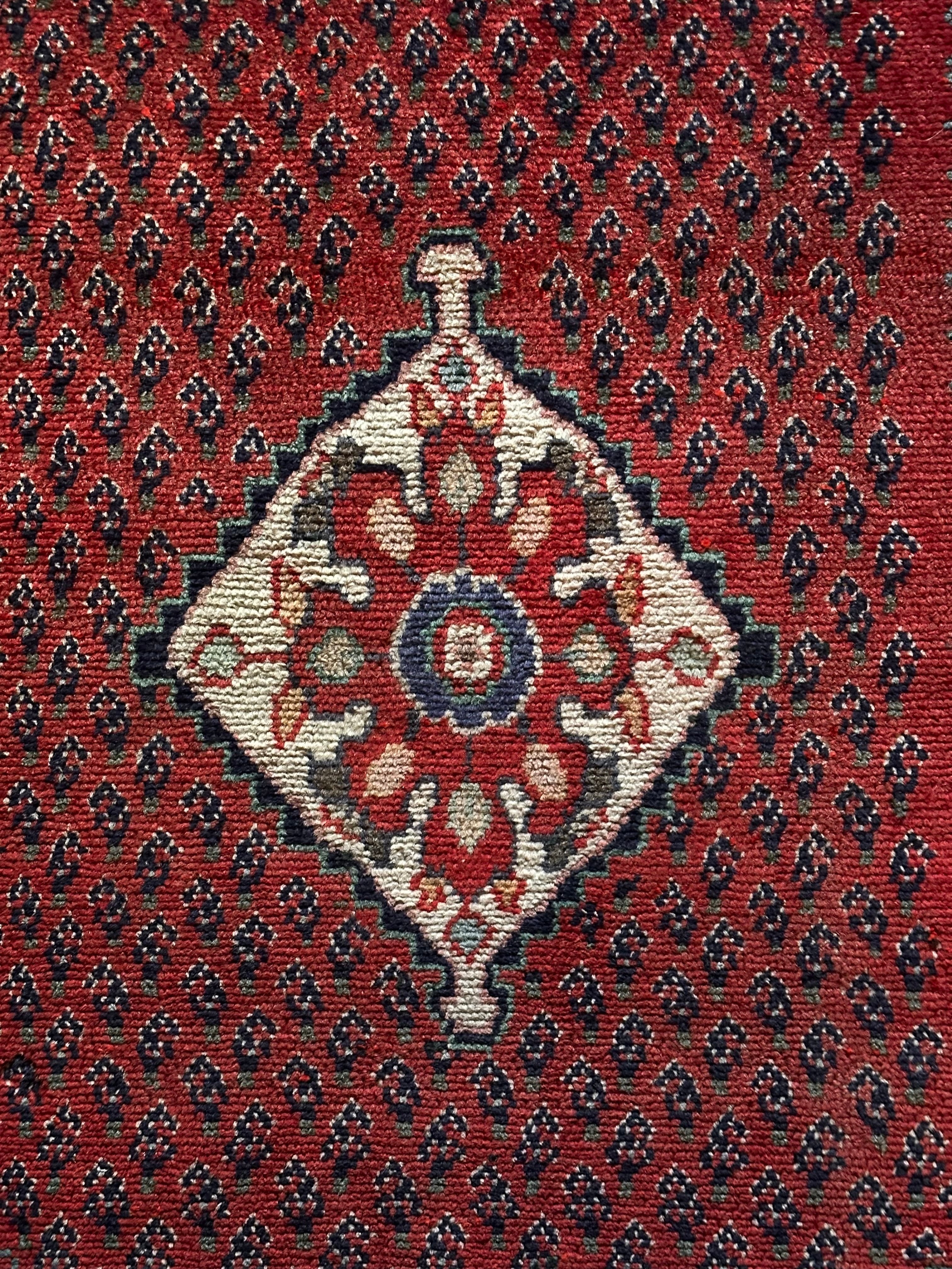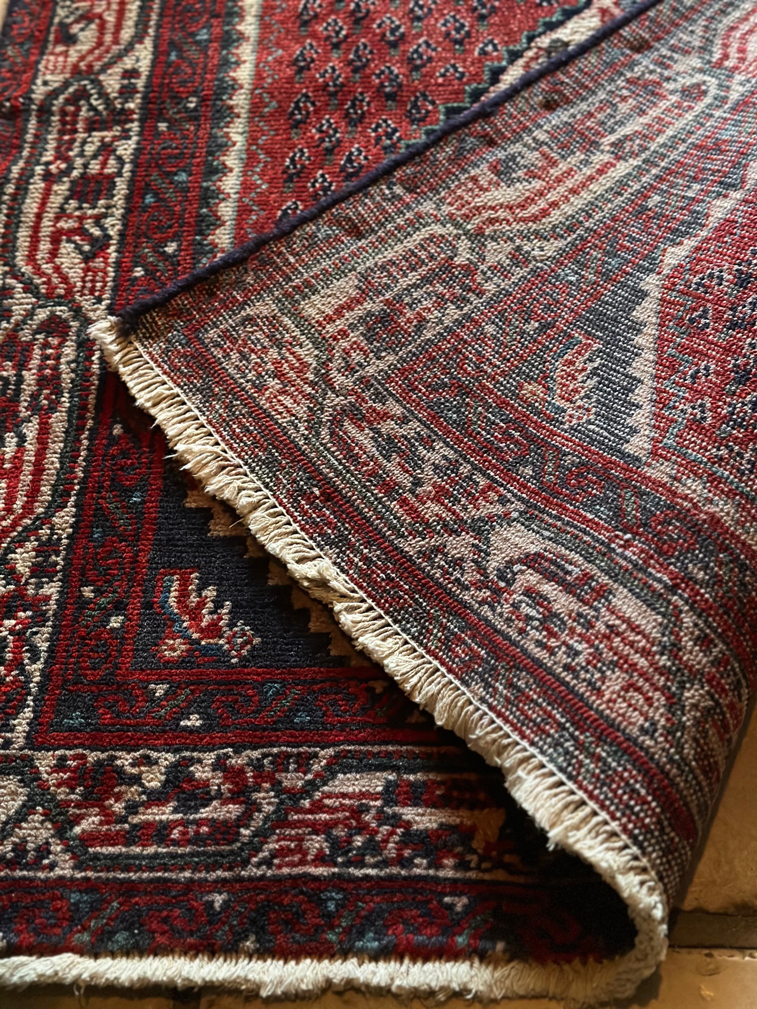 織りの細かさで欧米でも人気のアラークですが、松ぼっくりをモチーフとしたミール紋様がよく使われていて、こちらもメダリオンを中心に独特なボーダー柄がアラークらしい1枚になります。