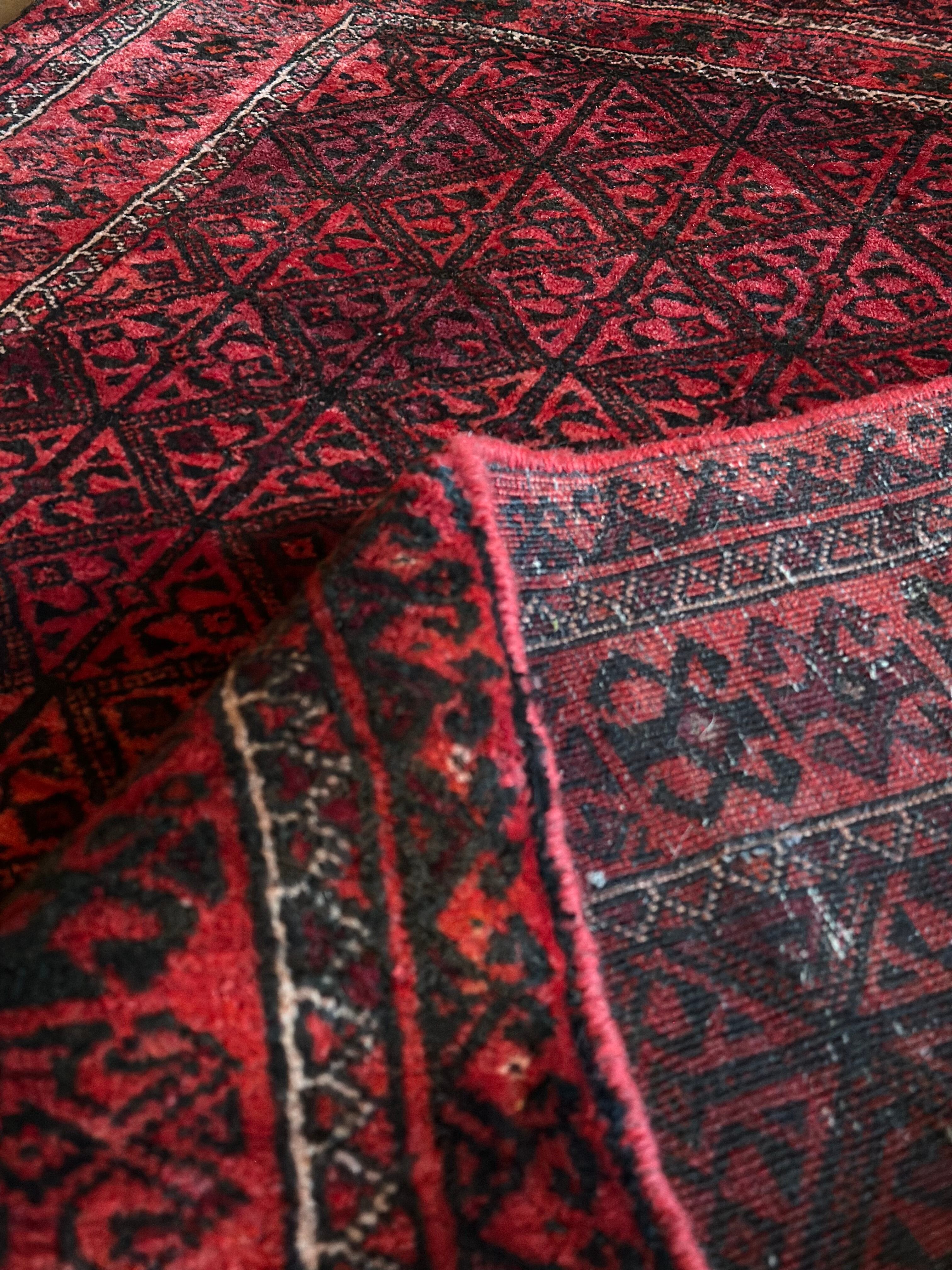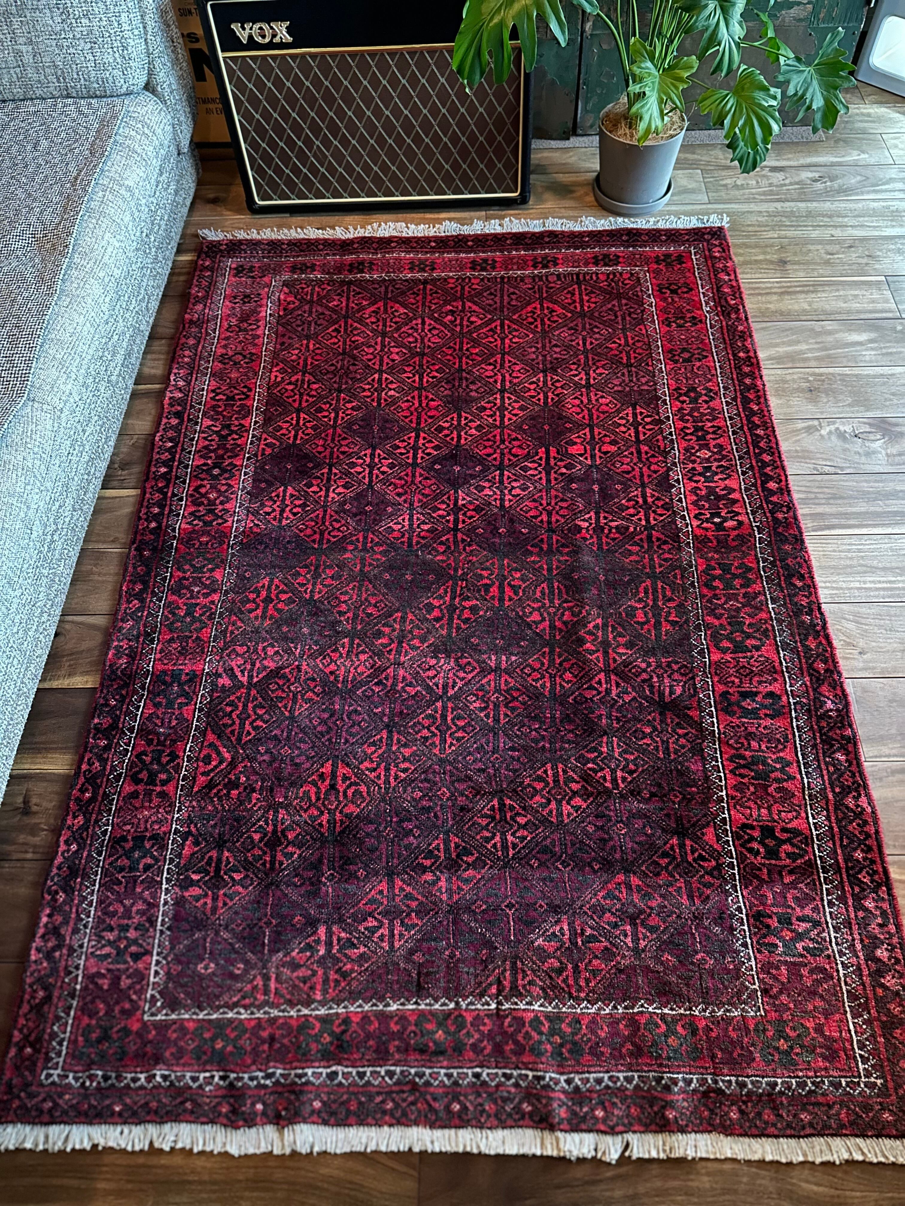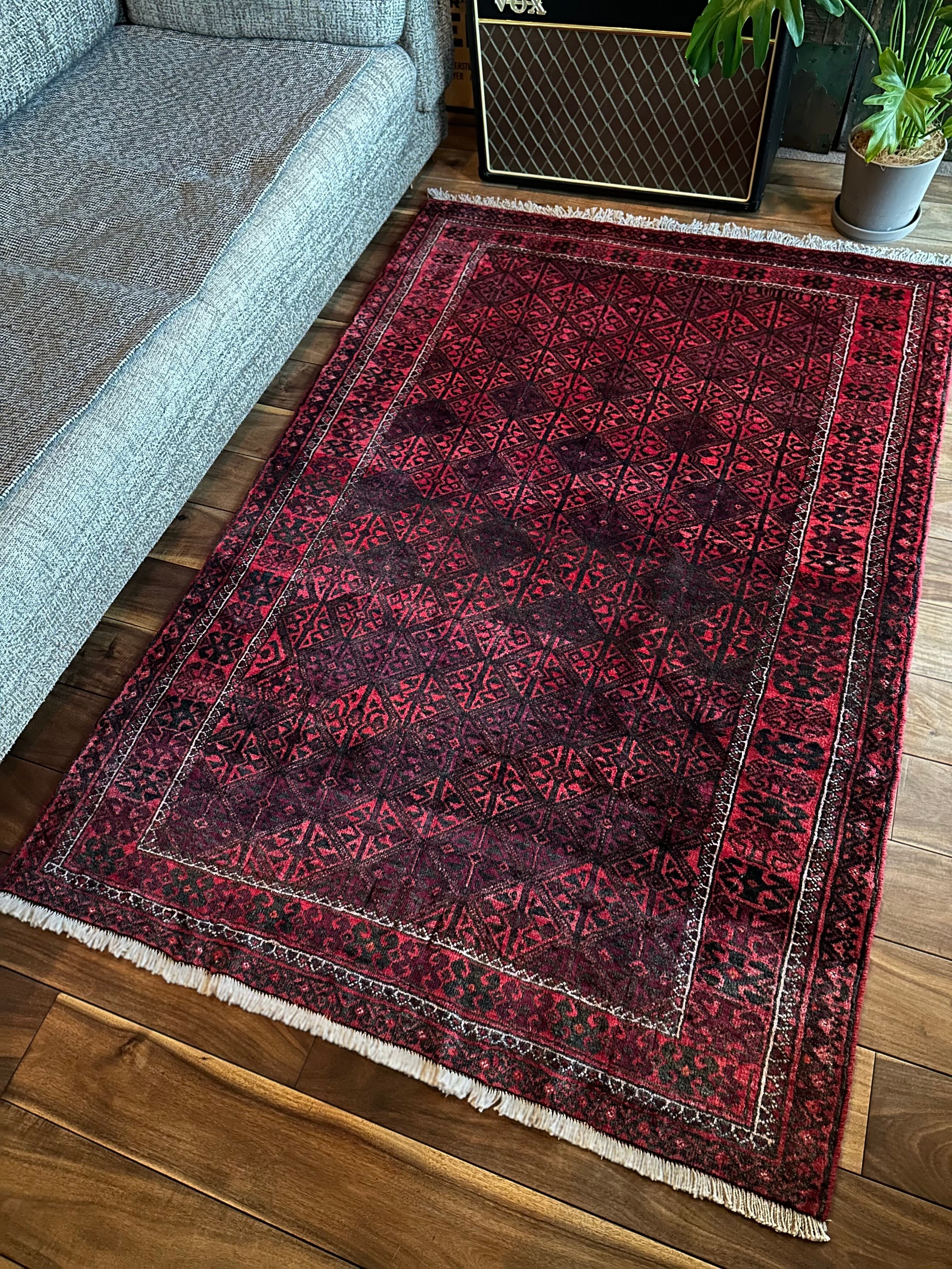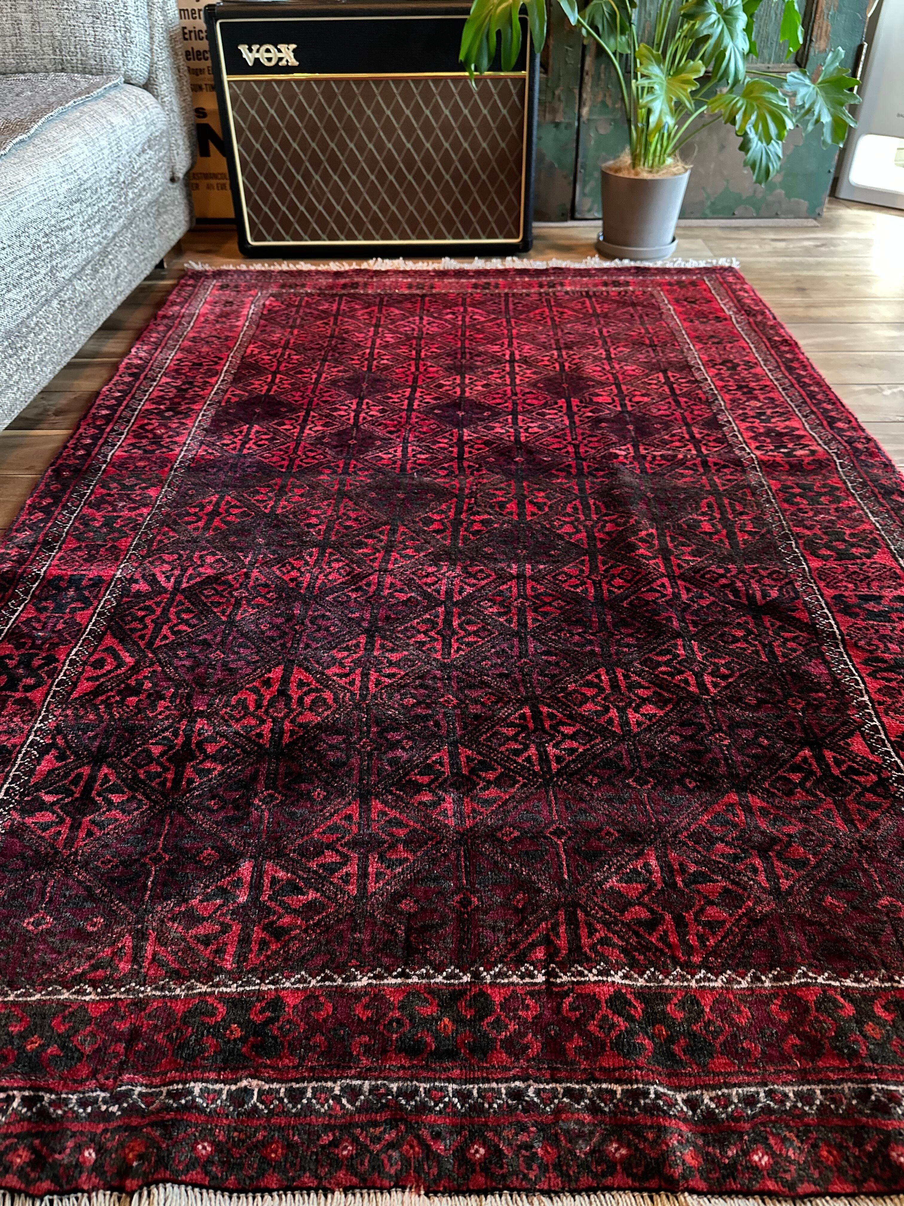 一見に規則正しい連続紋様に見えながらも、赤と真紅の色使いが不規則極まりないバルーチ族のトライバルラグになります。