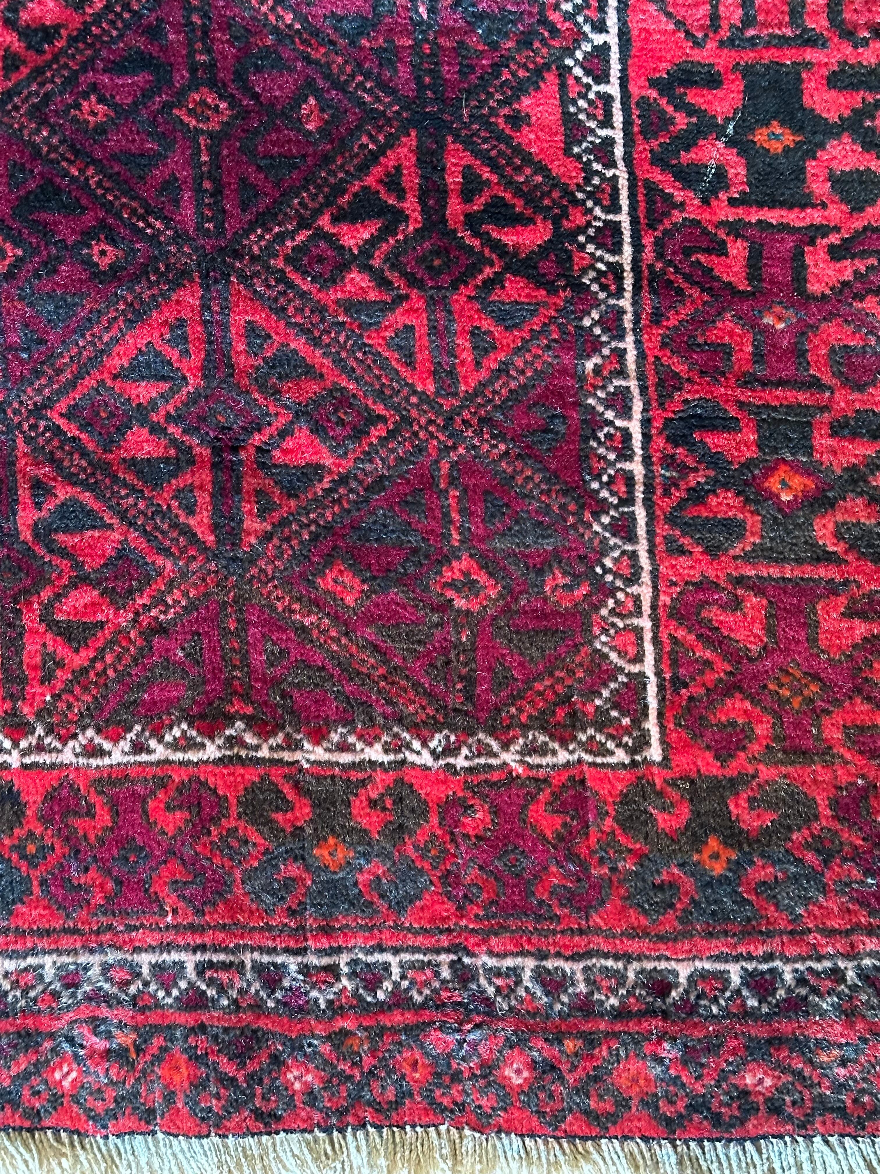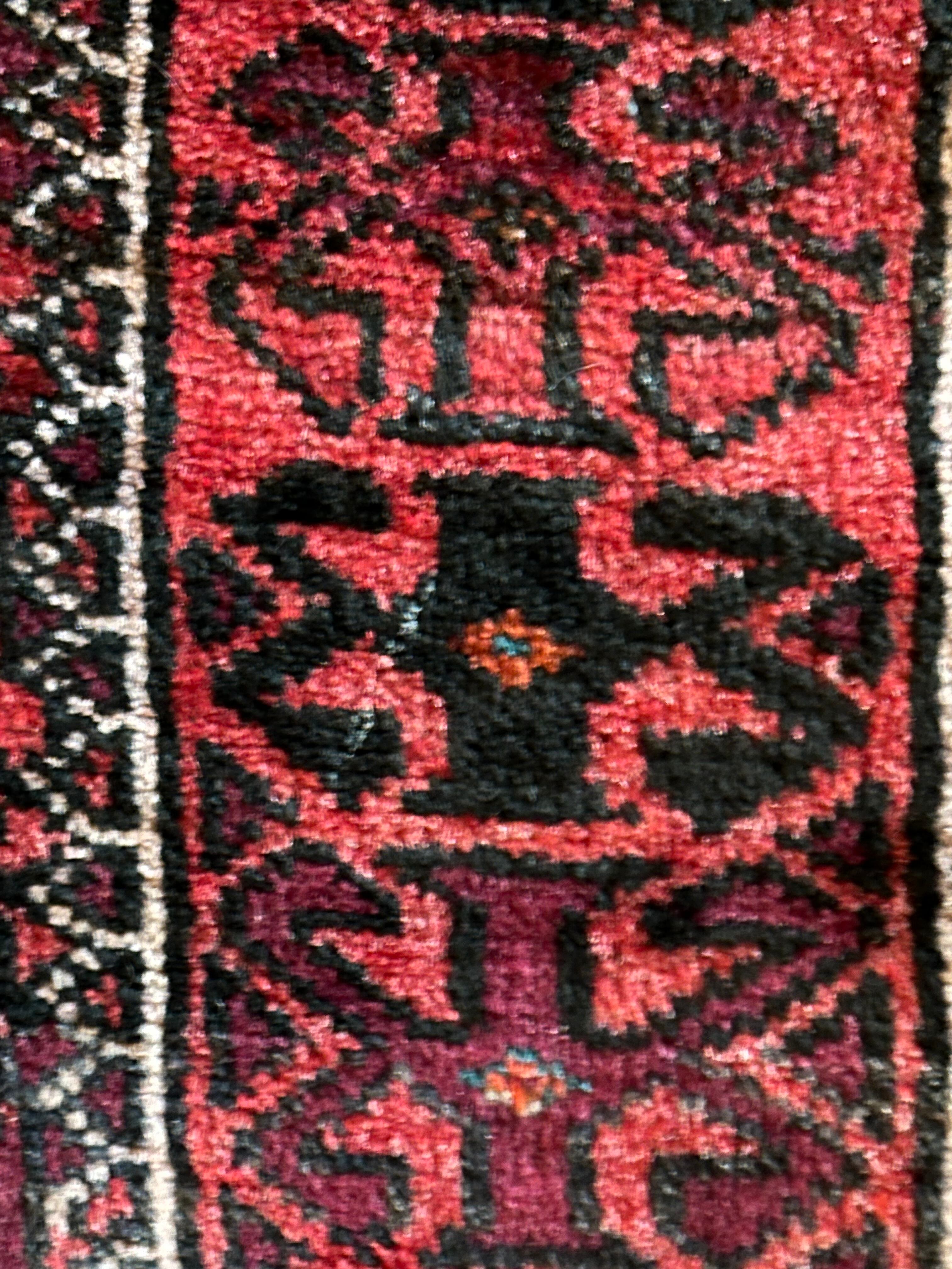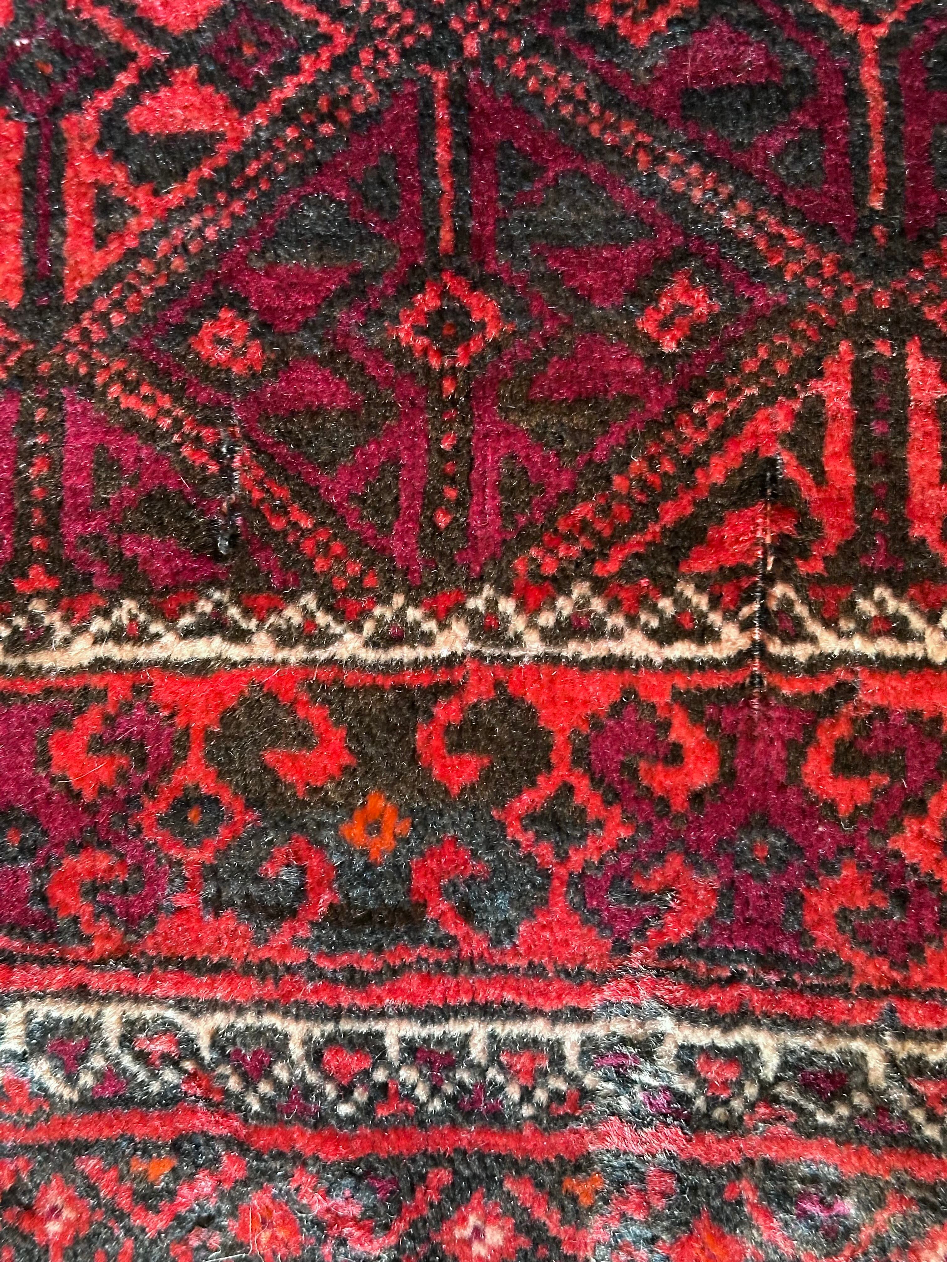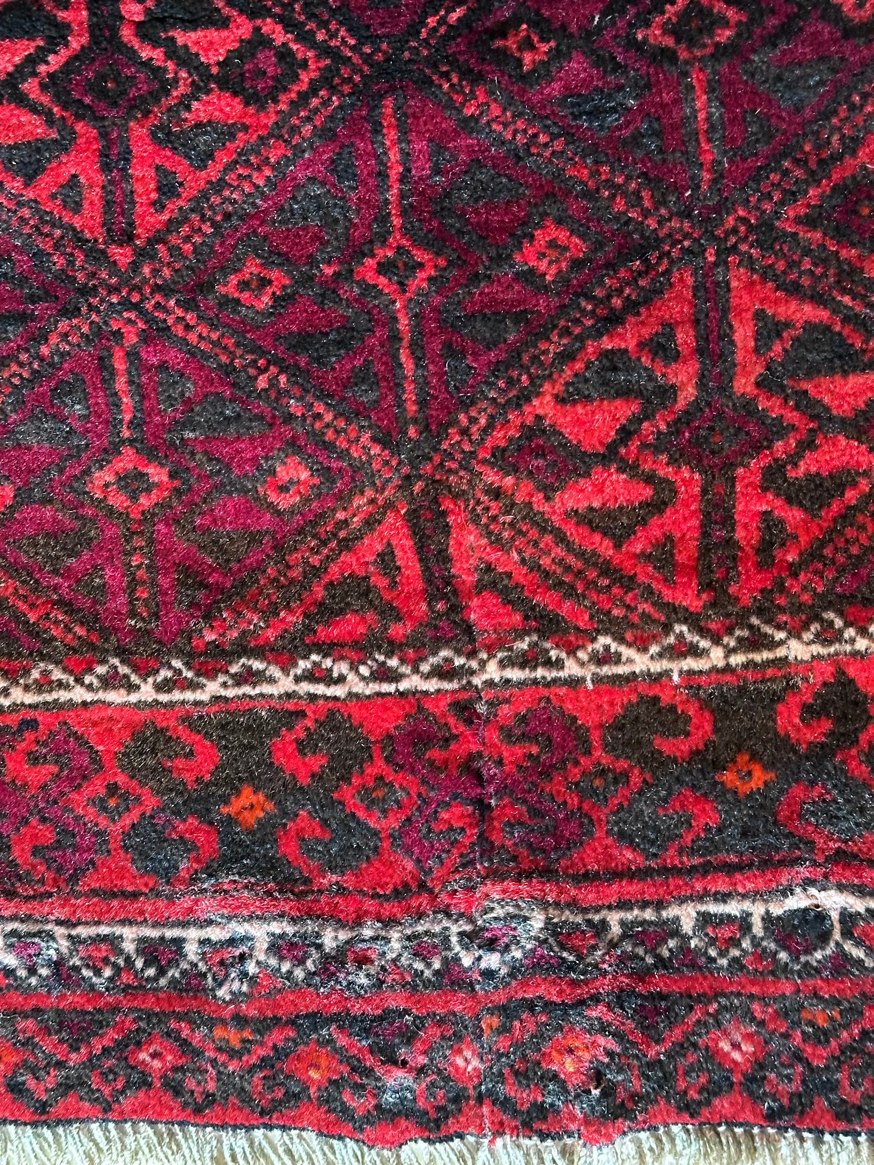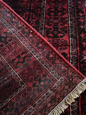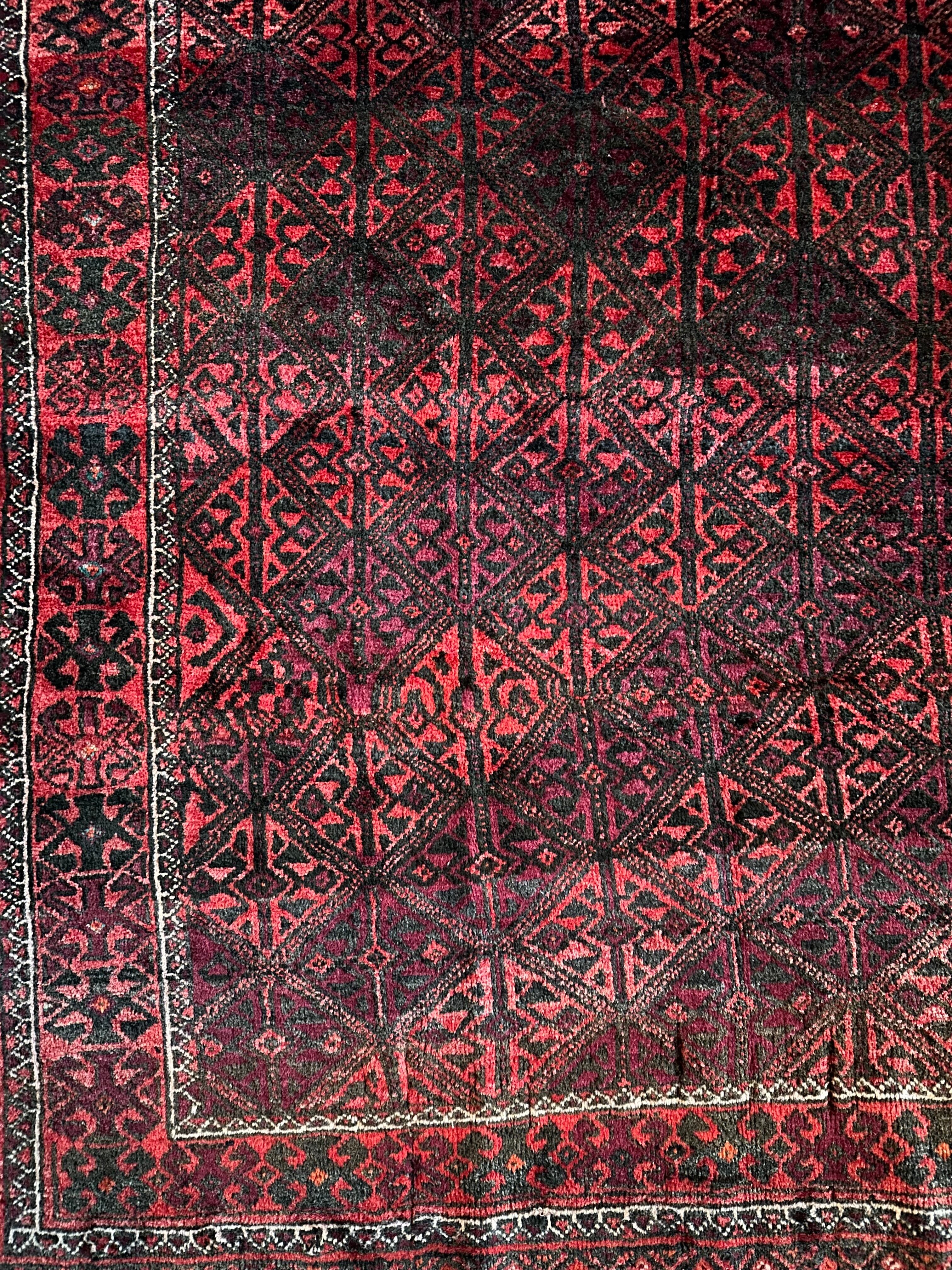 一見に規則正しい連続紋様に見えながらも、赤と真紅の色使いが不規則極まりないバルーチ族のトライバルラグになります。