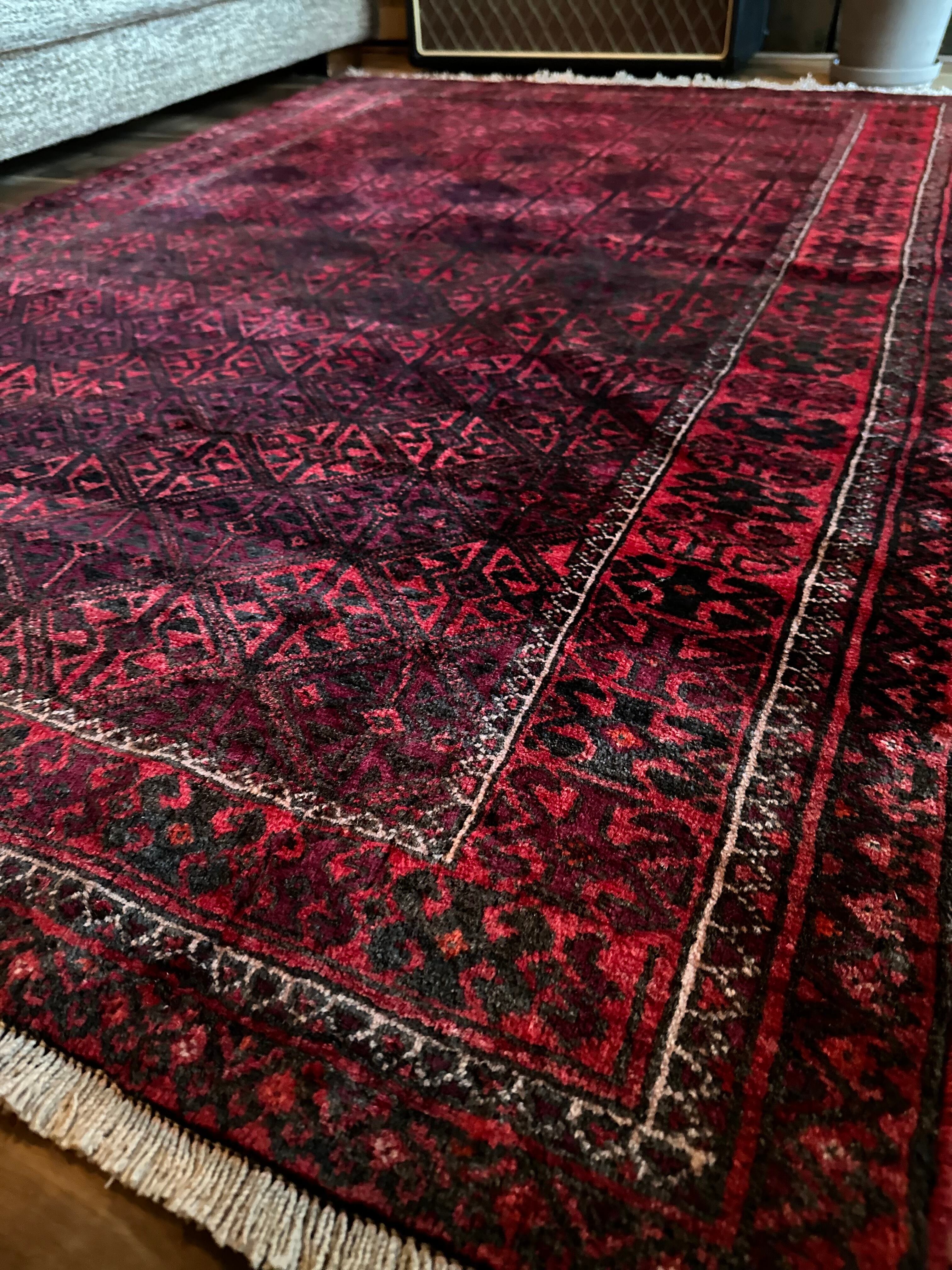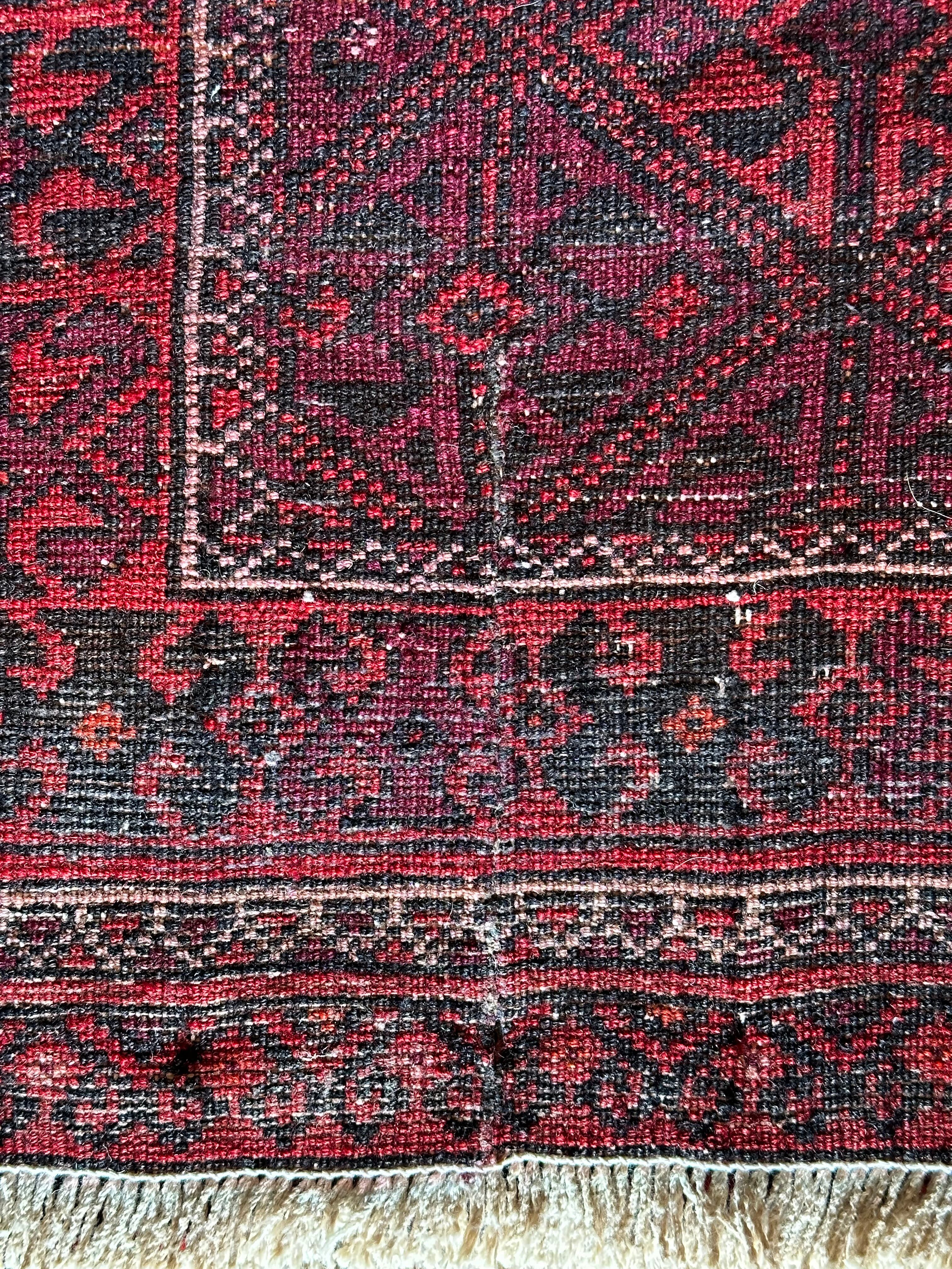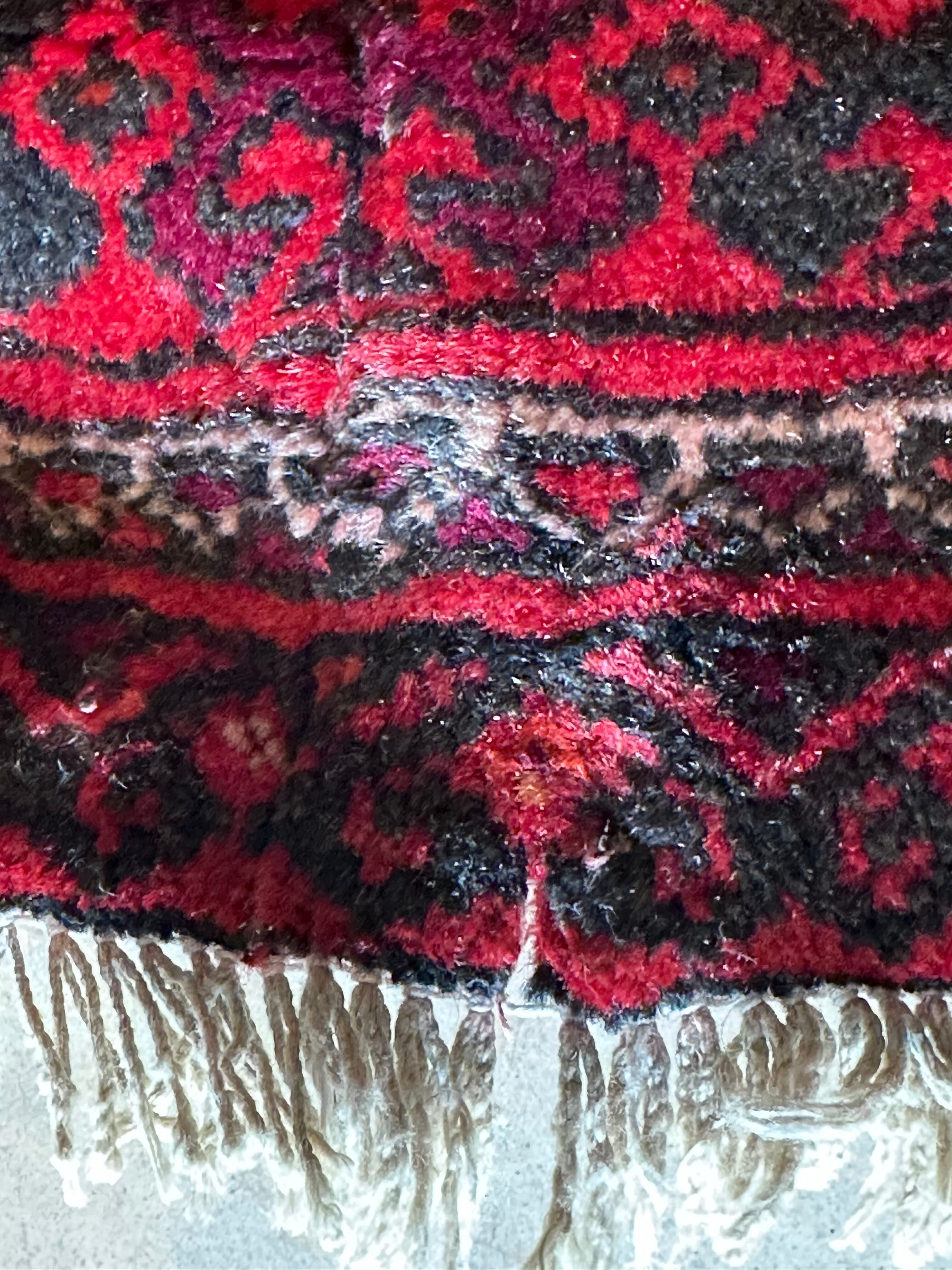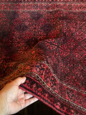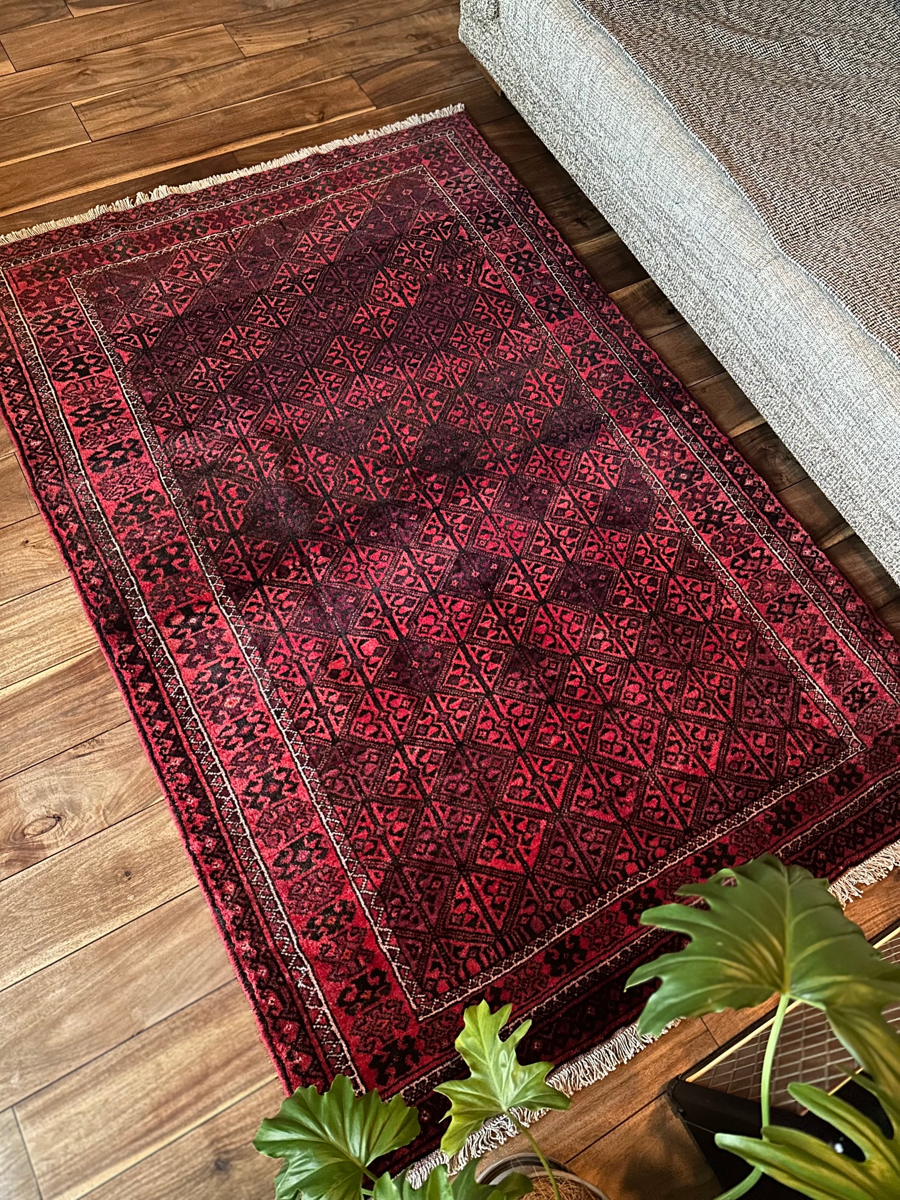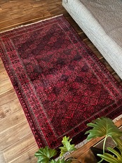 一見に規則正しい連続紋様に見えながらも、赤と真紅の色使いが不規則極まりないバルーチ族のトライバルラグになります。