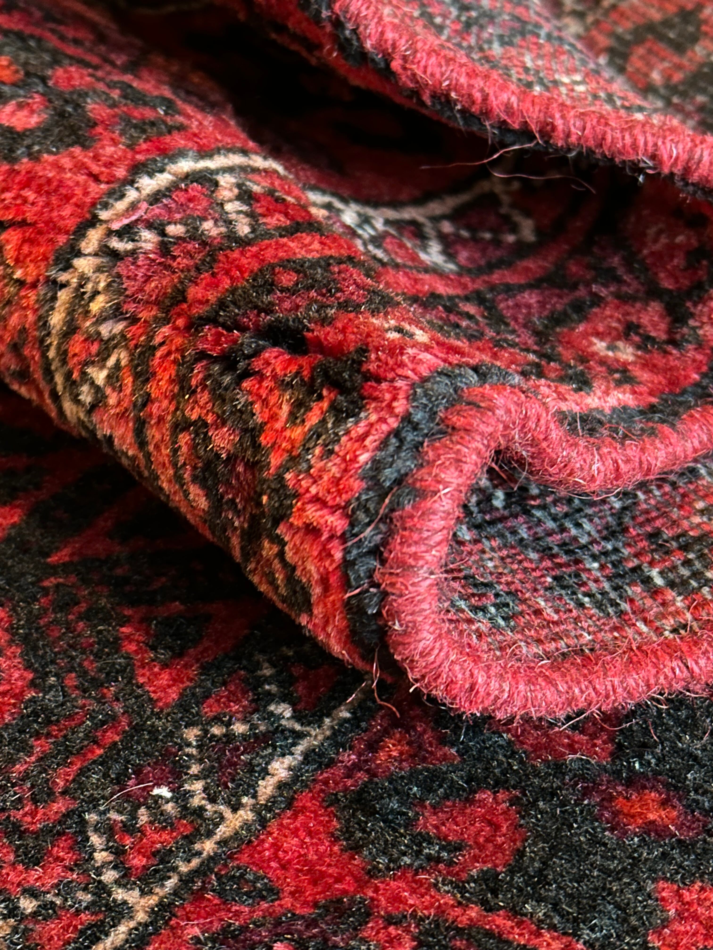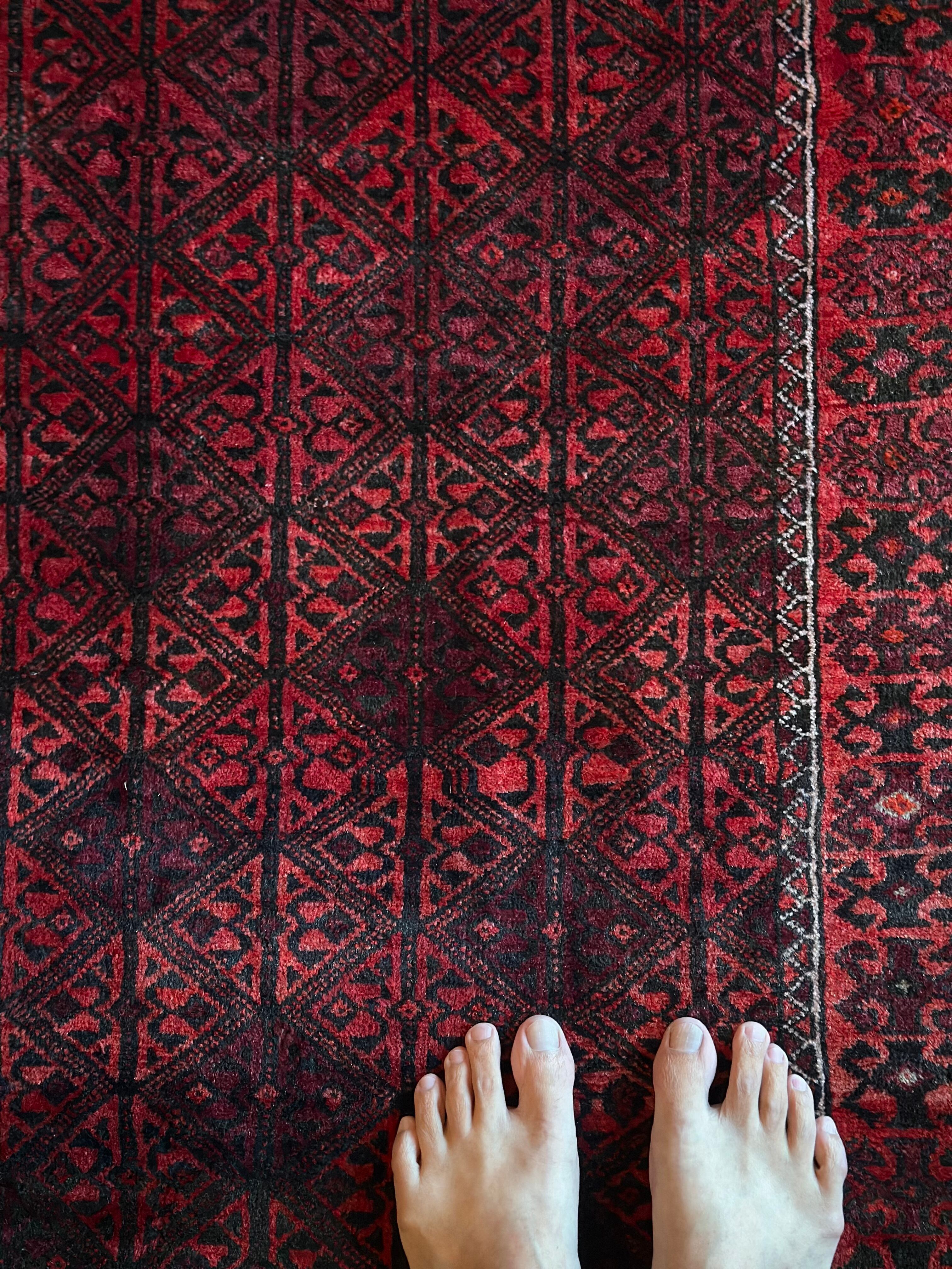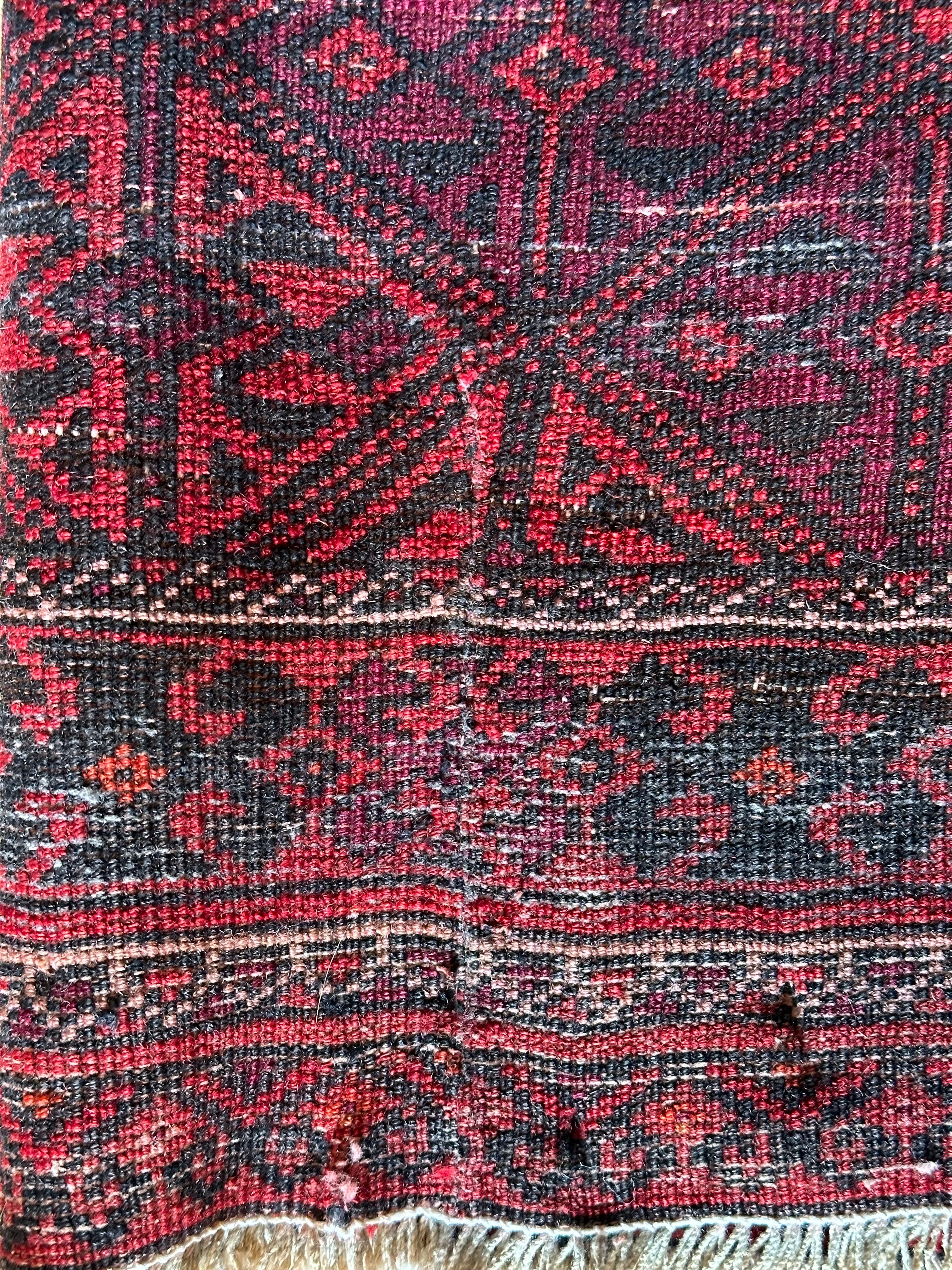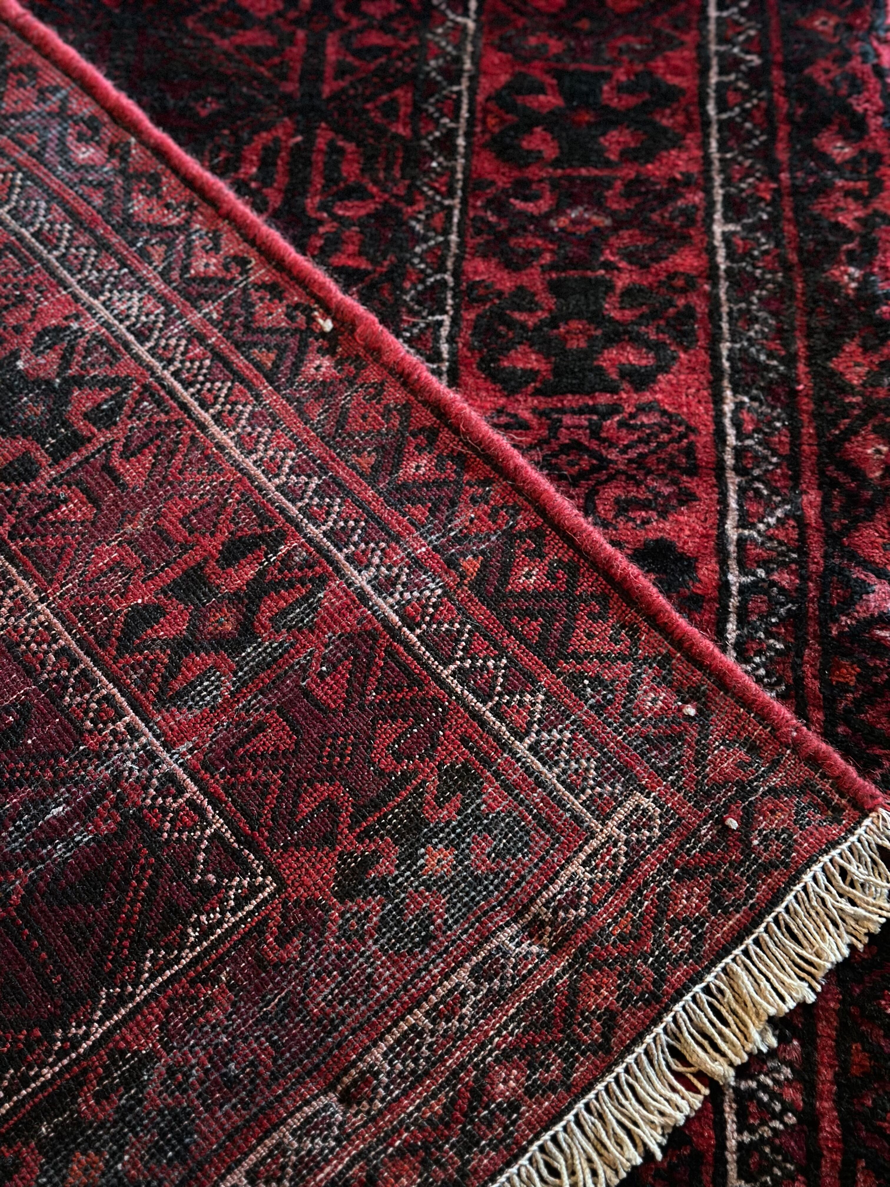 一見に規則正しい連続紋様に見えながらも、赤と真紅の色使いが不規則極まりないバルーチ族のトライバルラグになります。