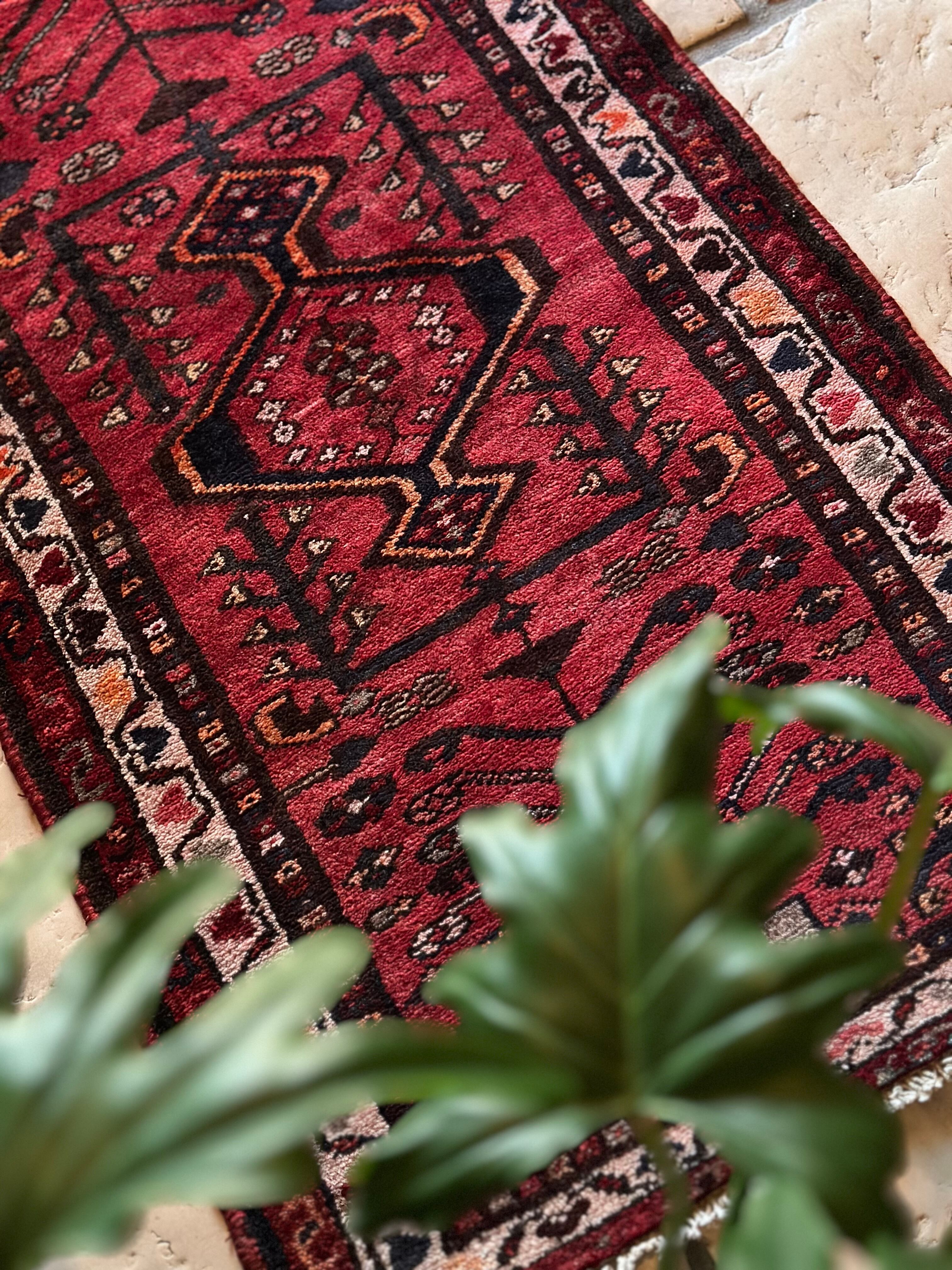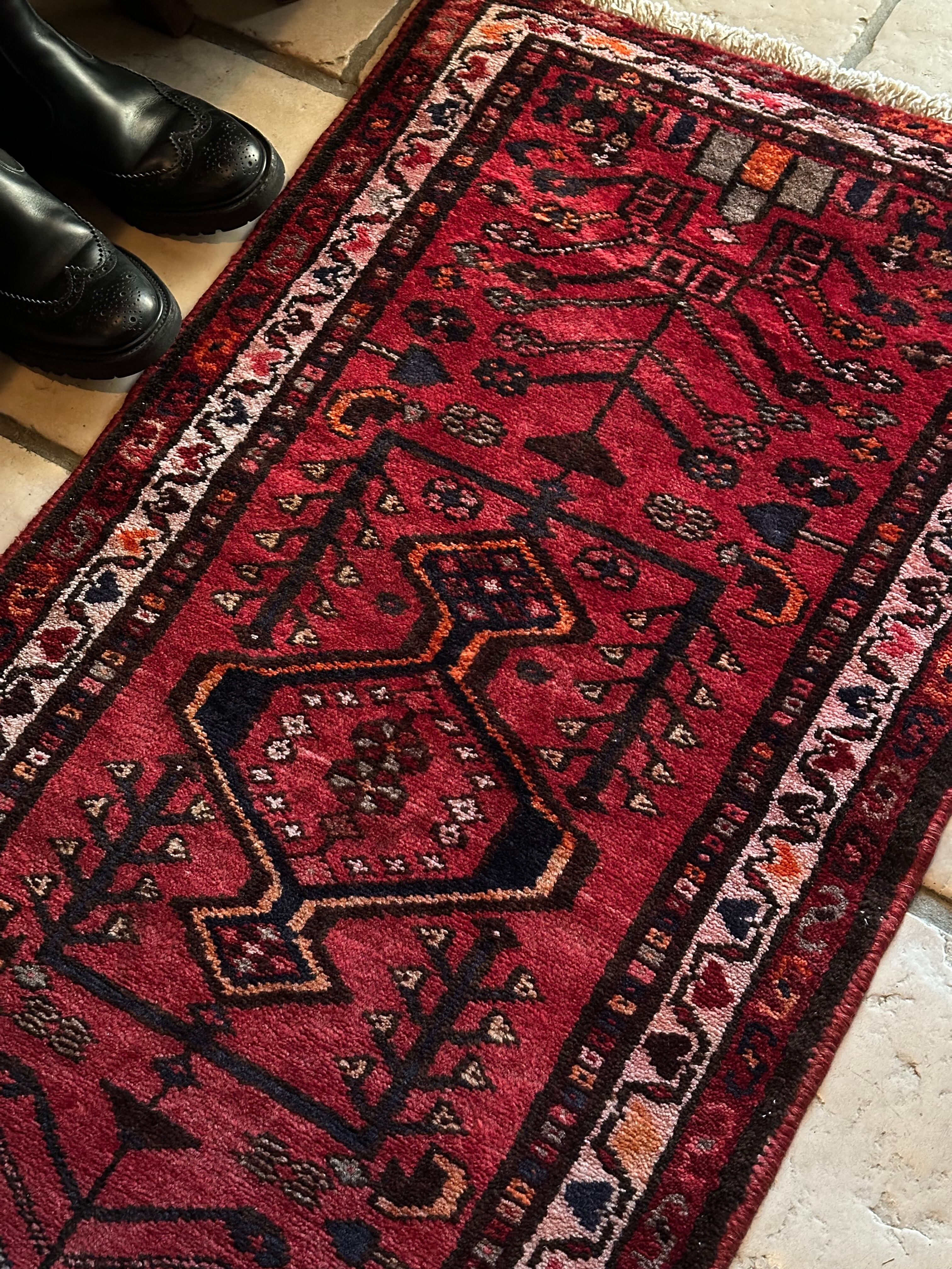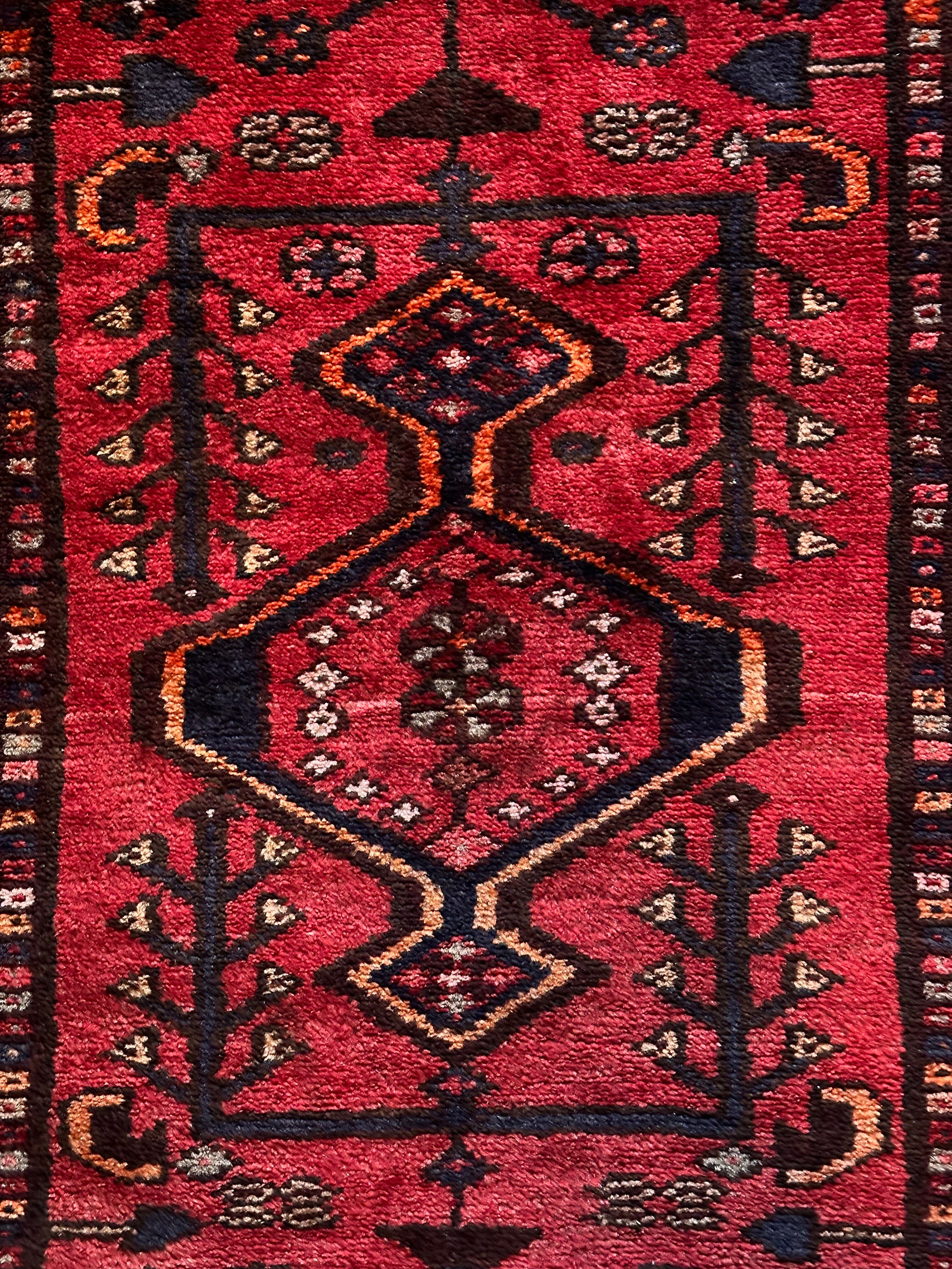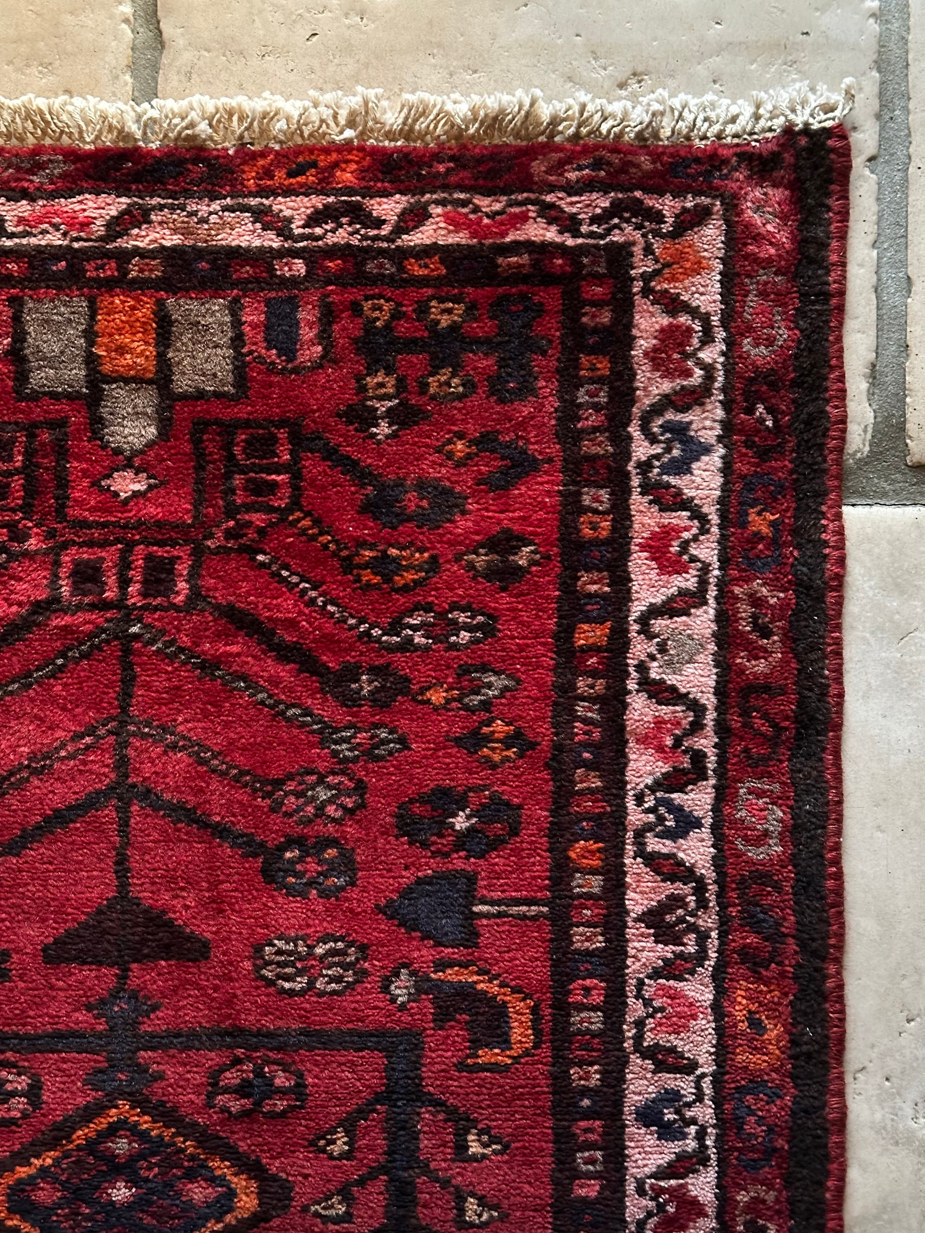 深みのある赤に生命の樹のモチーフが描かれたハマダン近郊で手織りされた素朴なヴィレッジラグになります。
