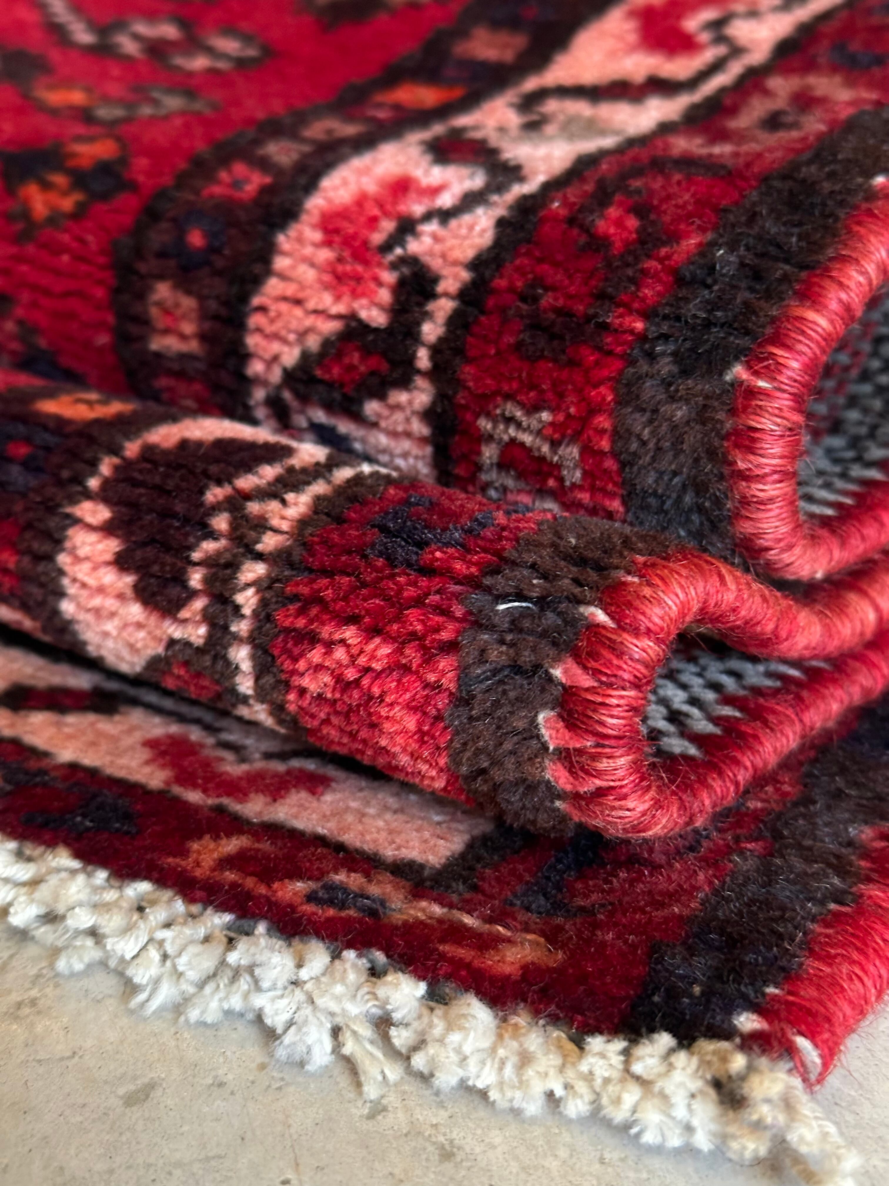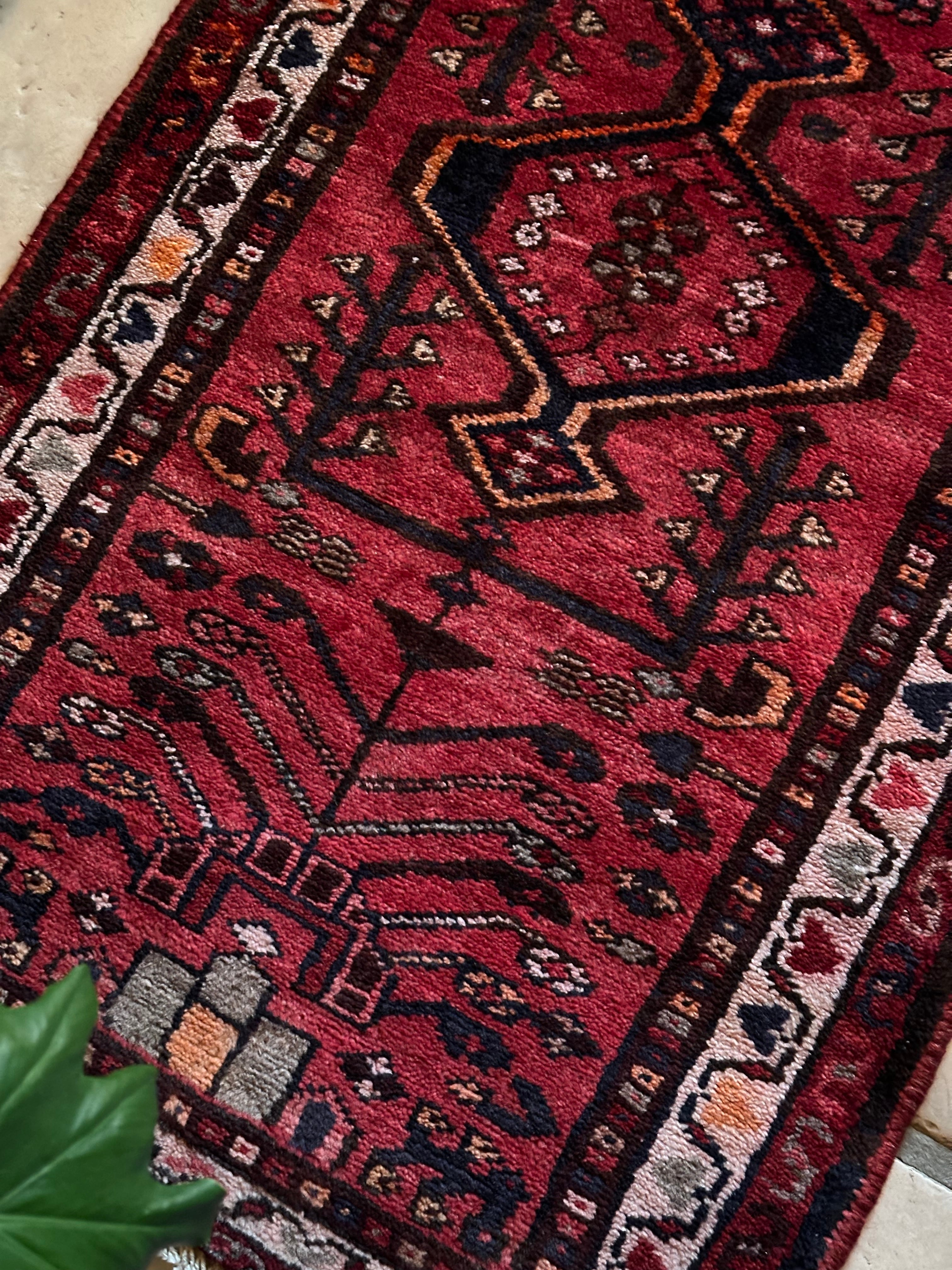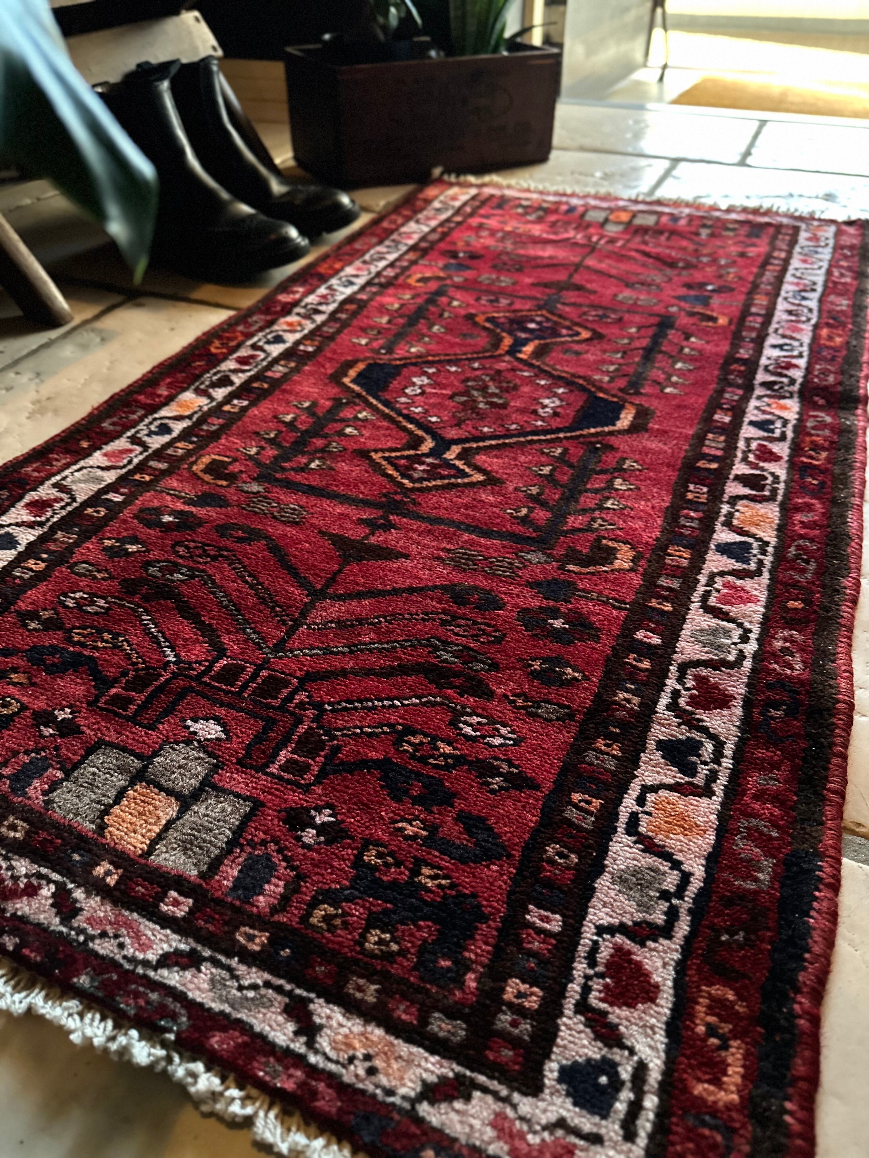 深みのある赤に生命の樹のモチーフが描かれたハマダン近郊で手織りされた素朴なヴィレッジラグになります。