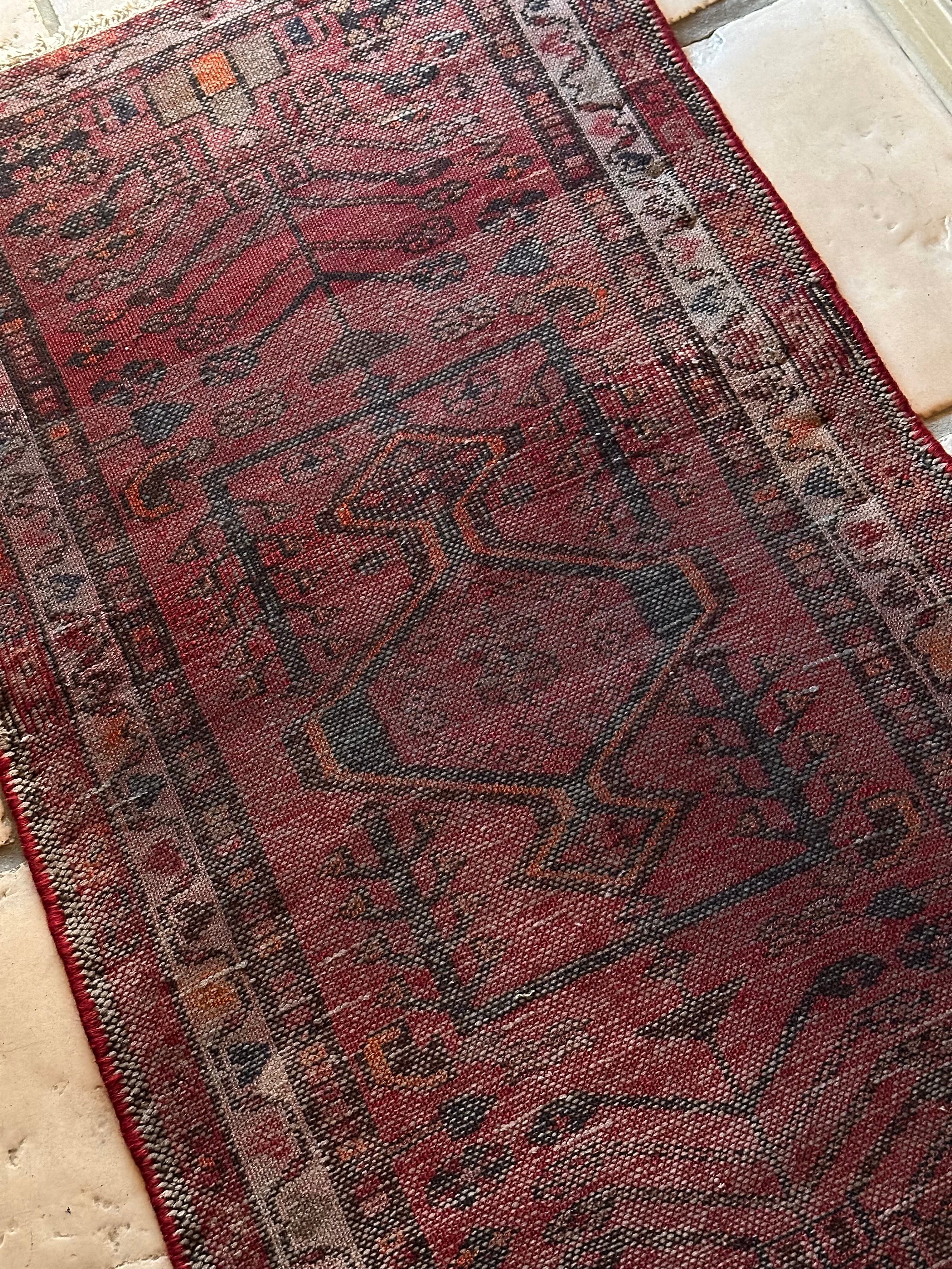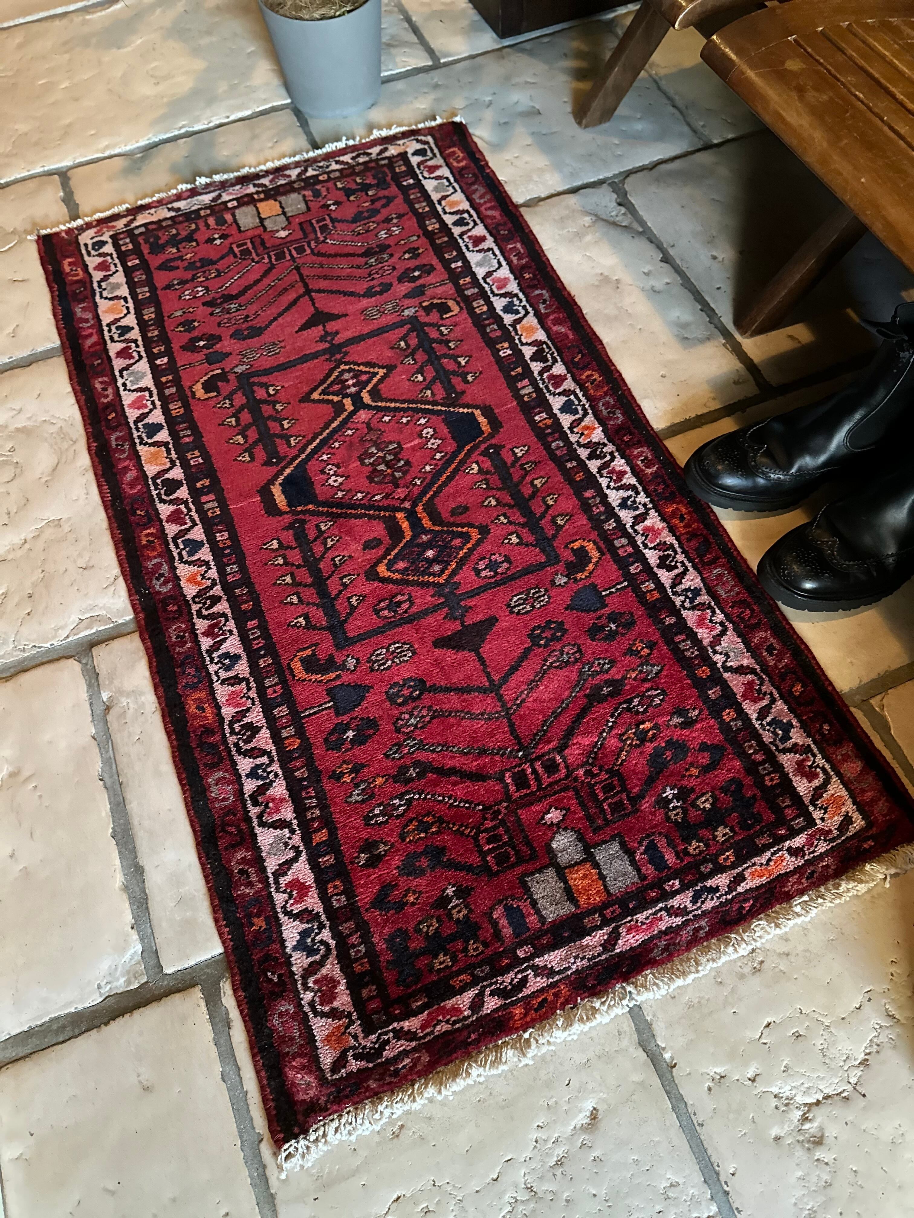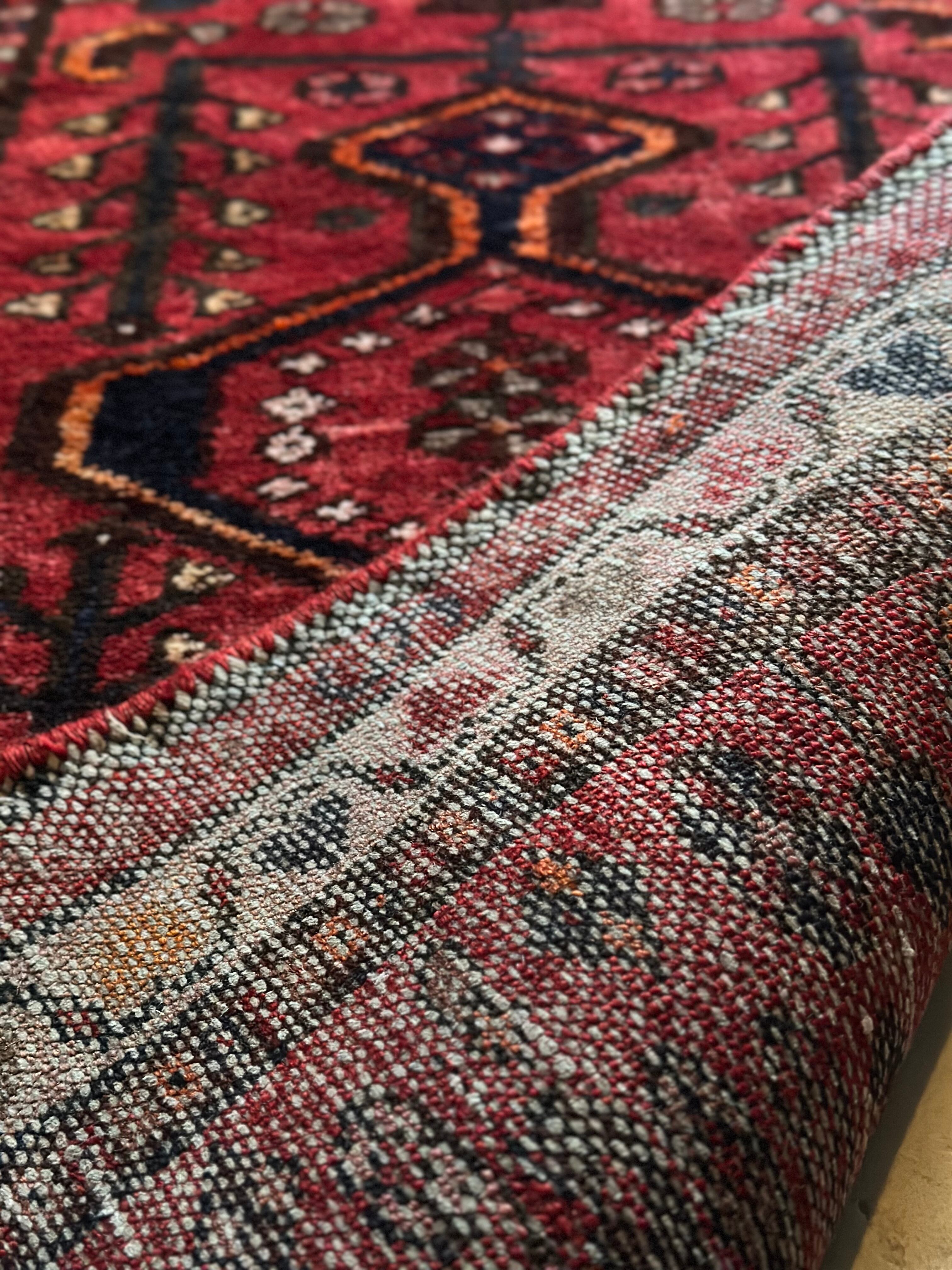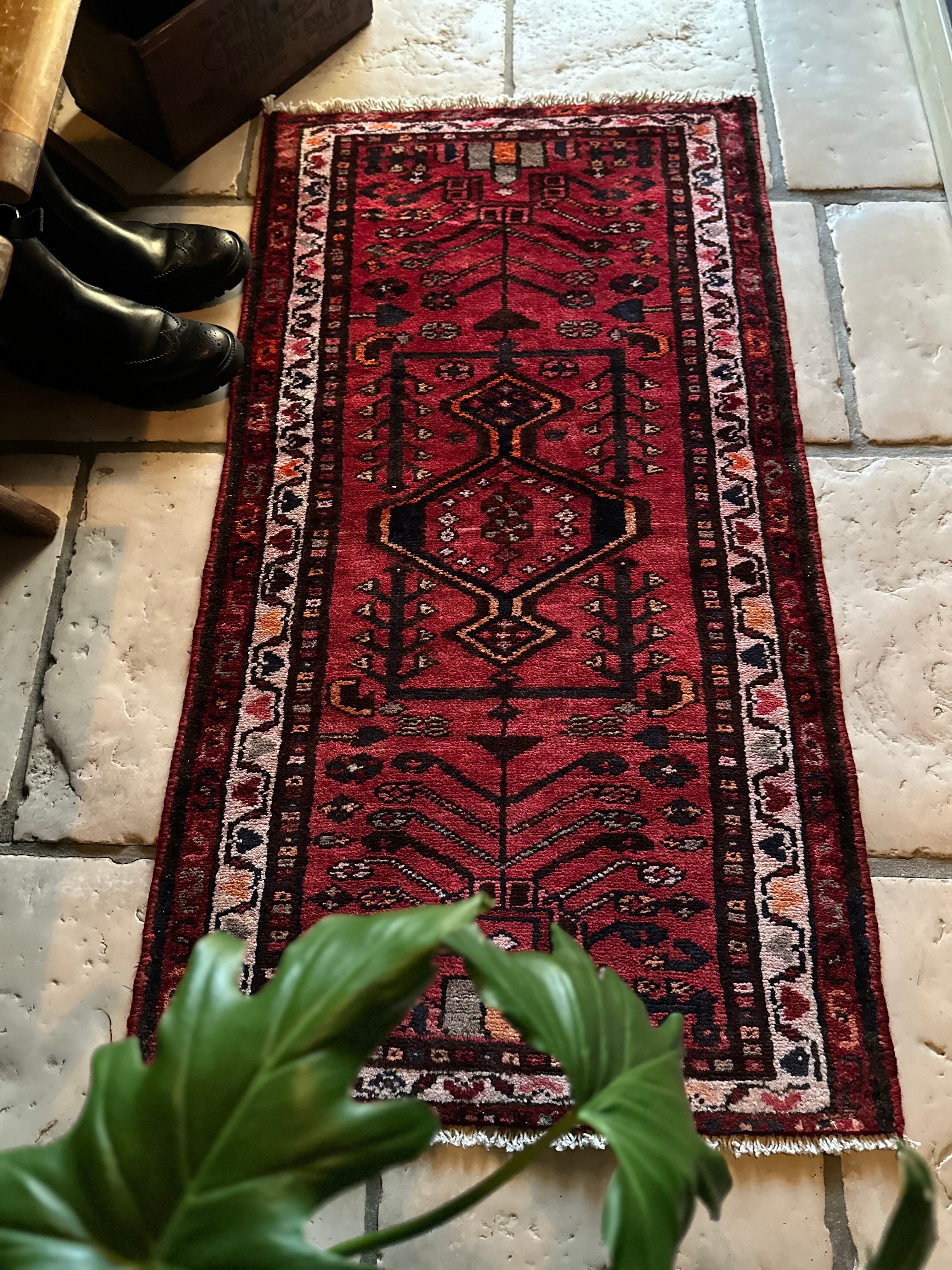 深みのある赤に生命の樹のモチーフが描かれたハマダン近郊で手織りされた素朴なヴィレッジラグになります。