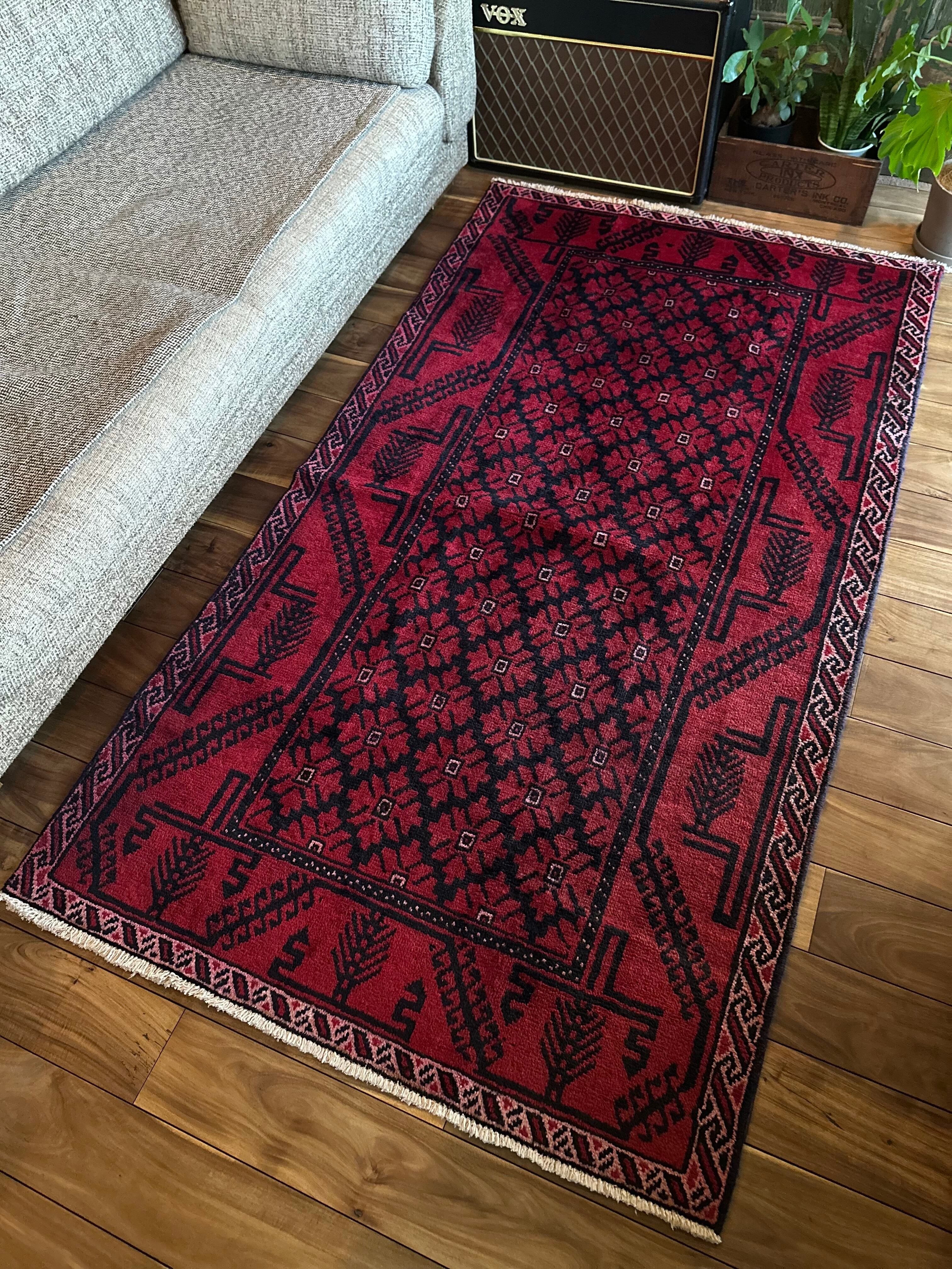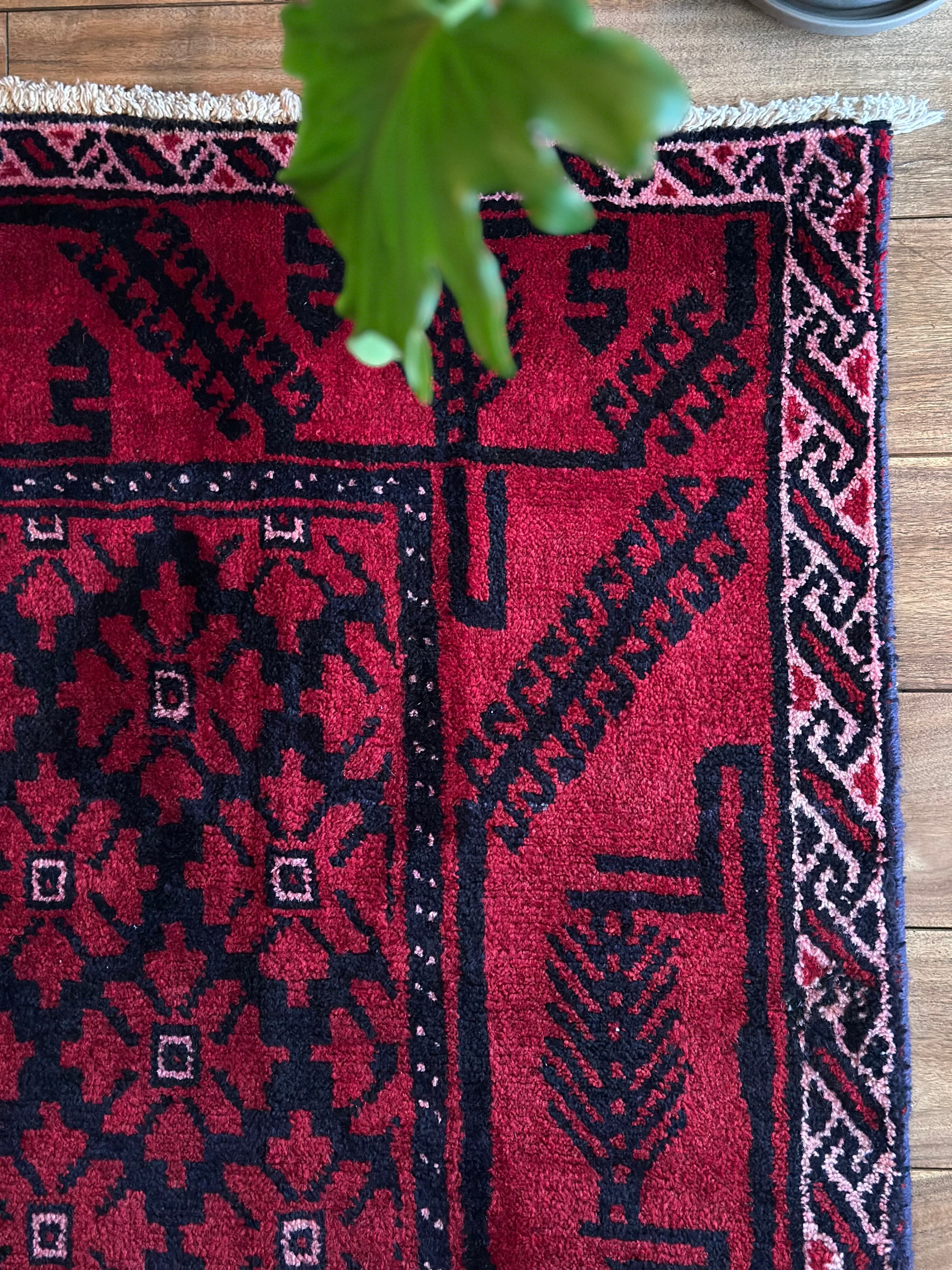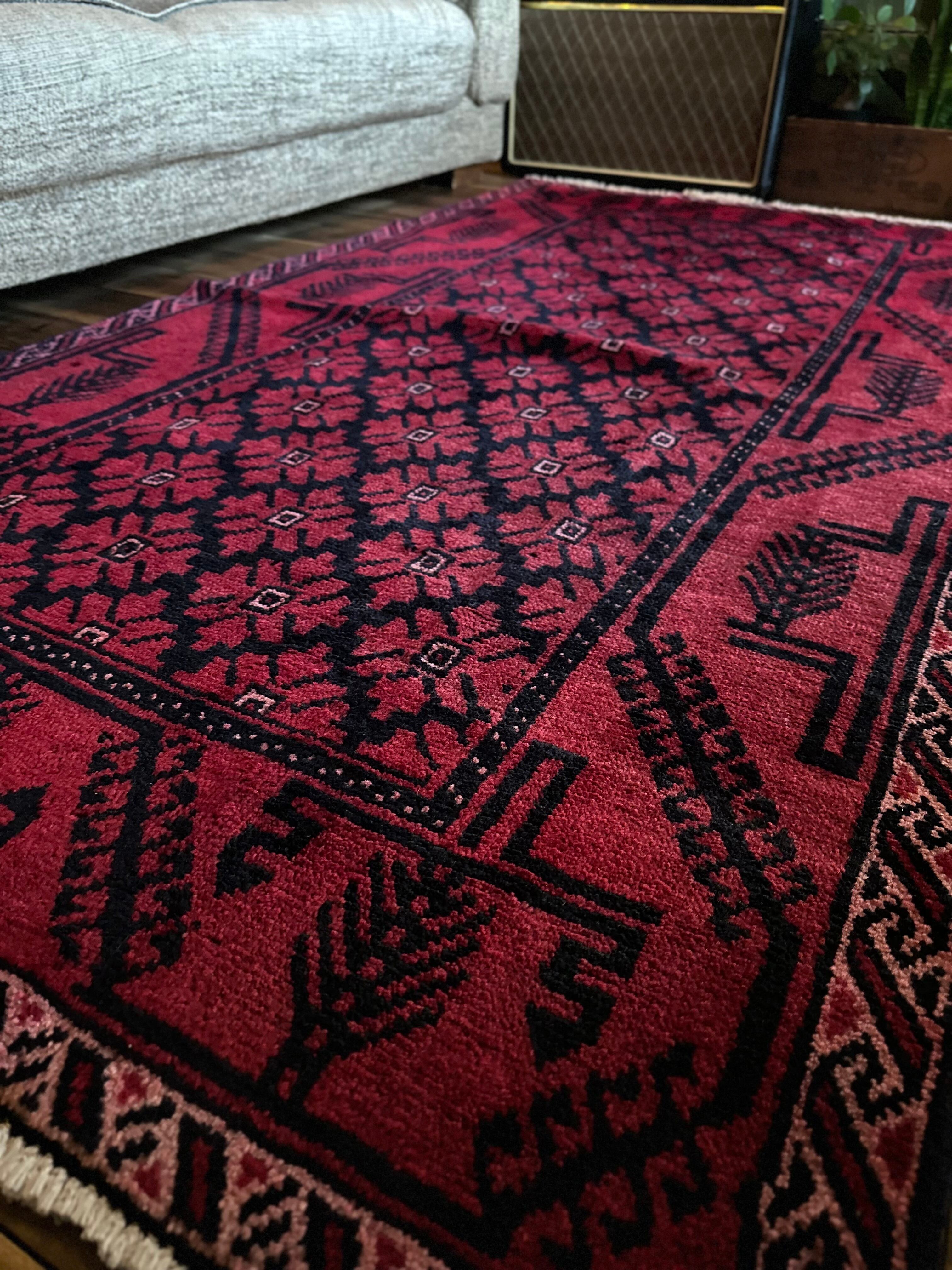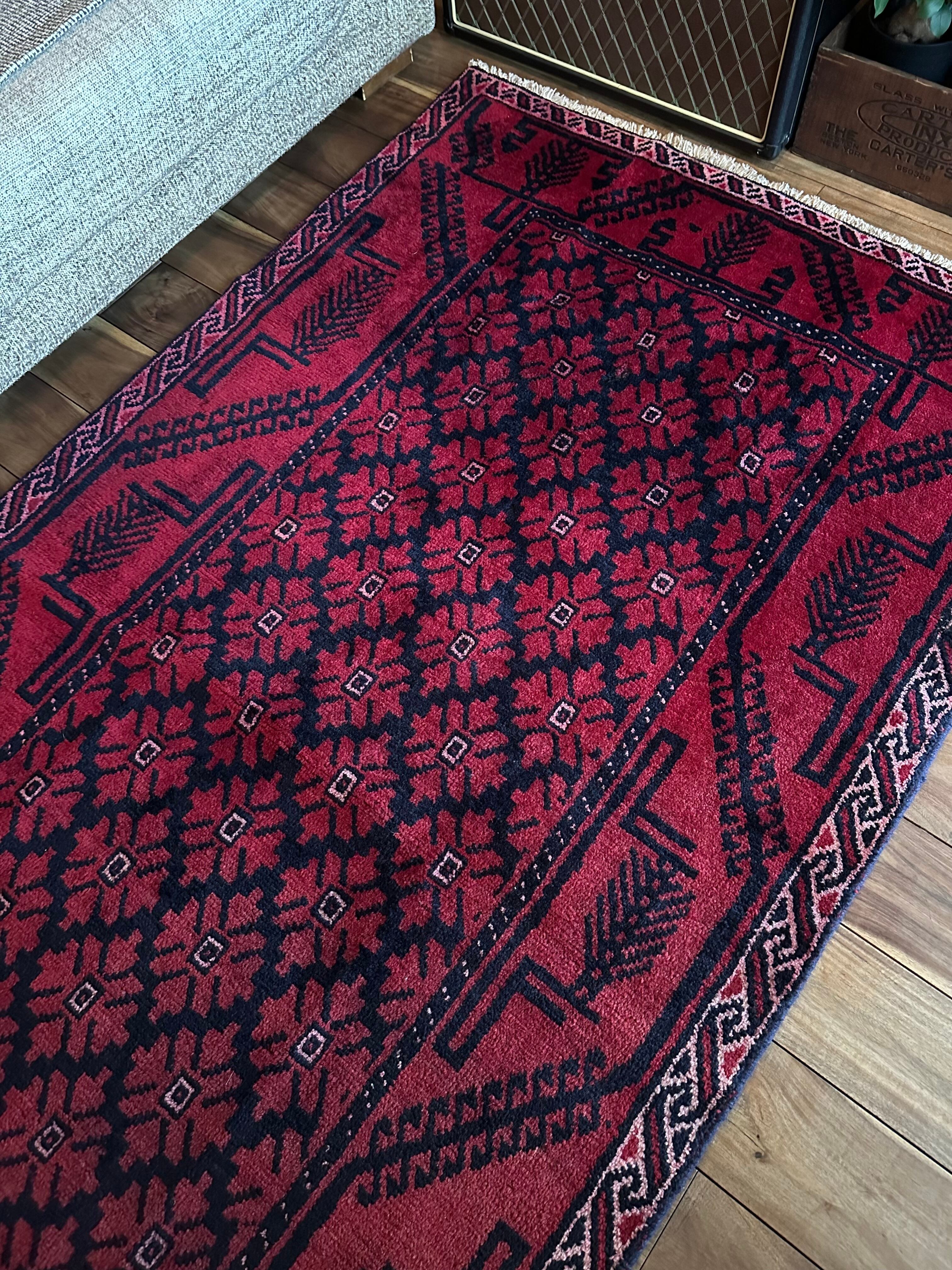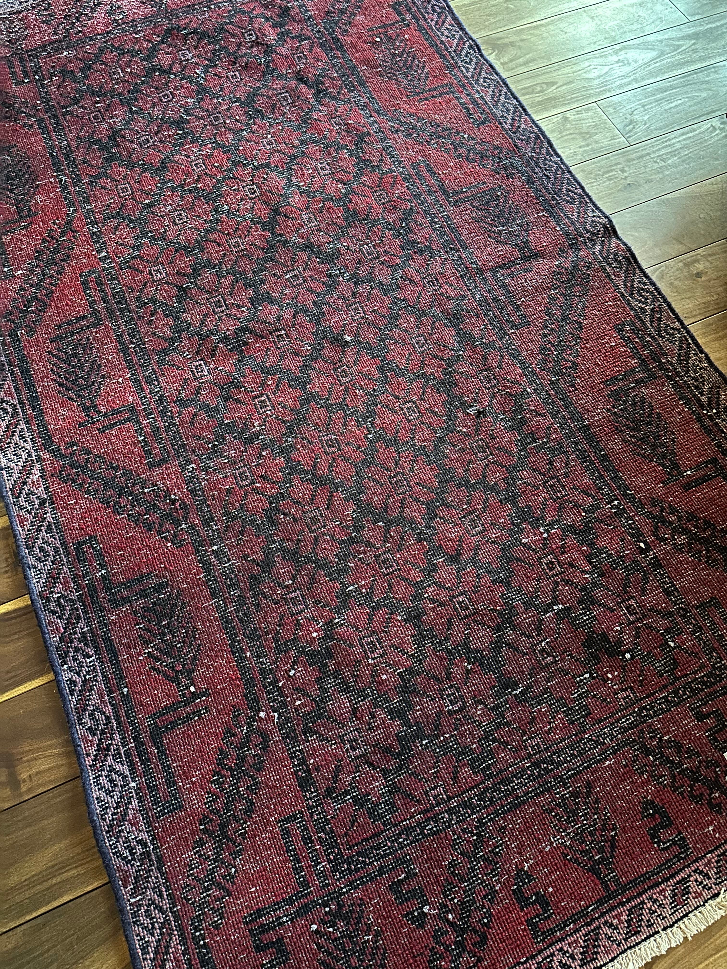 おそらくはクルド系のグーチャンによって織られたであろうバルーチ風の1枚で、イラン西部の国境付近では他民族によって模造されるのも総じてバルーチと呼ばれています。