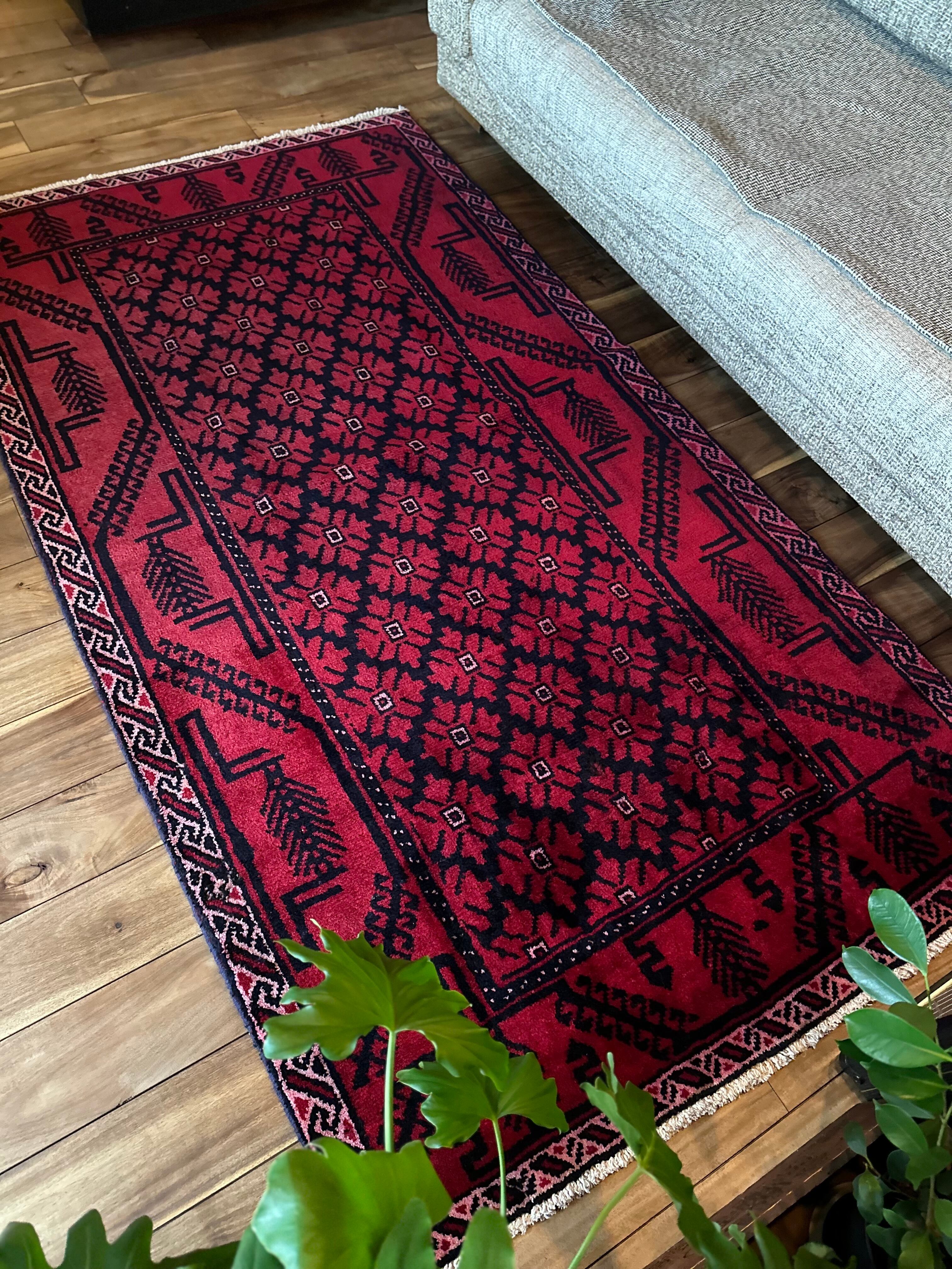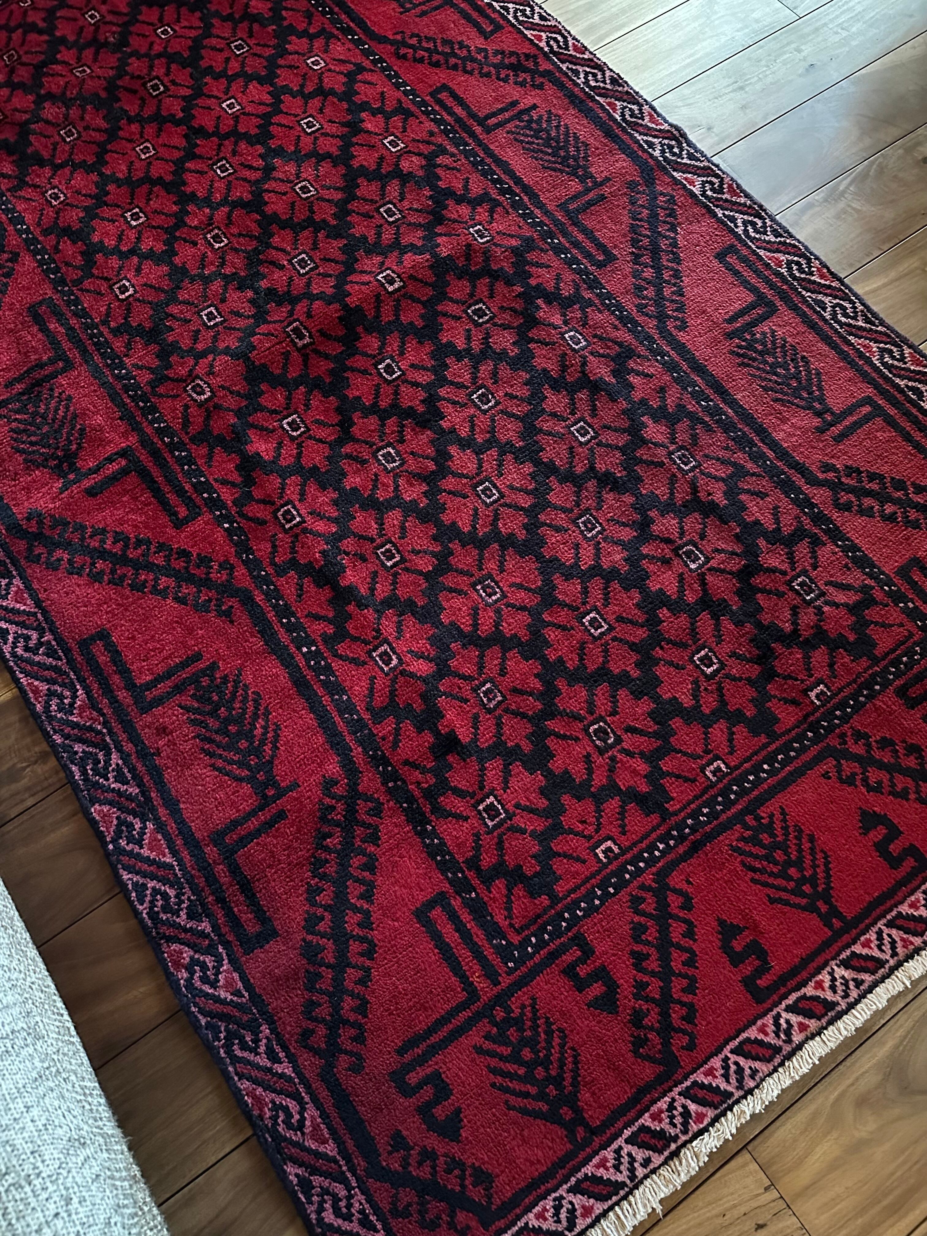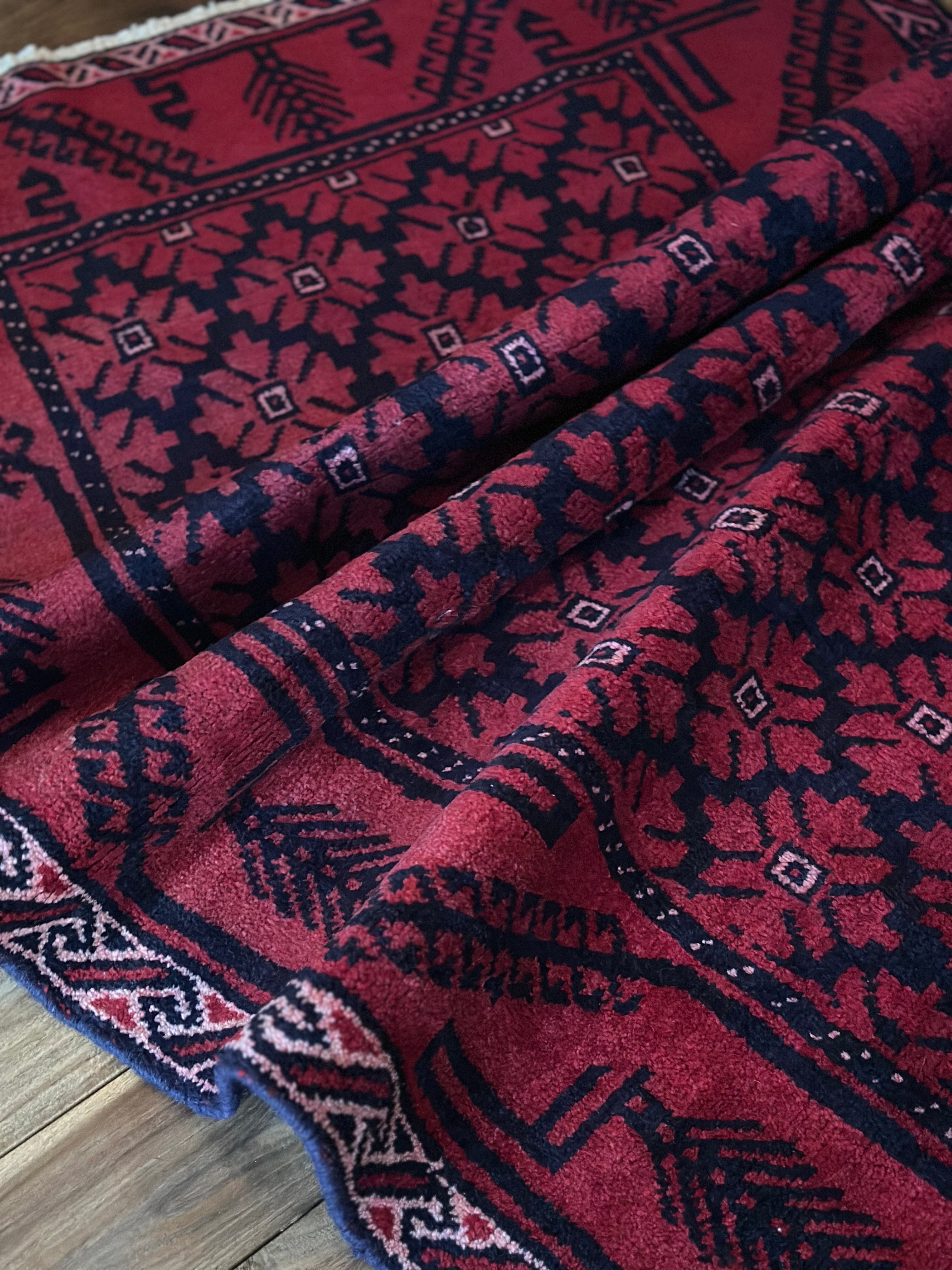 ふかふかとした肌触りにフィールドを埋め尽くした真っ赤なお花畑が目を惹く大判サイズのバルーチのトライバルラグになります。