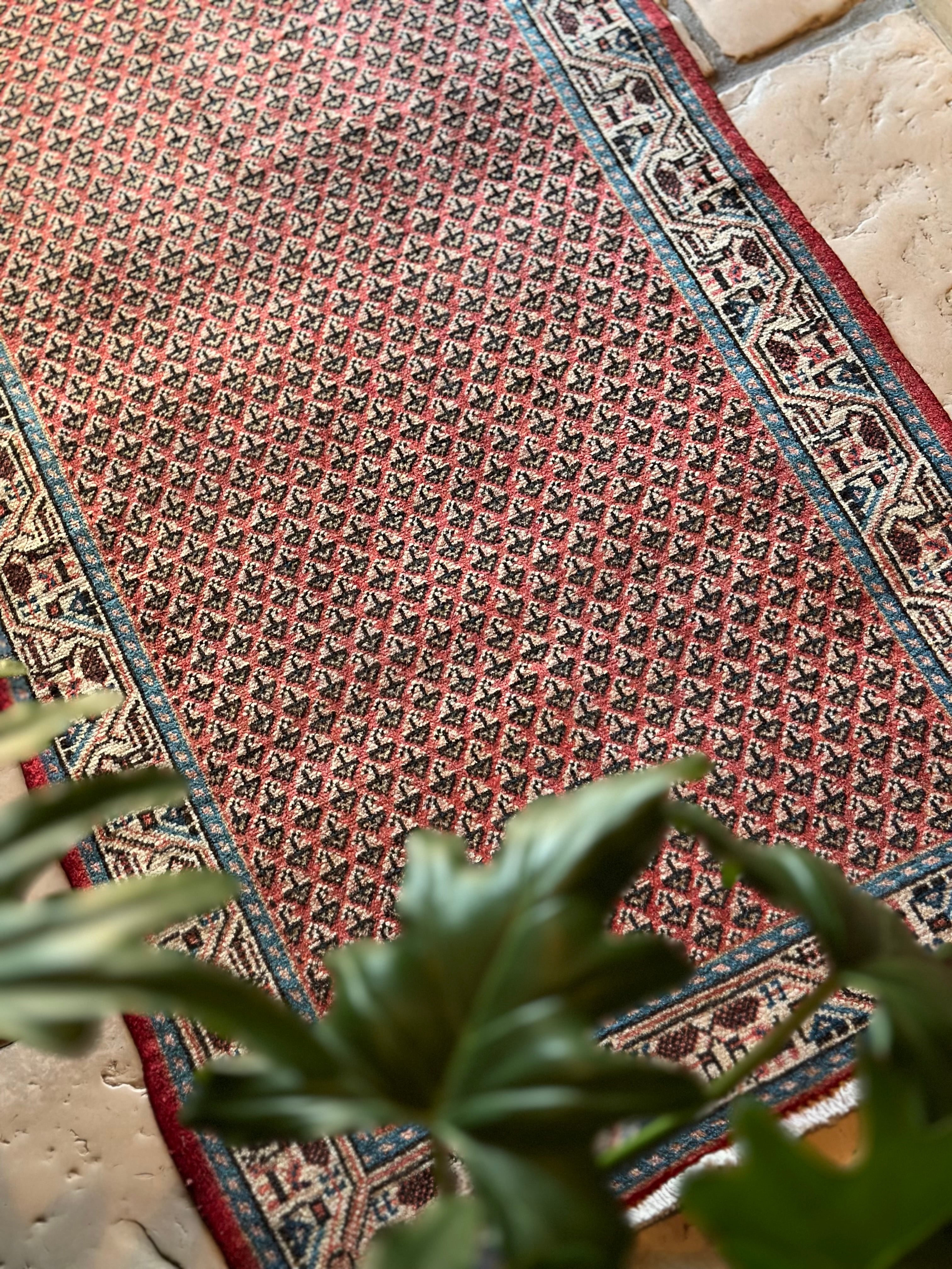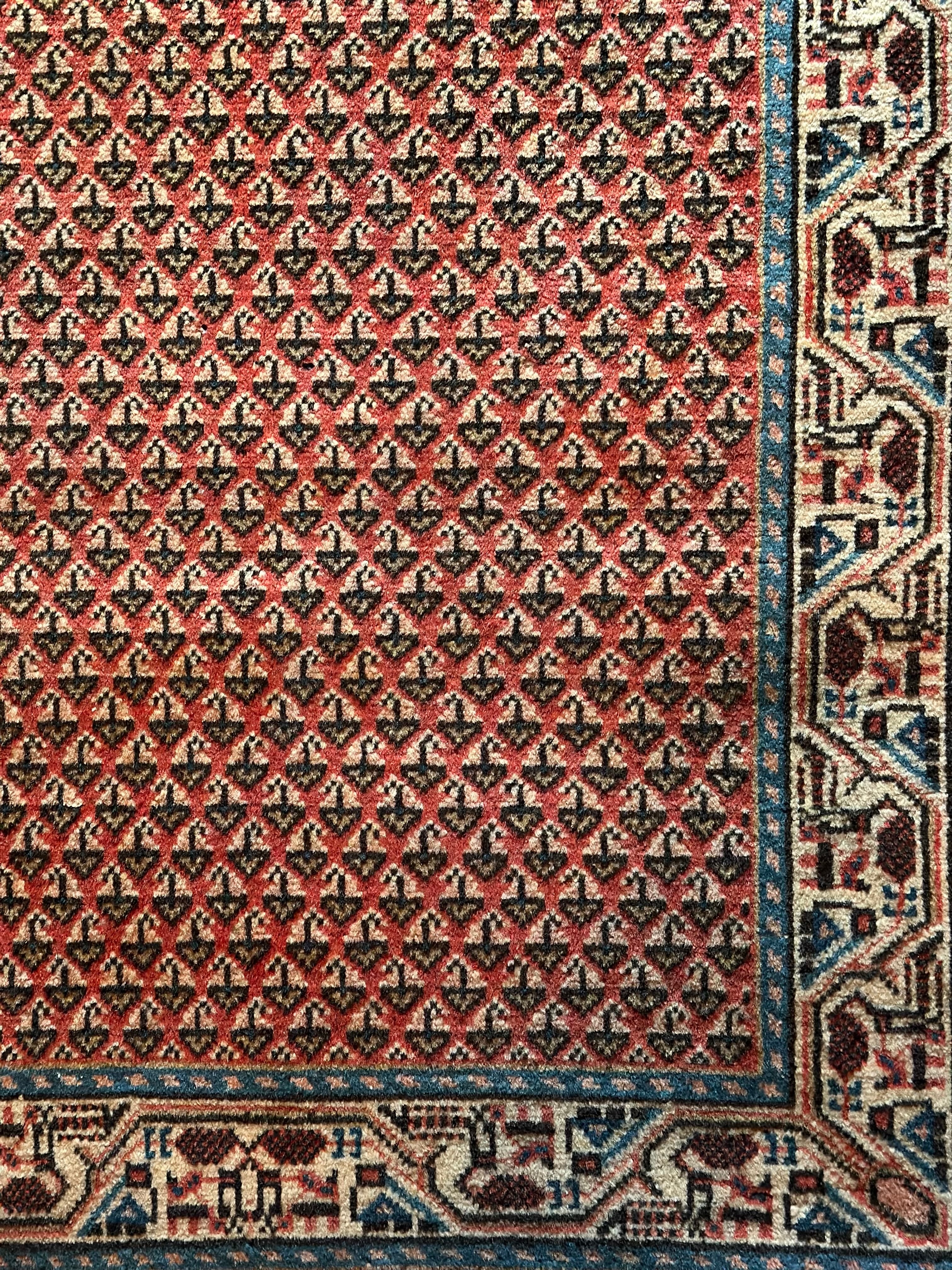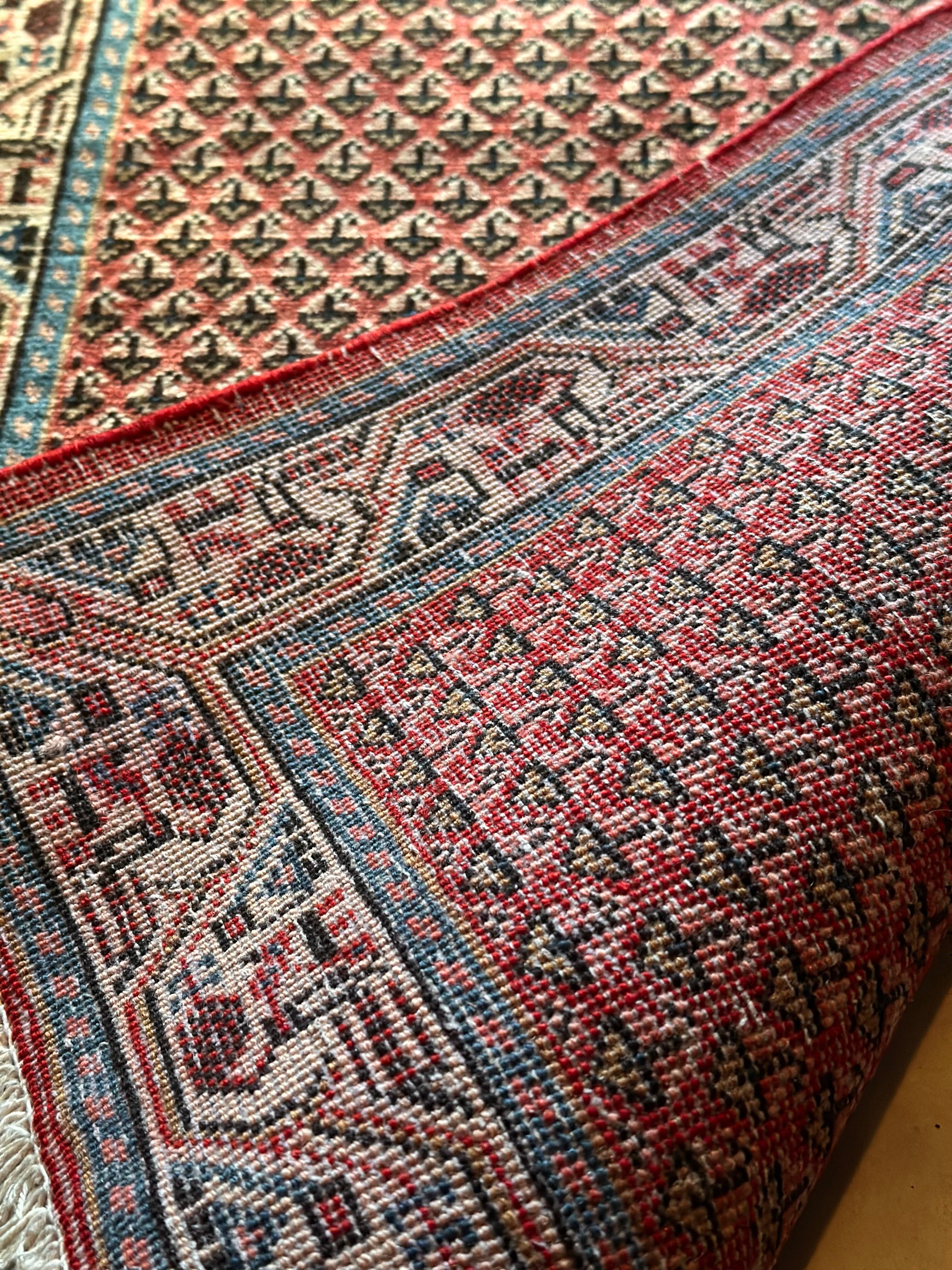 織りの細かさで欧米でも人気のアラクですが、こちらも密度のあるしっかりとした織りで、淡いピンクのフィールドに松ぼっくりをモチーフとしたミール紋様が愛らしい絨毯でしょうか。しっかりとした厚みが長年使えそうな1枚になります。