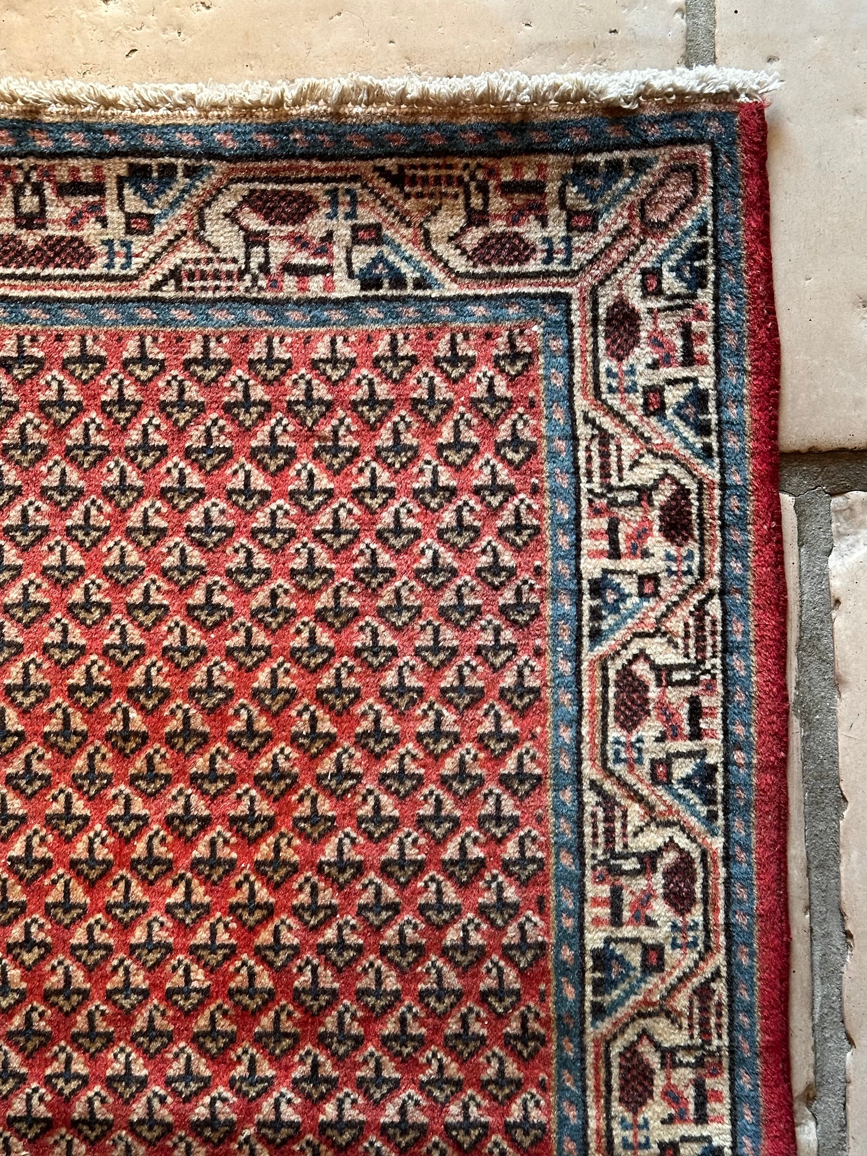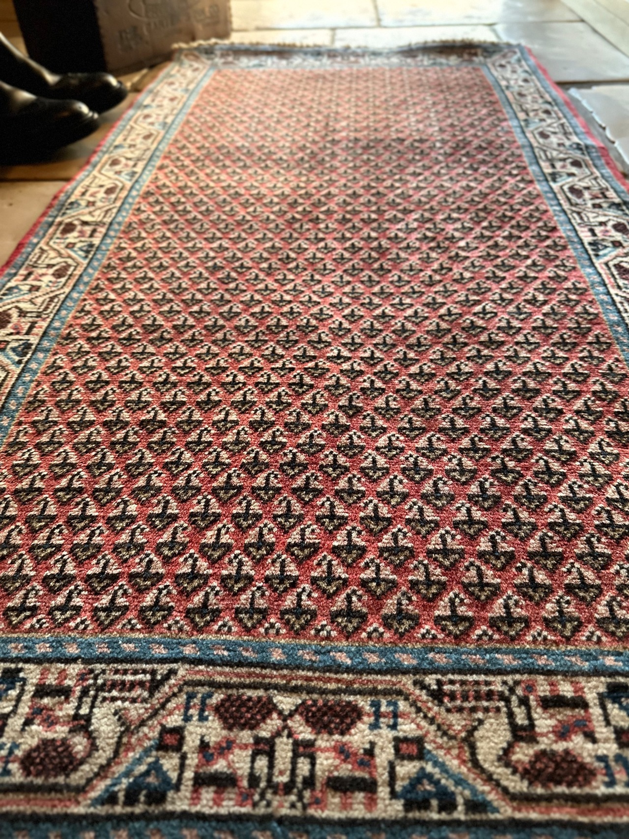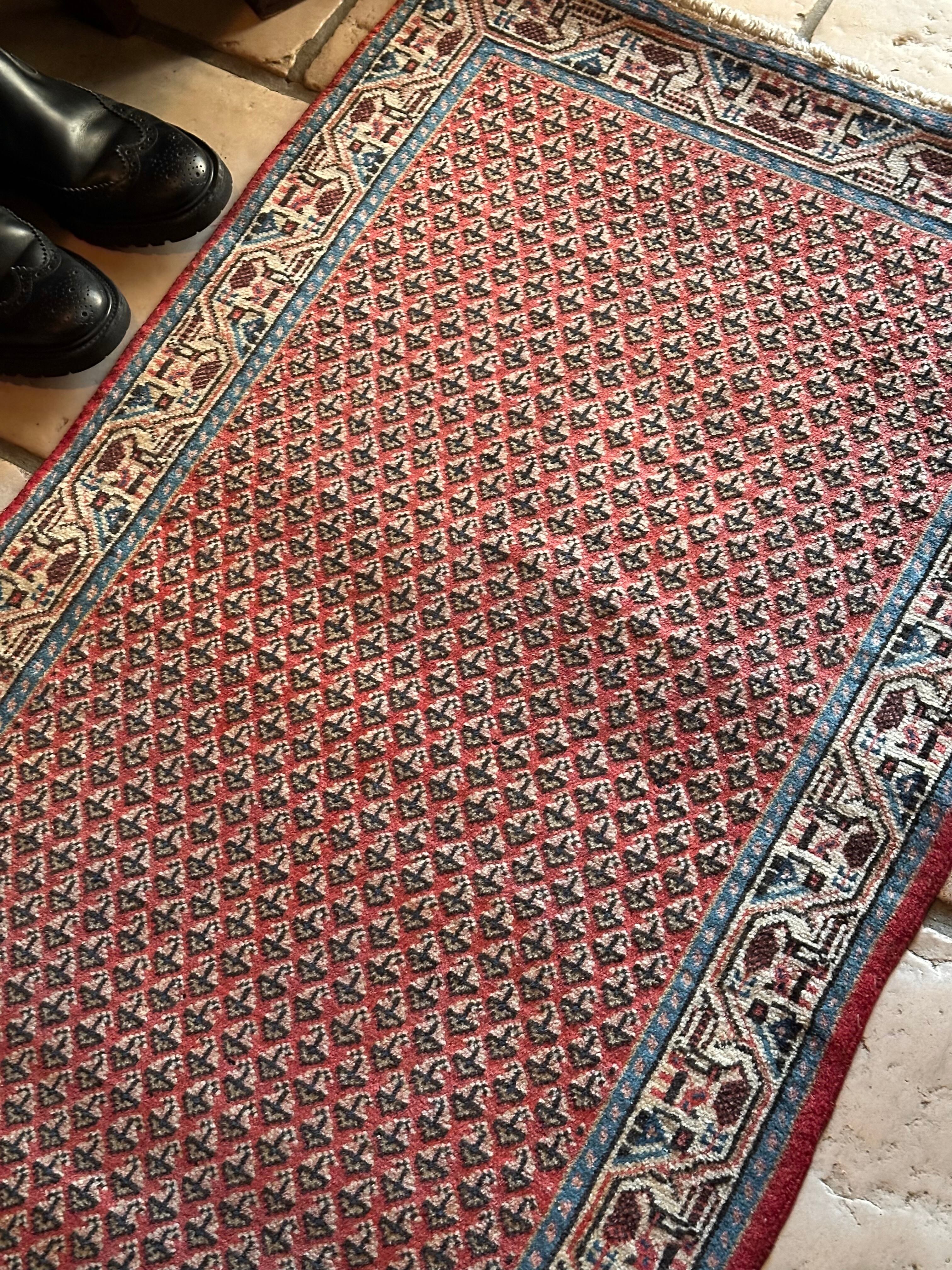 織りの細かさで欧米でも人気のアラクですが、こちらも密度のあるしっかりとした織りで、淡いピンクのフィールドに松ぼっくりをモチーフとしたミール紋様が愛らしい絨毯でしょうか。しっかりとした厚みが長年使えそうな1枚になります。