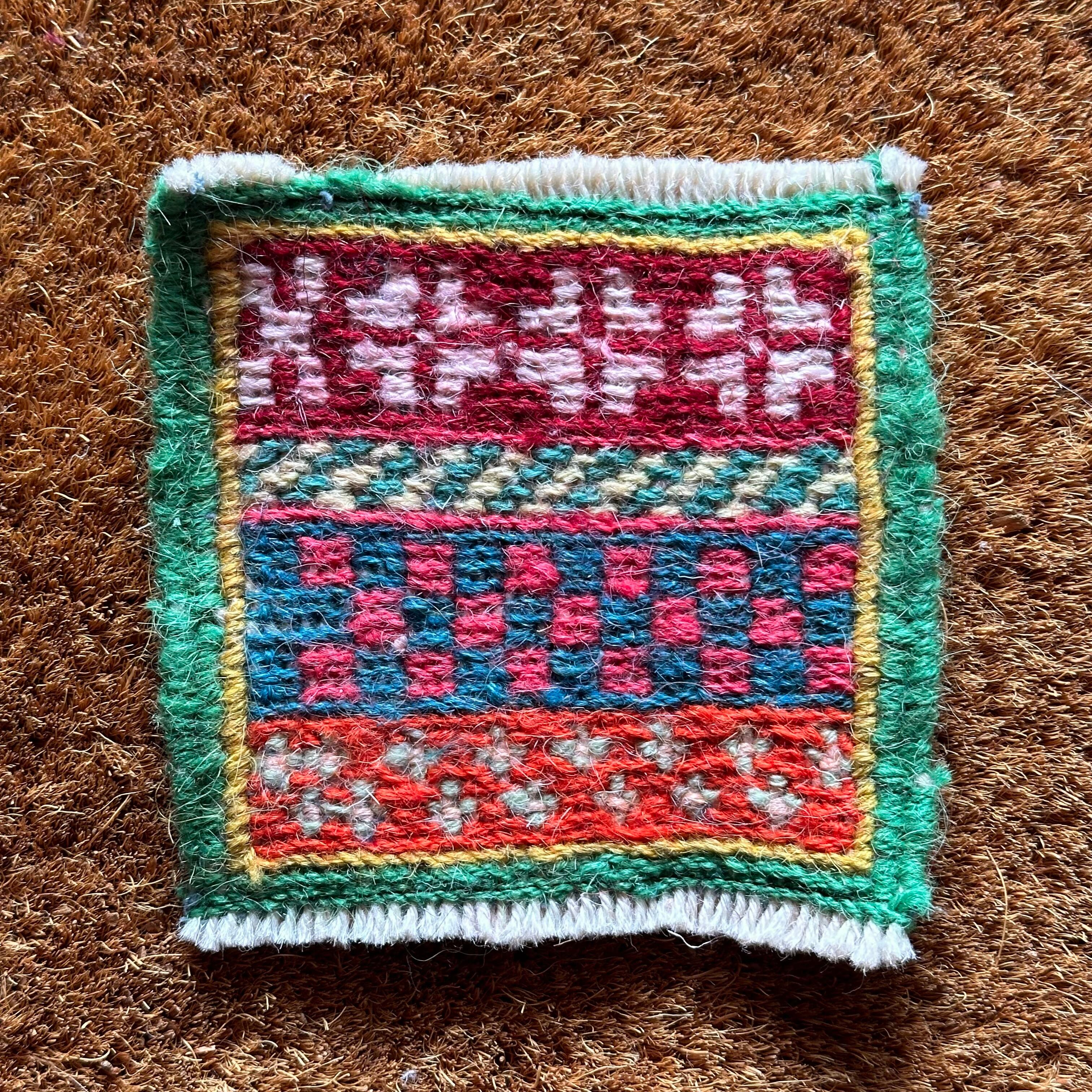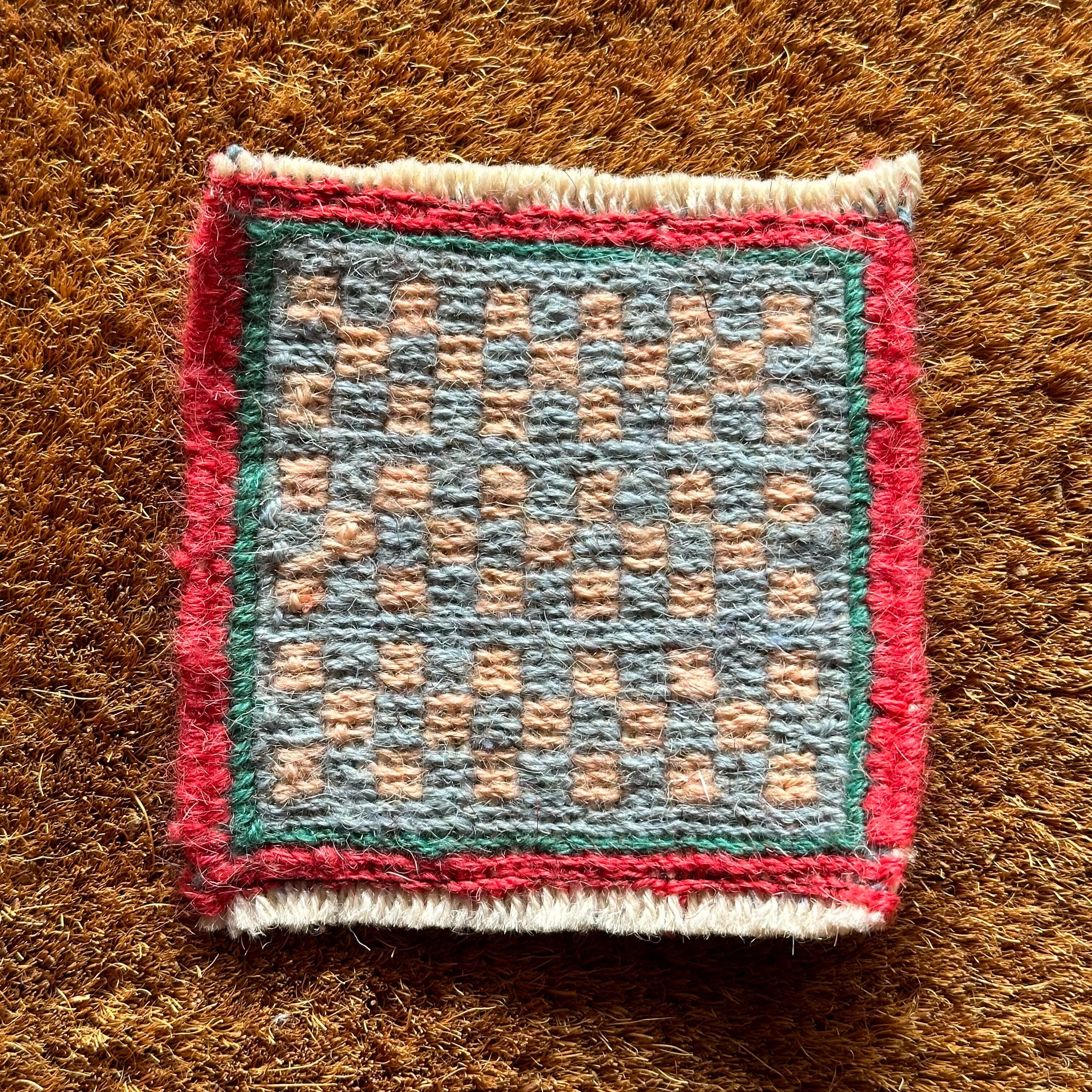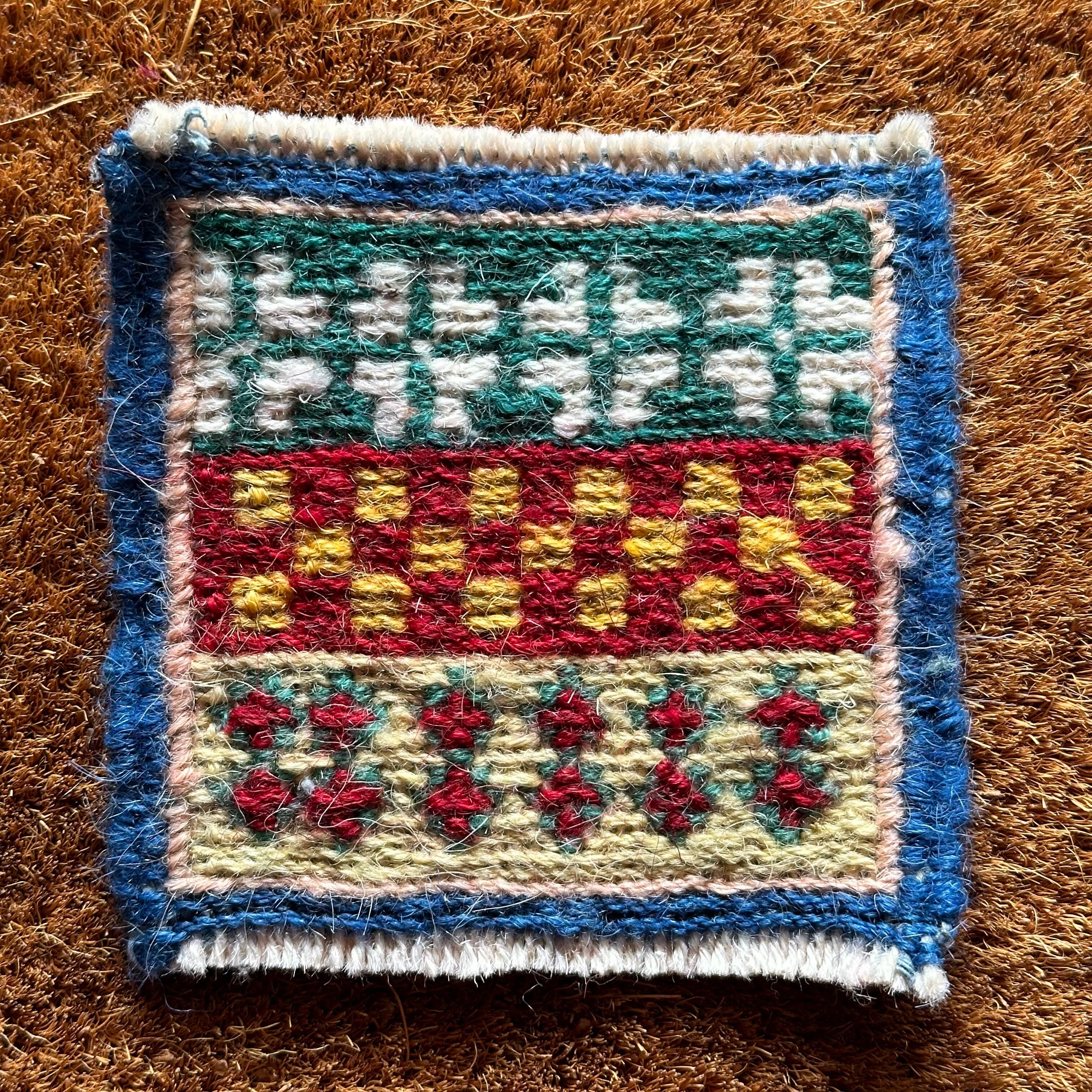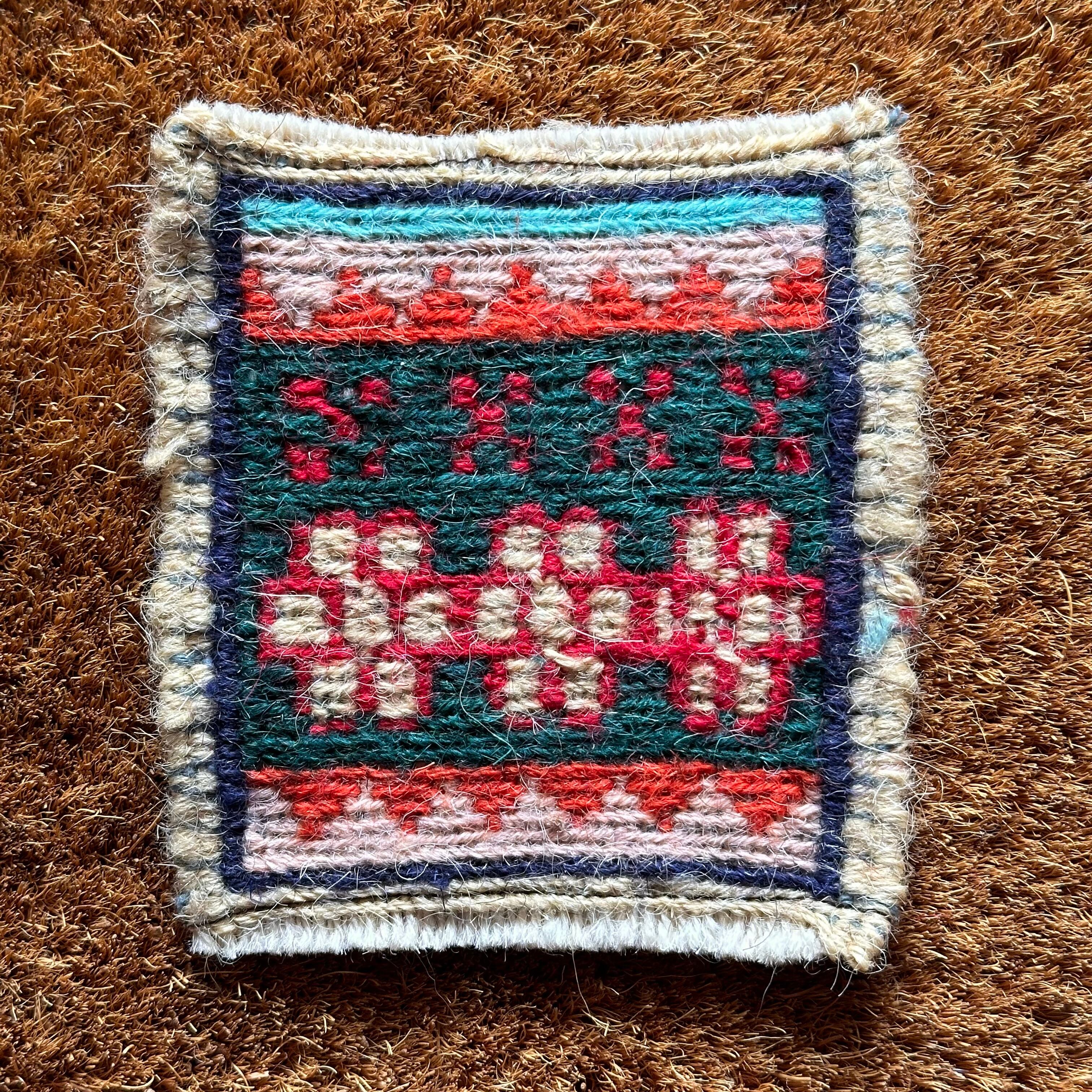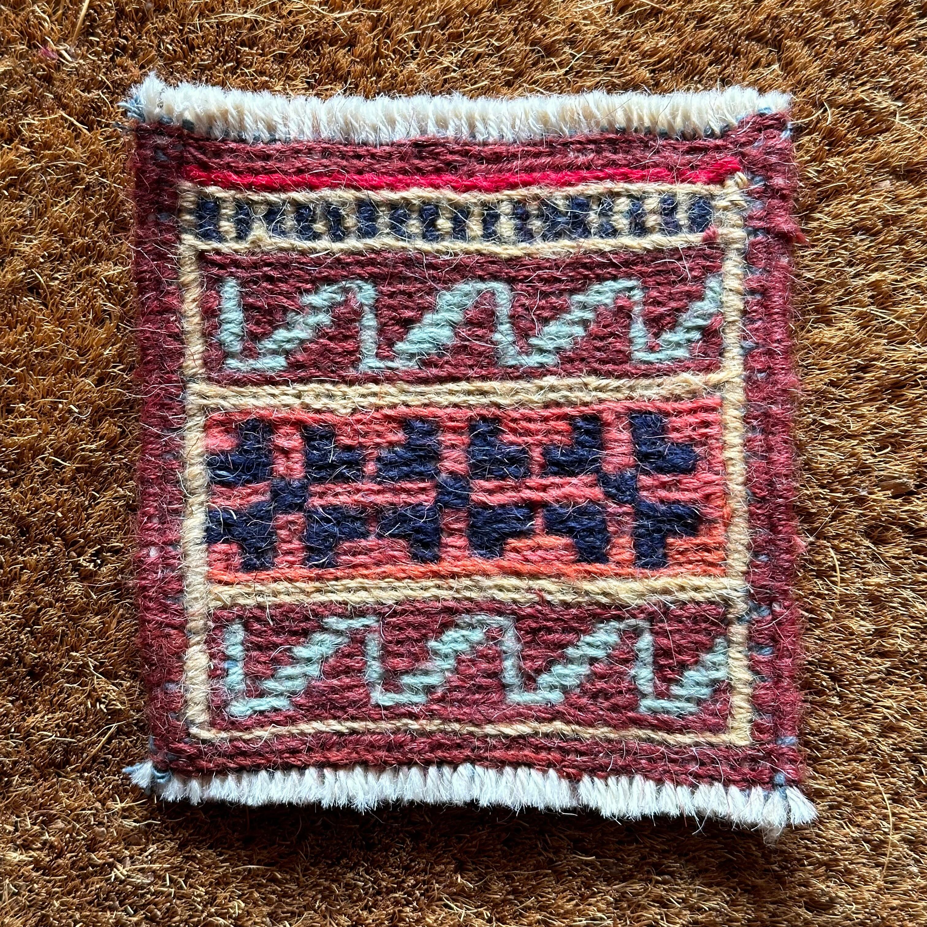 イラン北西部はアゼルバイジャン地方にあるアルダビールの村周辺で手織りされたスマック織りヴァルニキリムの新品コースターになります。