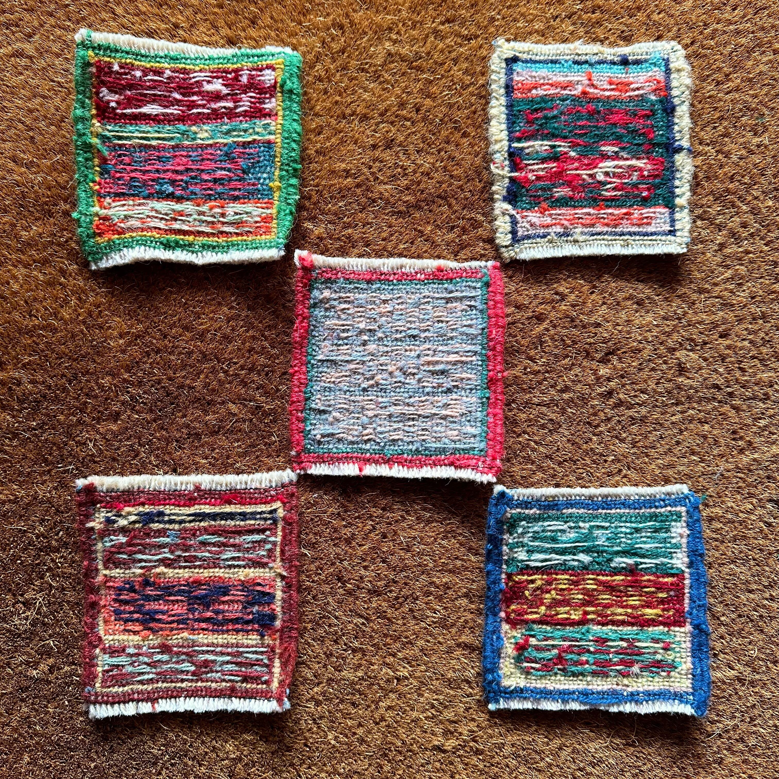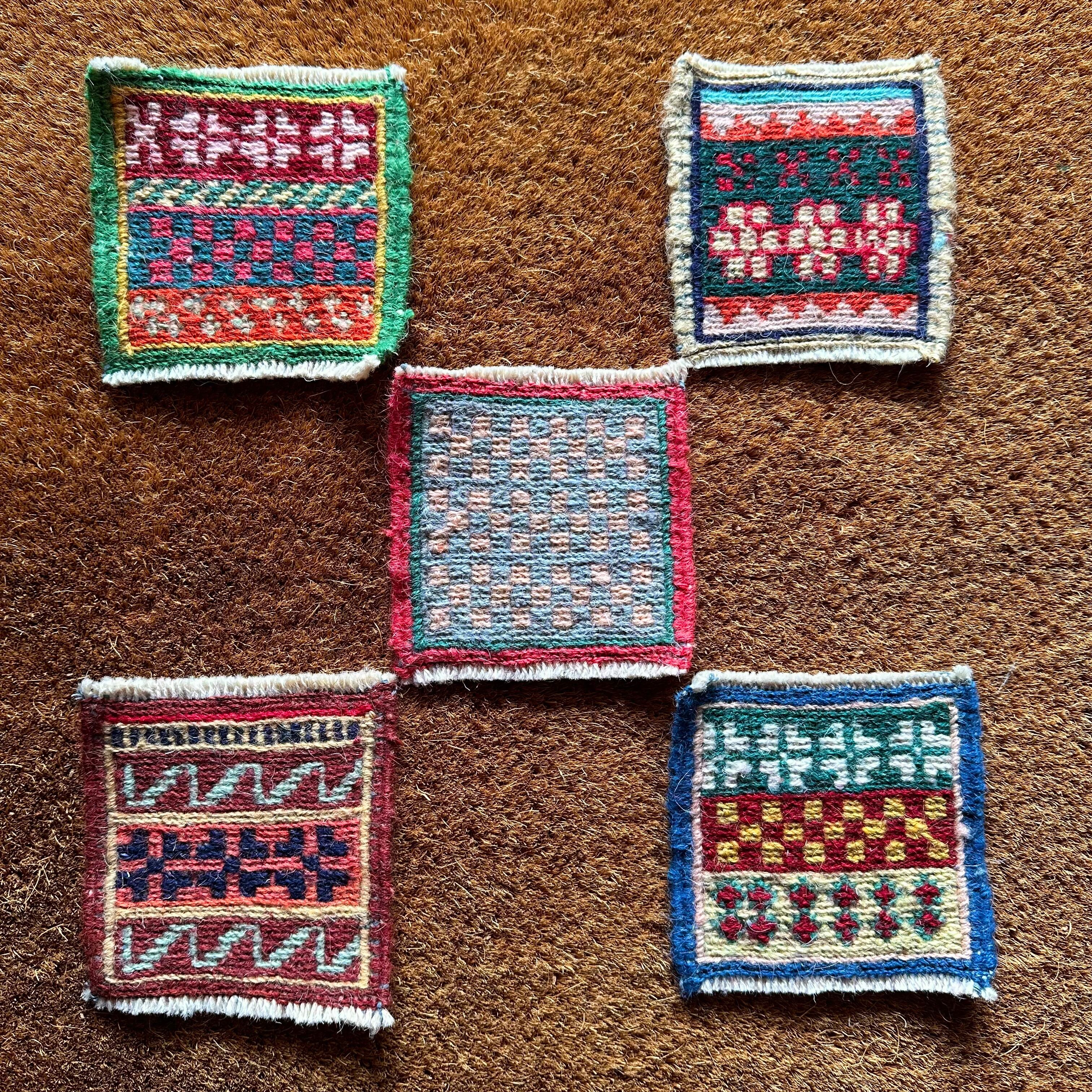 こちらはモチーフ柄が描かれた5枚セットになり、製作段階では20枚綴りの帯状ですが、イラン現地にてカットとフリンジのほどけ防止のかがり縫いを施してあり、本来のスマック織りならではの裏面のムダ毛もカットしています。