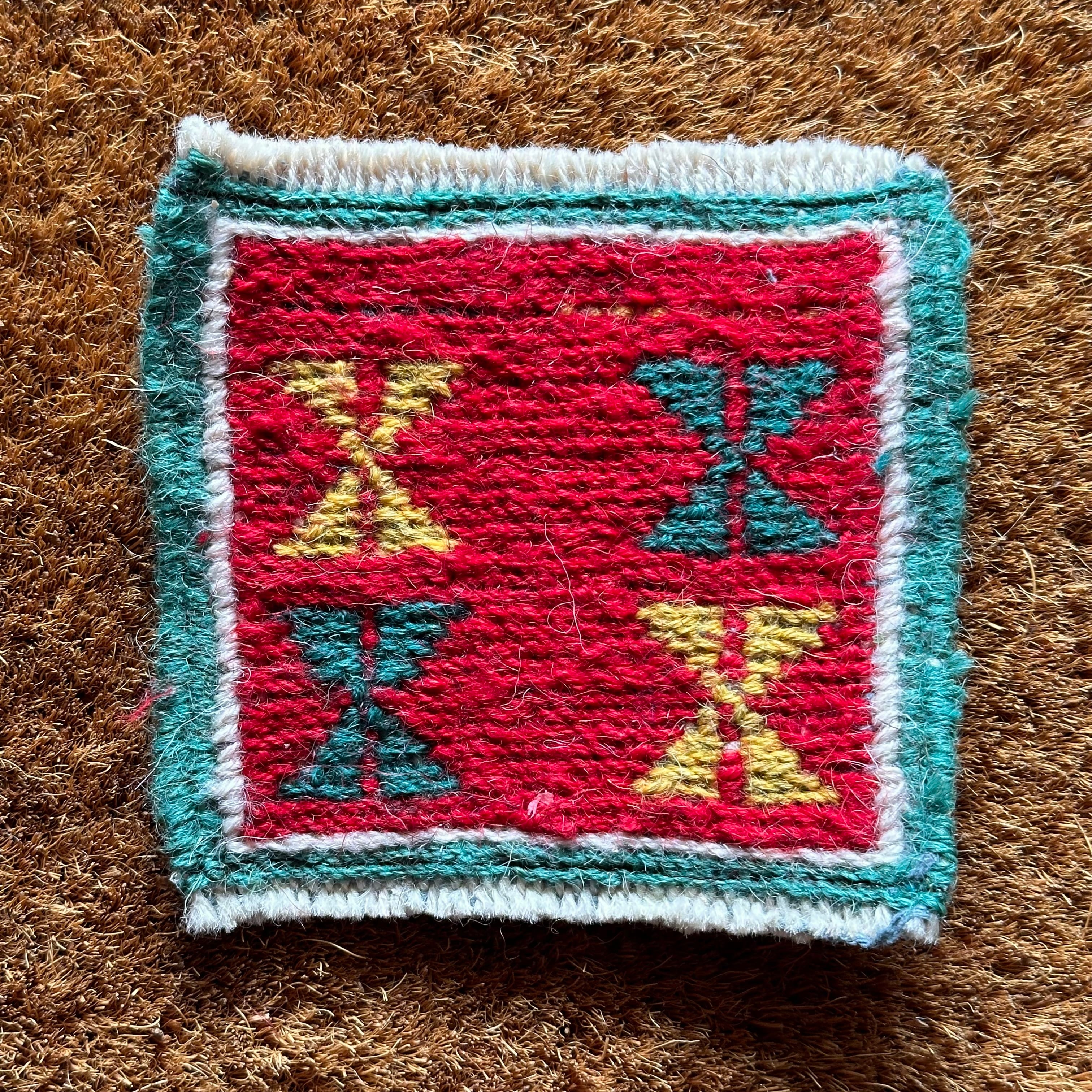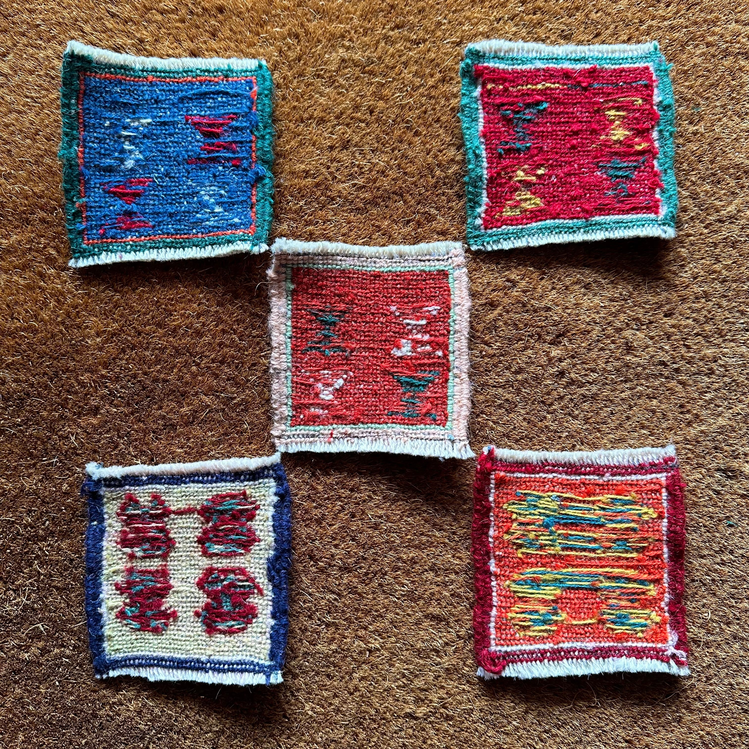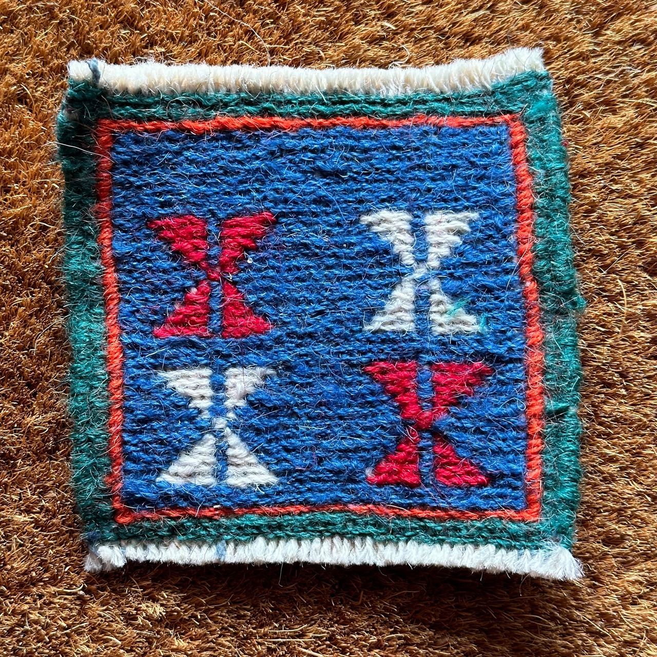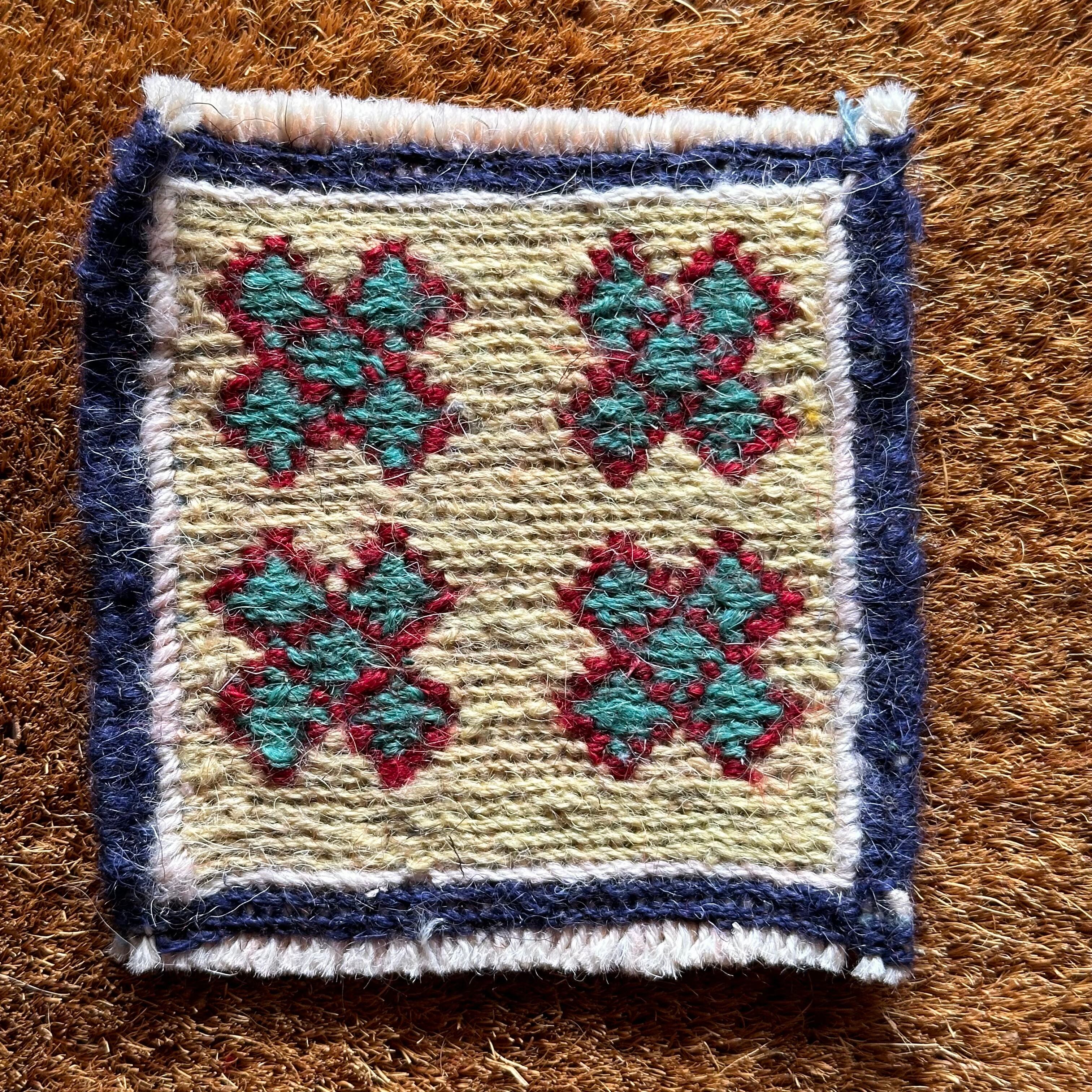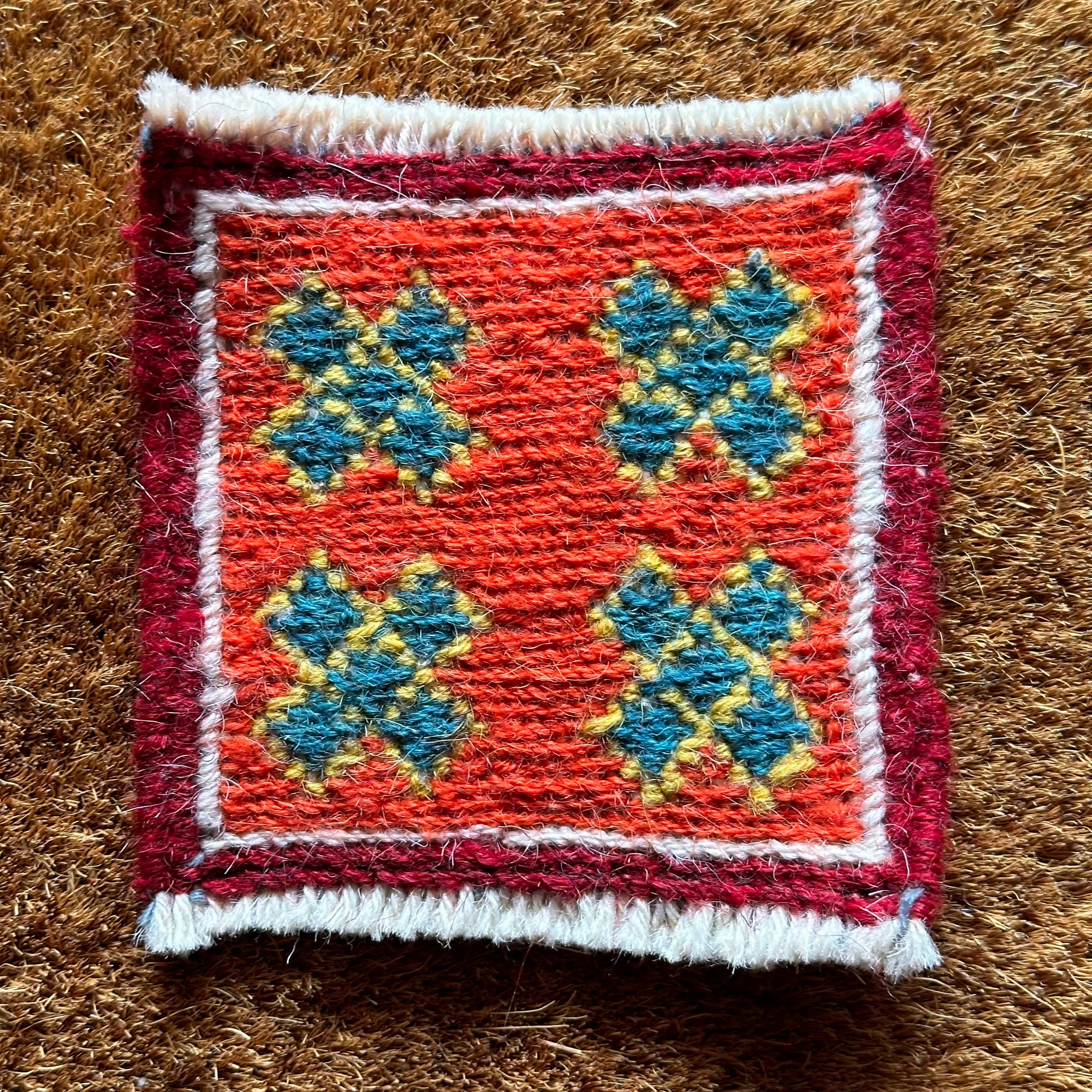 イラン北西部はアゼルバイジャン地方にあるアルダビールの村周辺で手織りされたスマック織りヴァルニキリムの新品コースターになります。