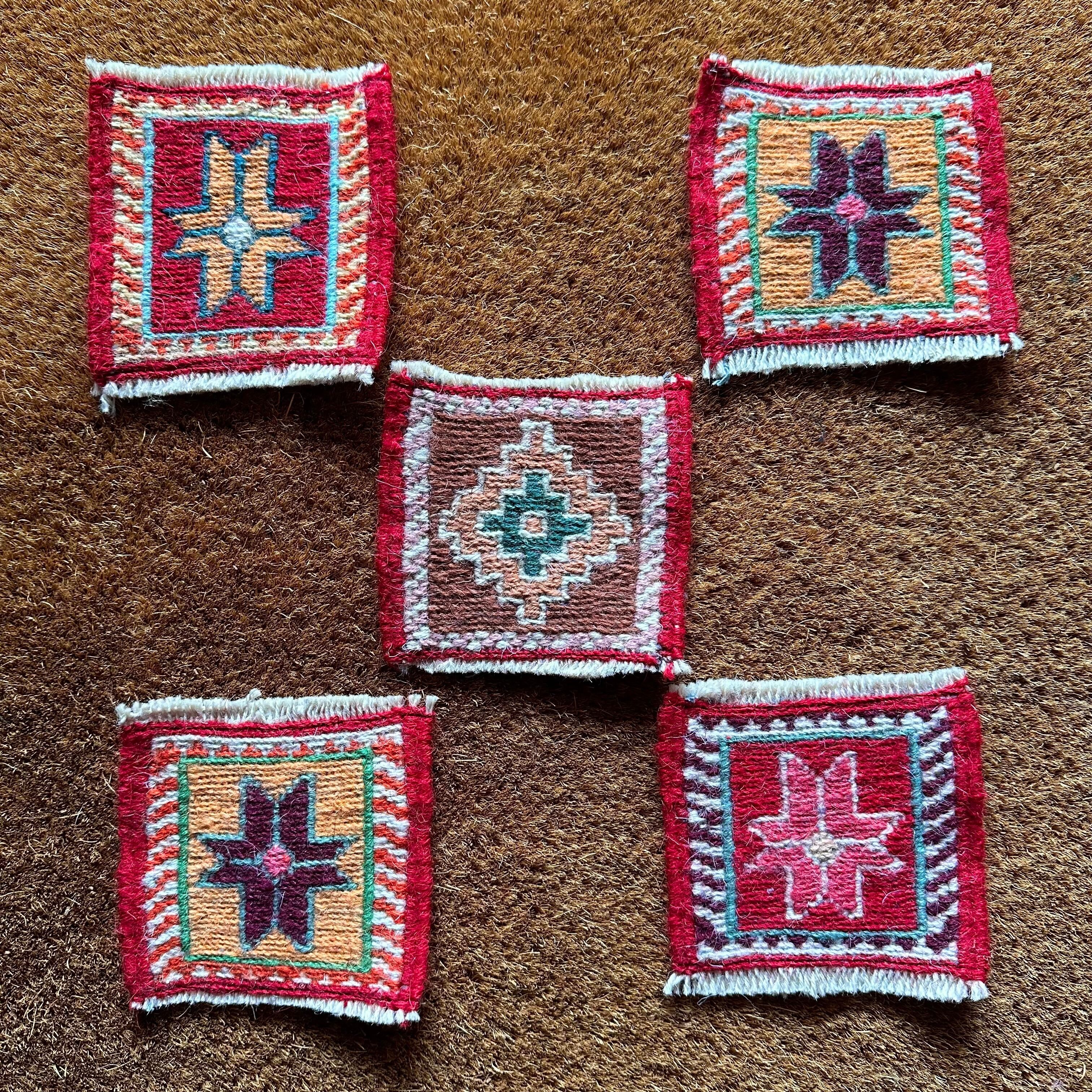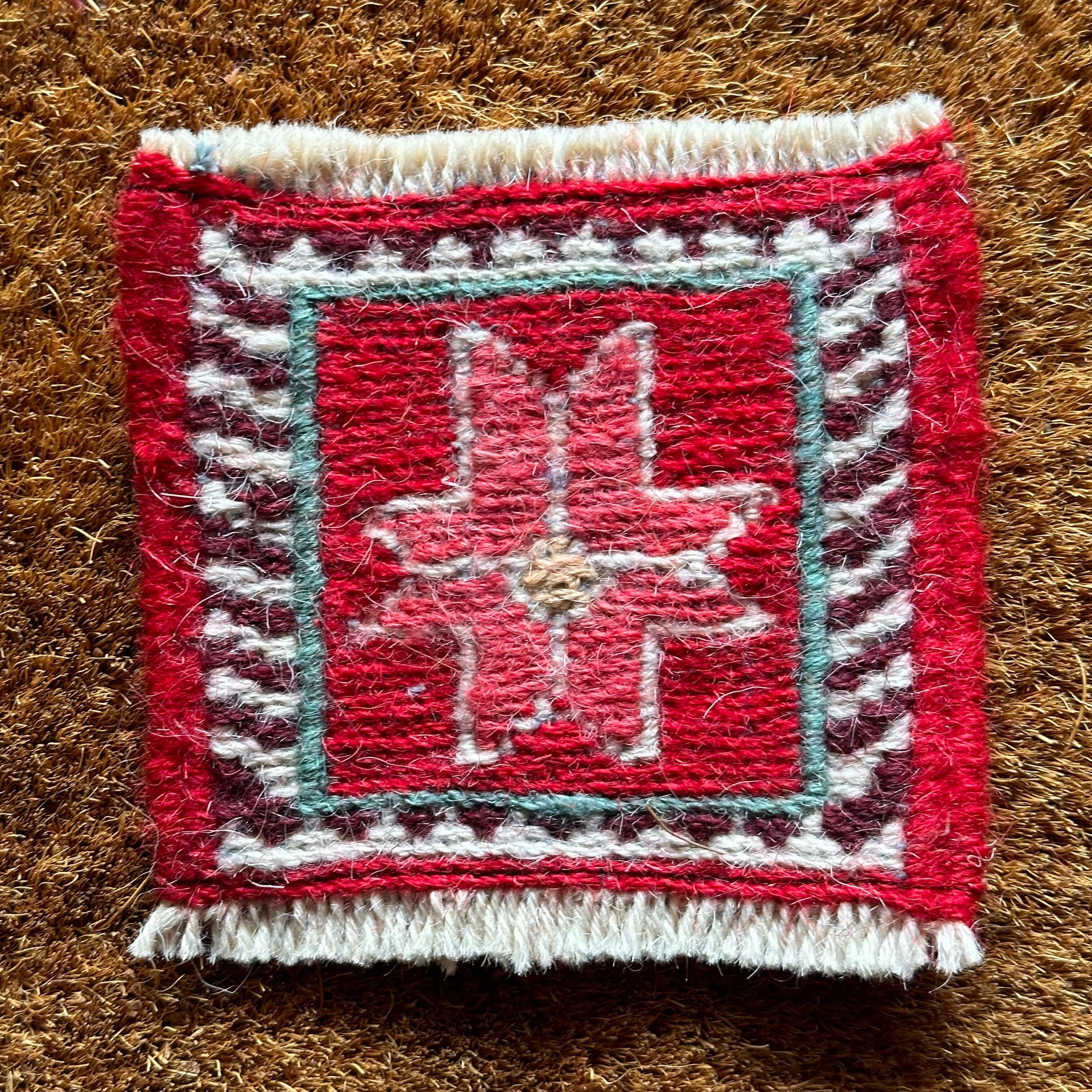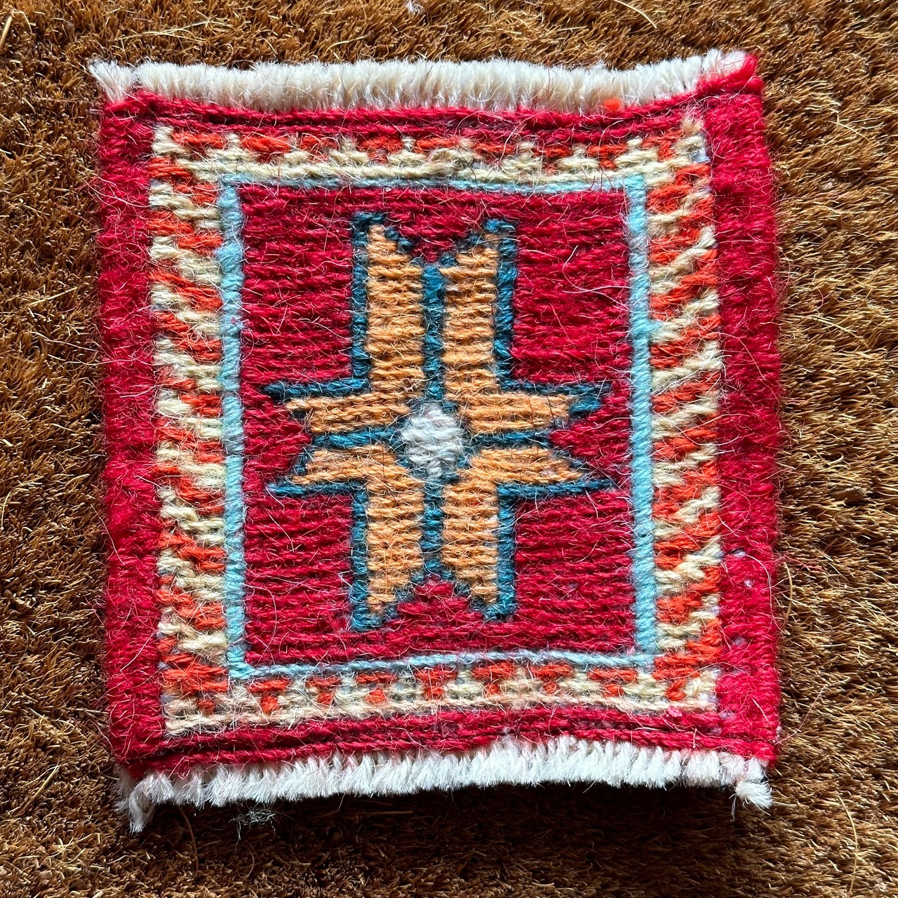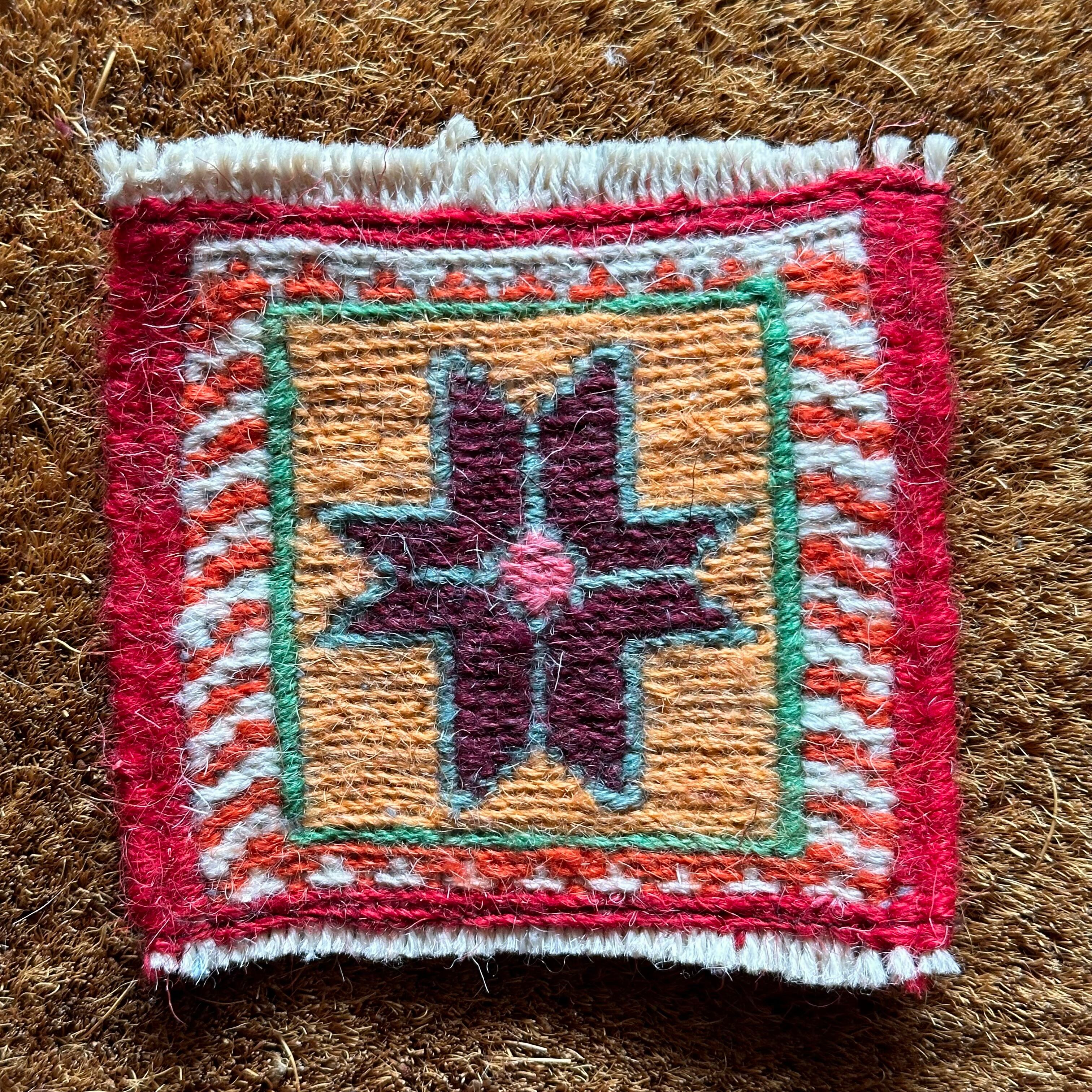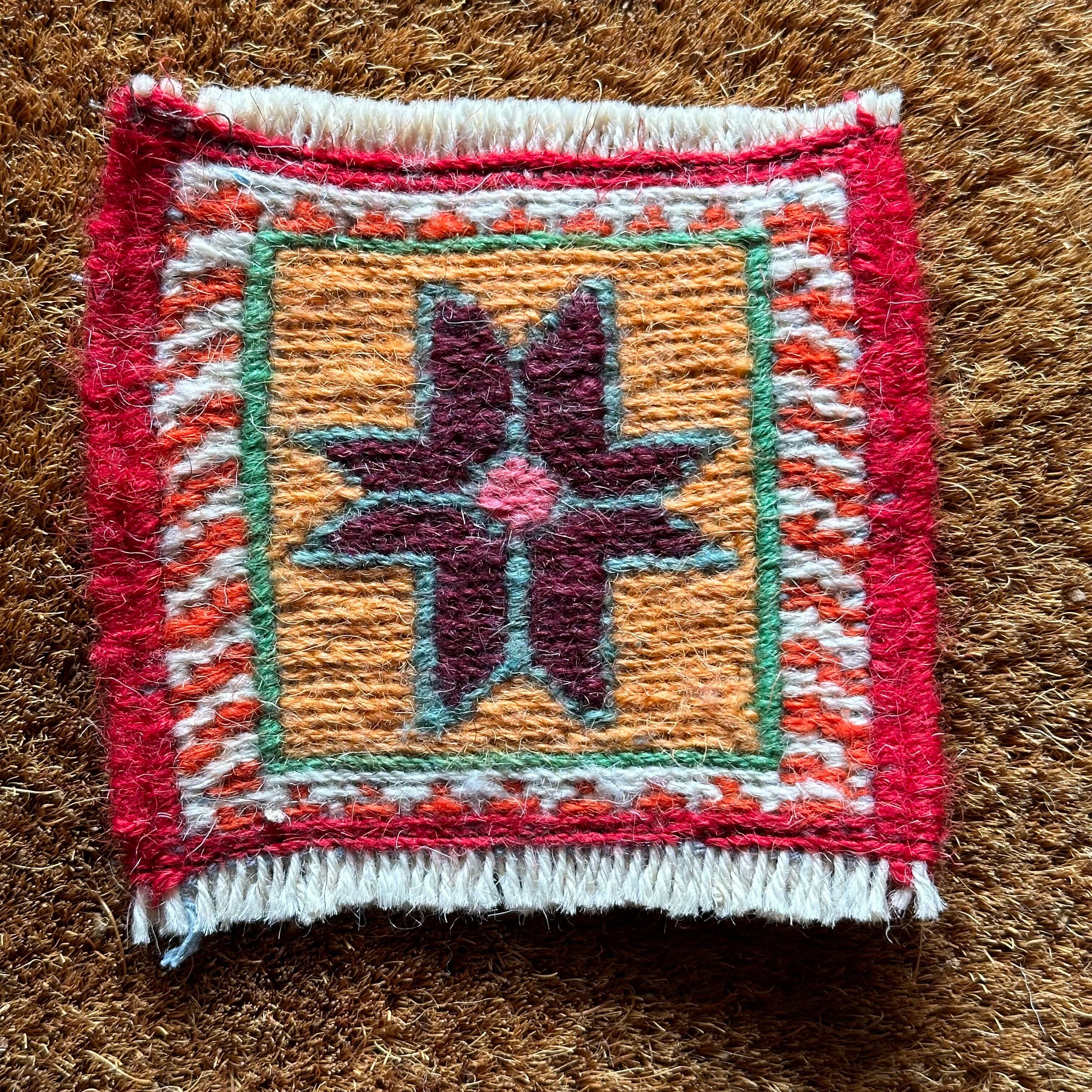 イラン北西部はアゼルバイジャン地方にあるアルダビールの村周辺で手織りされたスマック織りヴァルニキリムの新品コースターになります。