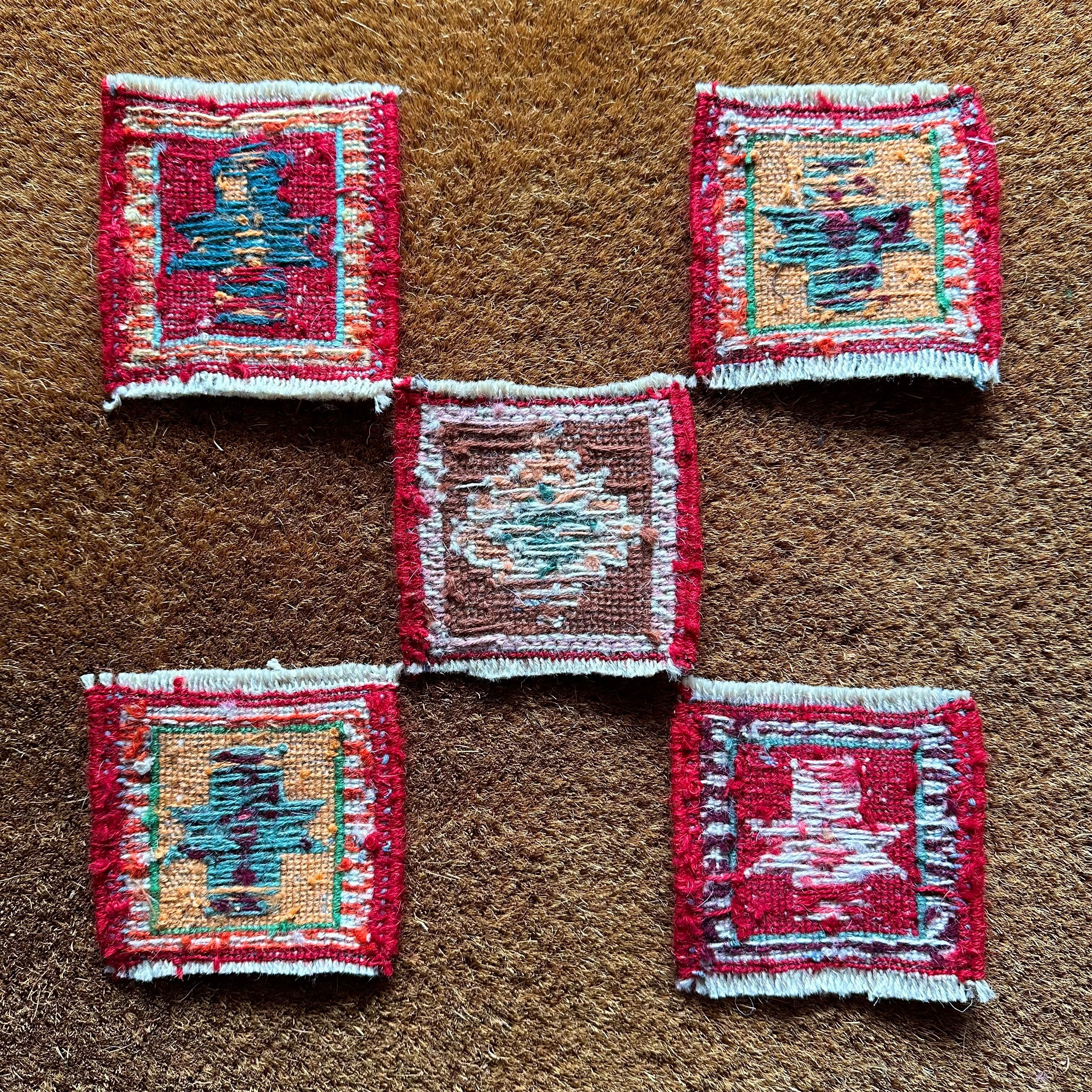 こちらはモチーフ柄が描かれた5枚セットになり、製作段階では20枚綴りの帯状ですが、イラン現地にてカットとフリンジのほどけ防止のかがり縫いを施してあり、本来のスマック織りならではの裏面のムダ毛もカットしています。