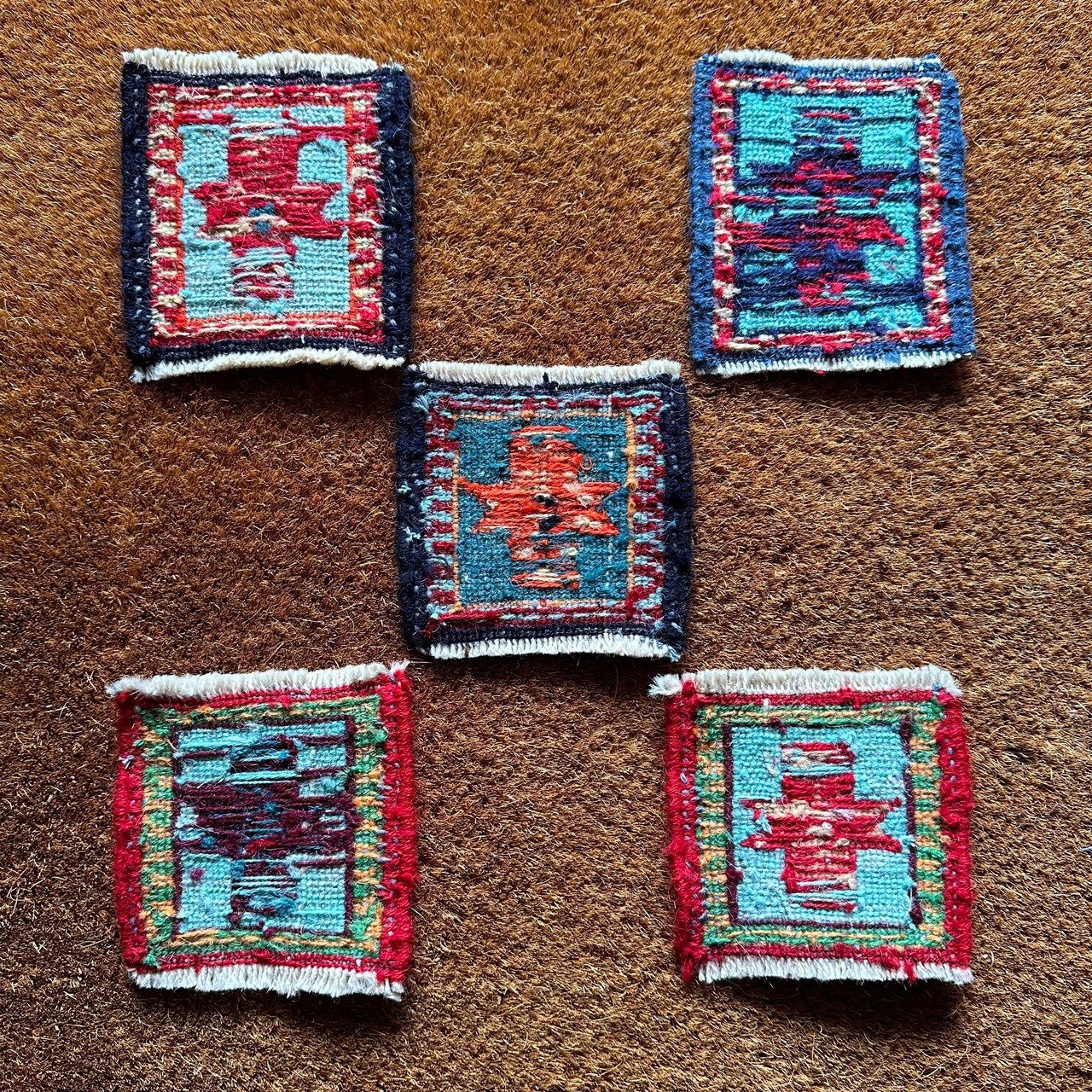こちらはモチーフ柄が描かれた5枚セットになり、製作段階では20枚綴りの帯状ですが、イラン現地にてカットとフリンジのほどけ防止のかがり縫いを施してあり、本来のスマック織りならではの裏面のムダ毛もカットしています。