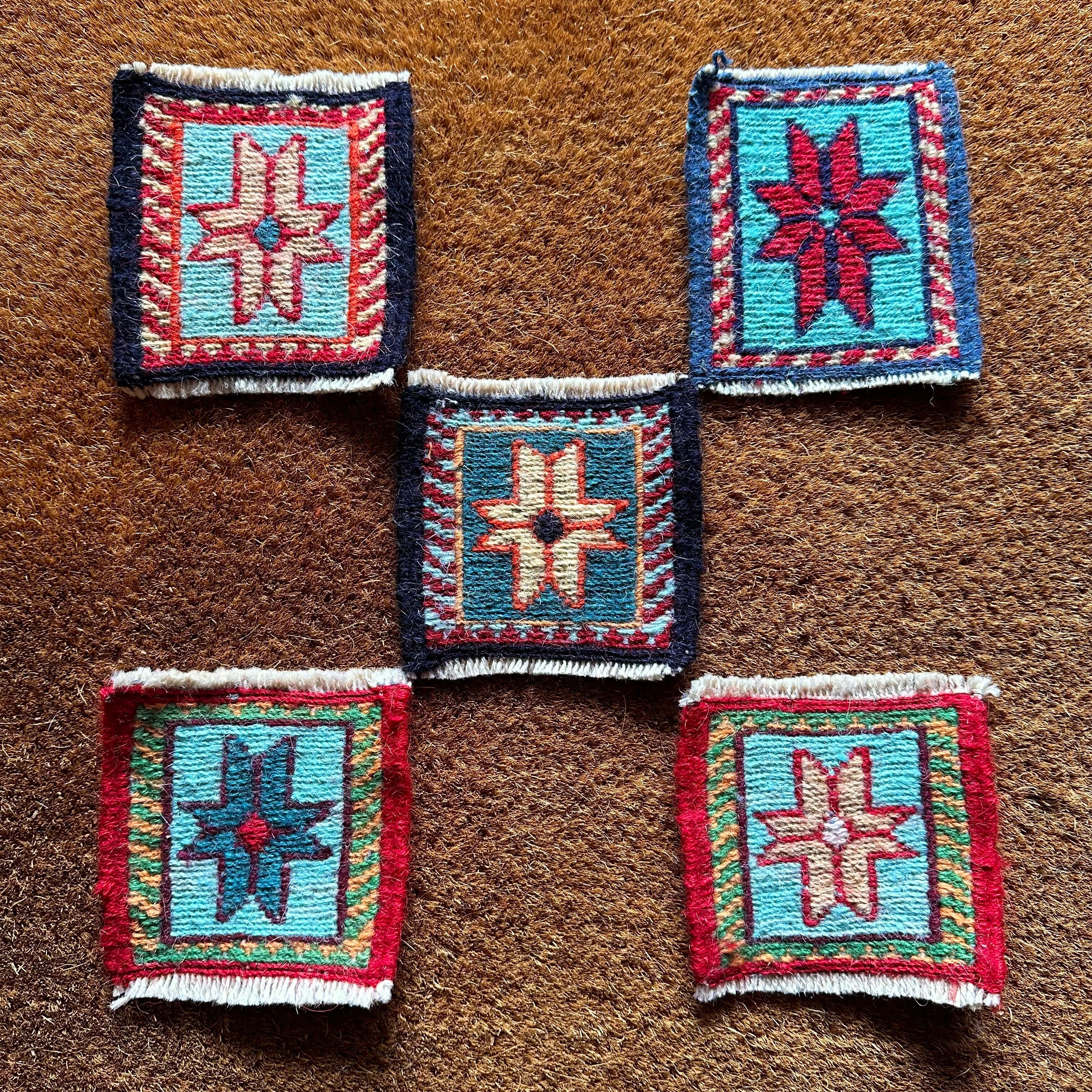 コースターとしてのご使用はもちろん、額装したりパッチワークにしたりと使い勝手のよいアイテムになり、大きさ的にはフリンジを含めて約10〜11cmほどになりますが、それよりも小さな個体差がありますのでセット内容の写真にてご判断ください。