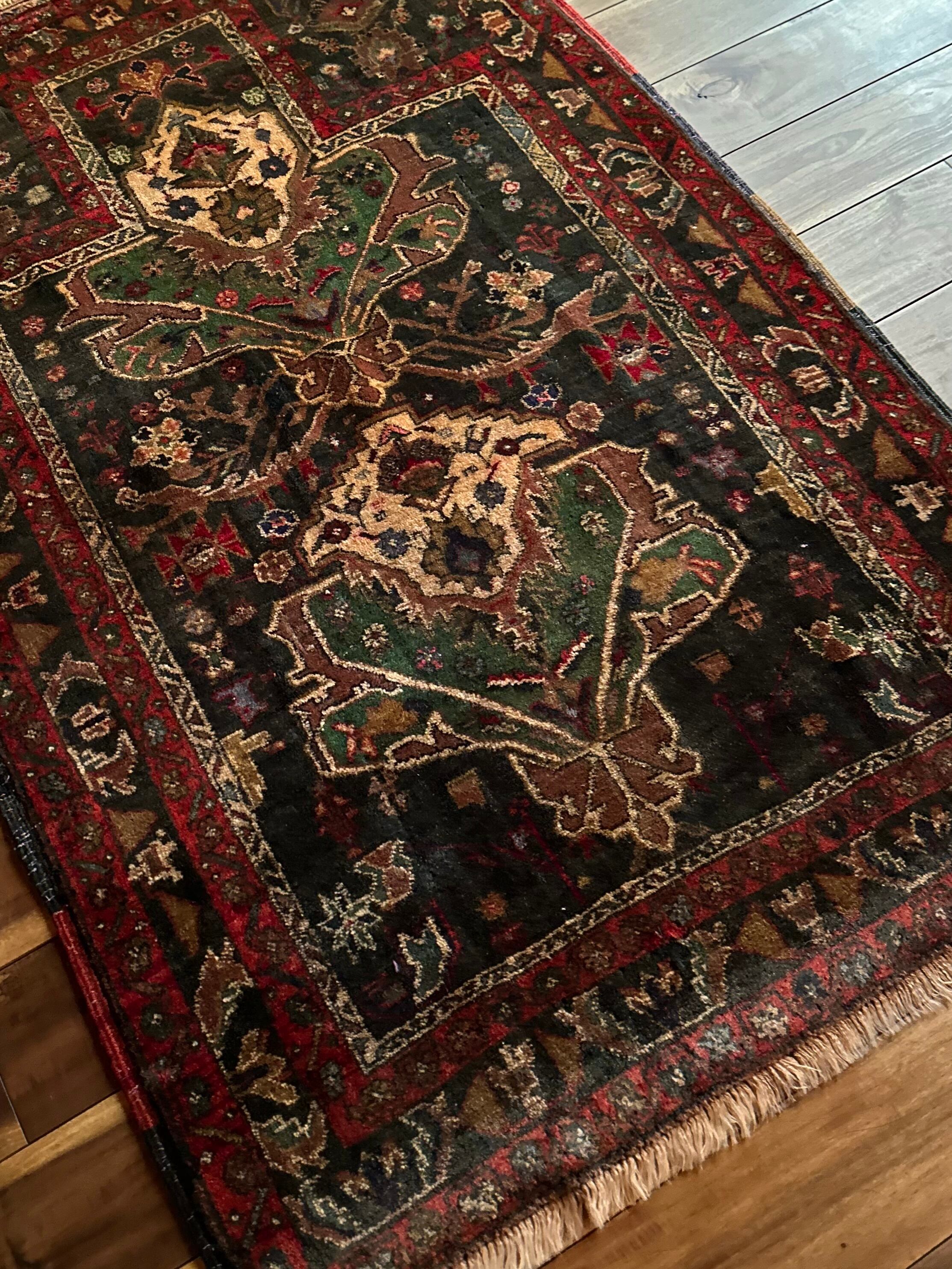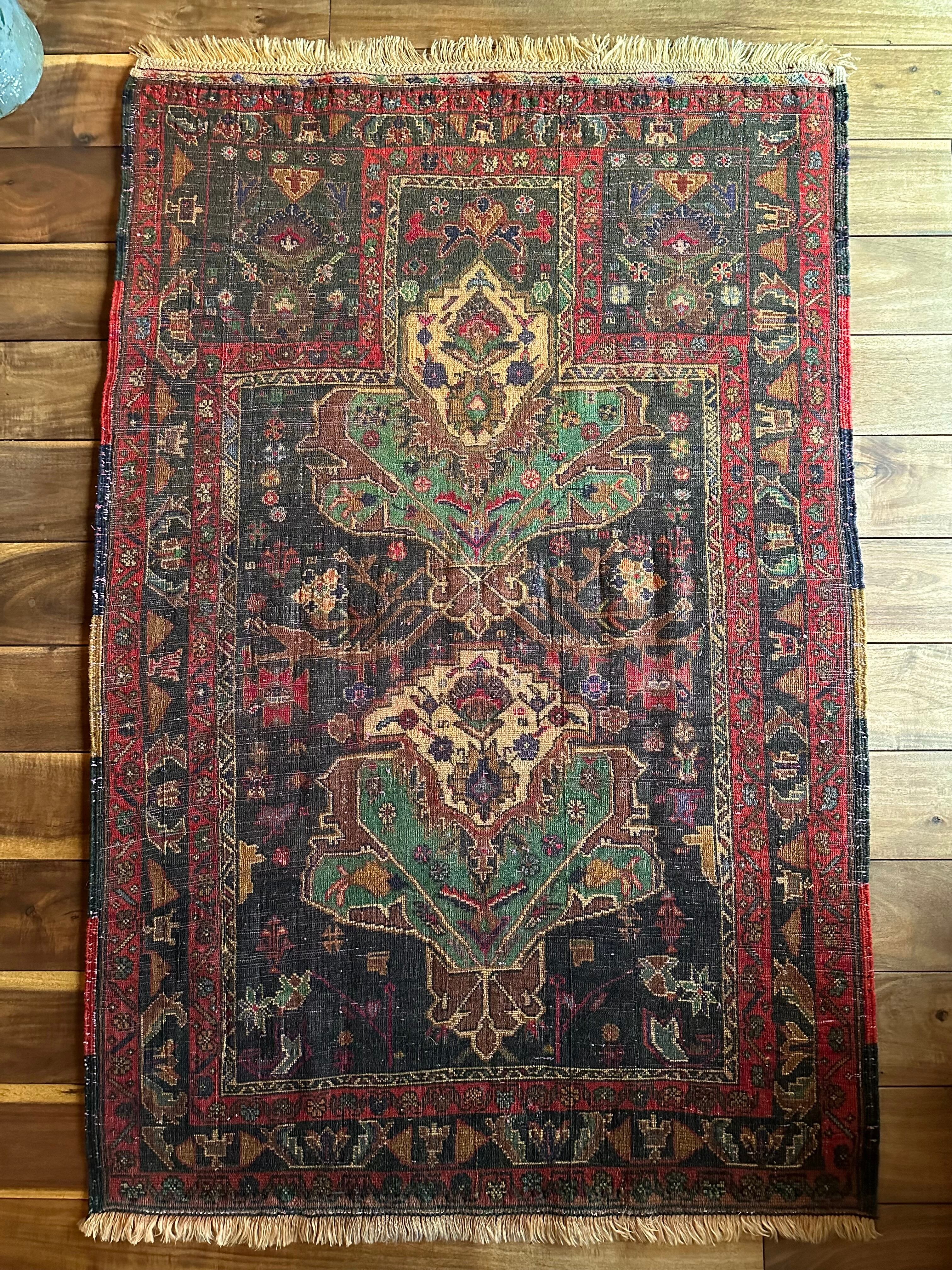 なんとも異彩を放つ見た目のインパクトが強烈的な祈祷用のプレイヤーラグで、どす黒く描かれた人間の煩悩をフィールドの赤で縁取ったかのような印象のバルーチ族のプリミティブなトライバルラグになります。