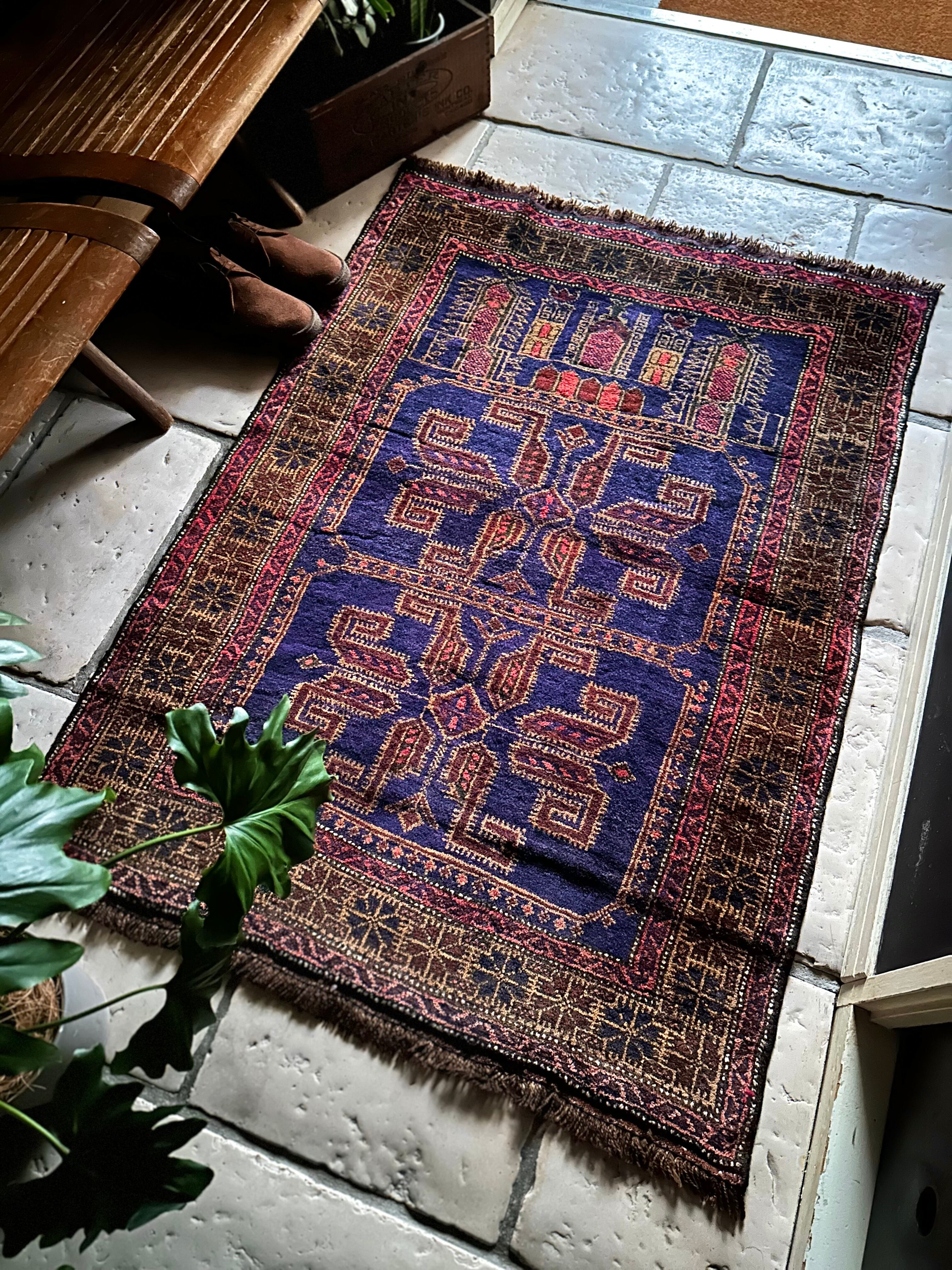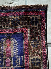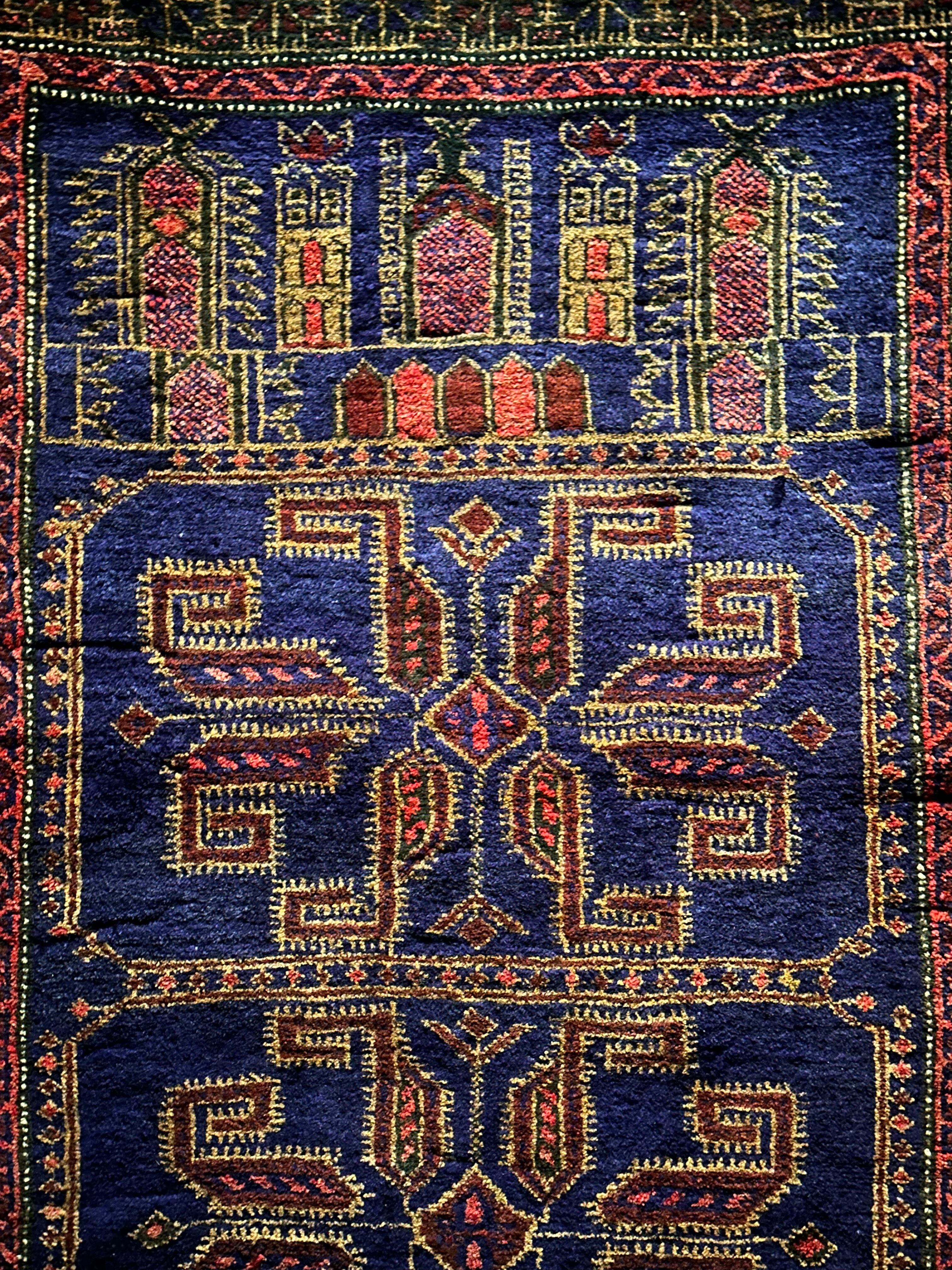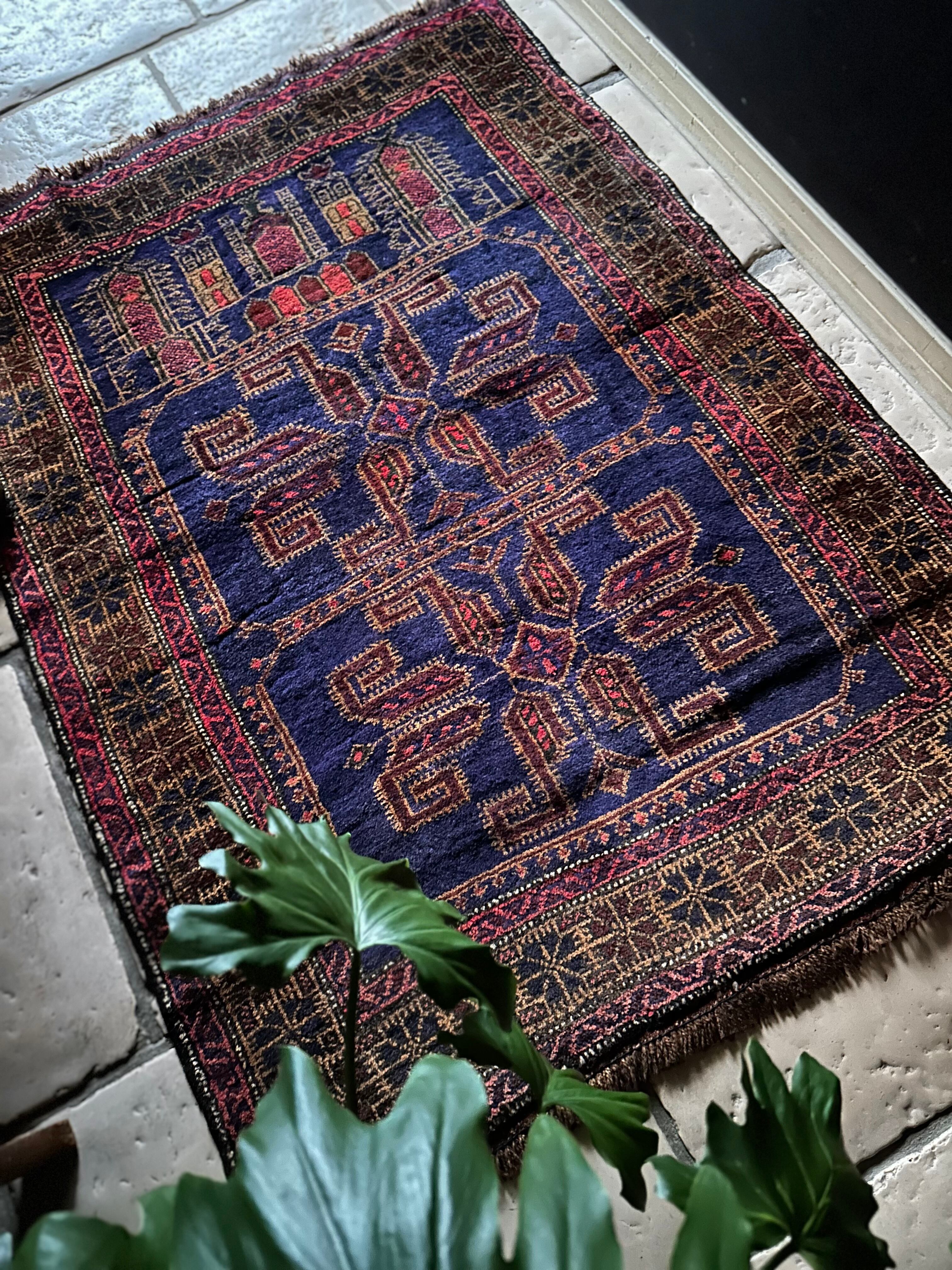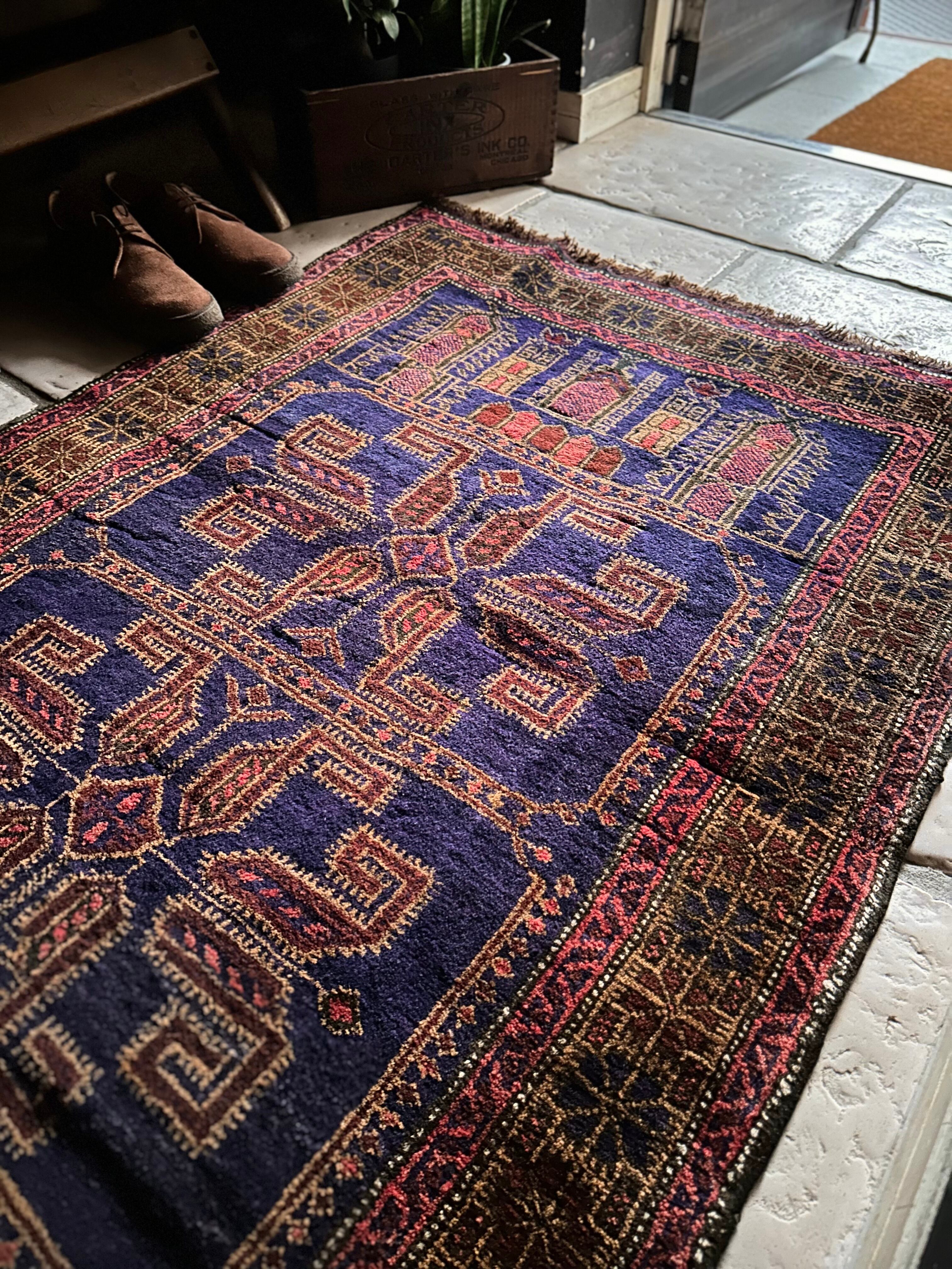 ネイビーブルーのフィールドが色鮮やかに映える祈祷用のプレイヤーラグで、上部にあるモスクのような絵柄に対して、四方へと伸びる抽象的なデザインが斬新なバルーチ族のトライバルラグになります。