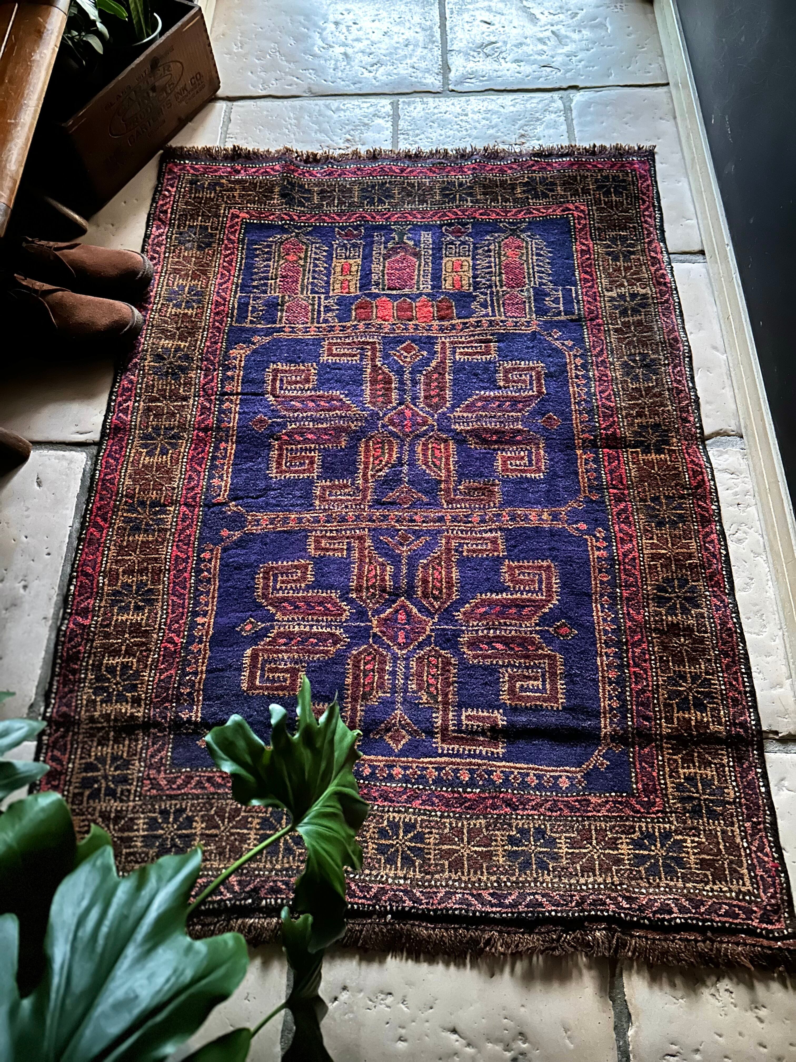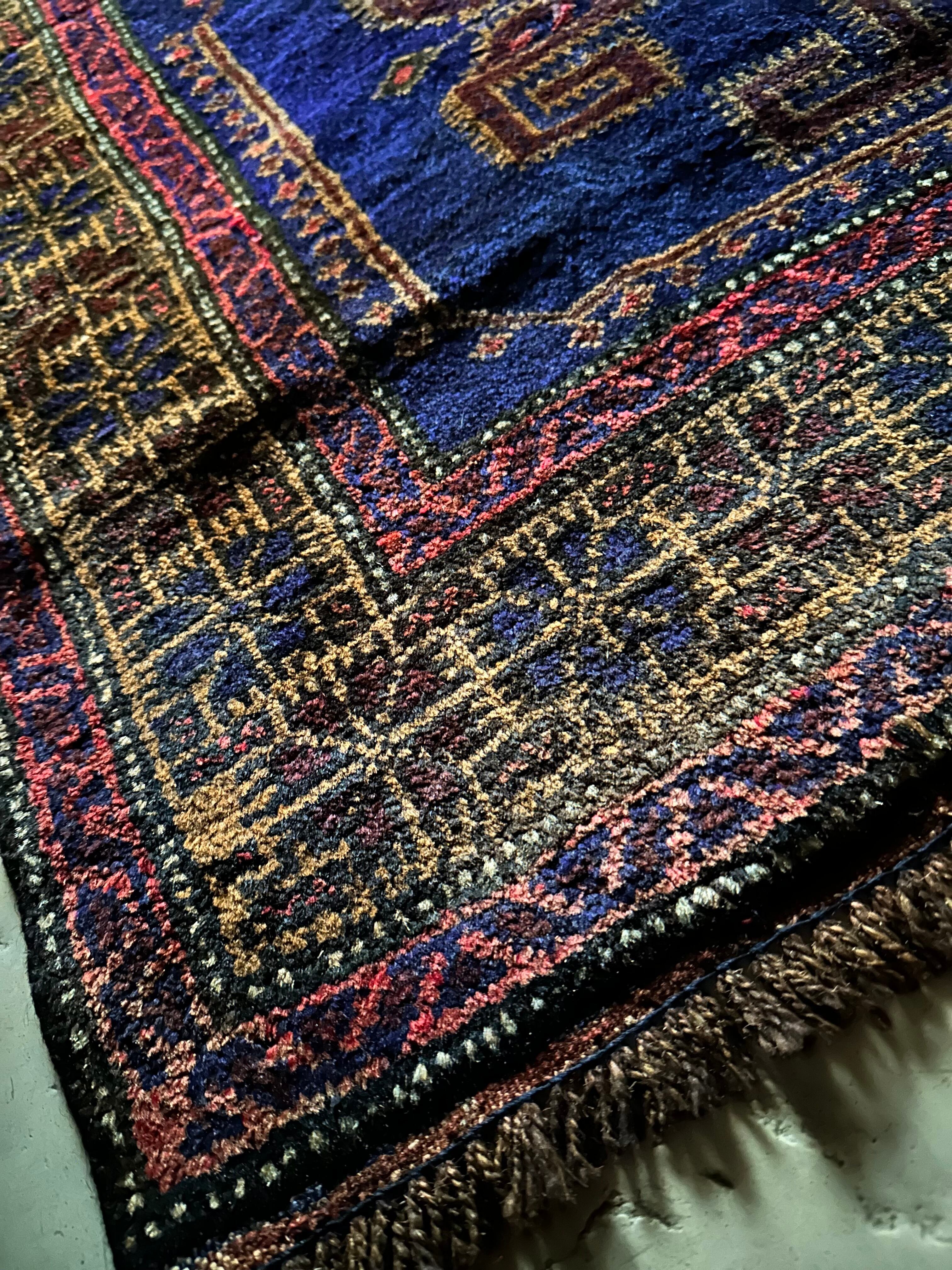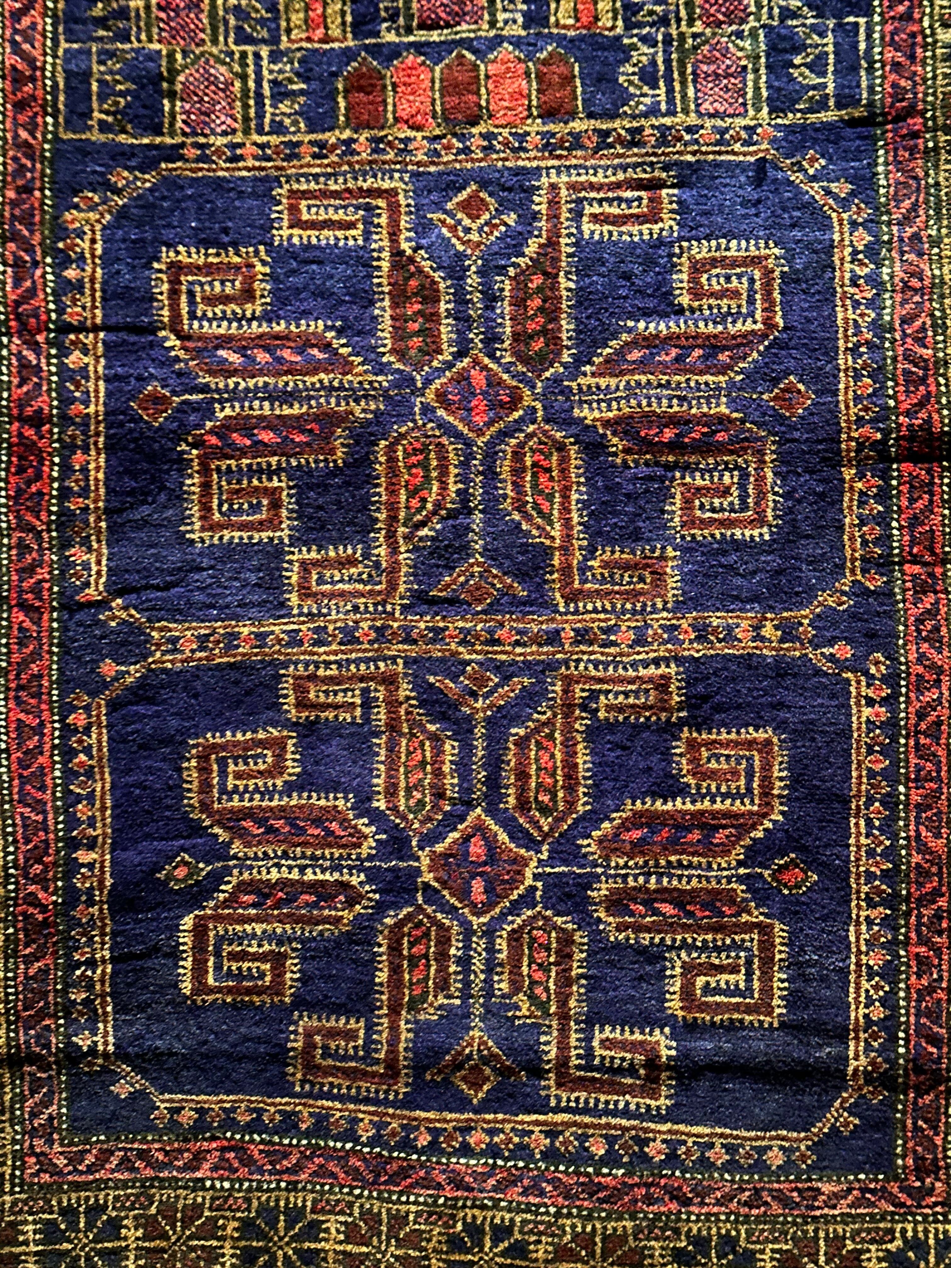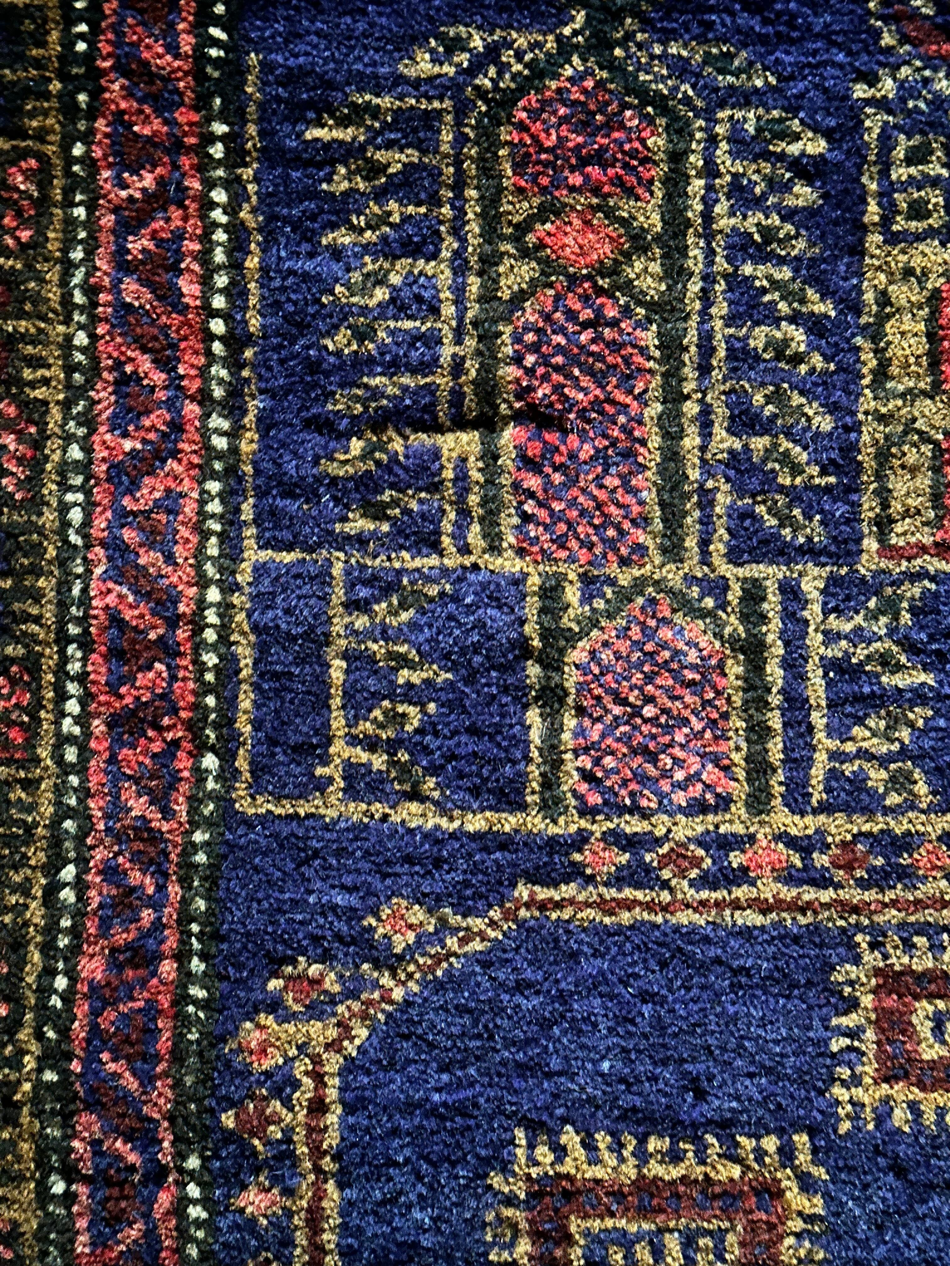 ネイビーブルーのフィールドが色鮮やかに映える祈祷用のプレイヤーラグで、上部にあるモスクのような絵柄に対して、四方へと伸びる抽象的なデザインが斬新なバルーチ族のトライバルラグになります。