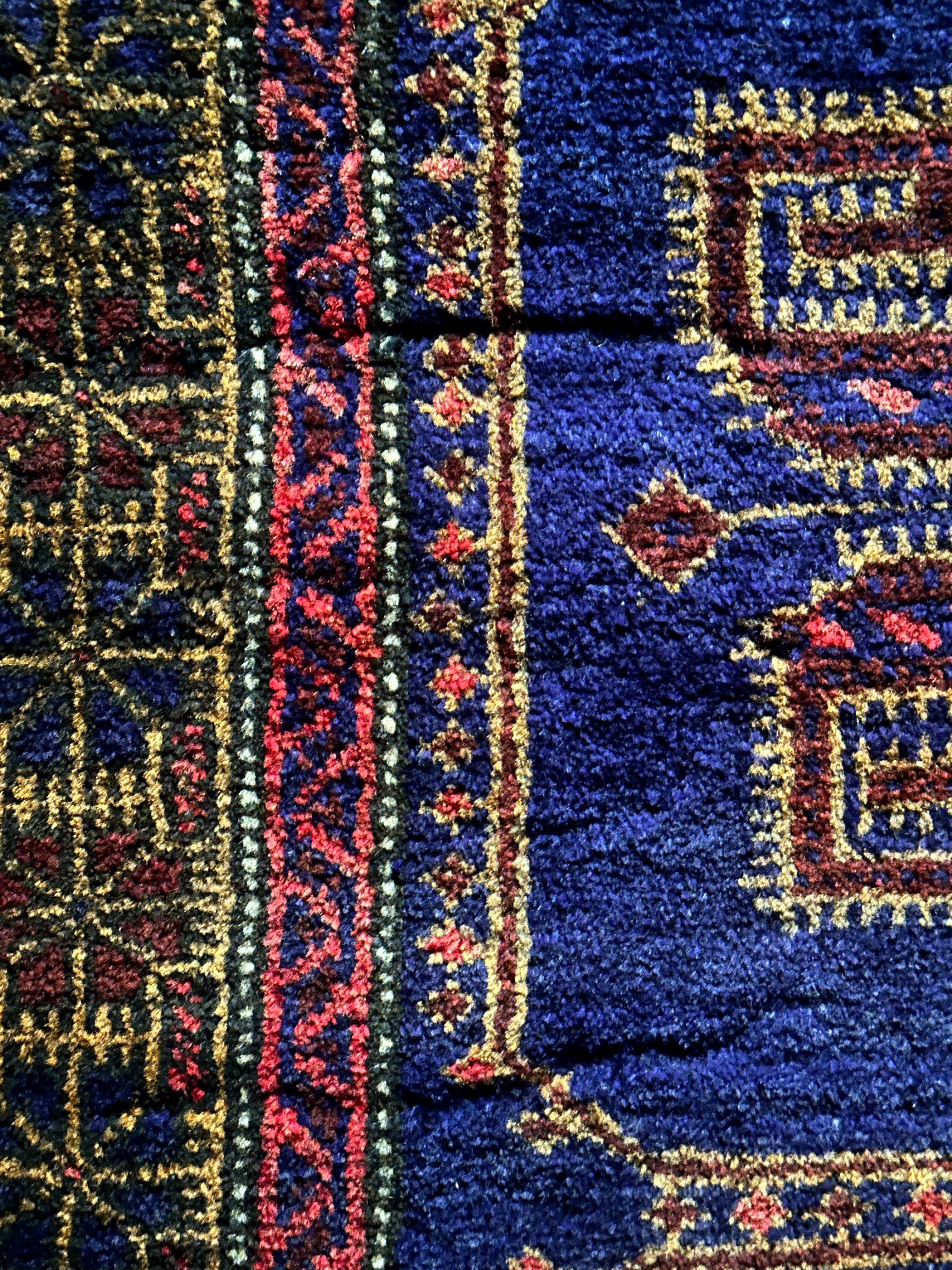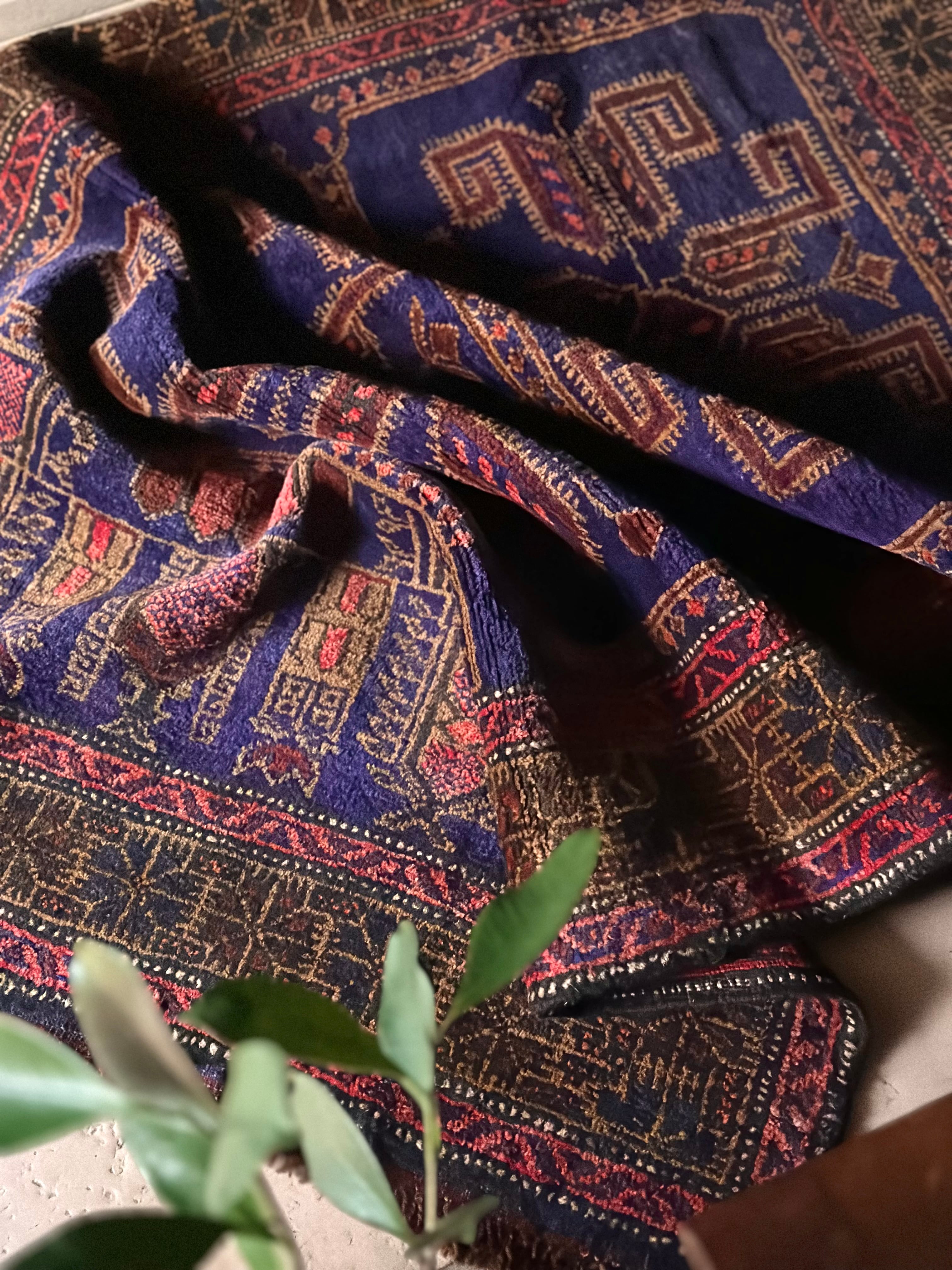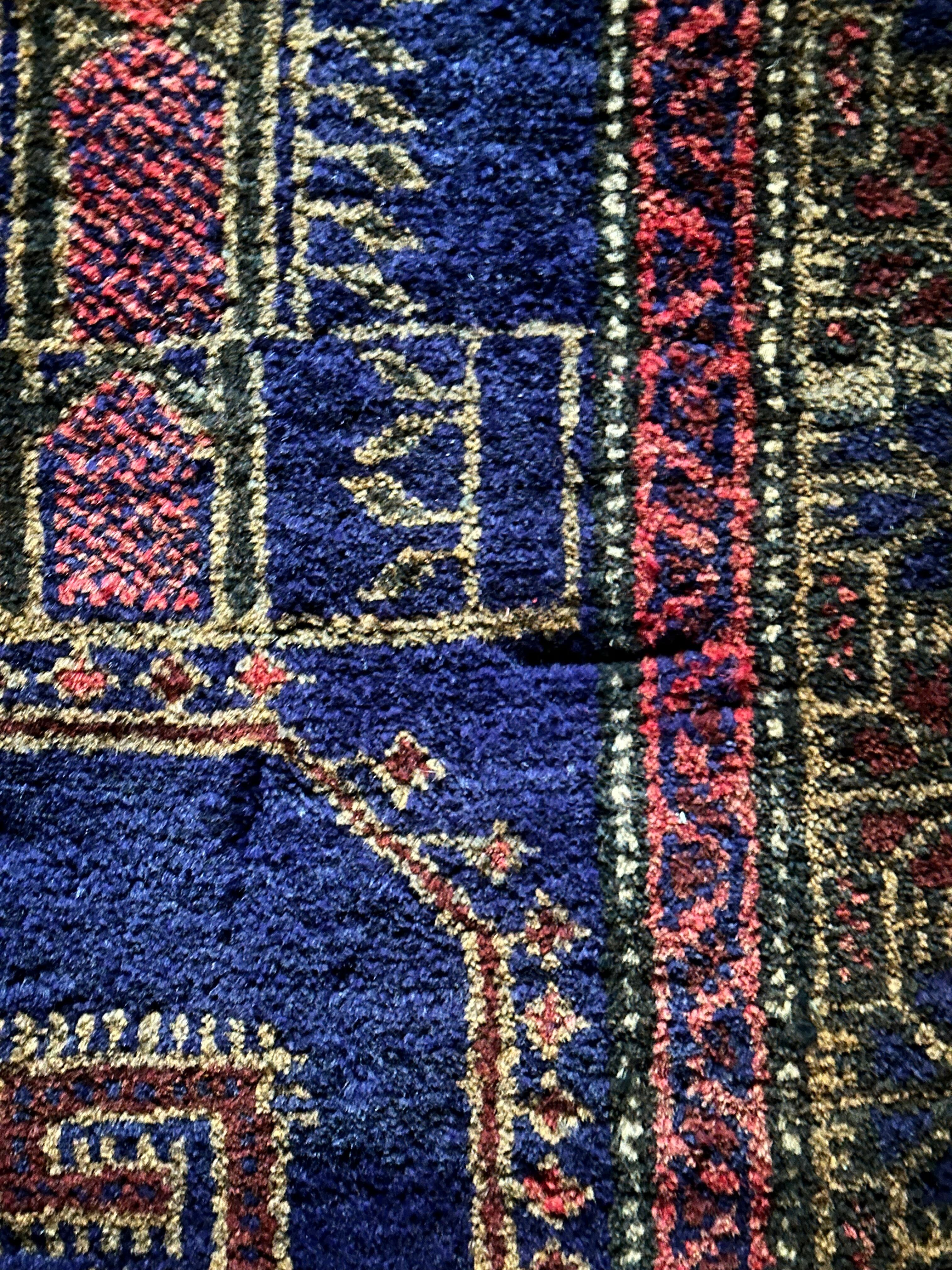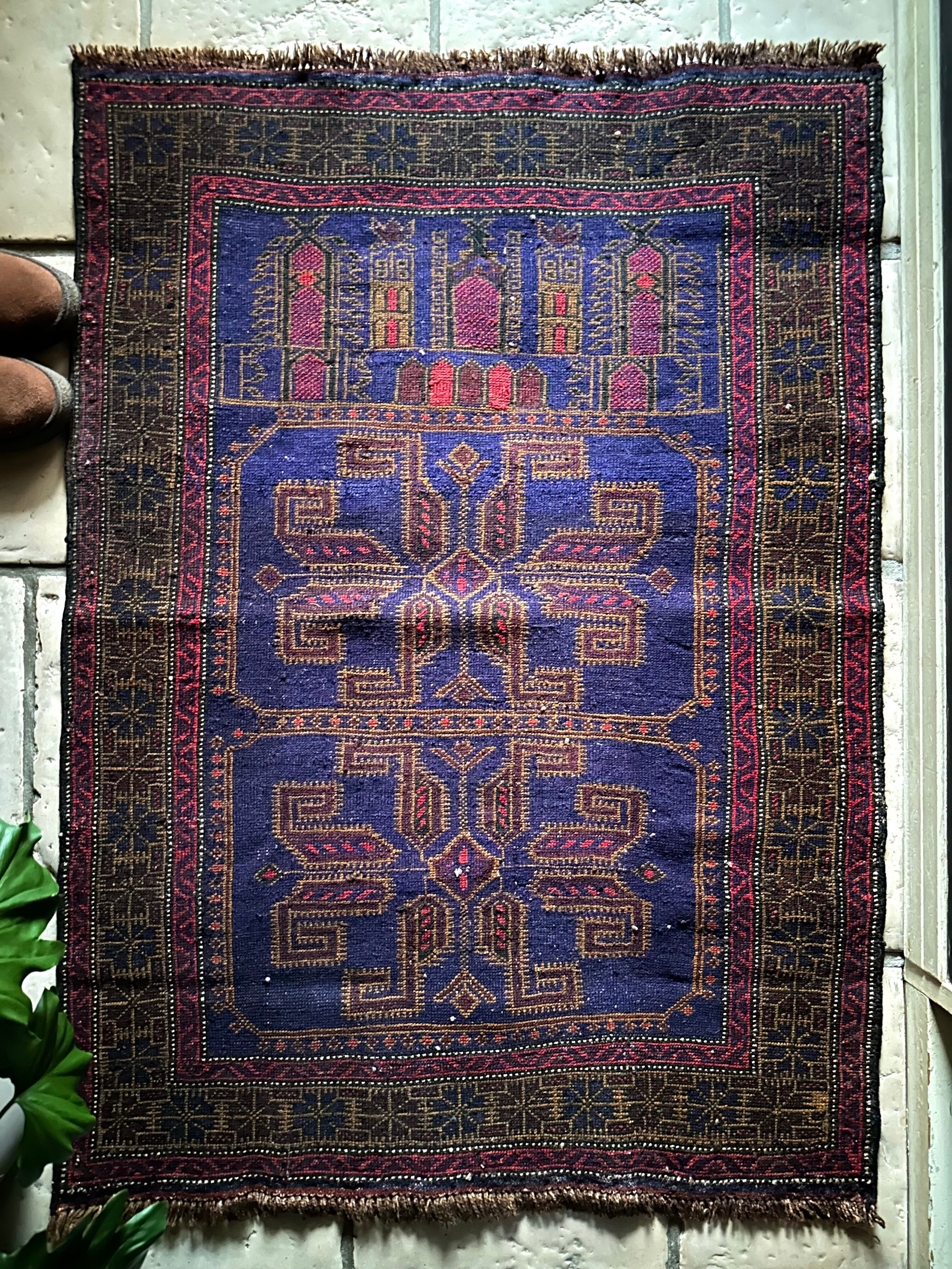 ネイビーブルーのフィールドが色鮮やかに映える祈祷用のプレイヤーラグで、上部にあるモスクのような絵柄に対して、四方へと伸びる抽象的なデザインが斬新なバルーチ族のトライバルラグになります。