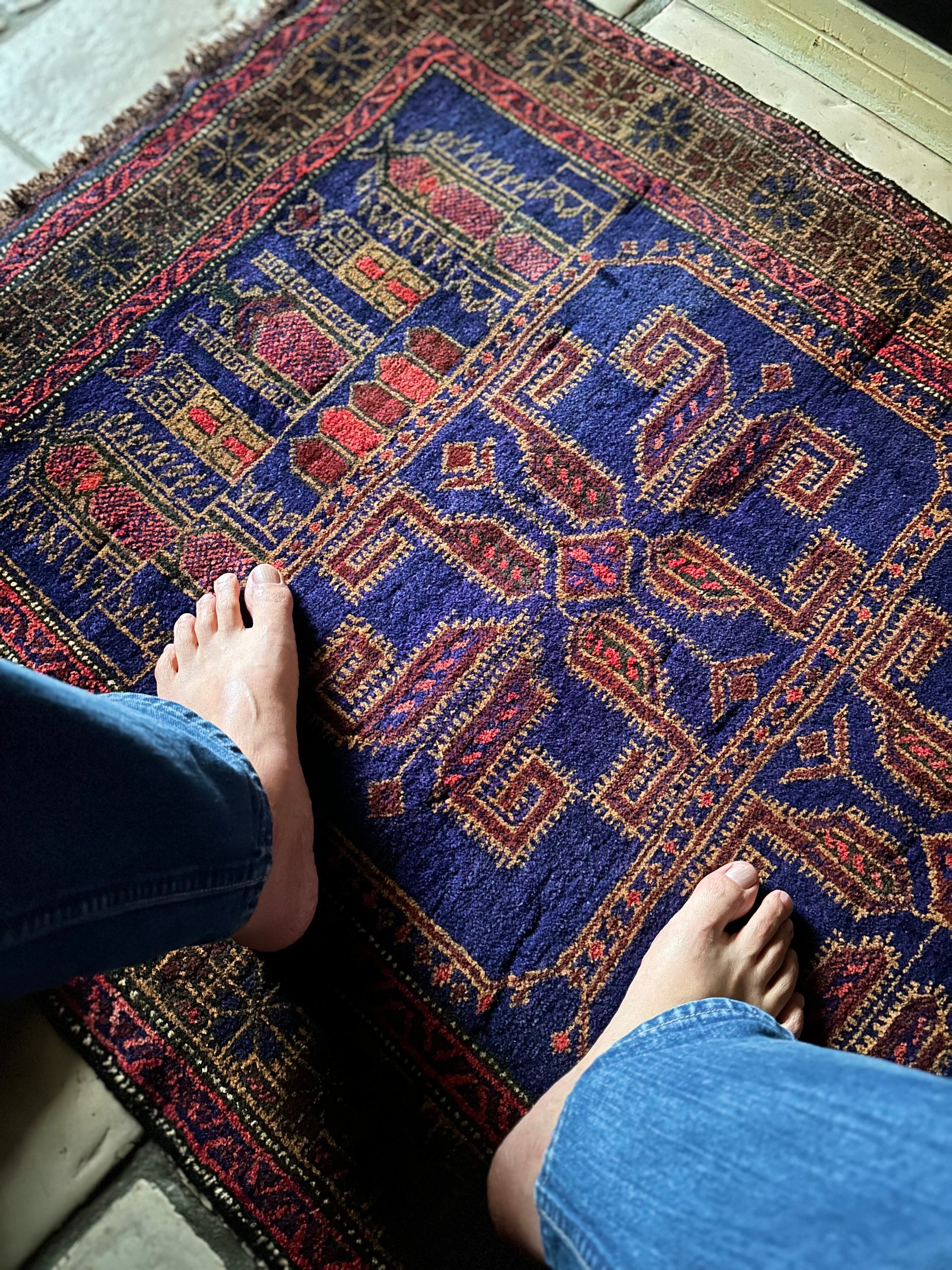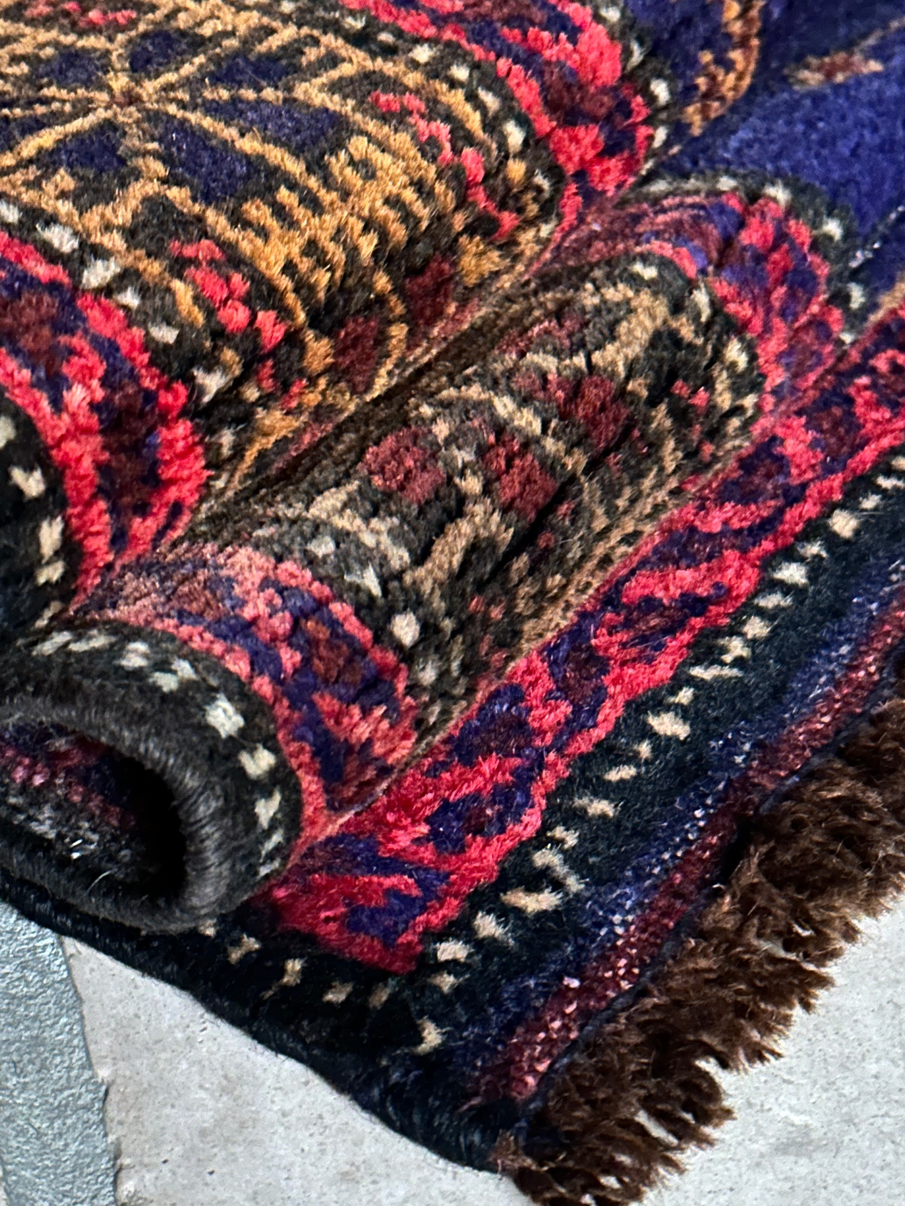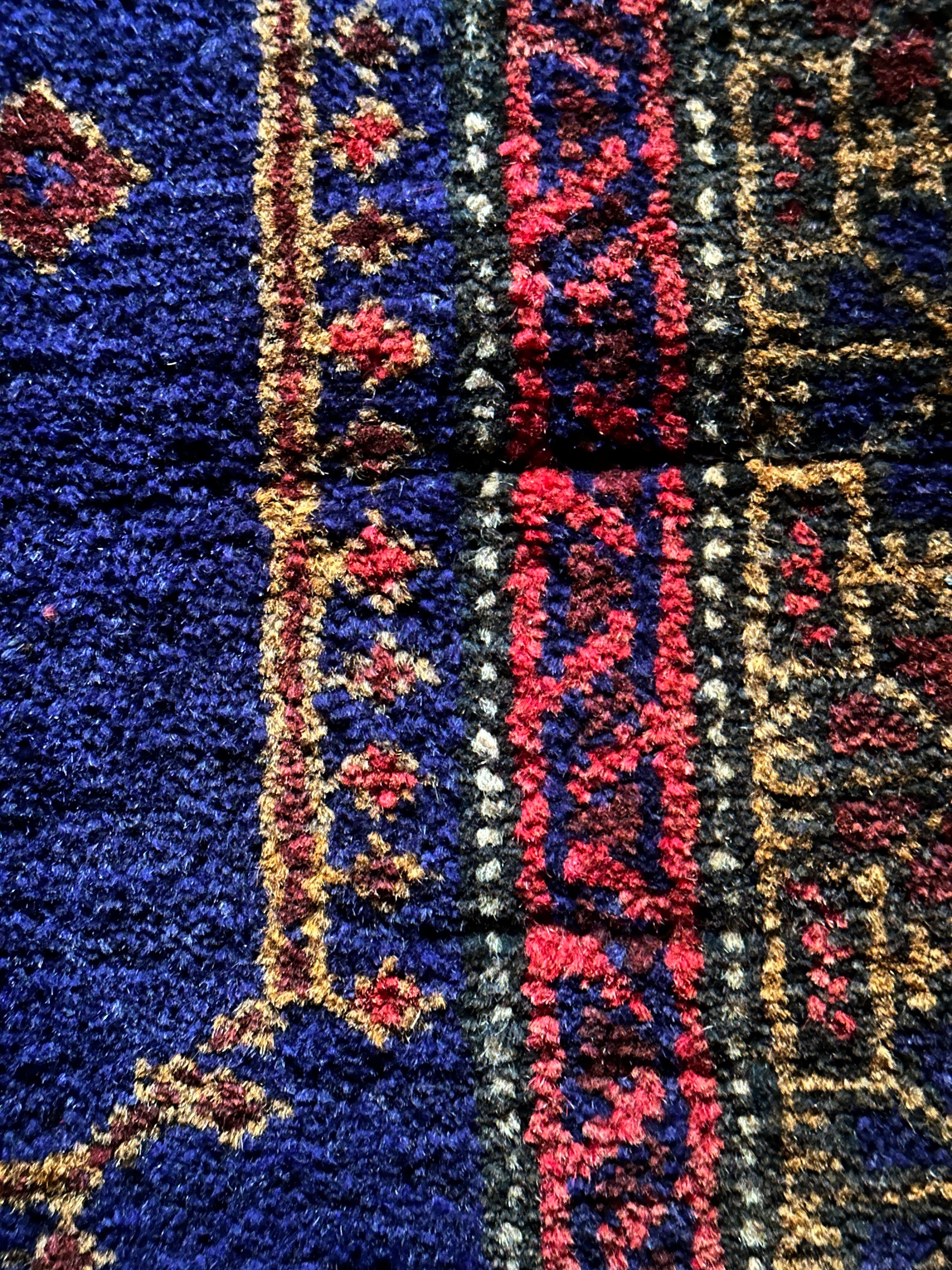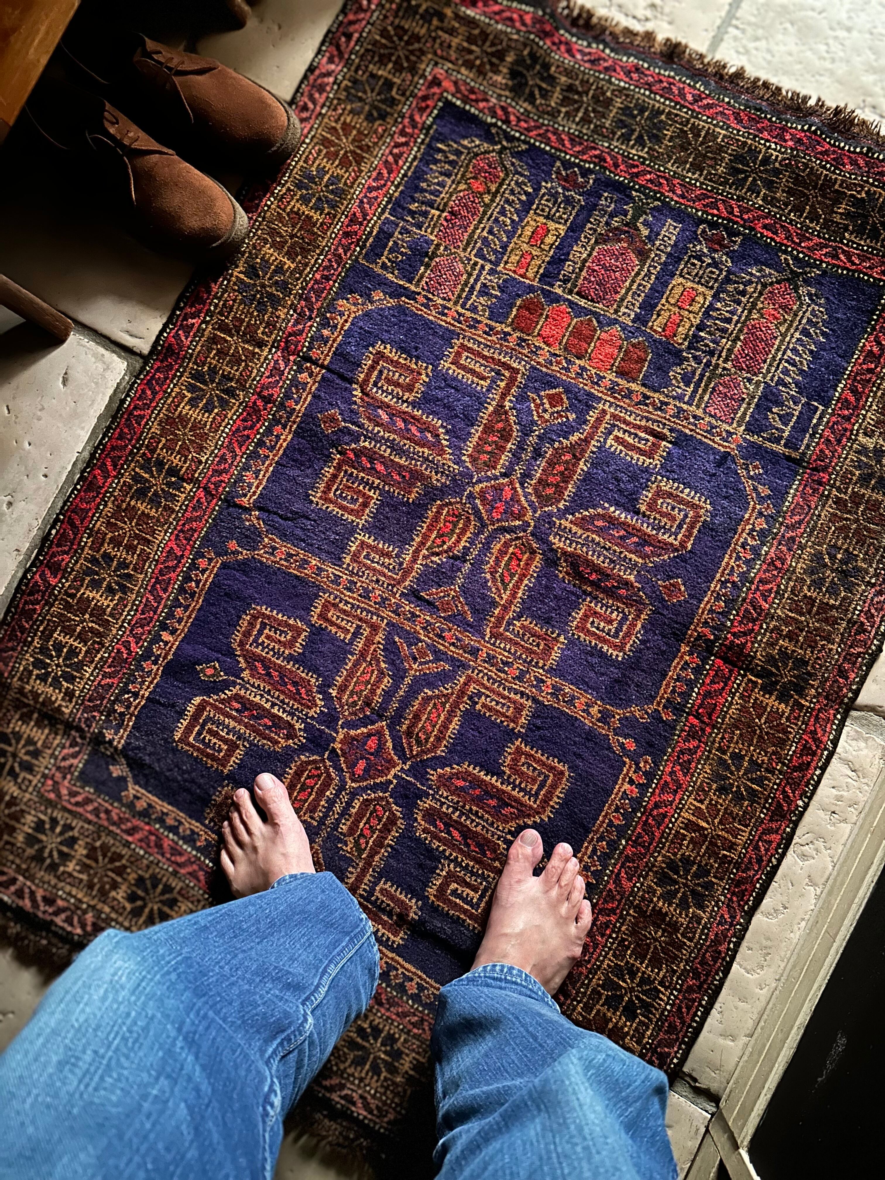 ネイビーブルーのフィールドが色鮮やかに映える祈祷用のプレイヤーラグで、上部にあるモスクのような絵柄に対して、四方へと伸びる抽象的なデザインが斬新なバルーチ族のトライバルラグになります。