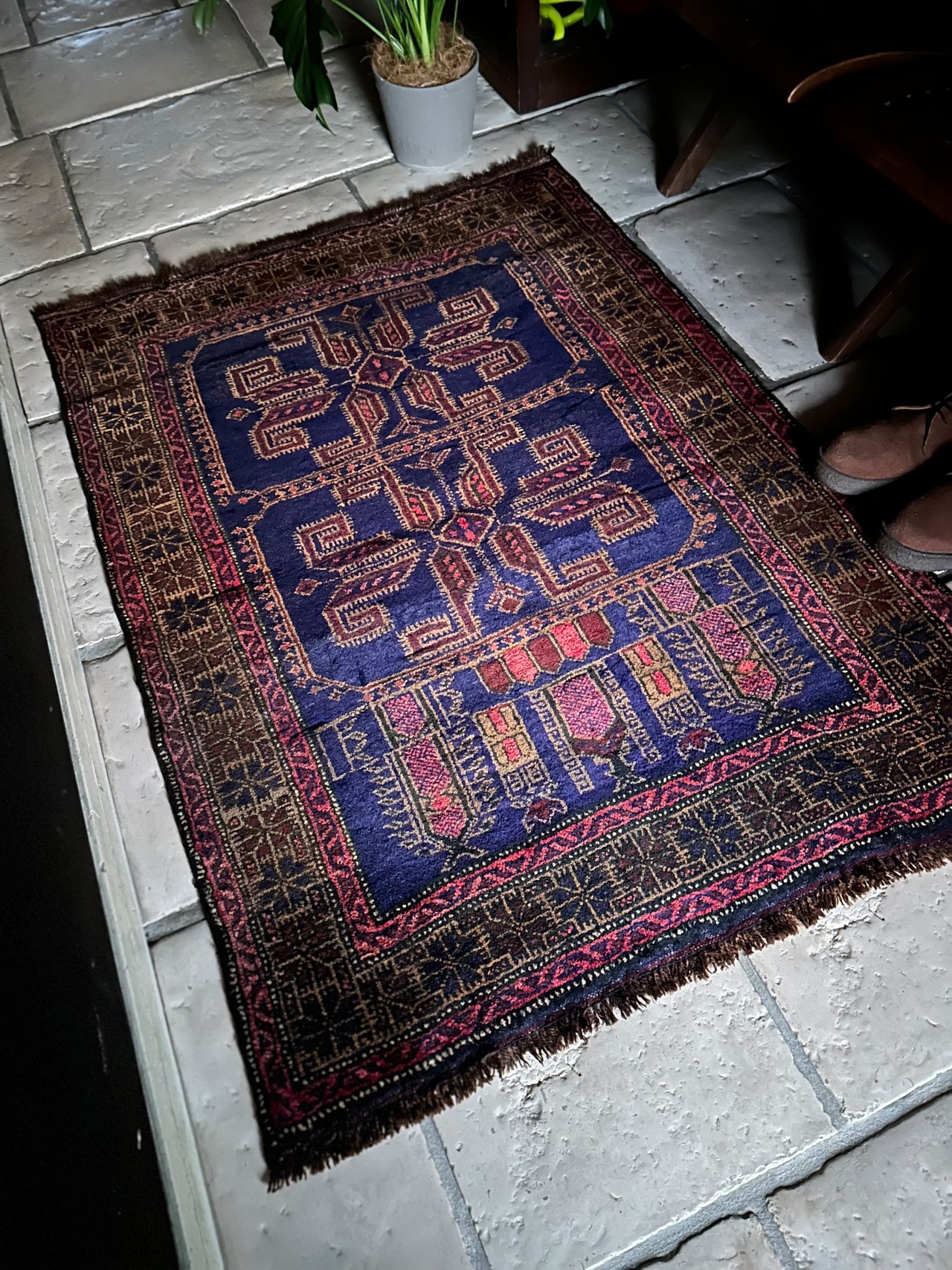 最後にラグそのものに関しては羊毛特有の匂いがあり、採寸は中央付近で計測していますが、手織りならではの歪みによる誤差や水洗いクリーニングによる縮み、また草木染めによる経年劣化の色ムラなどがありますが、それもまたヴィンテージラグの魅力かとご理解ください。