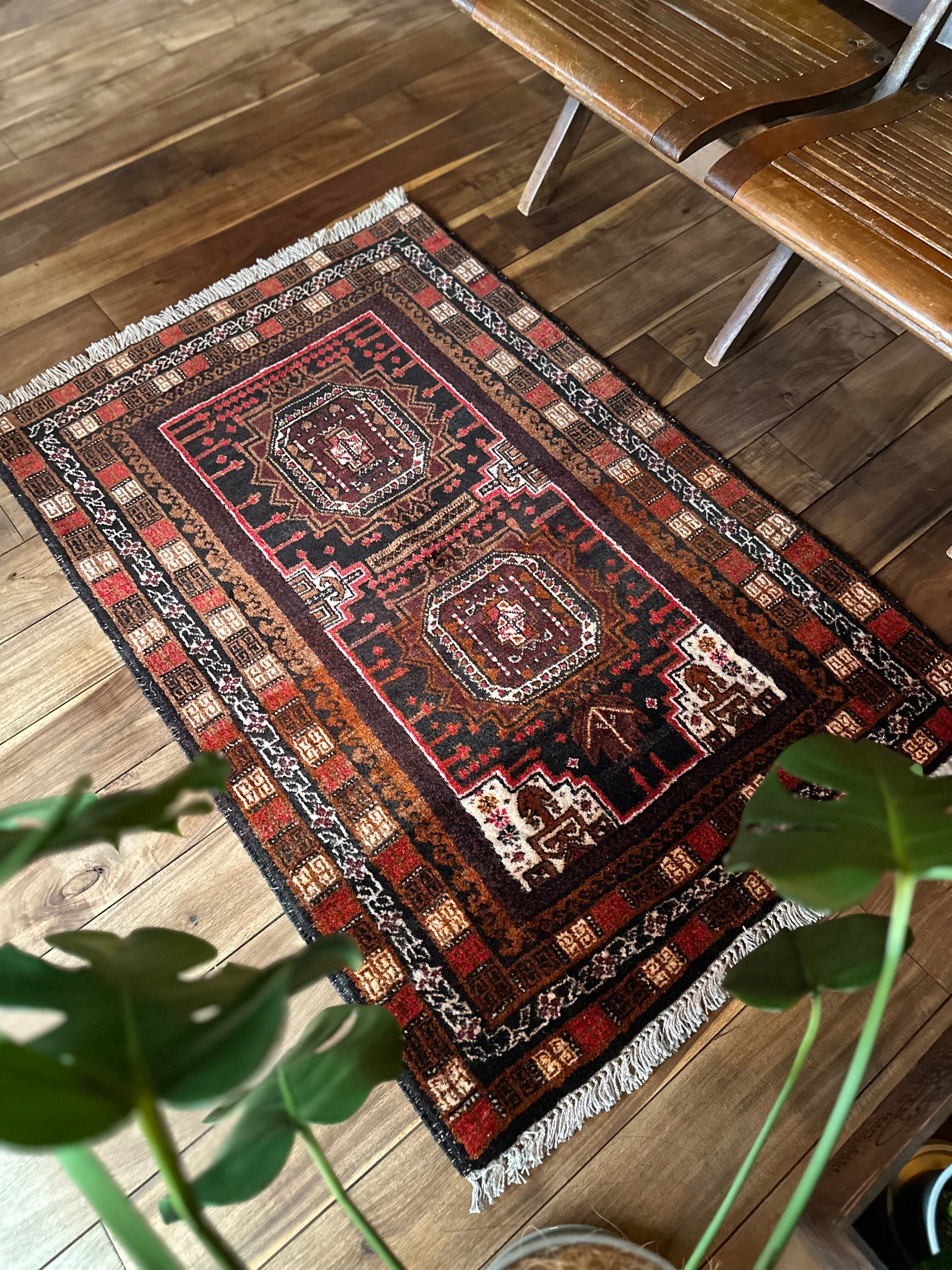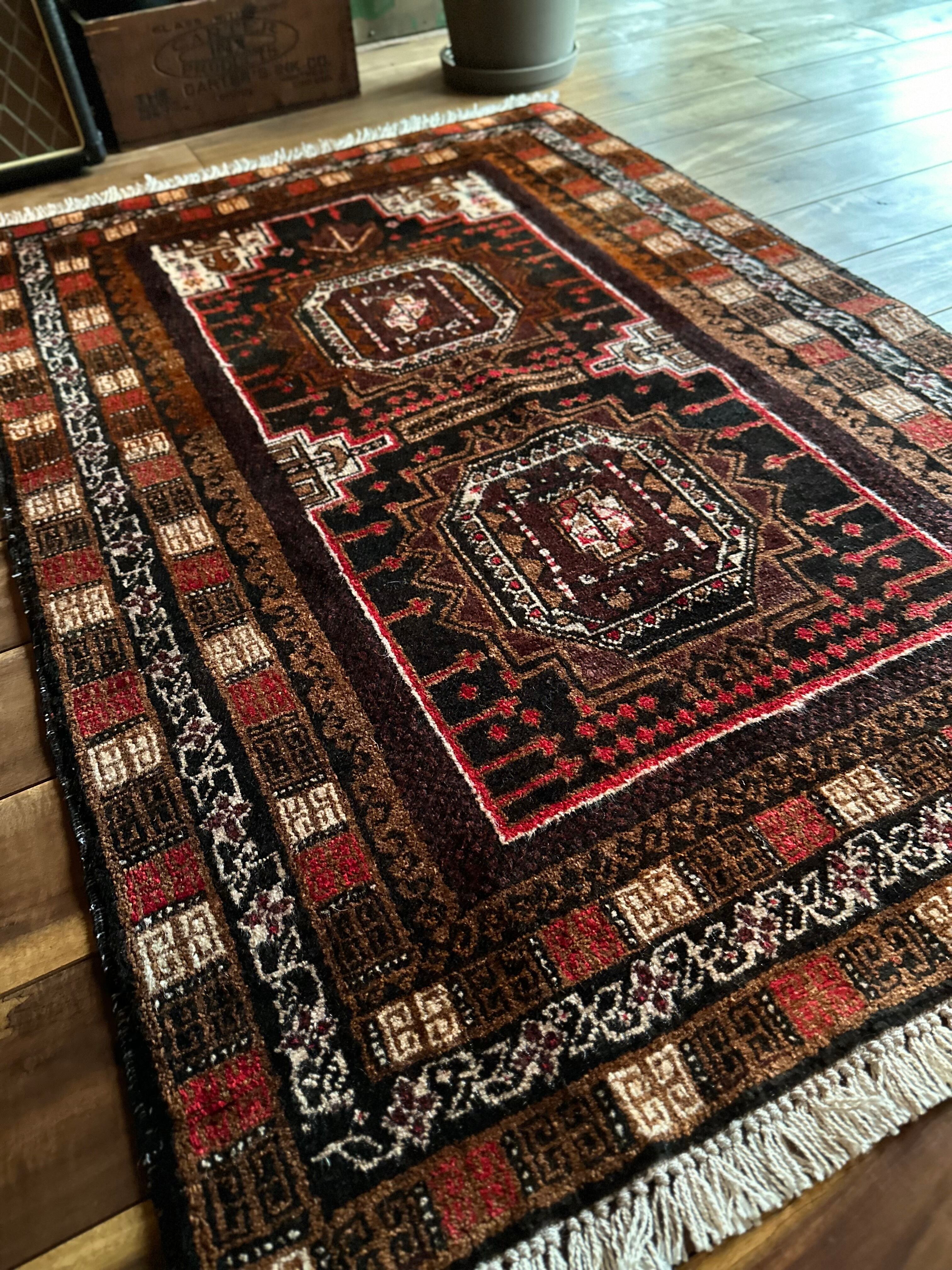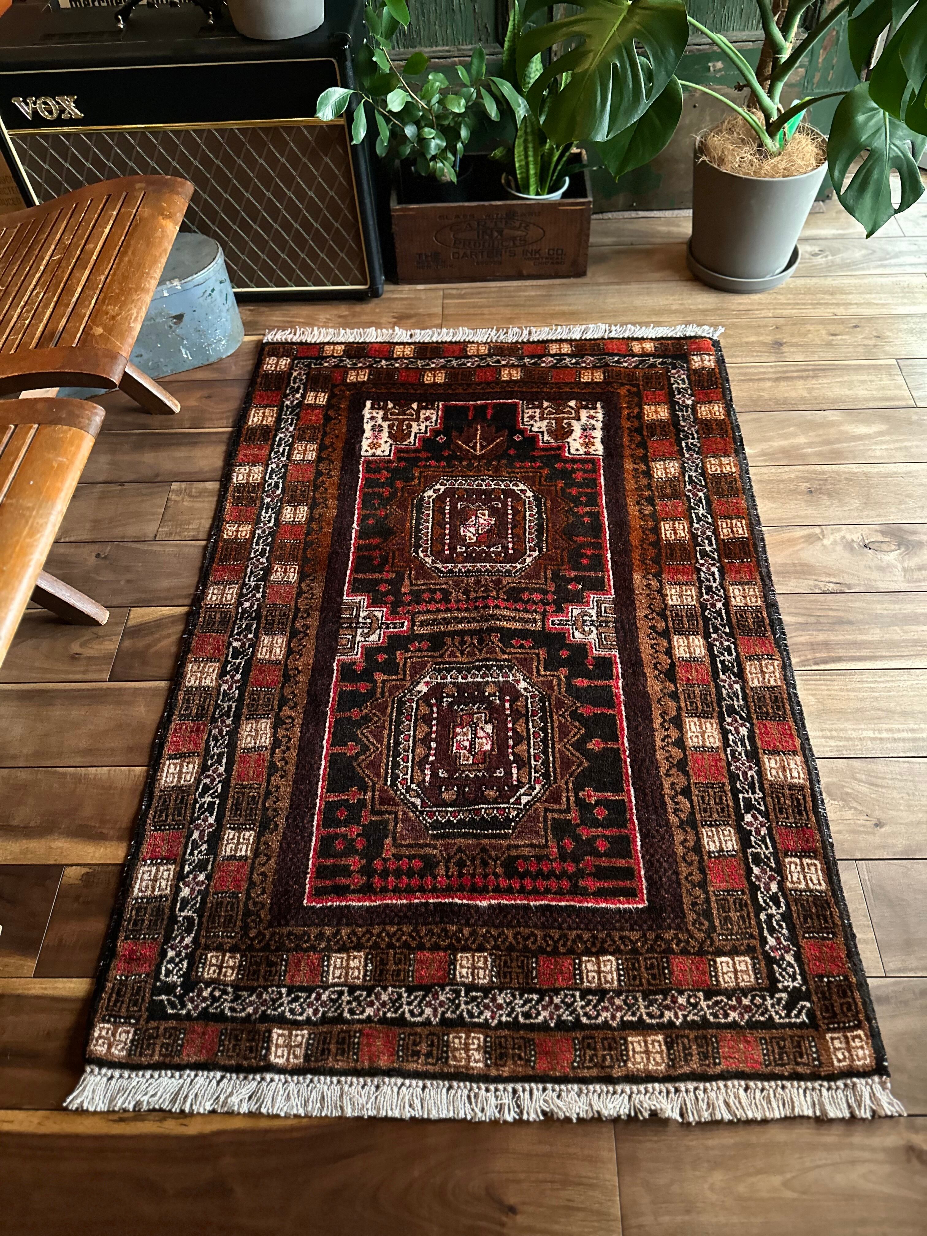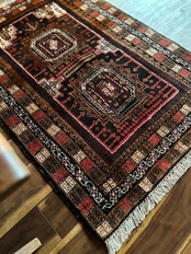 ブラウンにベージュやブラック&レッドの暖色を用いた色合いにサロール・ギュルと呼ばれる伝統的なモチーフが織り込まれたバルーチ族のトライバルラグになります。