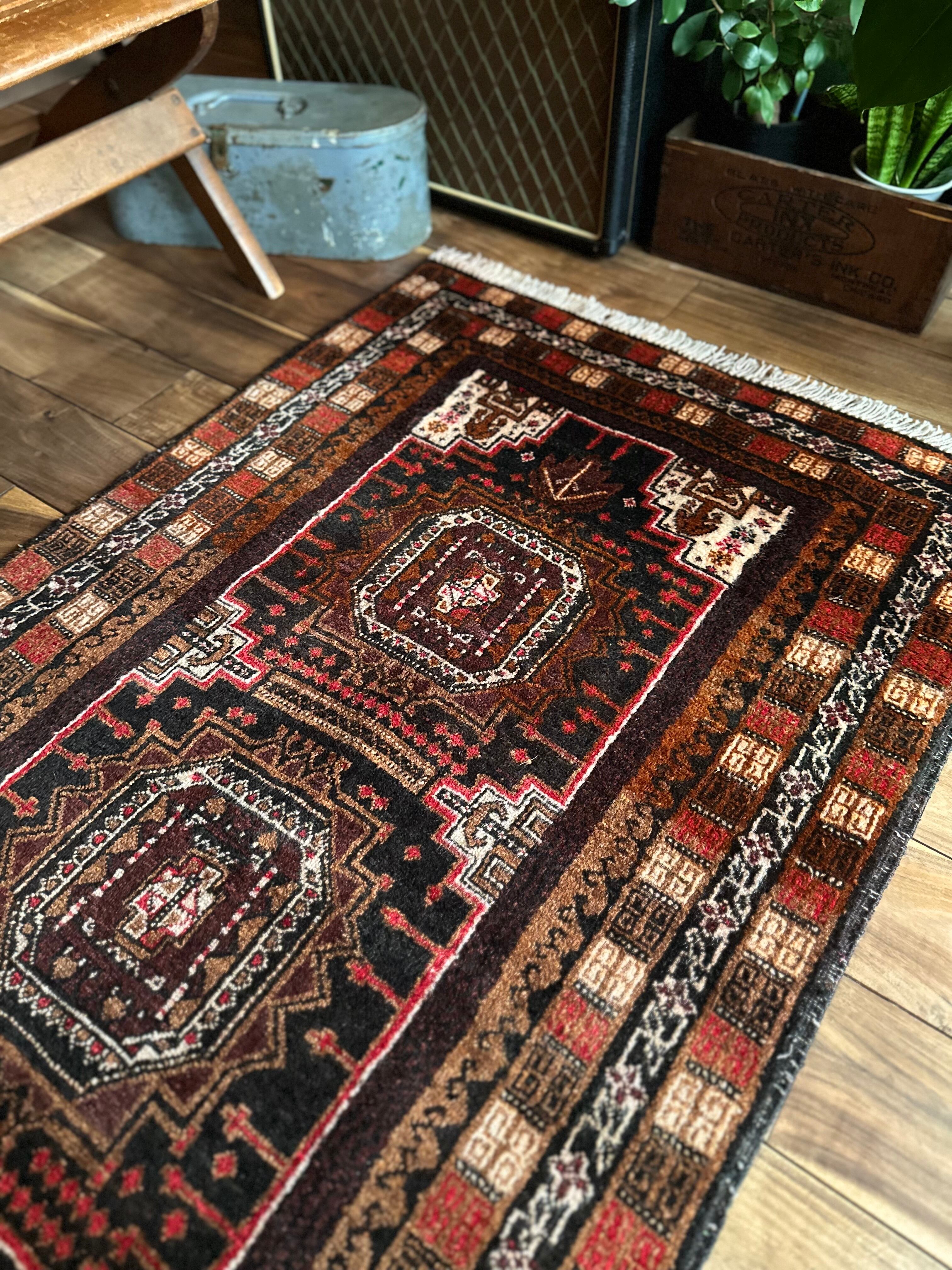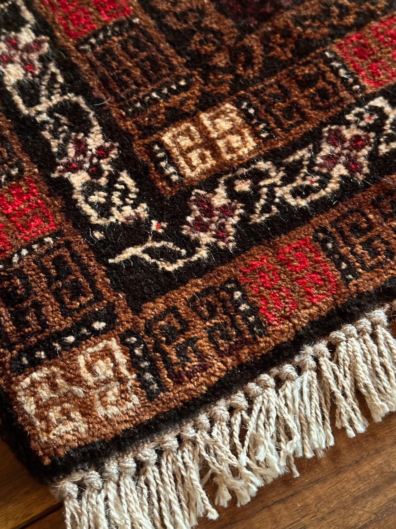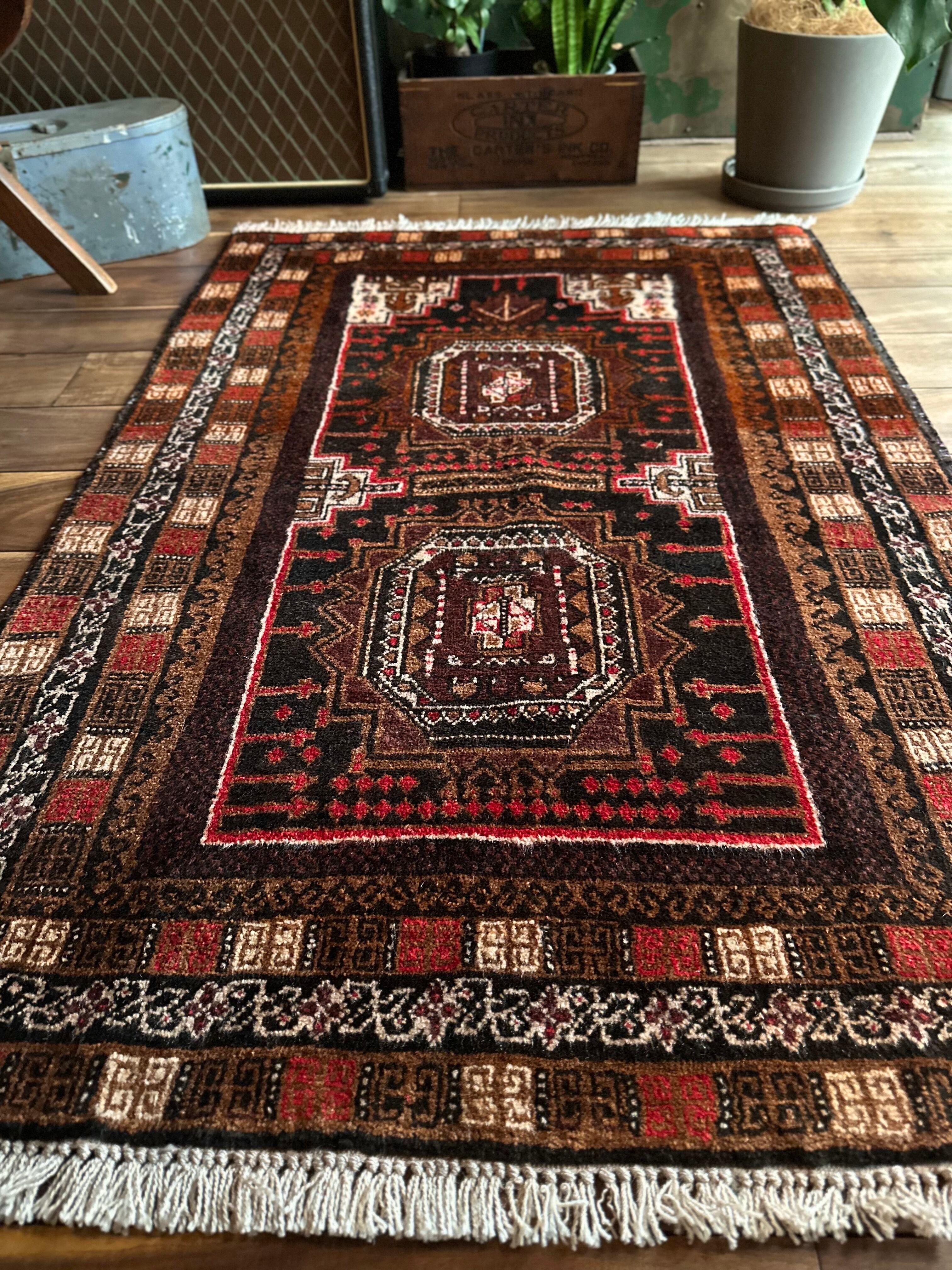 ブラウンにベージュやブラック&レッドの暖色を用いた色合いにサロール・ギュルと呼ばれる伝統的なモチーフが織り込まれたバルーチ族のトライバルラグになります。