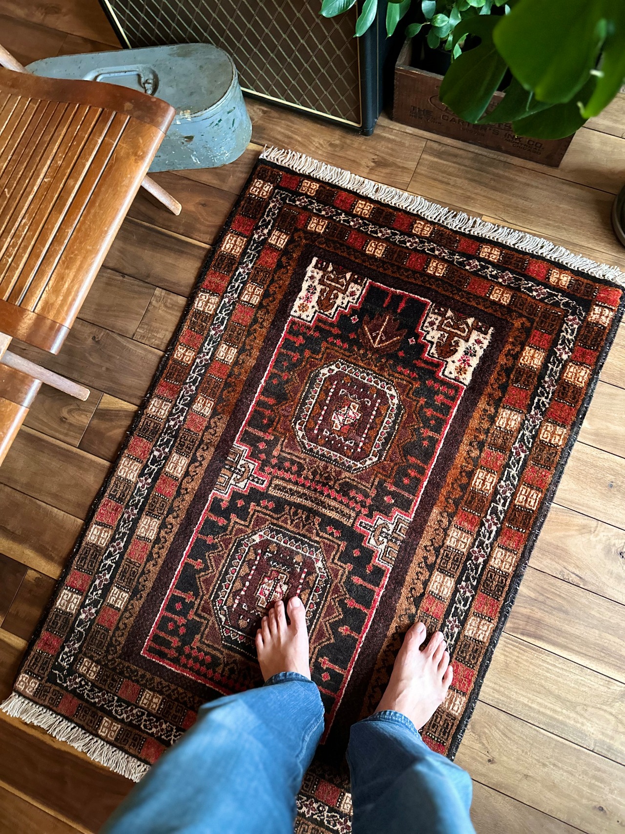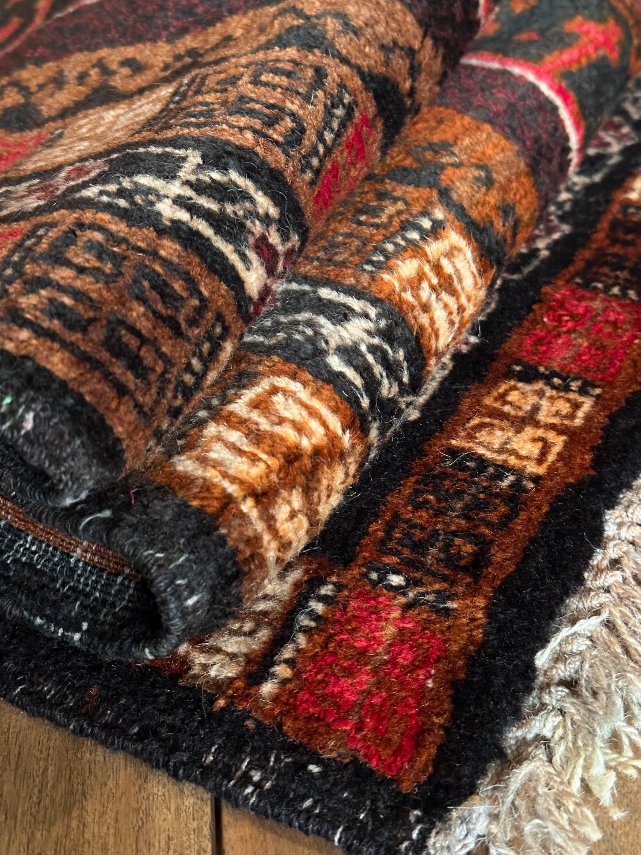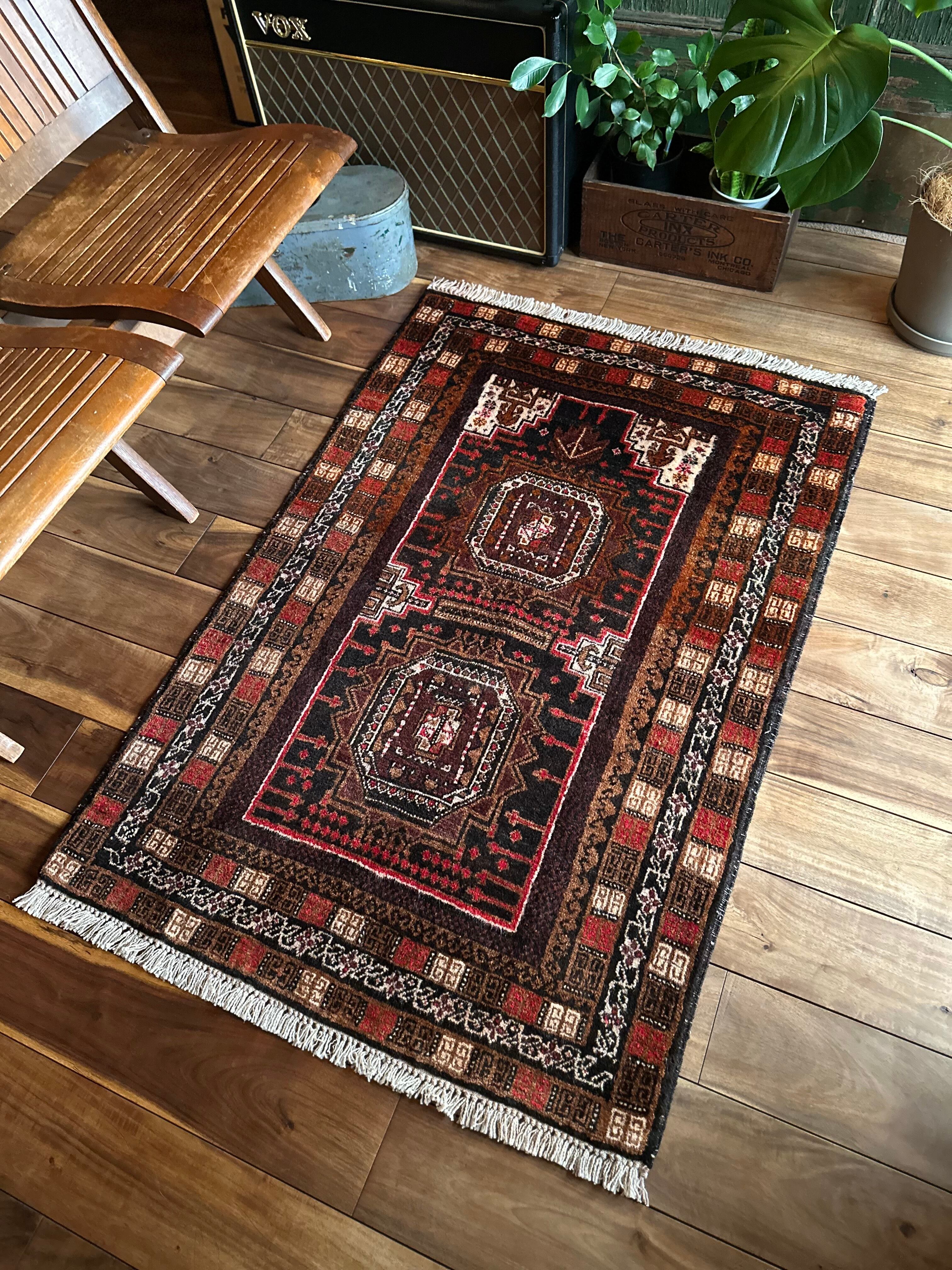 最後にラグそのものに関しては羊毛特有の匂いがあり、採寸は中央付近で計測していますが、手織りならではの歪みによる誤差や水洗いクリーニングによる縮み、また草木染めによる経年劣化の色ムラなどがありますが、それもまたヴィンテージラグの魅力かとご理解ください。