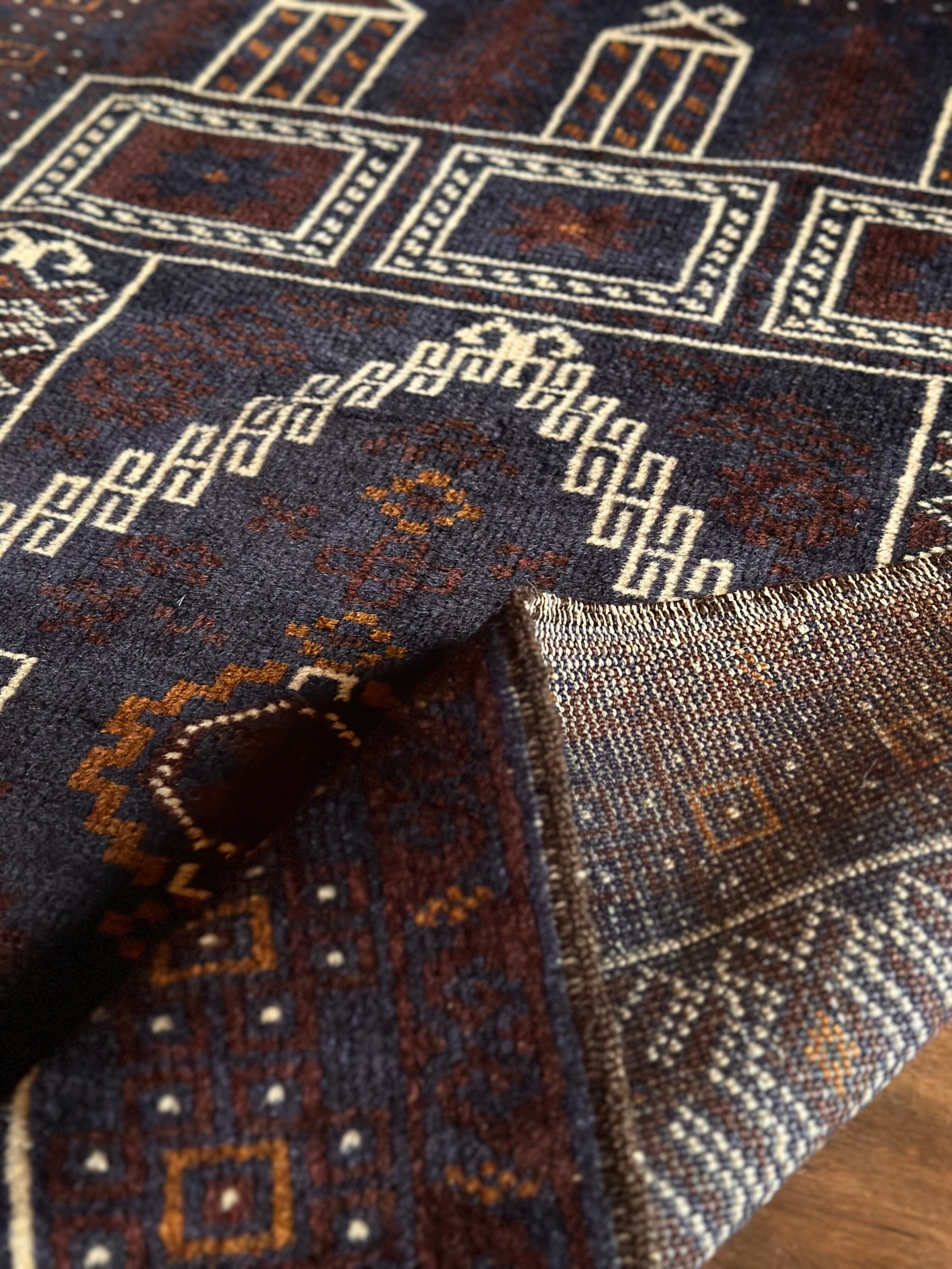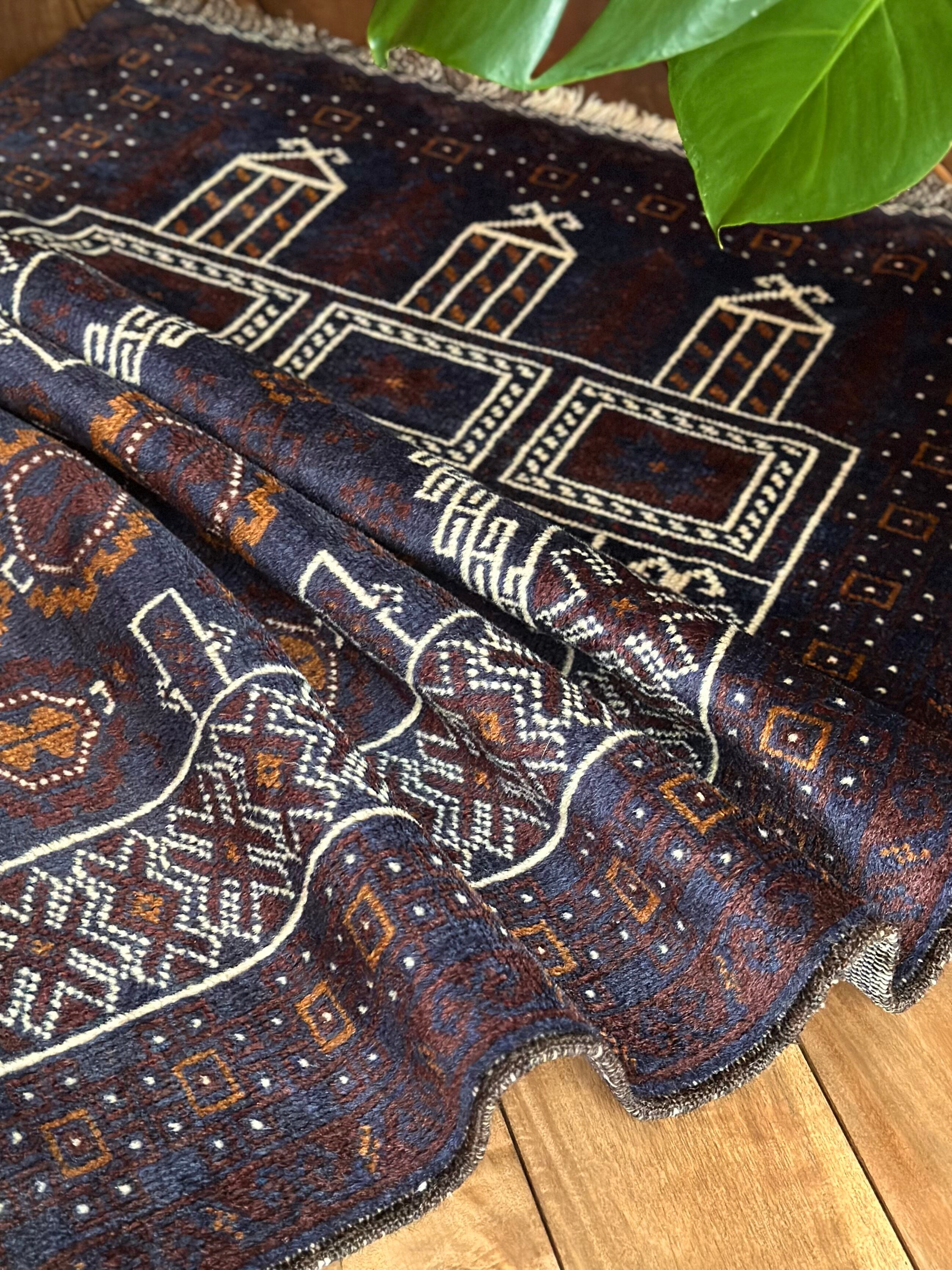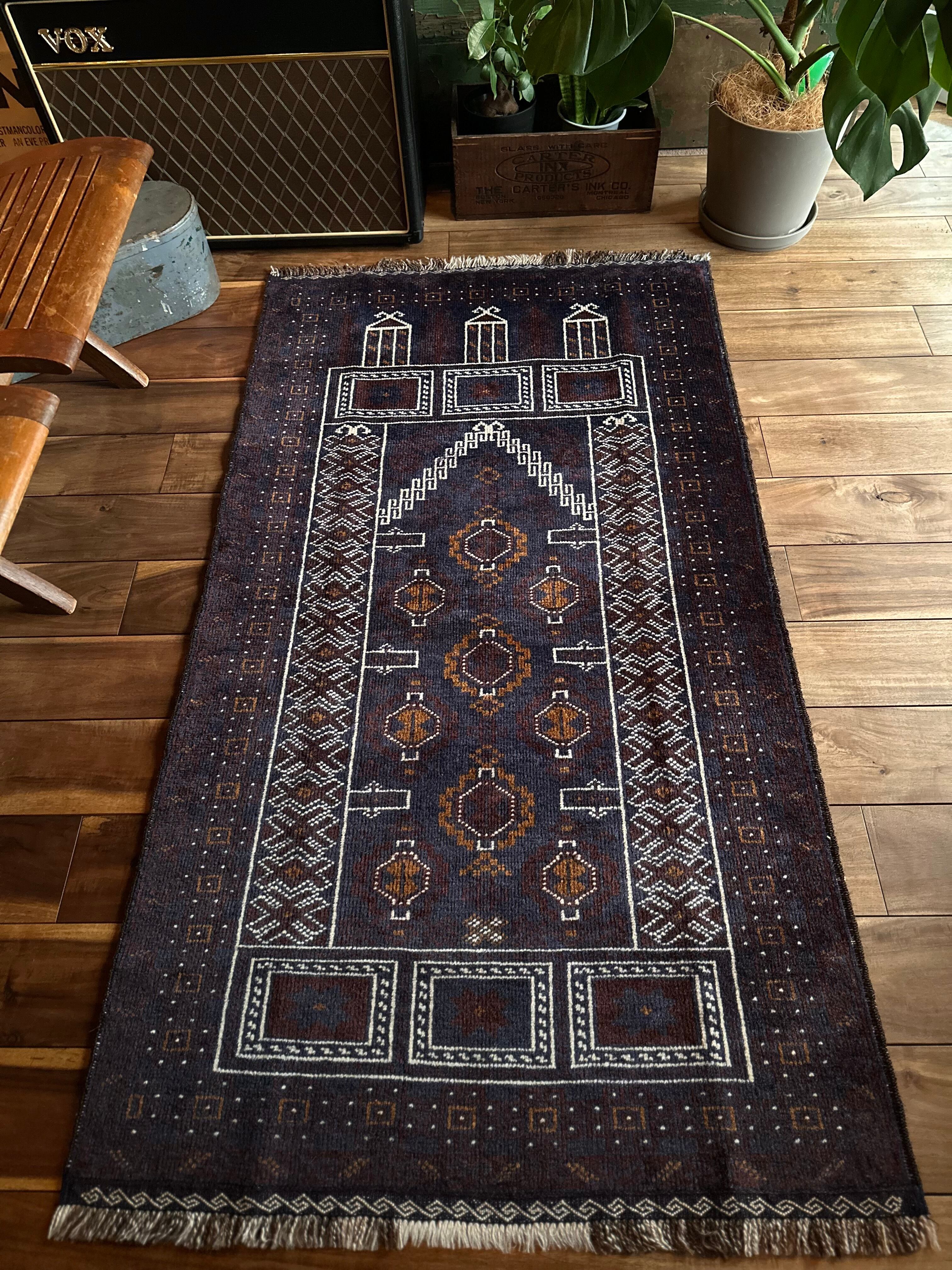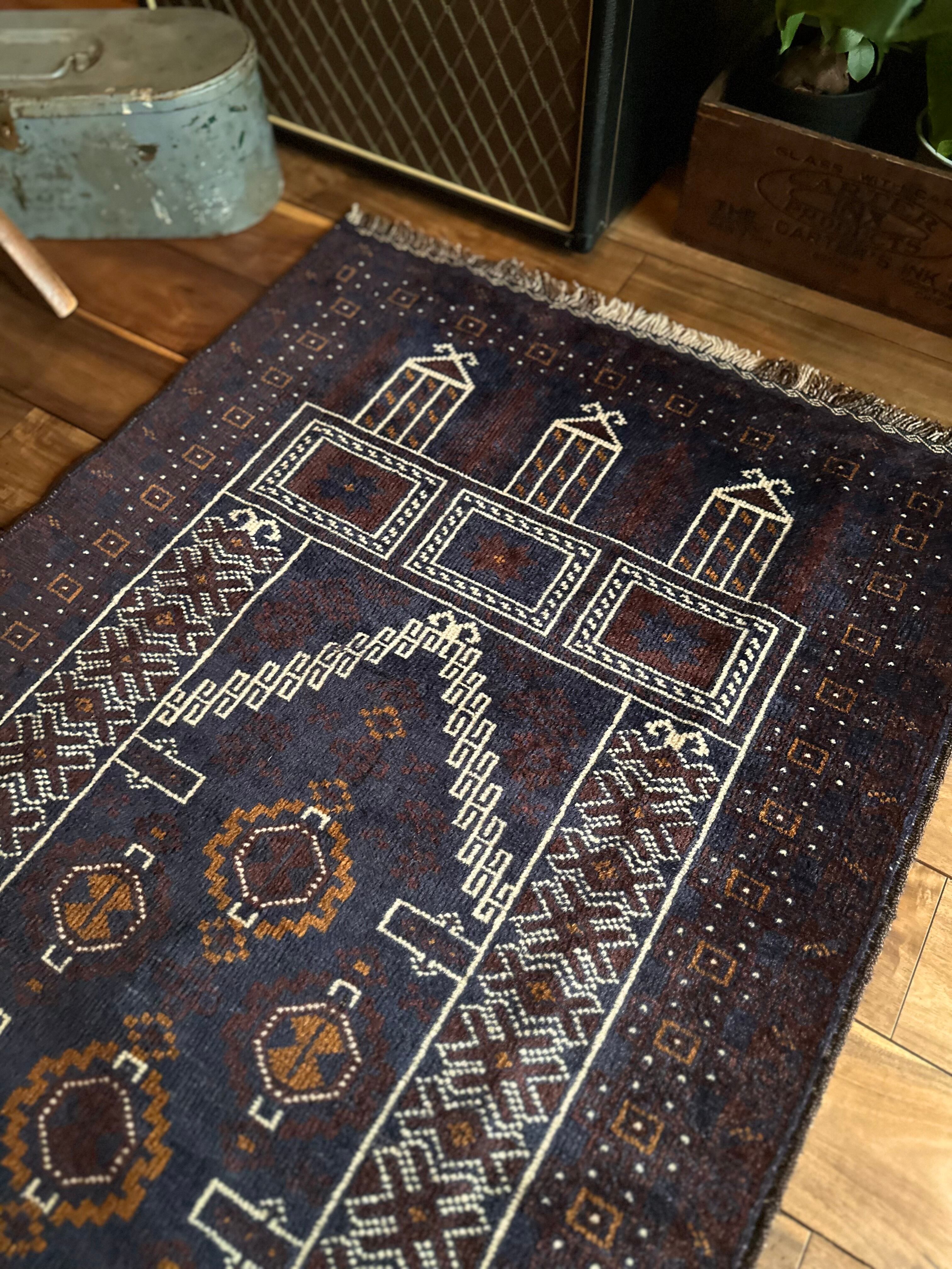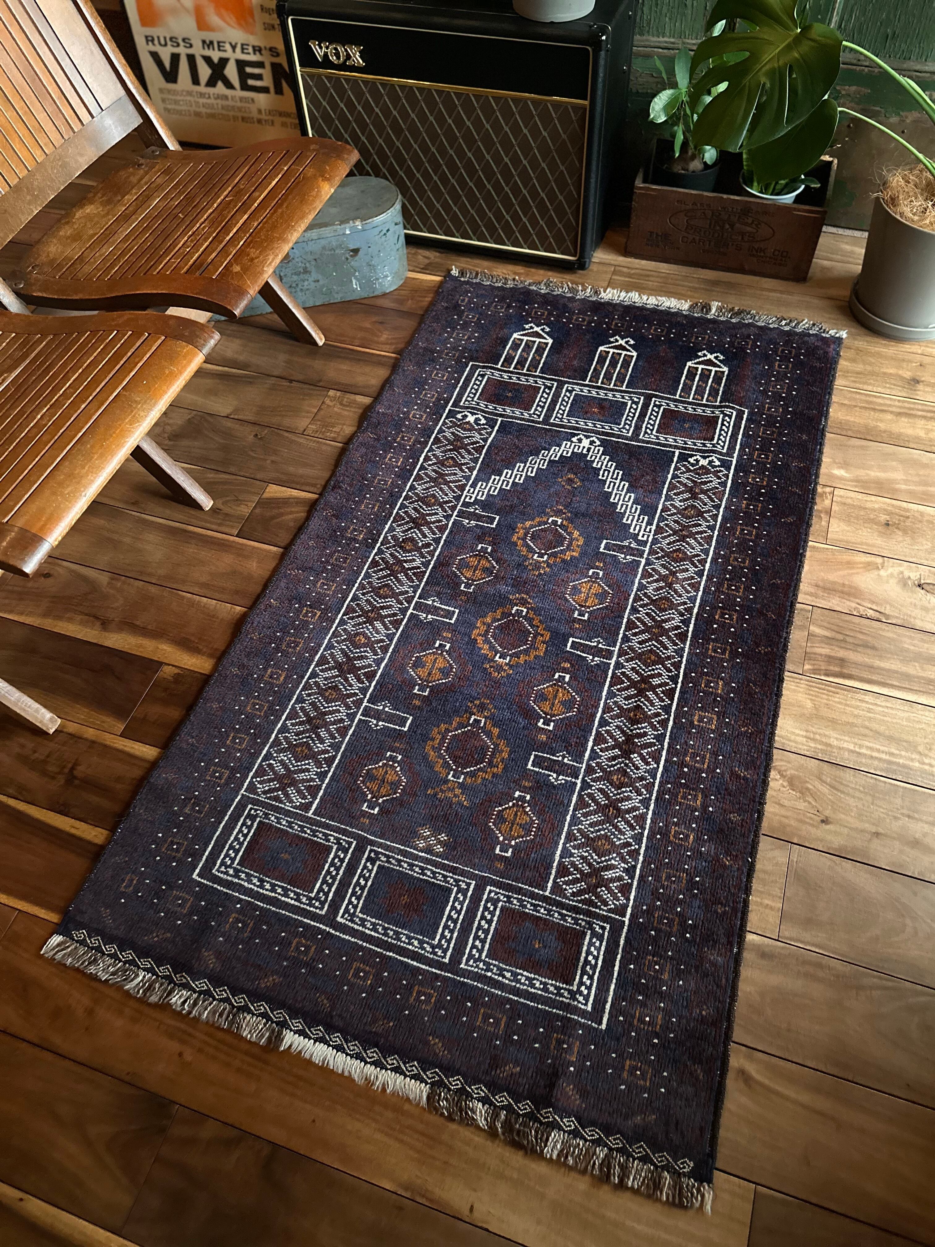 ネイビーブルーの深海で祈りを捧げる気持ちを体現出来るかのような祈祷用のプレイヤーラグで、アフガニスタンはヘラート州に数多く居住するバルーチ族のトライバルラグになります。