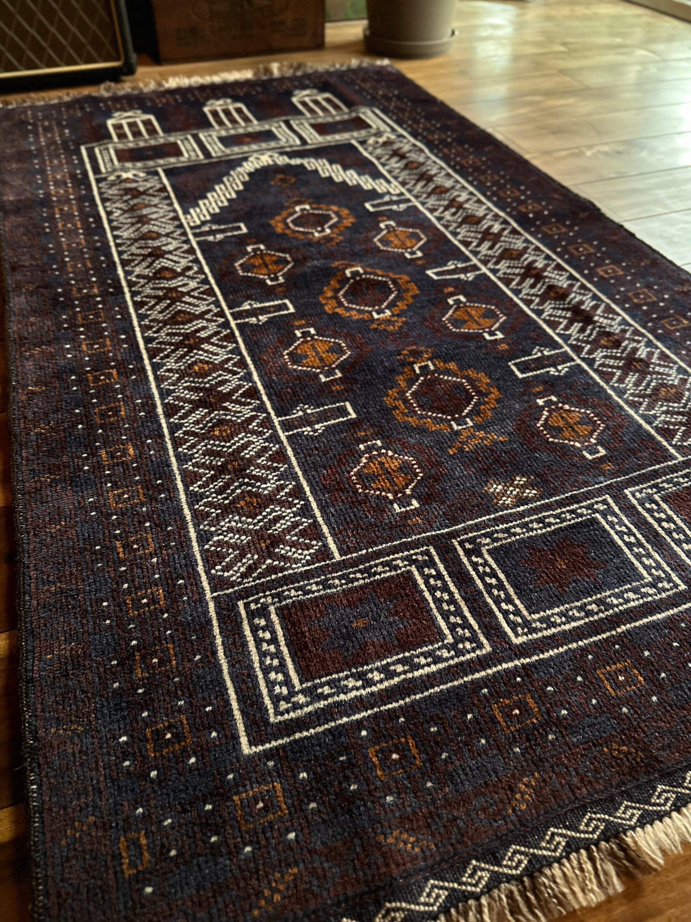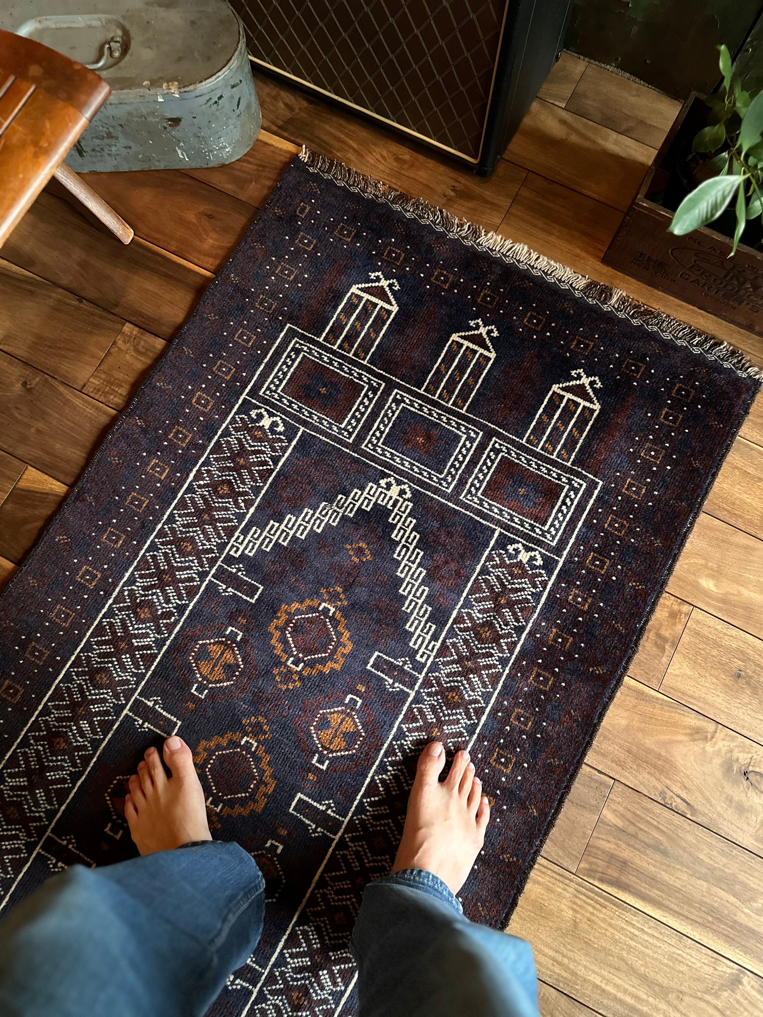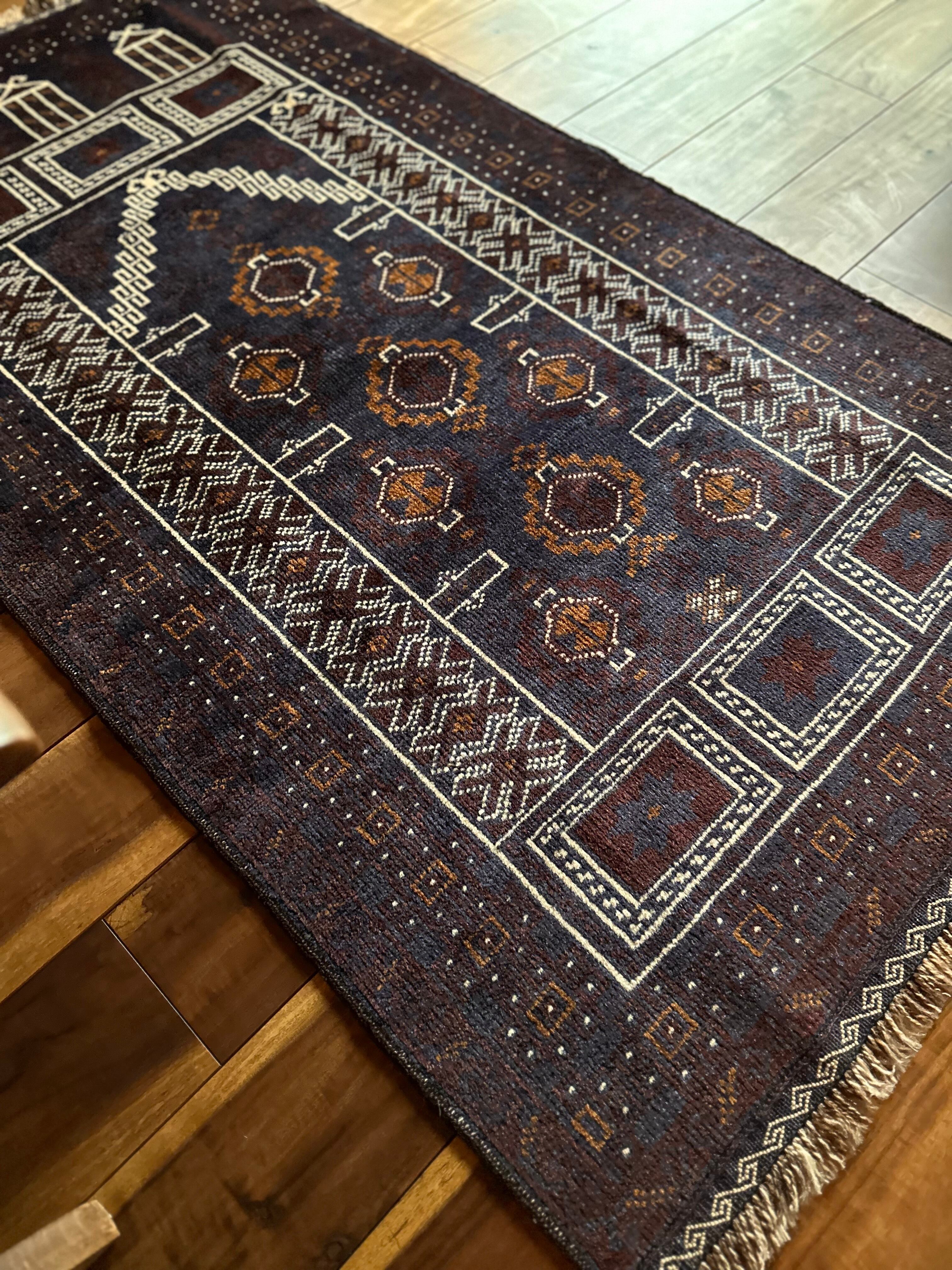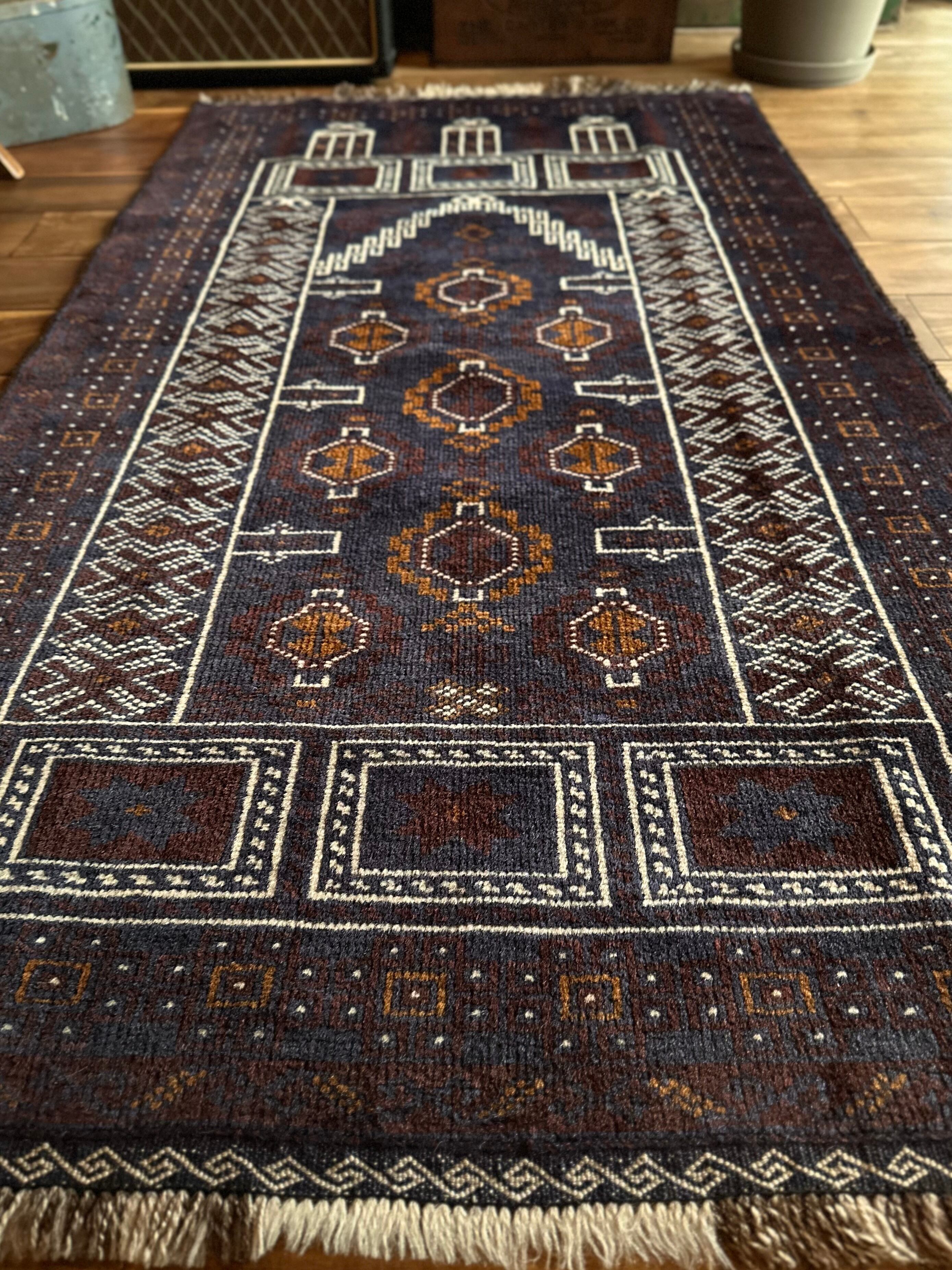 ネイビーブルーの深海で祈りを捧げる気持ちを体現出来るかのような祈祷用のプレイヤーラグで、アフガニスタンはヘラート州に数多く居住するバルーチ族のトライバルラグになります。