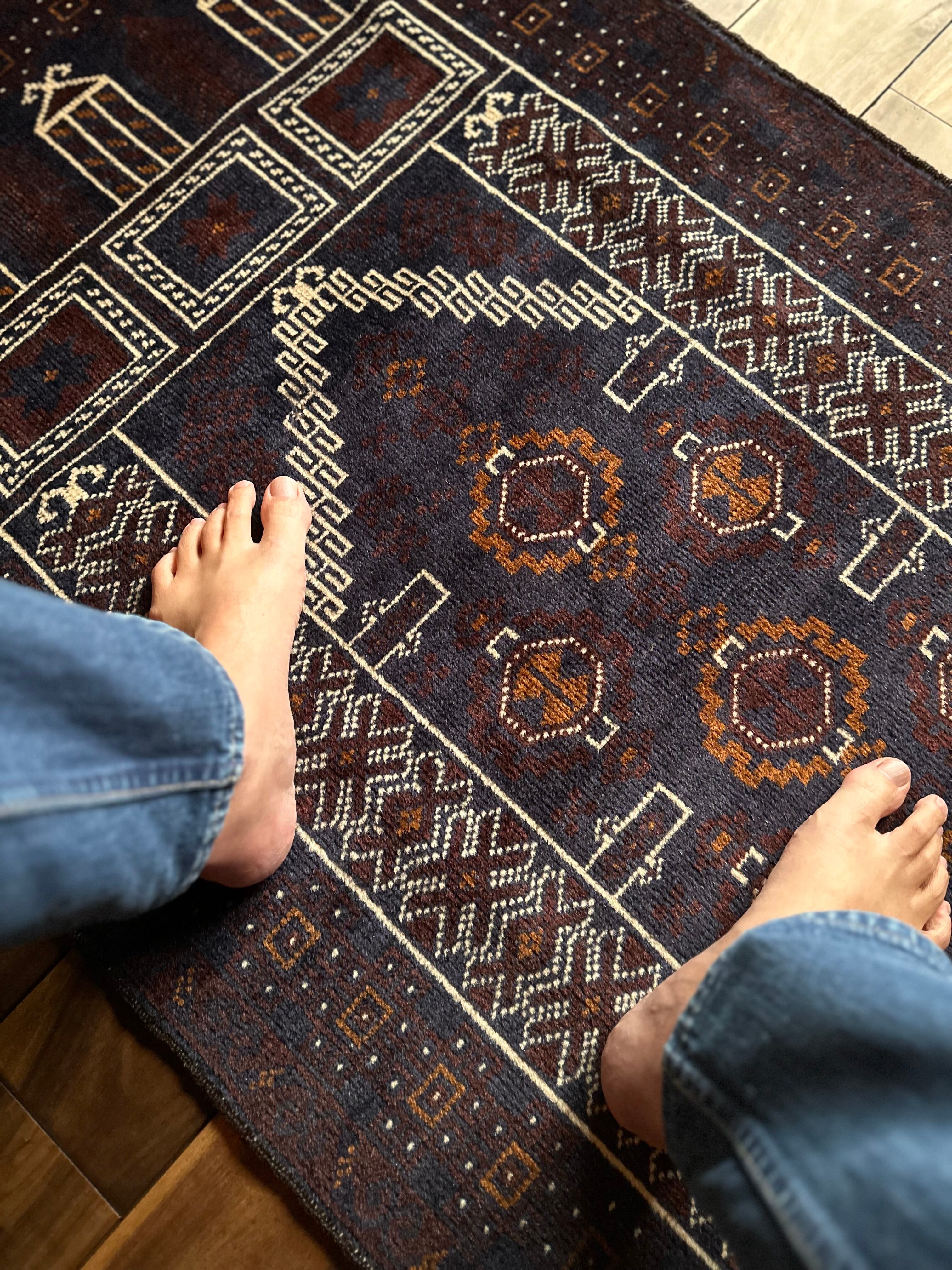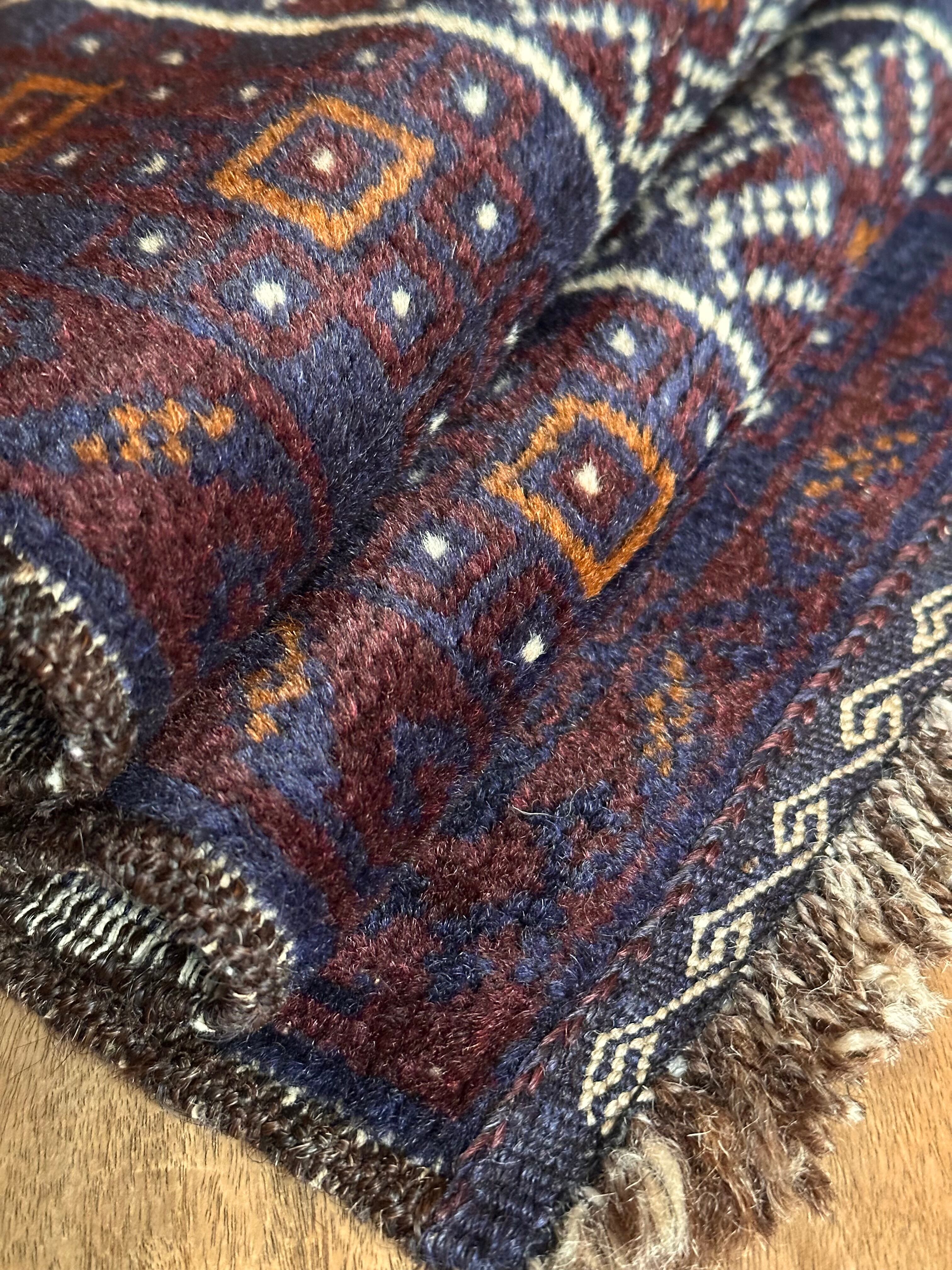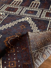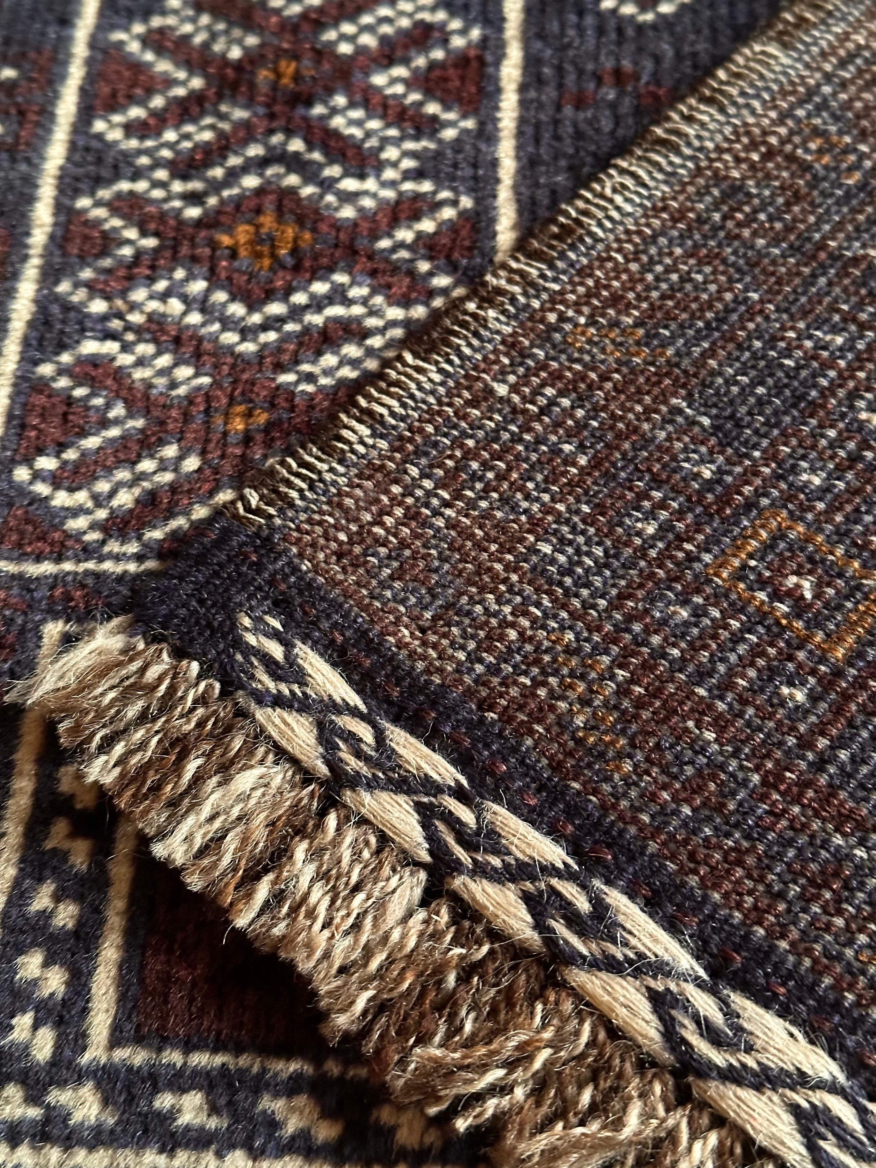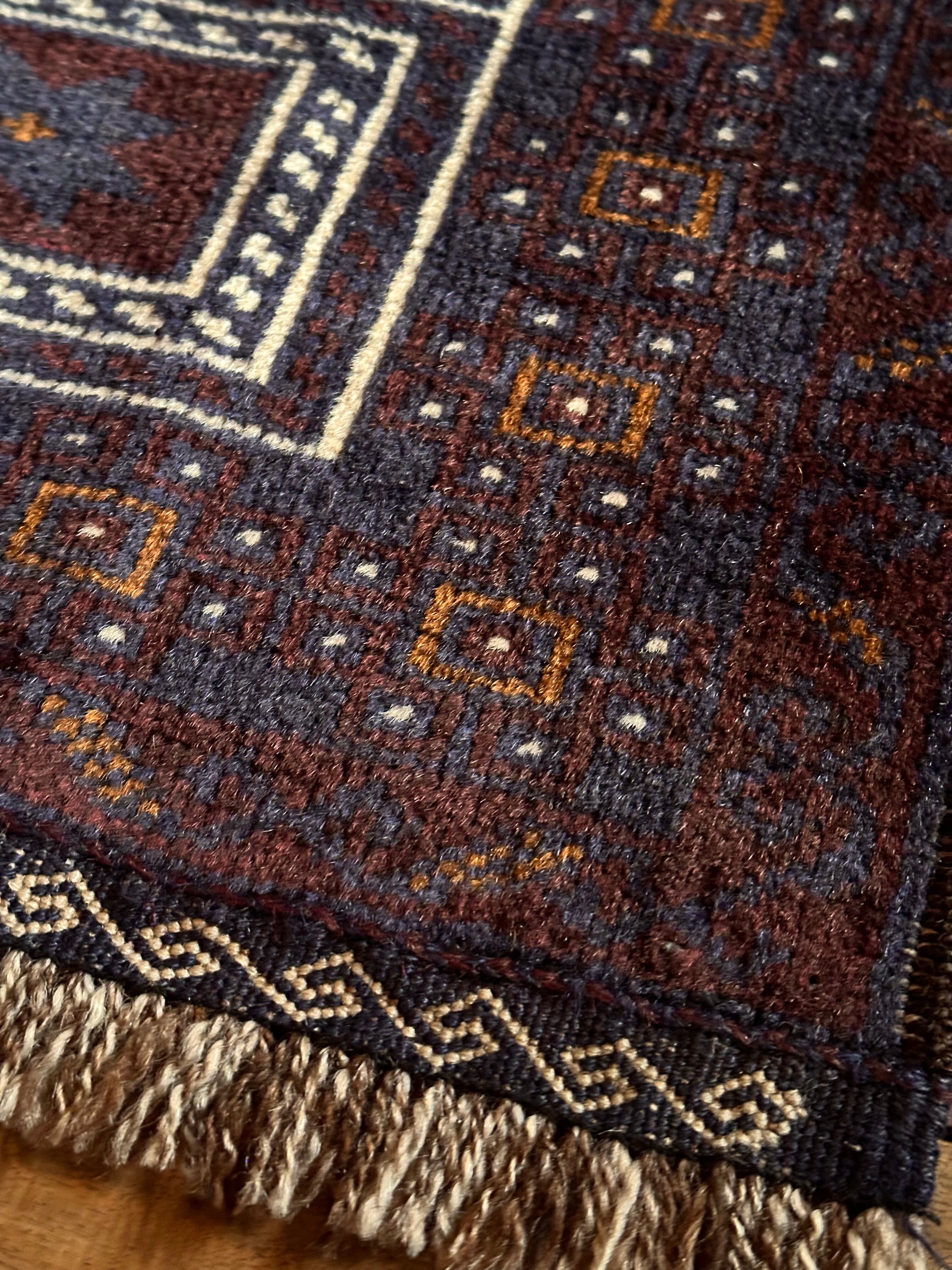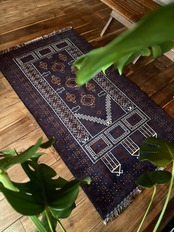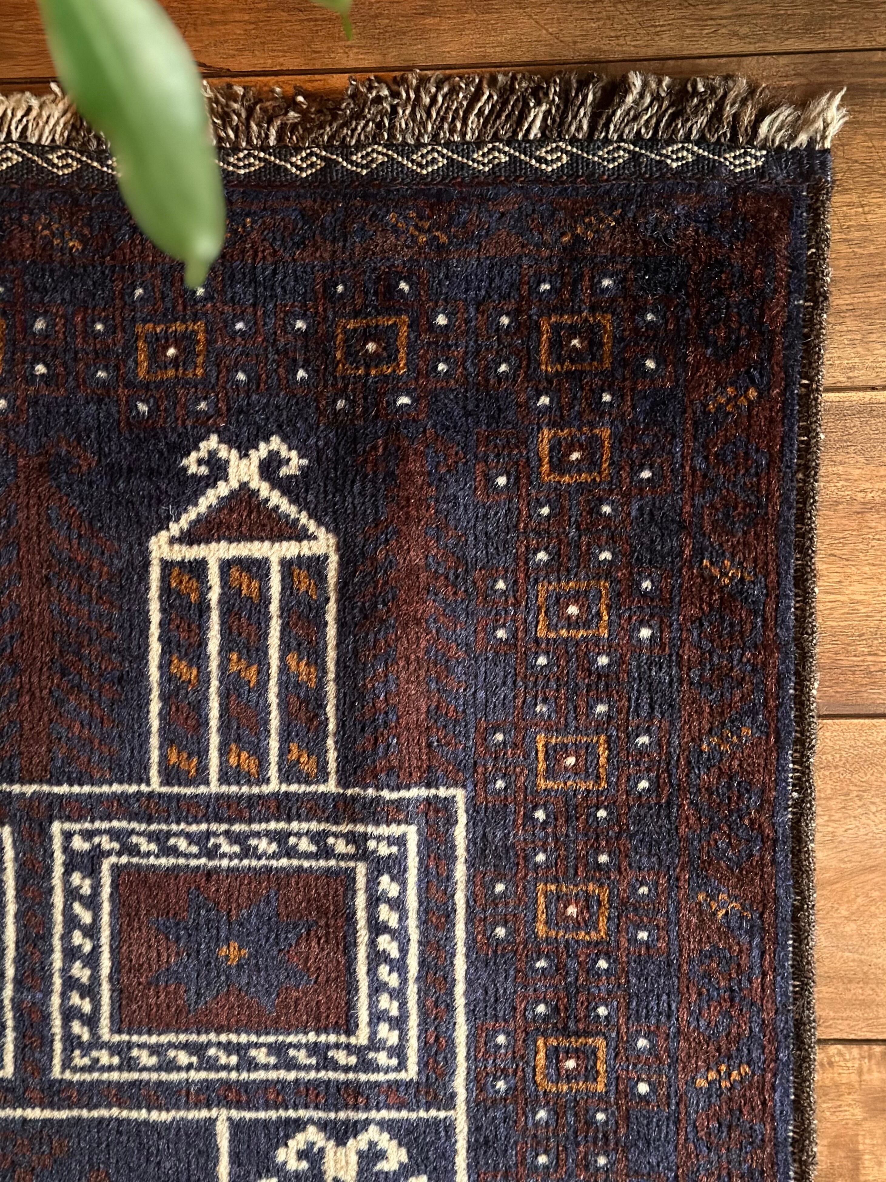 ネイビーブルーの深海で祈りを捧げる気持ちを体現出来るかのような祈祷用のプレイヤーラグで、アフガニスタンはヘラート州に数多く居住するバルーチ族のトライバルラグになります。