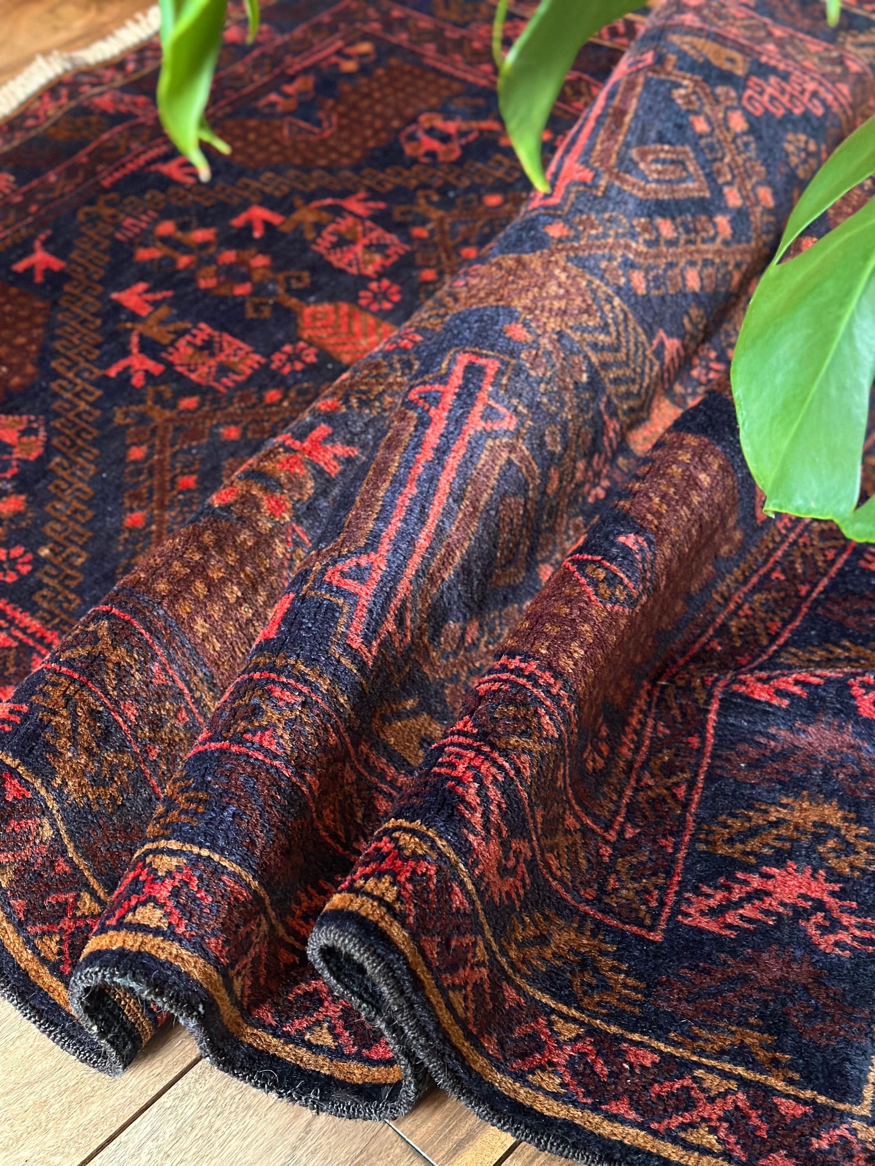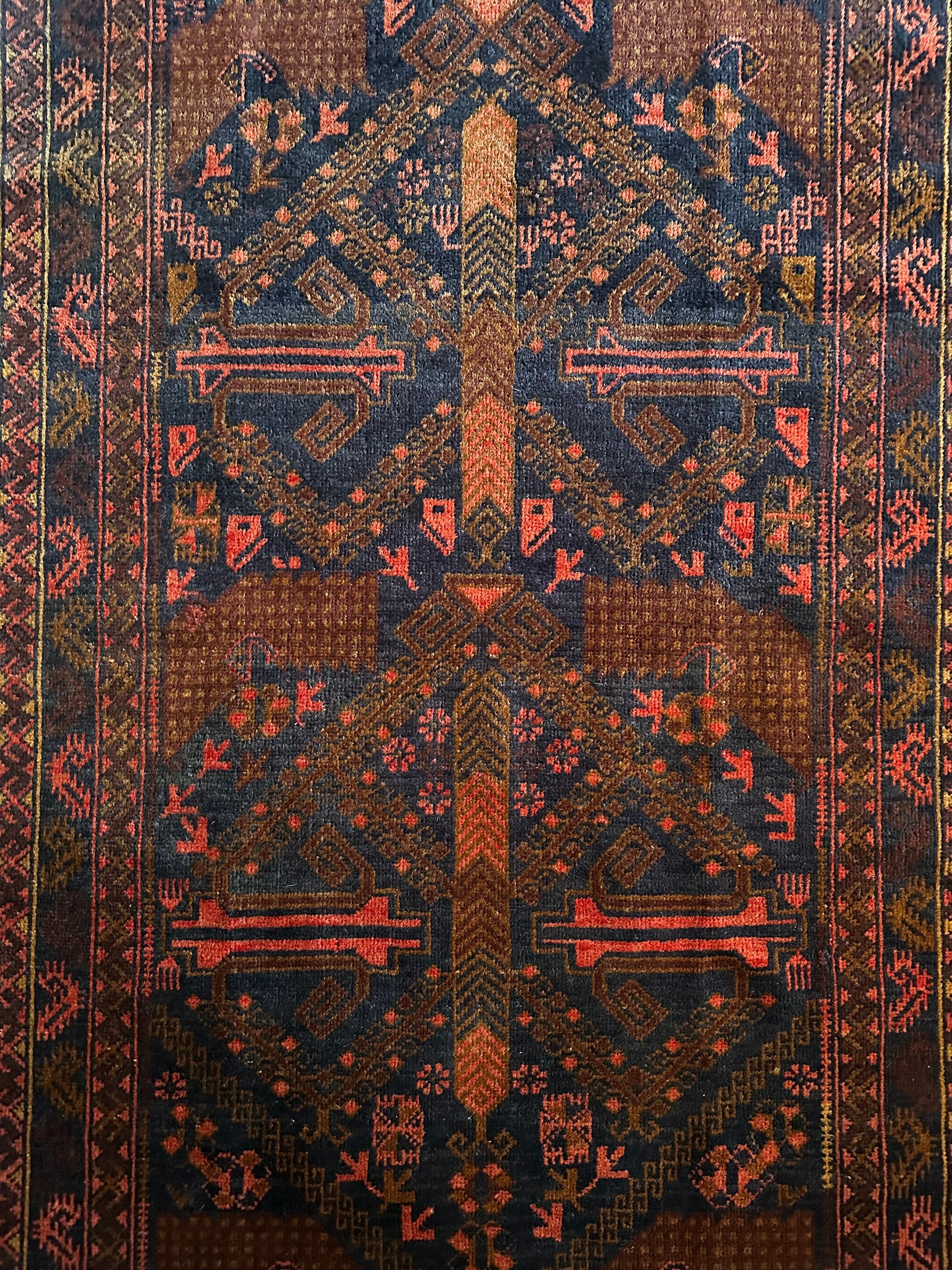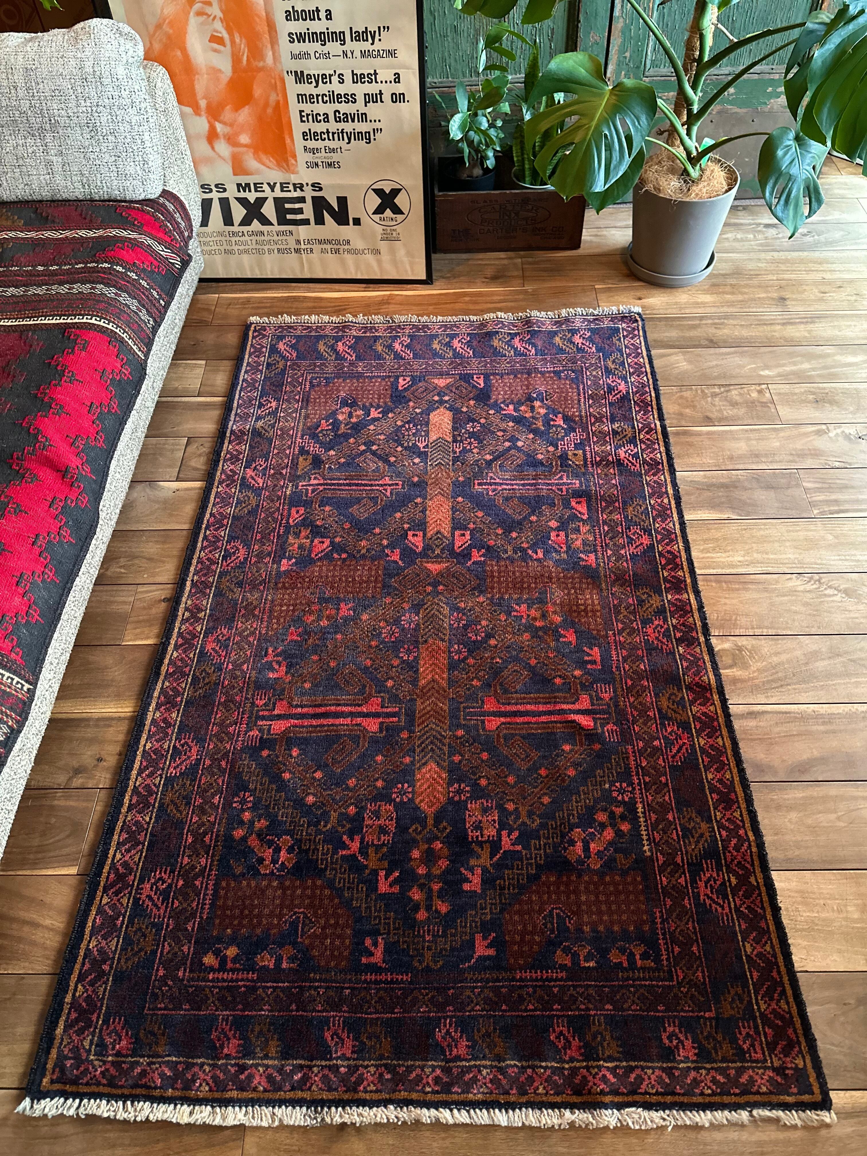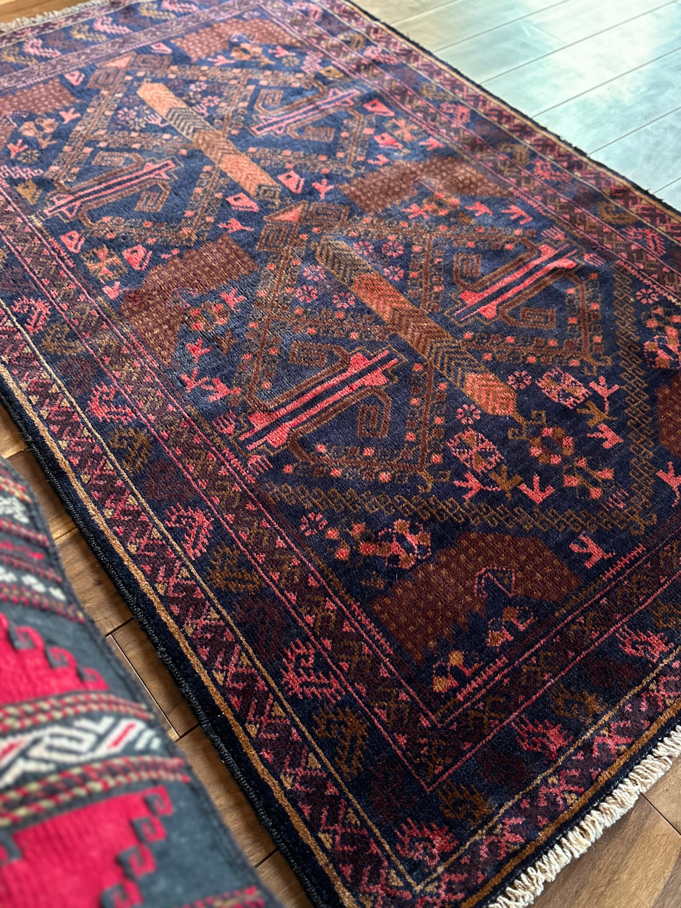 漆黒のバルーチの名にふさわしいブラックのように深まったネイビーにブラウンとレッドの3色使いで部族感を極めたヘラート産のトライバルラグになります。