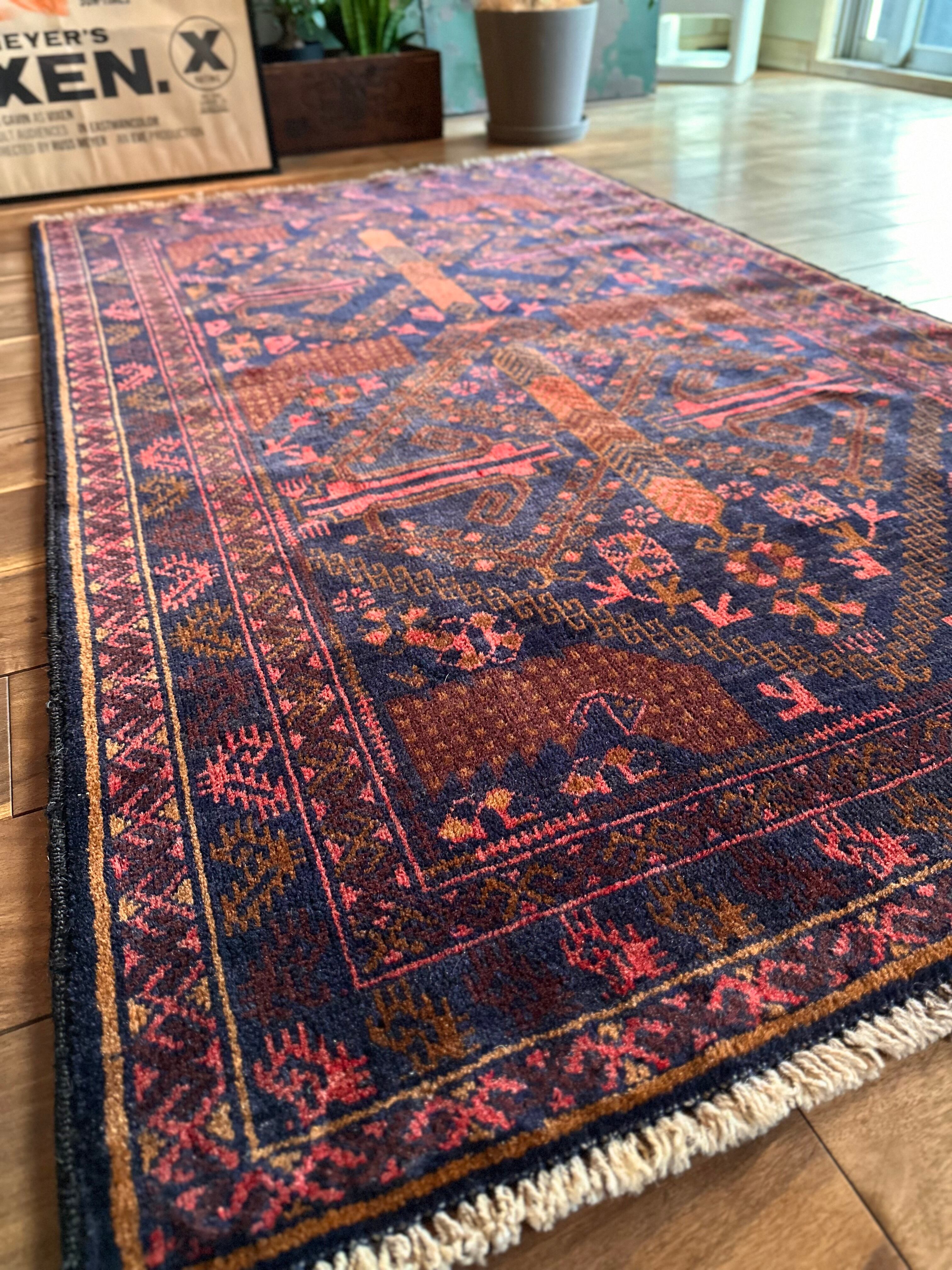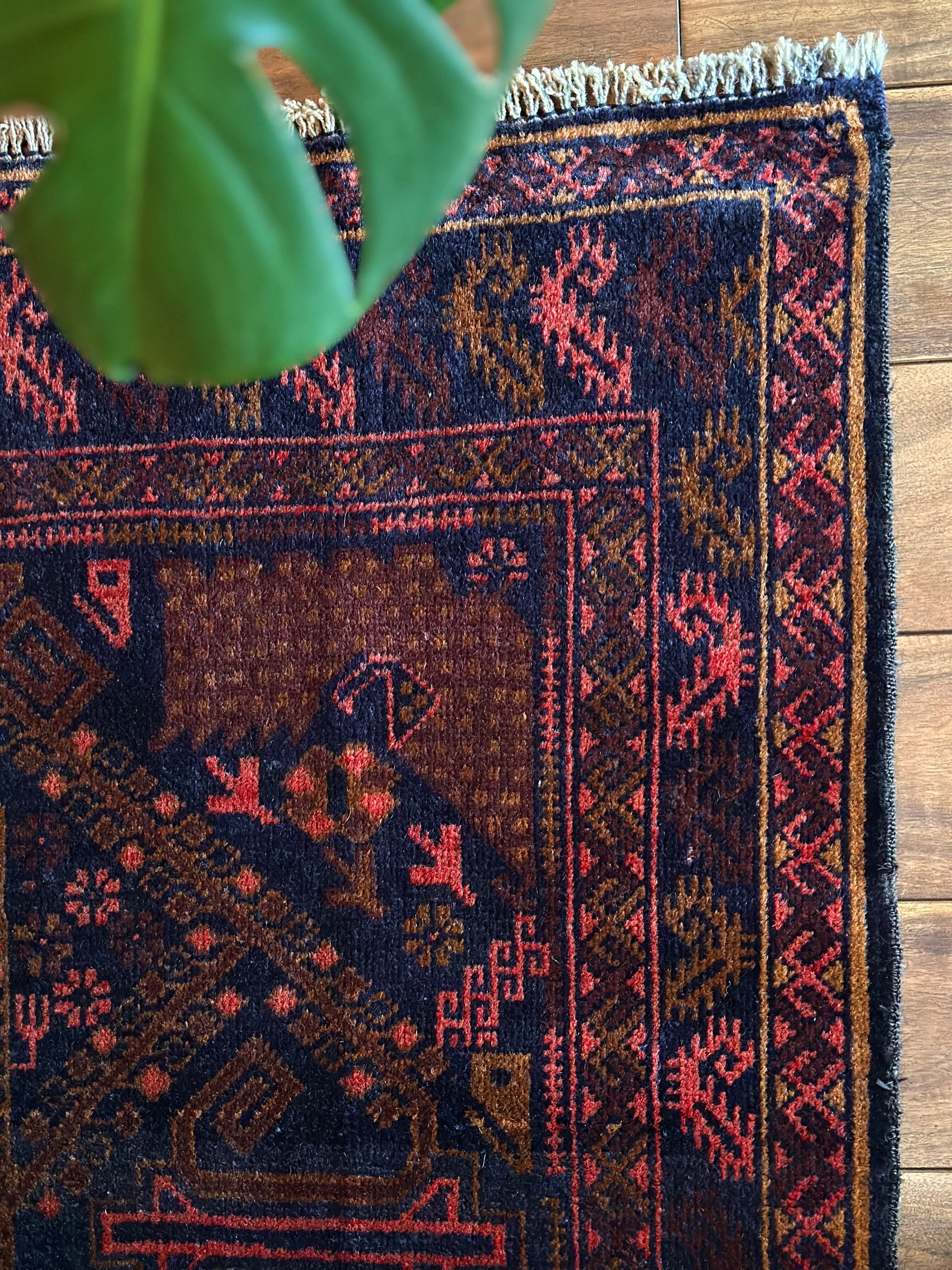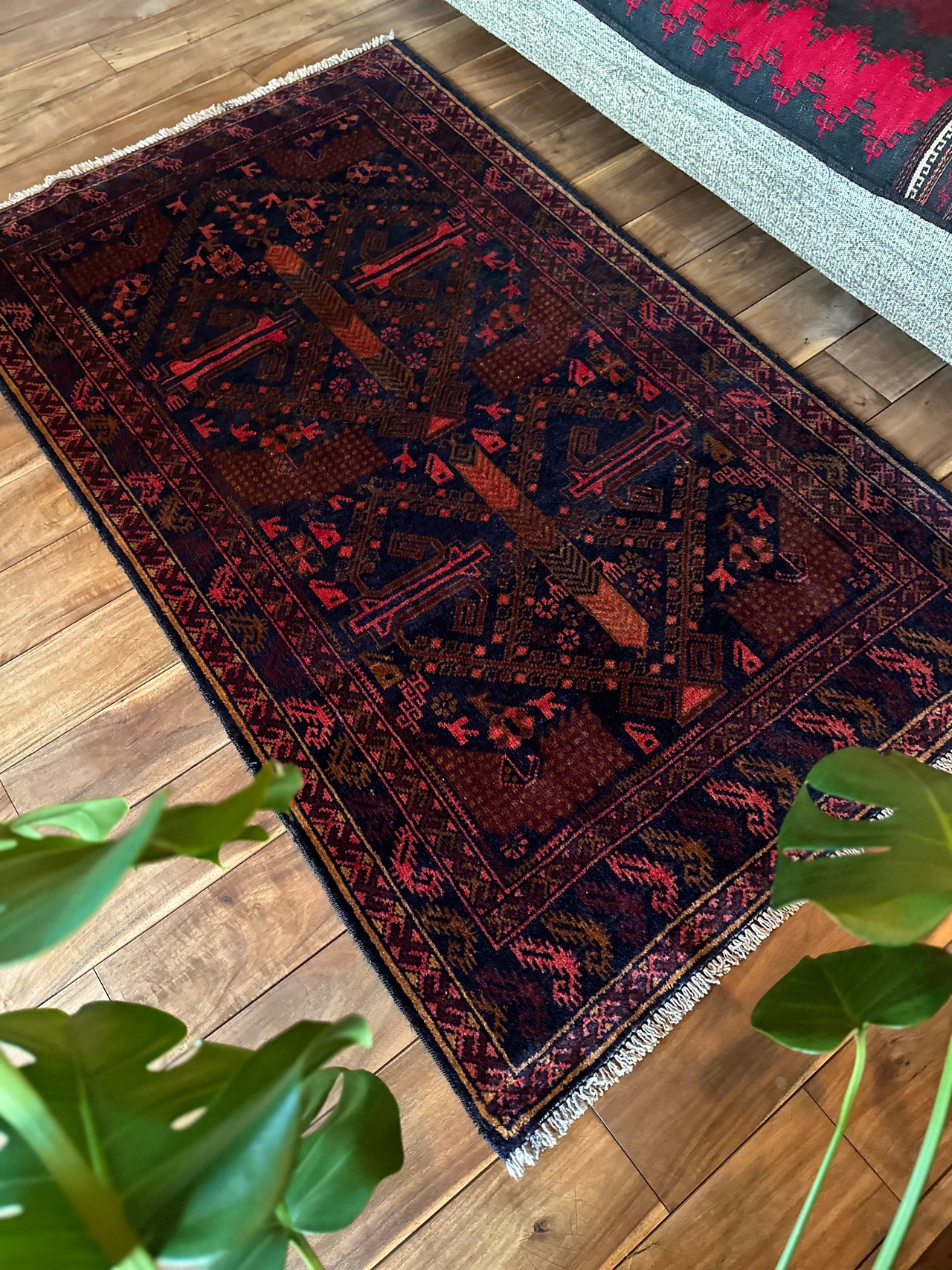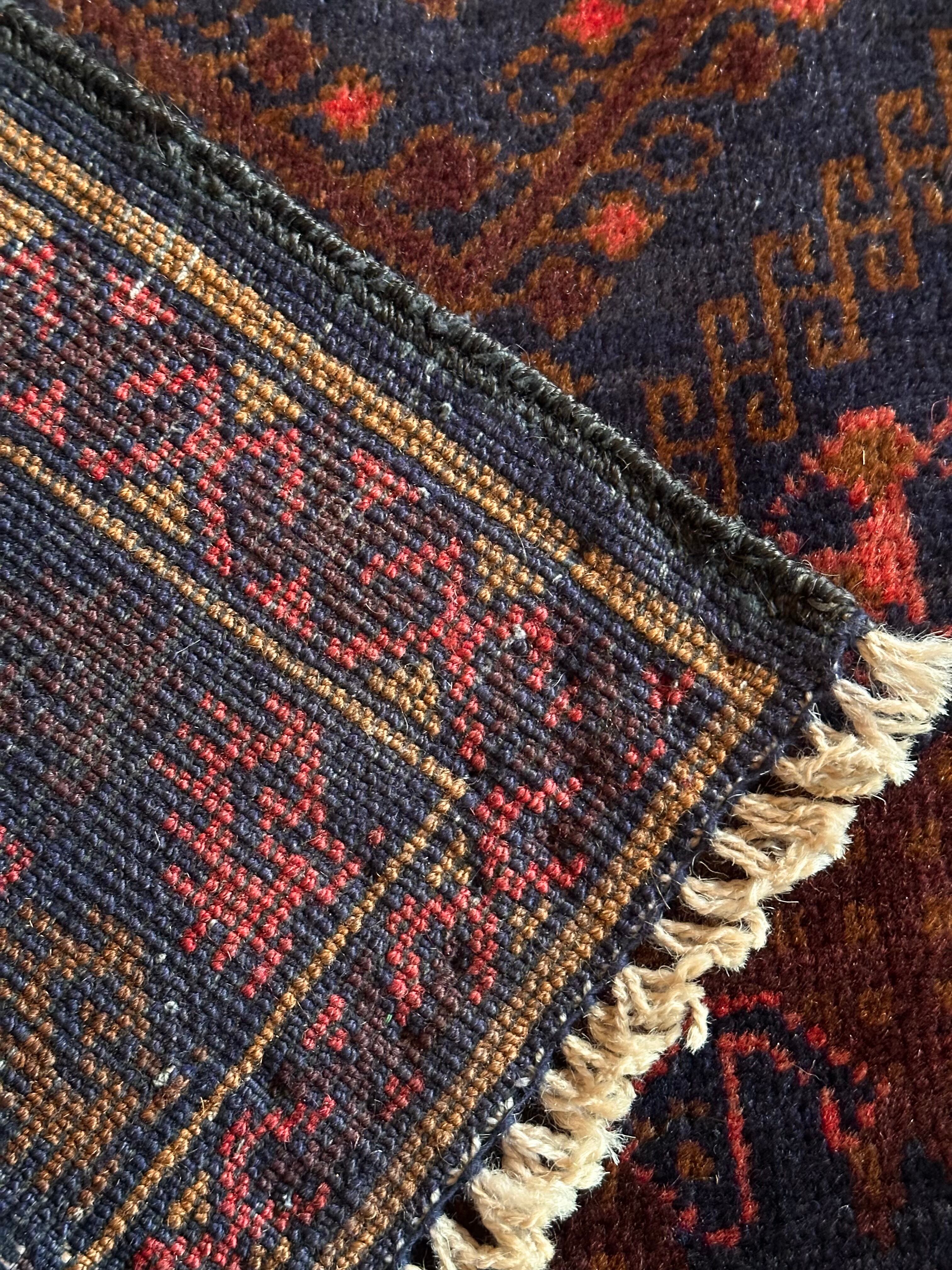 漆黒のバルーチの名にふさわしいブラックのように深まったネイビーにブラウンとレッドの3色使いで部族感を極めたヘラート産のトライバルラグになります。