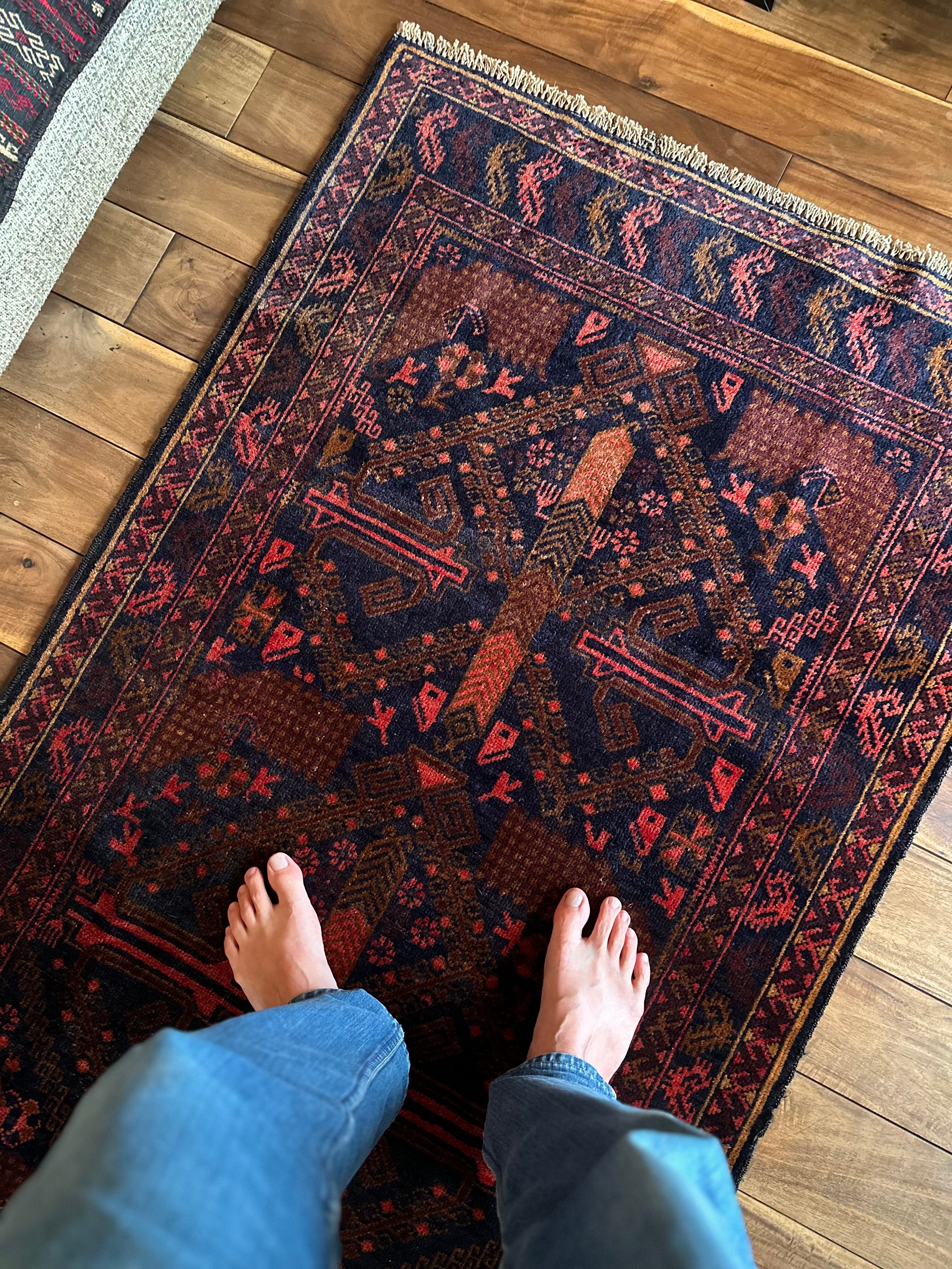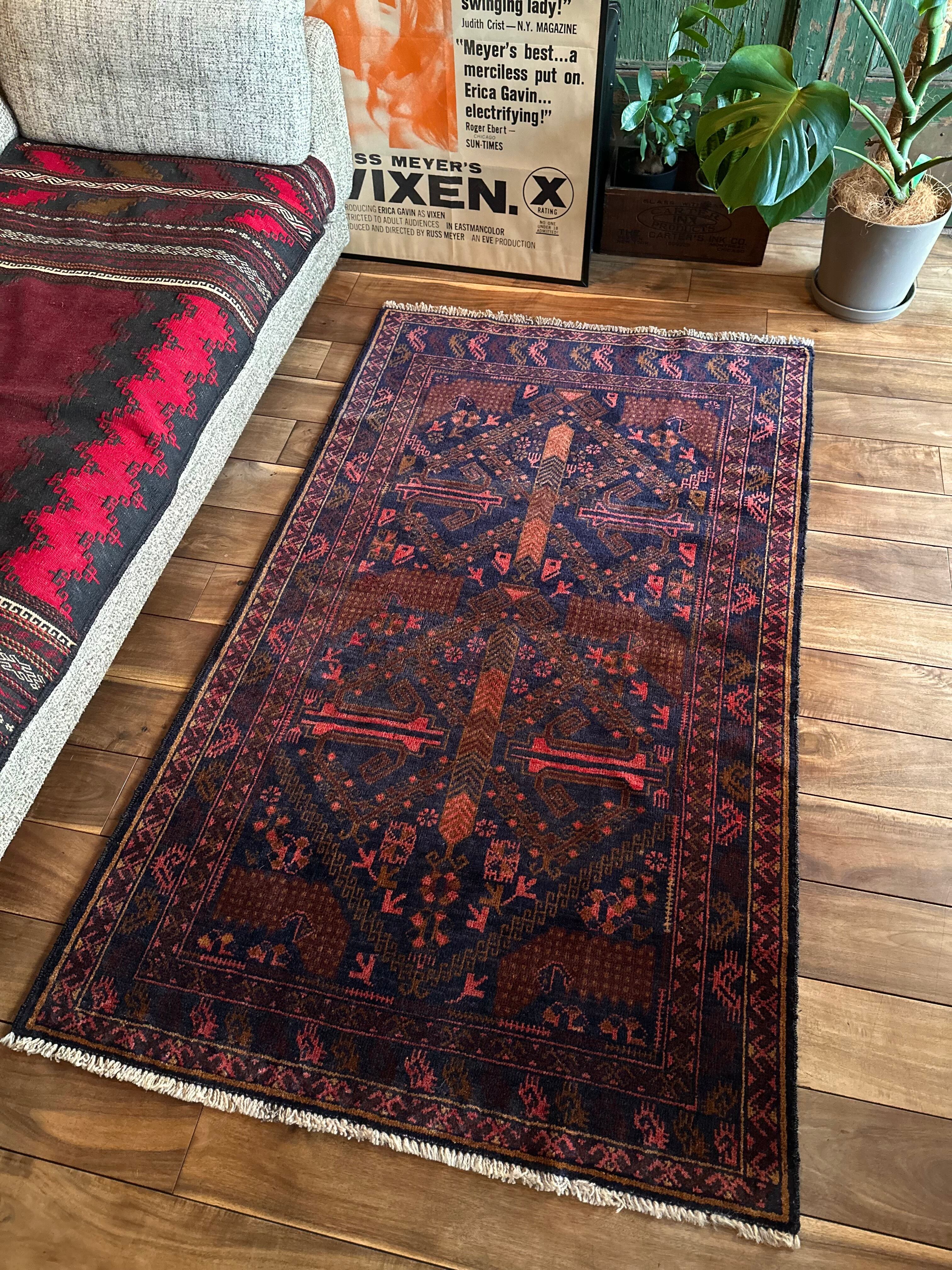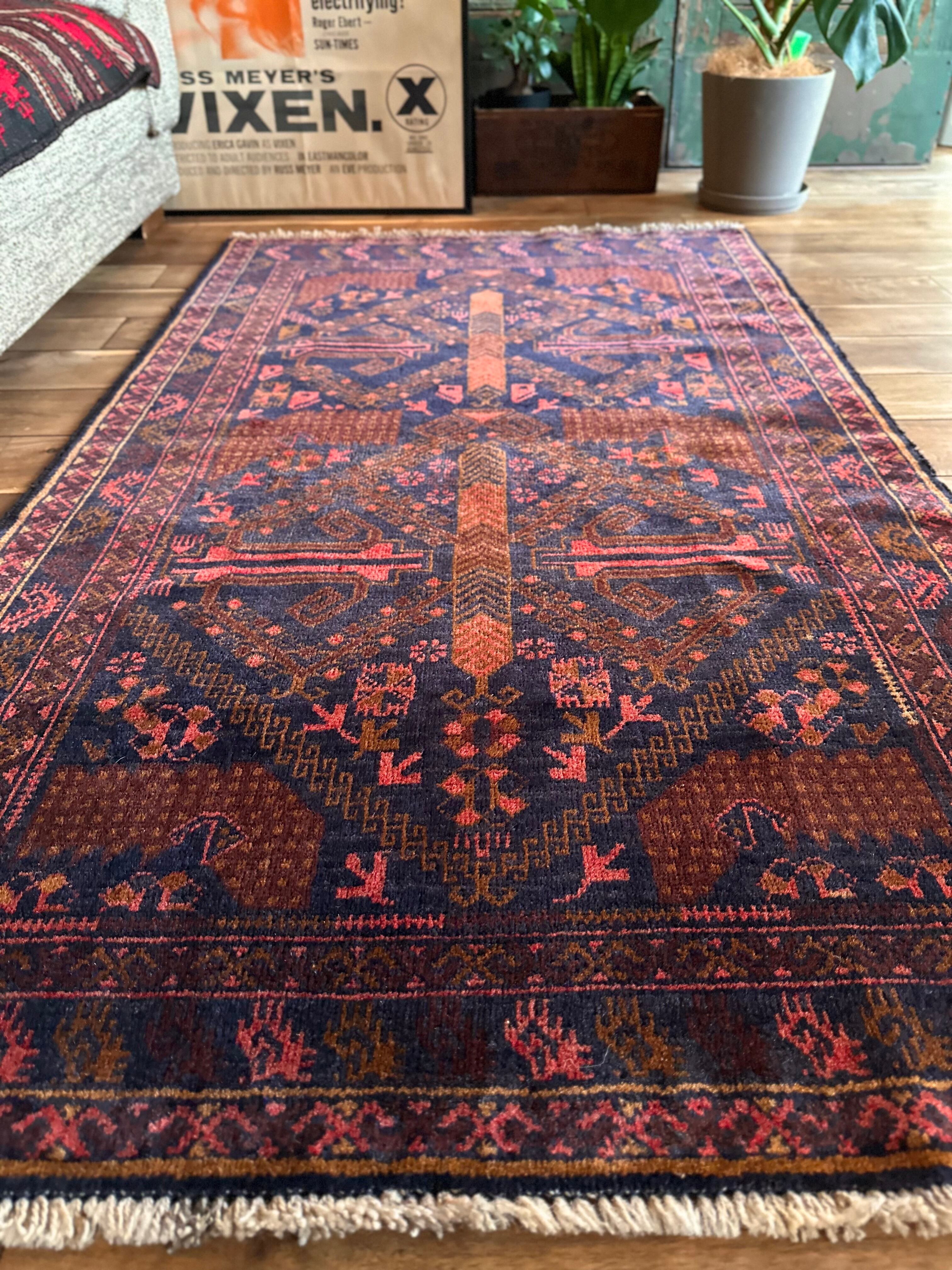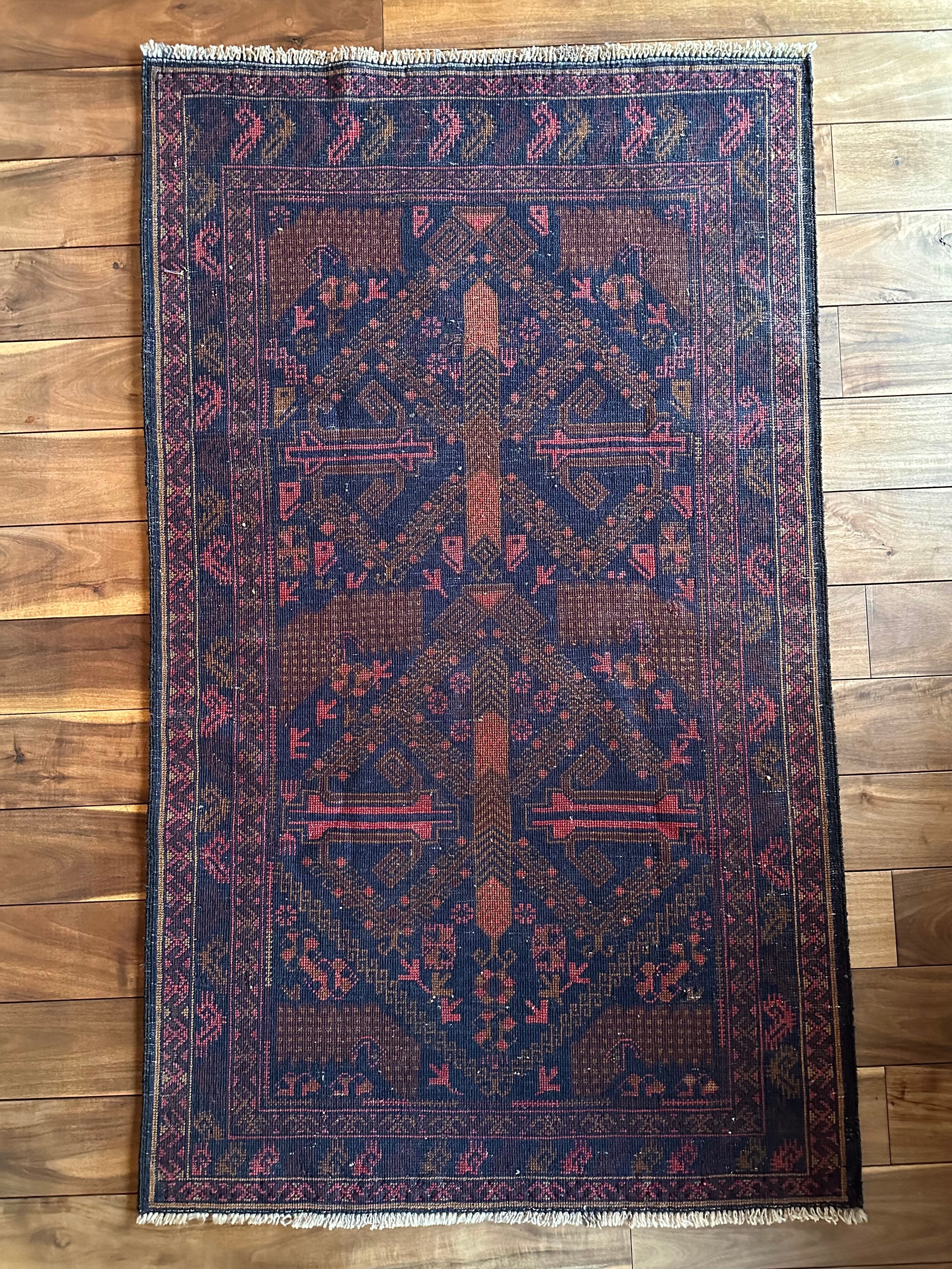 漆黒のバルーチの名にふさわしいブラックのように深まったネイビーにブラウンとレッドの3色使いで部族感を極めたヘラート産のトライバルラグになります。