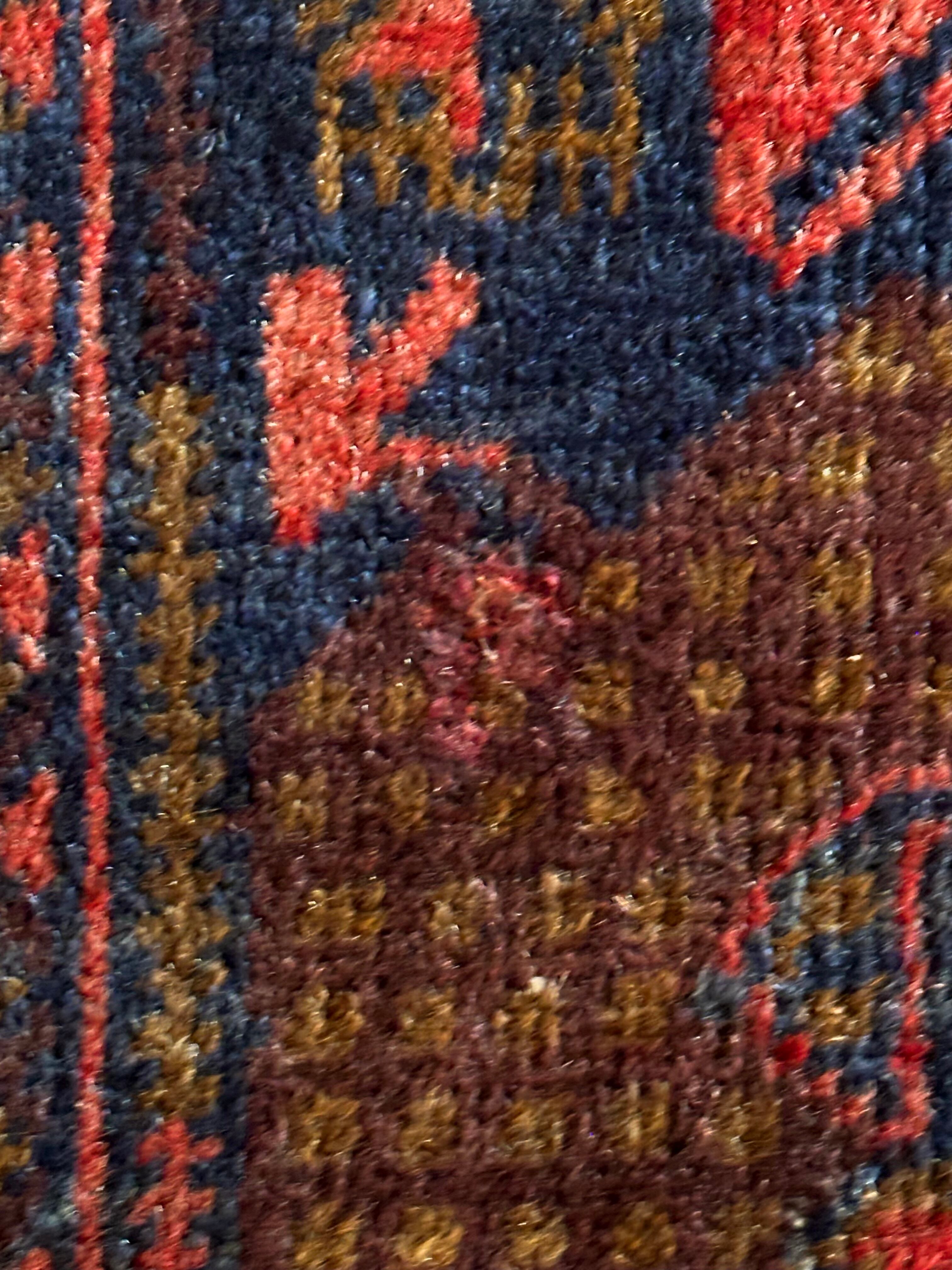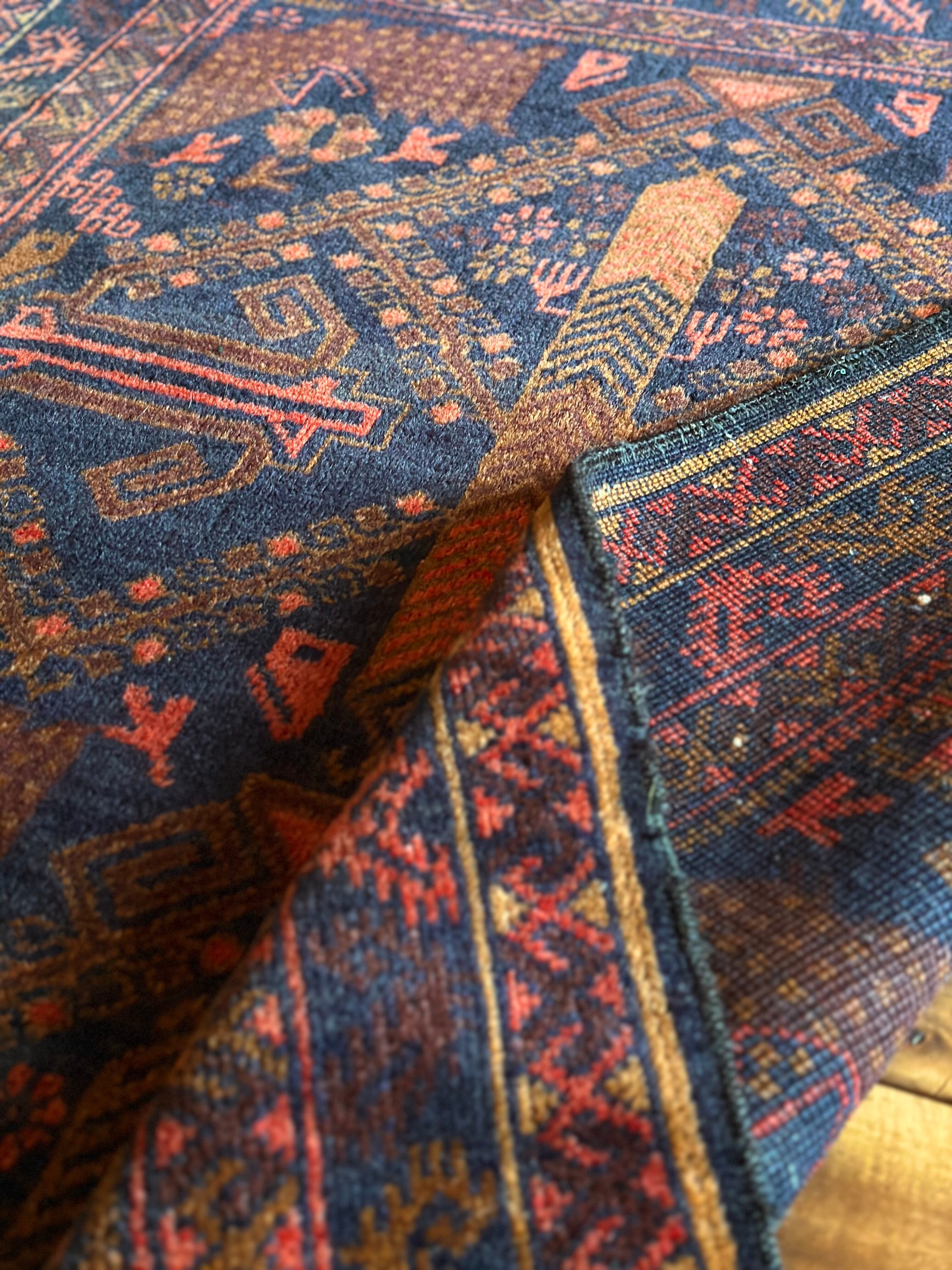 イランのマシュハド産バルーチで良く見かけるパキッとした印象とは違い、何故か泥臭さを感じさせるヘラート産ですが、閉ざされたアフガニスタンの大地での過酷な生活が垣間見えるようで、プリミティブな精神が宿った1枚かと思うのは自分だけでしょうか。