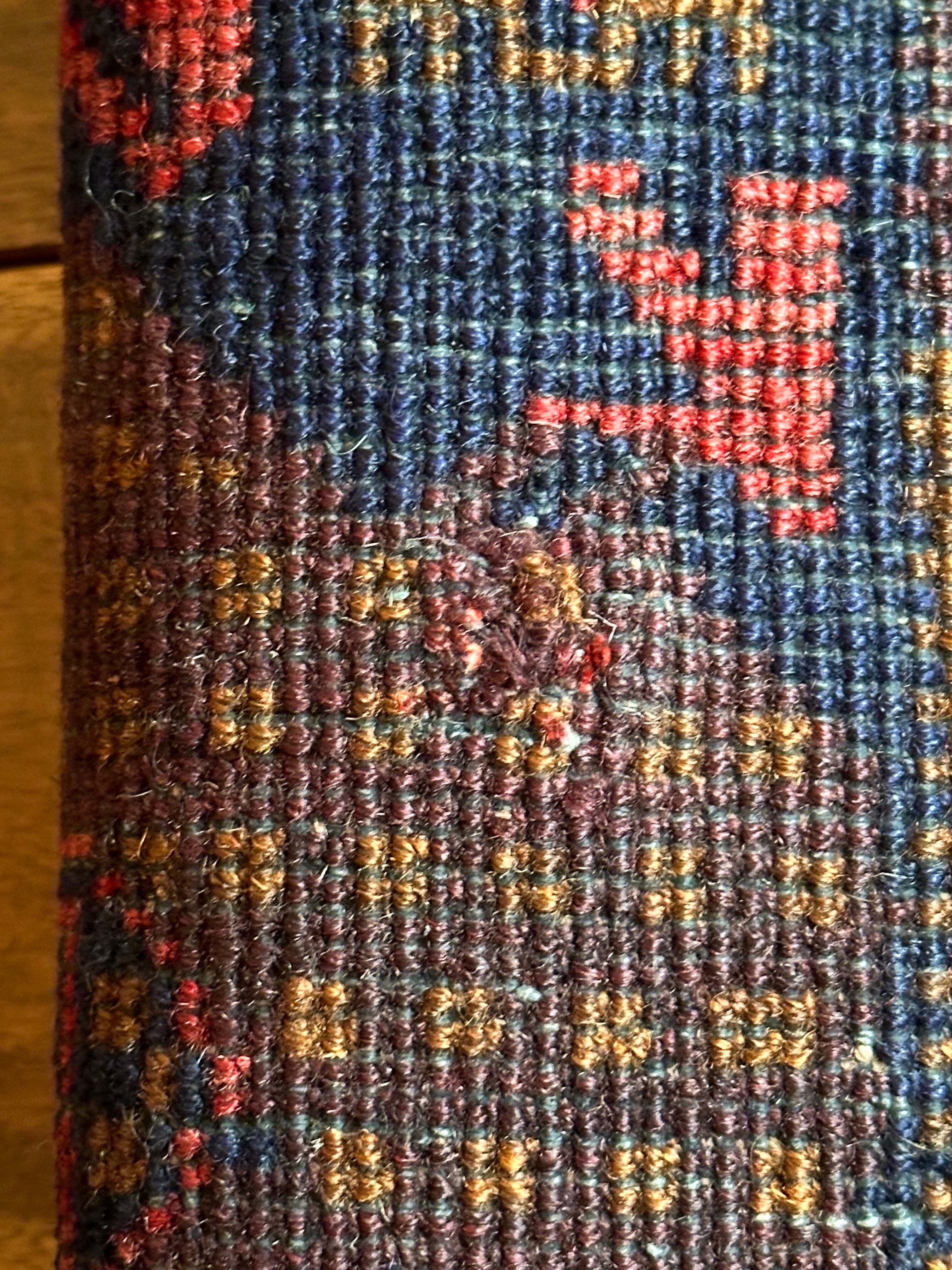 経年としては45年となり経年劣化による若干の褪色はありますが、ヴィンテージラグにしか出せないツヤ感が堪らなく、パイルの擦れもありません。またリペア箇所とし1cmほど穴を補修した跡がありますがパッと見た目には気にならない程度となりますので写真にてご確認下さい。