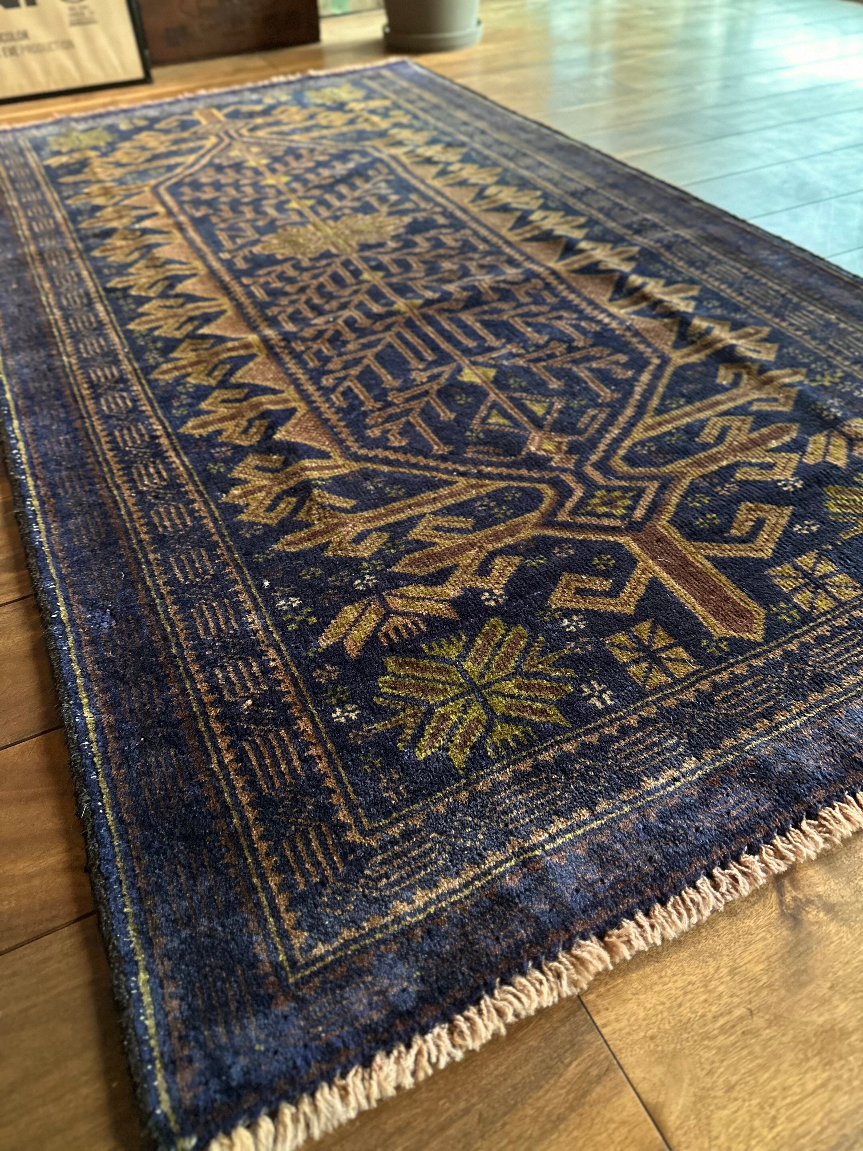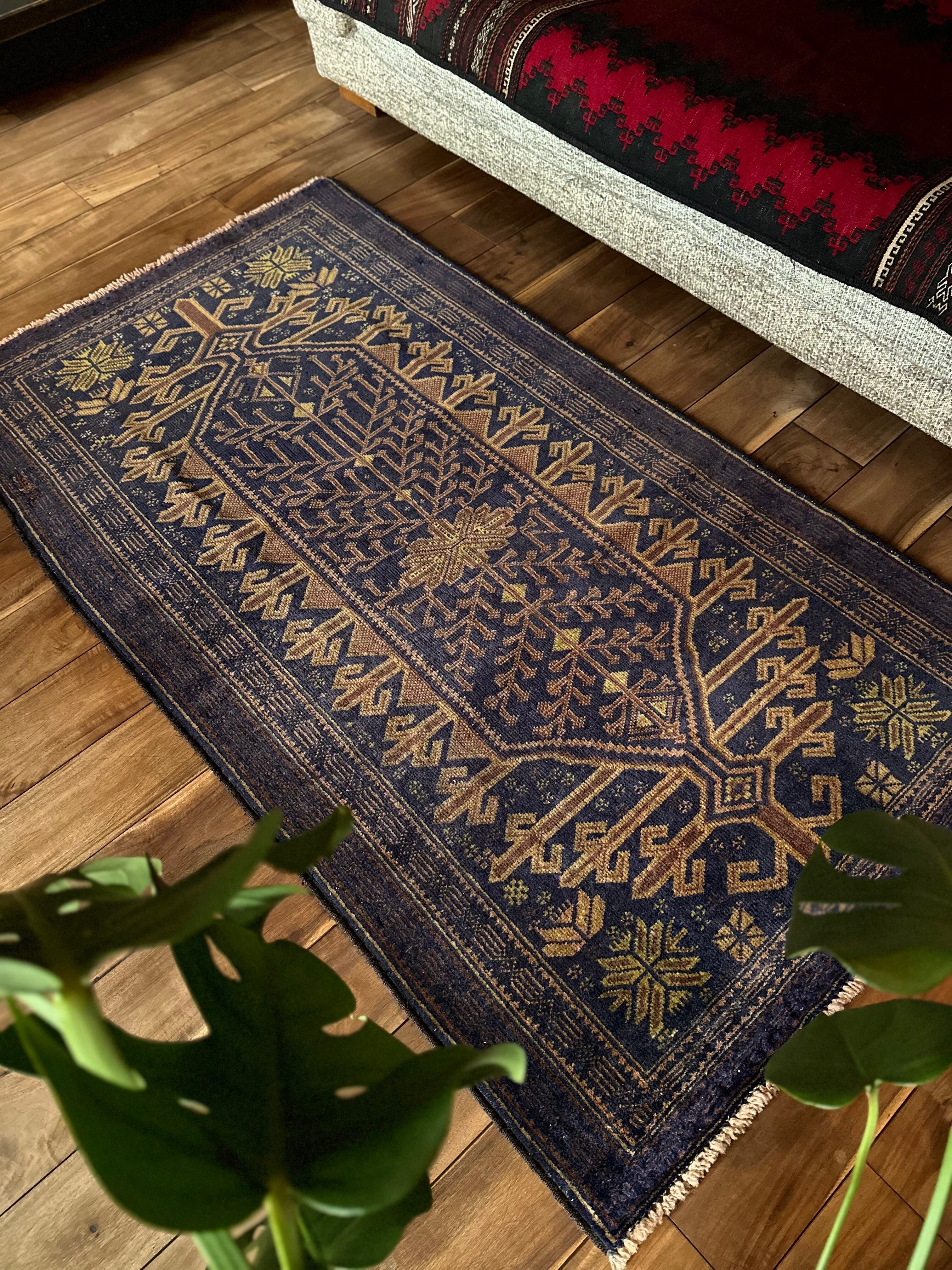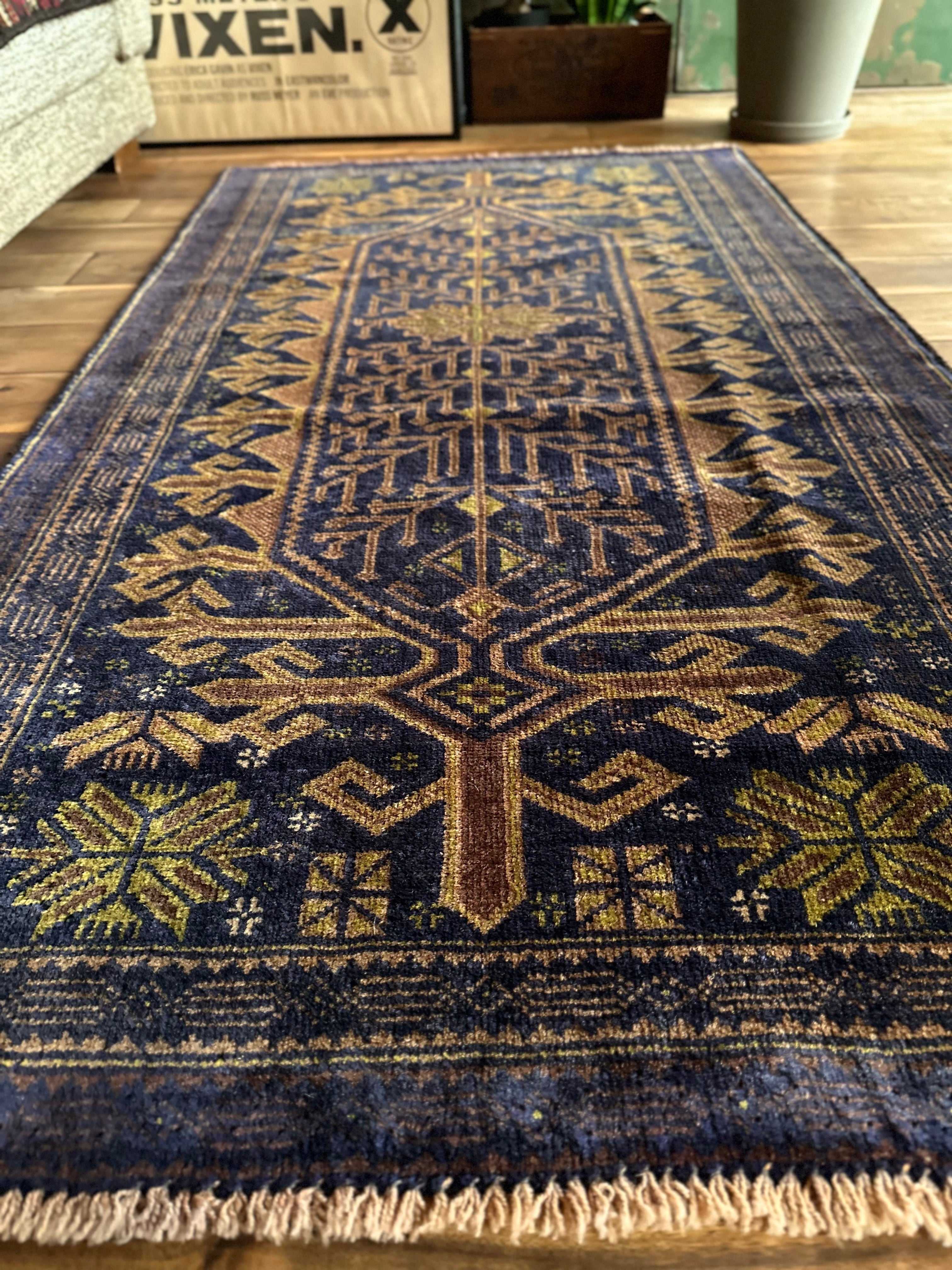 アフガニスタン西部のイランとの国境付近に位置するヘラート州から、光り輝くネイビーベースに描かれた生命の樹がモチーフのバルーチ族のトライバルラグになります。